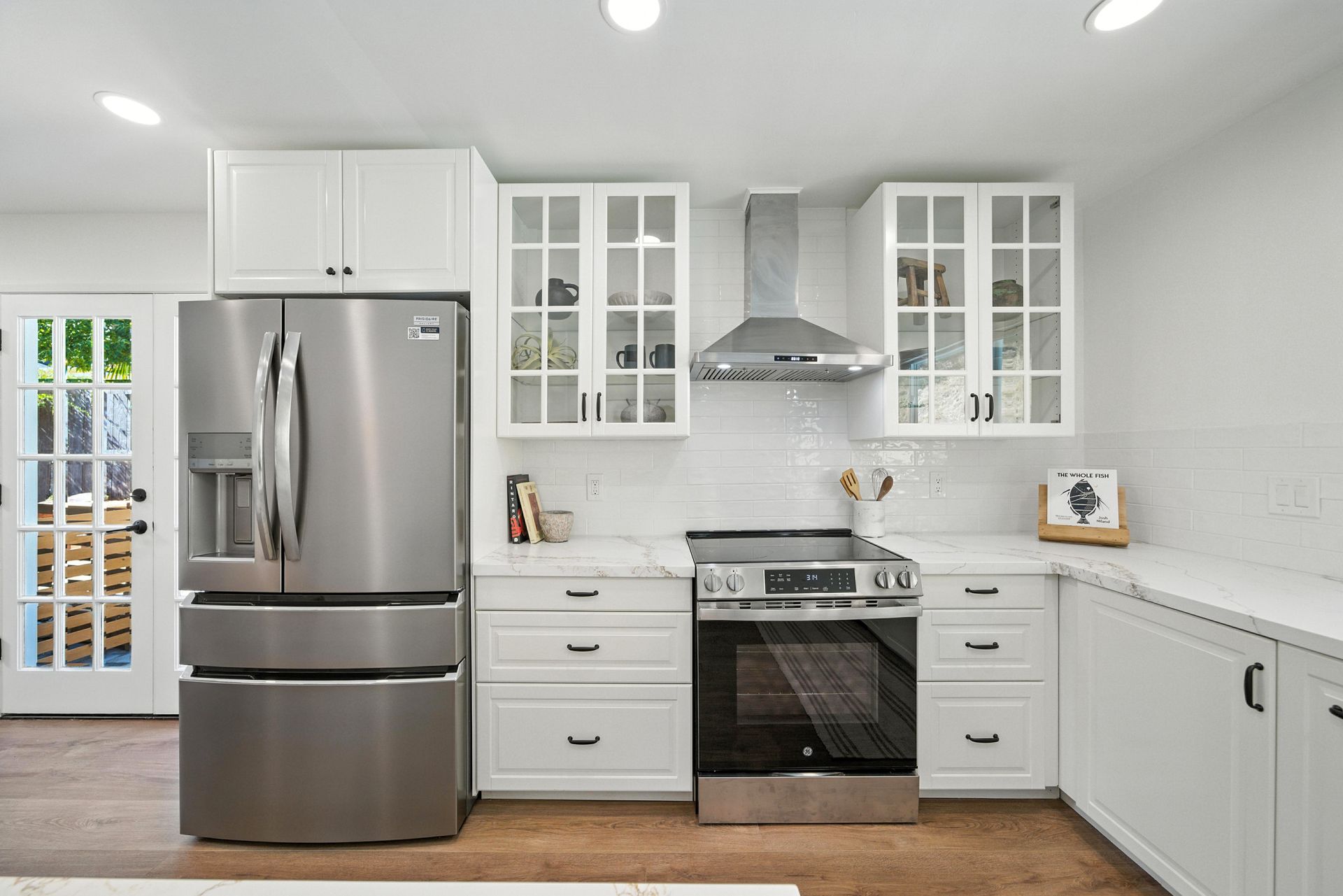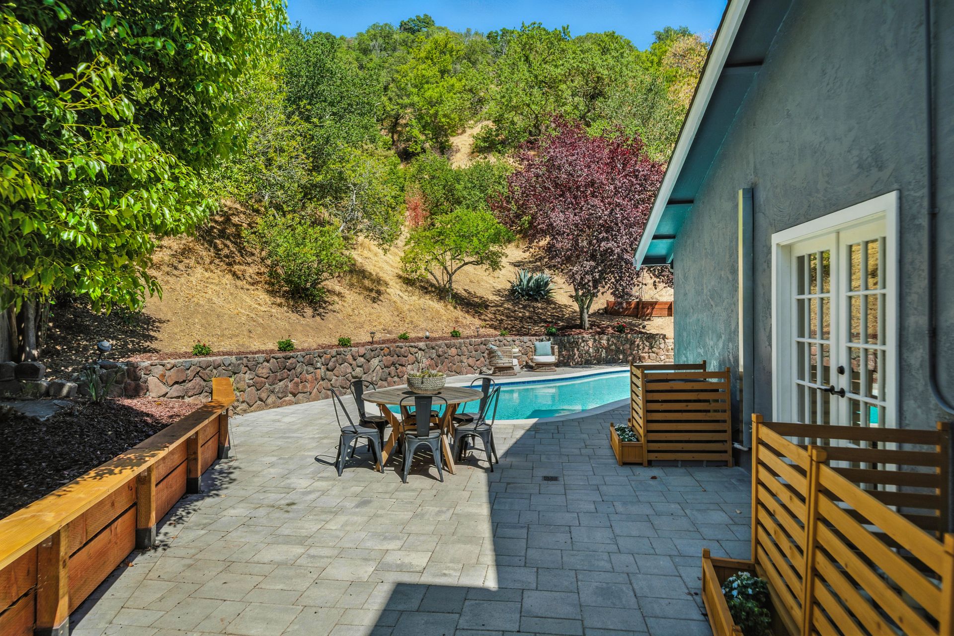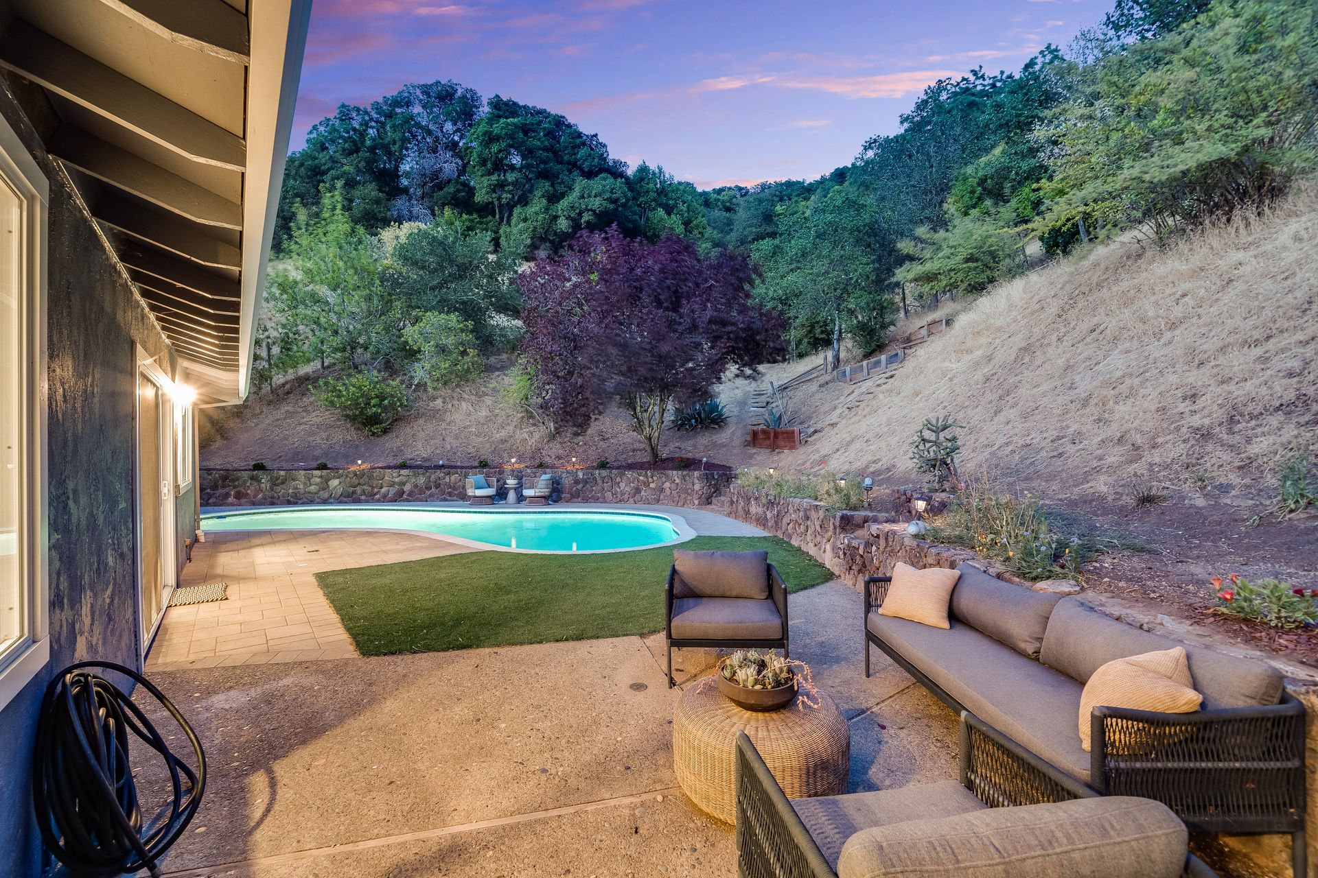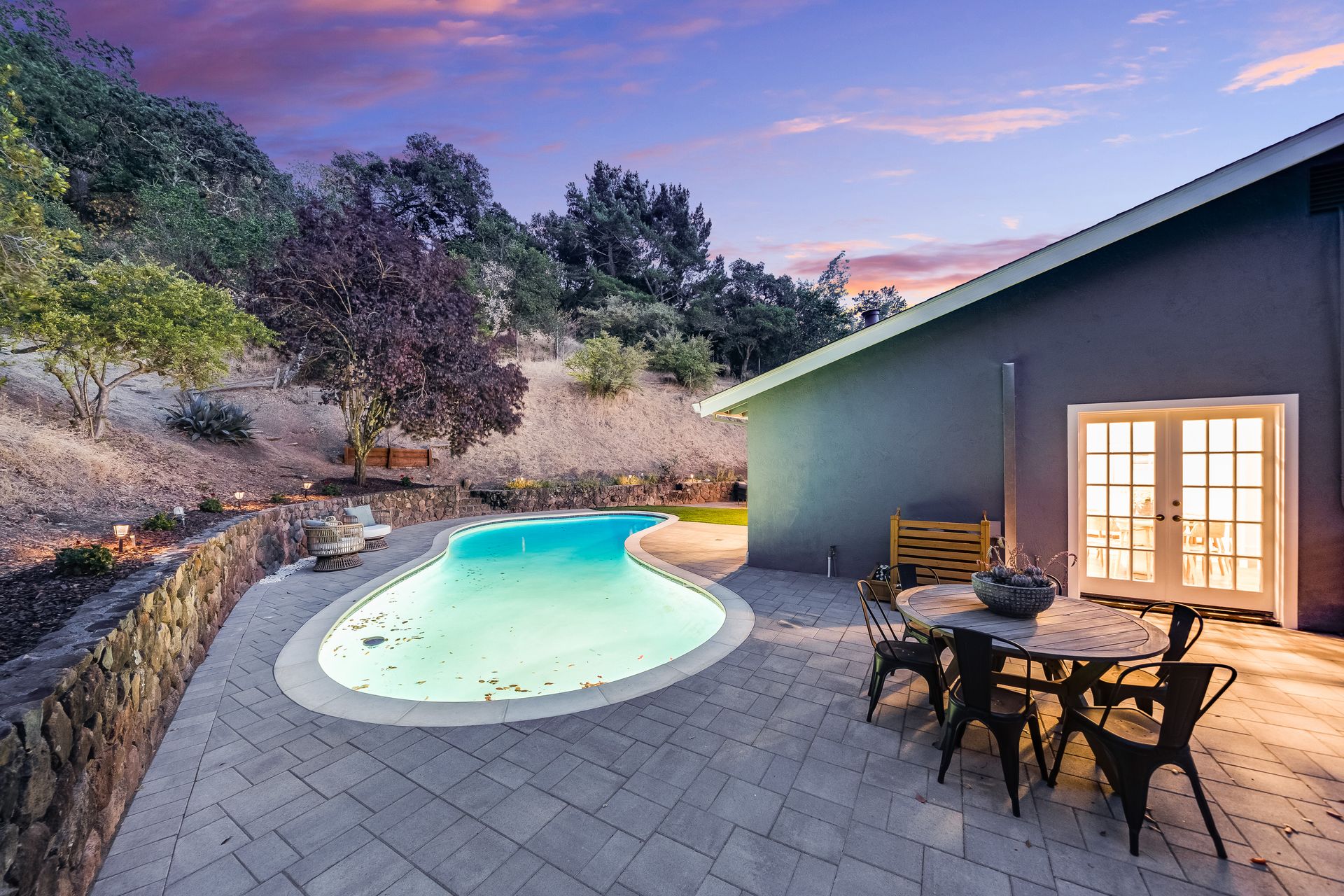 Enter inside to discover an open, light-filled layout featuring hardwood floors, updated finishes, and a sleek, remodeled kitchen with quartz countertops and stainless steel appliances. The spacious living and dining areas flow seamlessly to the backyard, where the sparkling pool, mature landscaping, and multiple patios create a private oasis ideal for relaxing or entertaining.