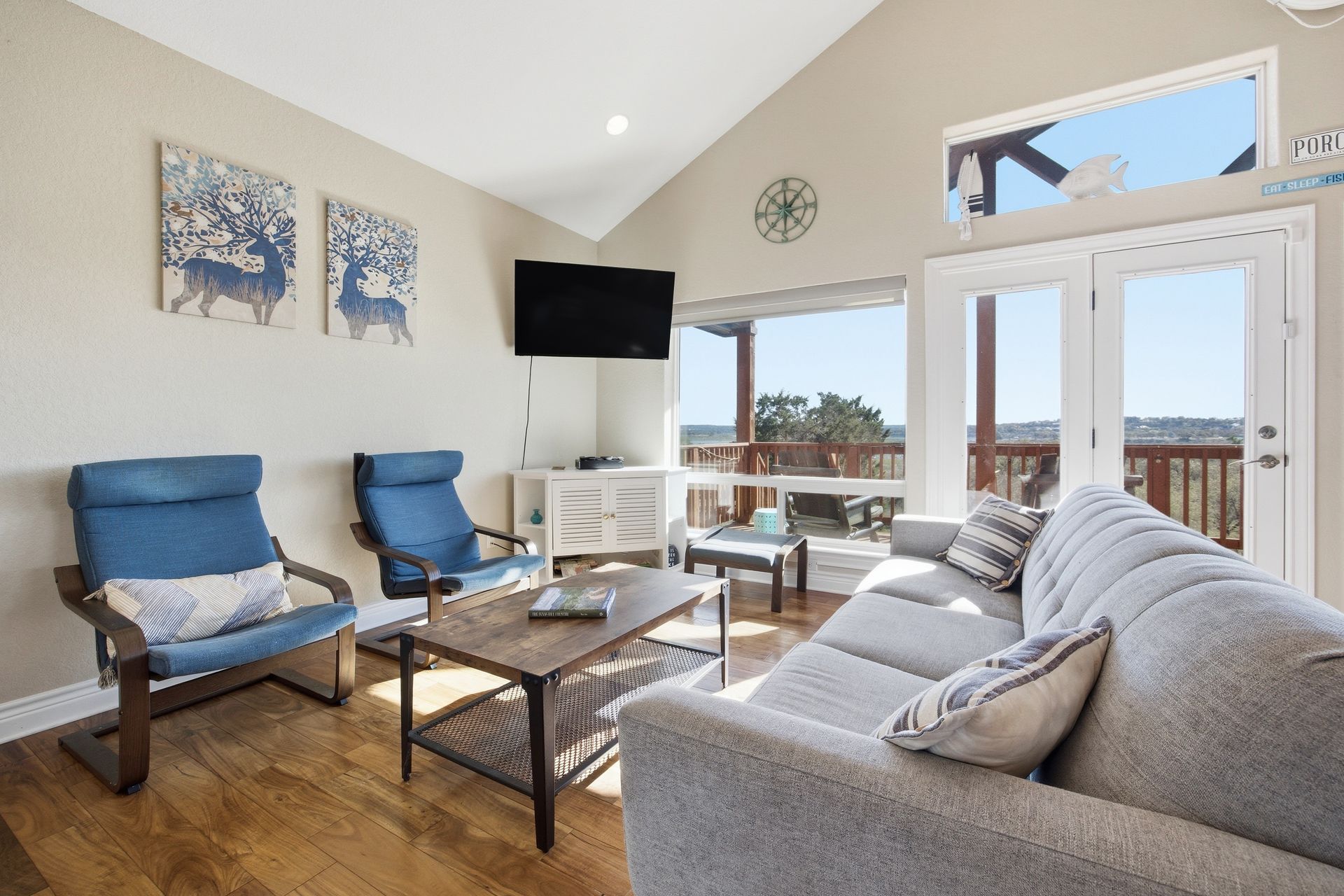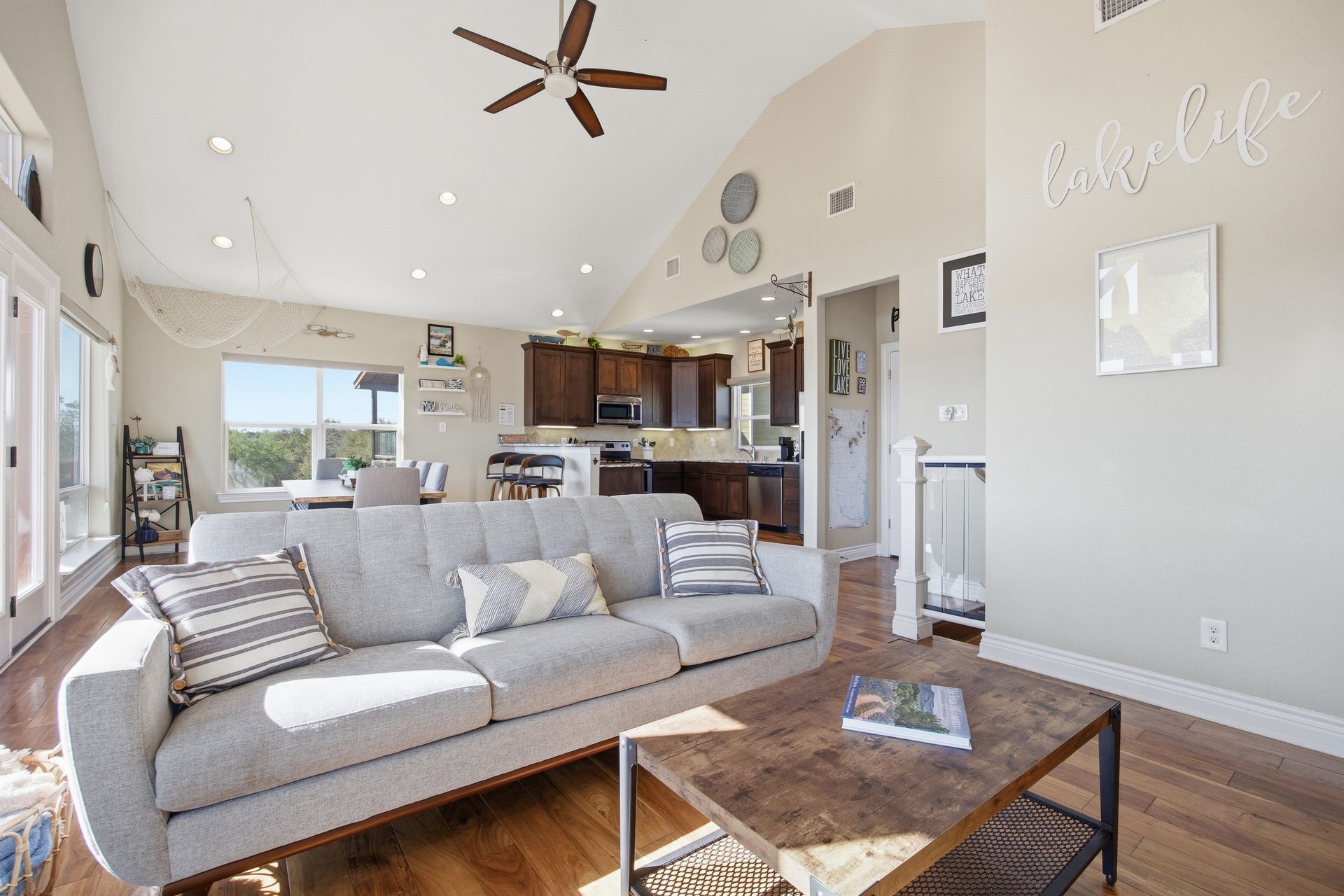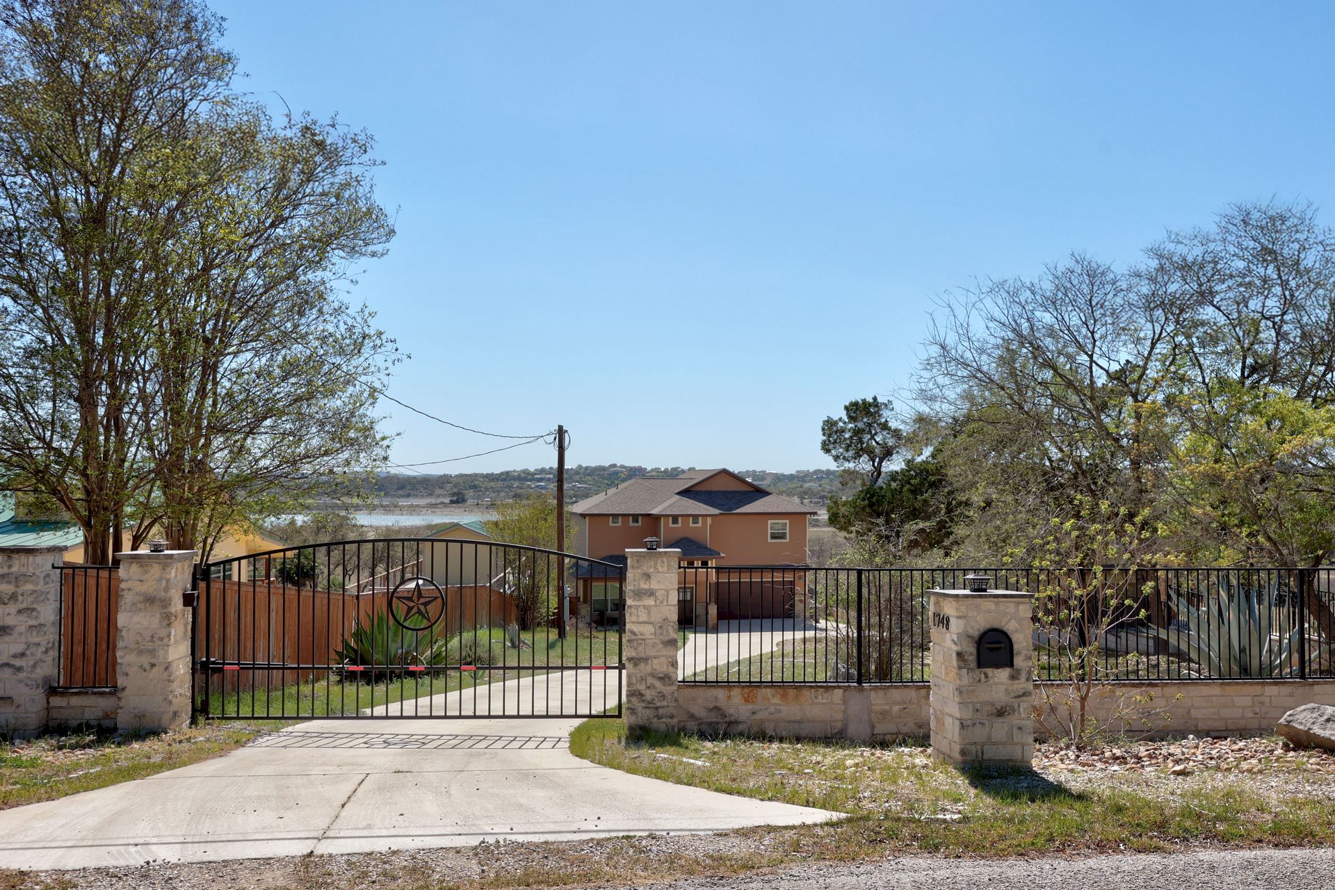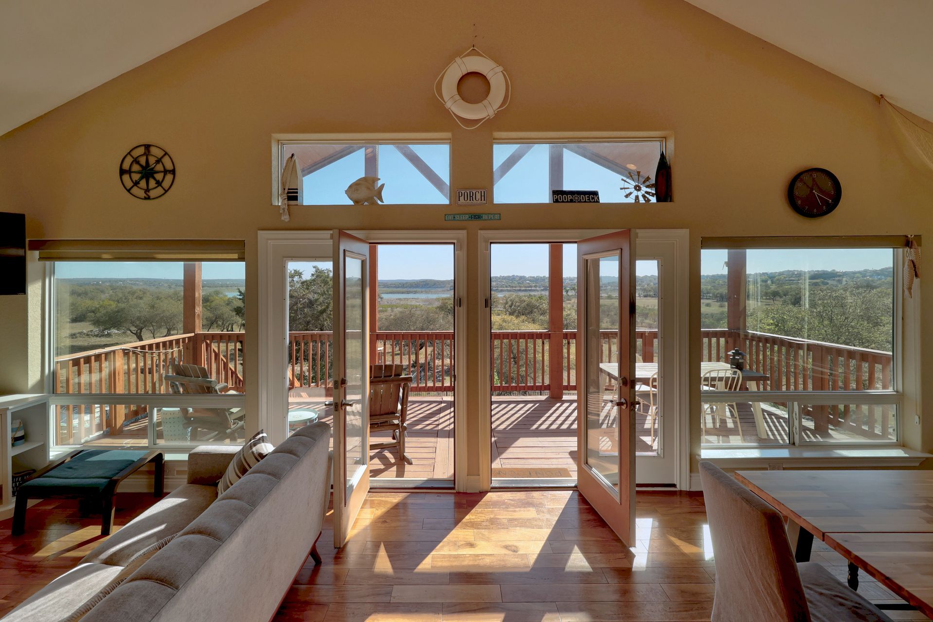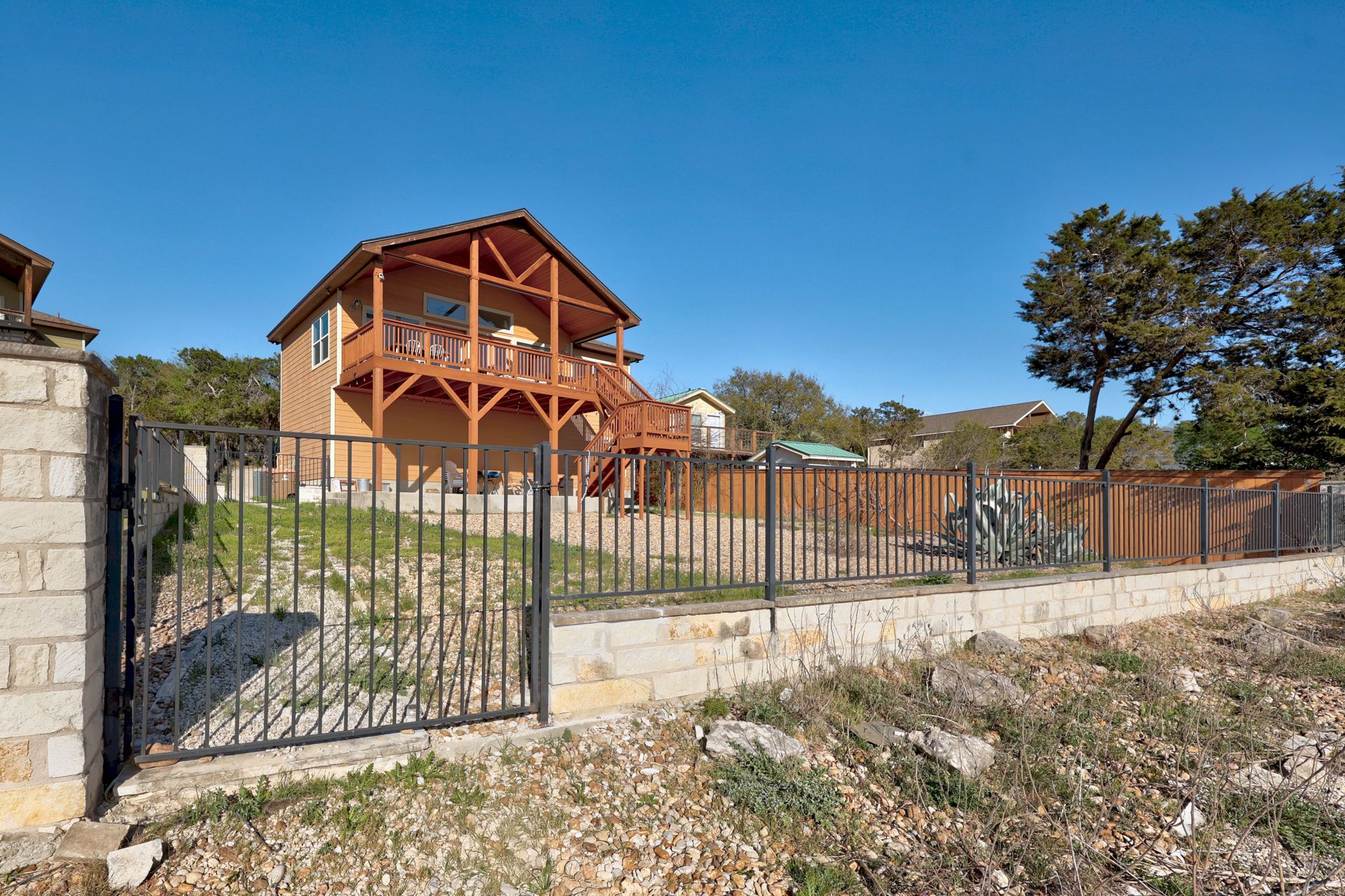 Welcome to lakefront living at Canyon Lake, where sparkling blue waters and sweeping Hill Country views set the backdrop for everyday living. Built in 2013, this north shore waterfront home offers a rare opportunity with short-term rental potential and no HOA — ideal as a full-time residence, weekend escape, or income-producing investment. Designed to maximize panoramic lake views, the main living area is upstairs with vaulted ceilings, abundant natural light, and an open-concept layout. Double French doors lead to a spacious covered balcony overlooking the water — great for morning coffee or sunset cocktails. The upstairs primary suite offers a private retreat with a large walk-in closet and spa-like bath with dual vanities, and a frameless glass walk-in shower. A well-appointed half bath completes the upper level. Downstairs, two additional bedrooms share a dual bath and feature stained concrete floors and generous closet space. A dedicated utility room, three owner/storage closets, pre-plumbing for a water softener, and a two-car garage provide functionality and convenience. A second covered patio expands the outdoor living space. Enjoy added privacy with a gated entrance and fenced yard, all just minutes from multiple boat ramps, parks, dining, and shopping. With over 80 miles of shoreline and some of the clearest waters in Central Texas, Canyon Lake is known as the place “Where Water Sports are King.” Don’t miss your chance to own this exceptional slice of lake life.