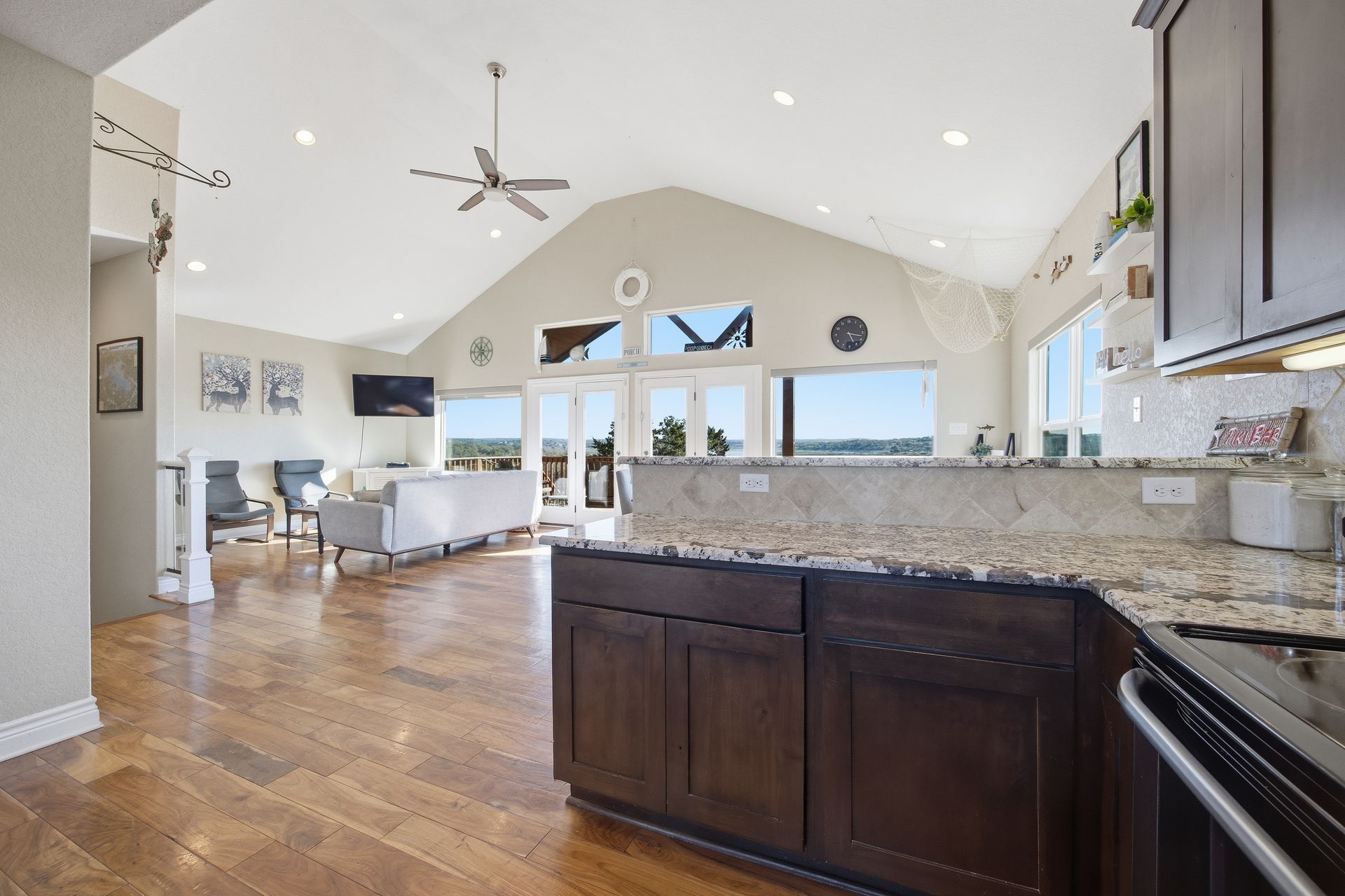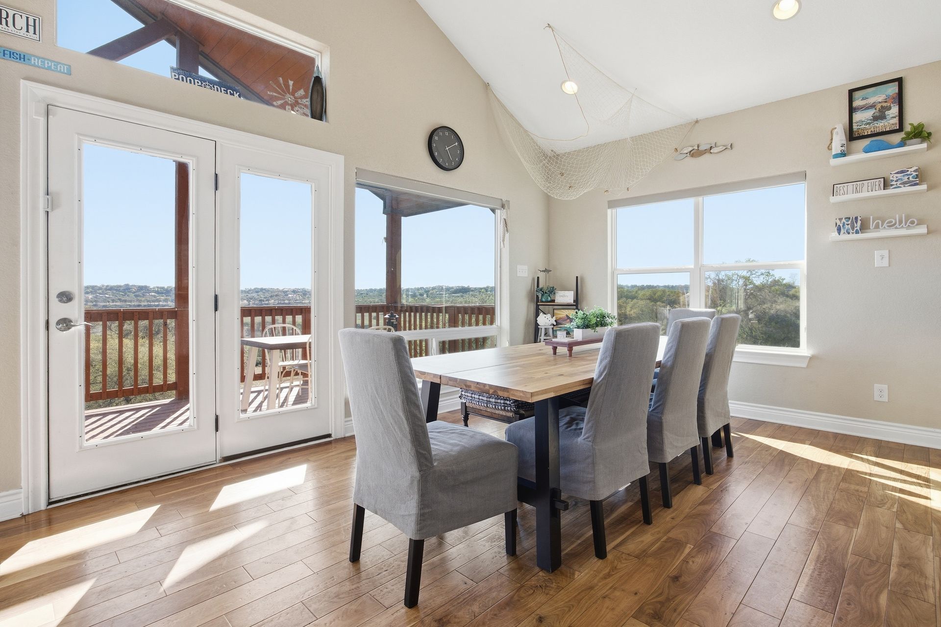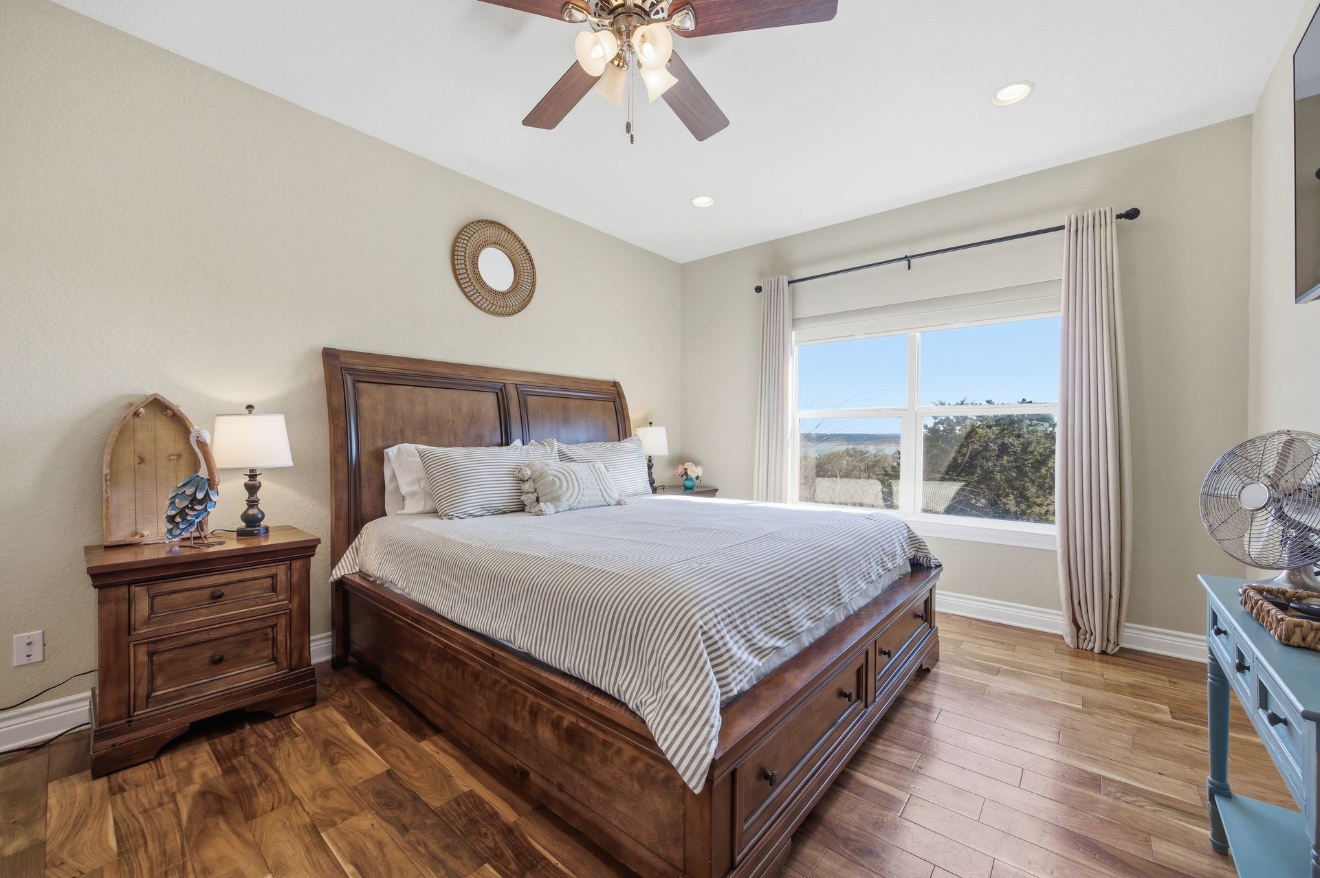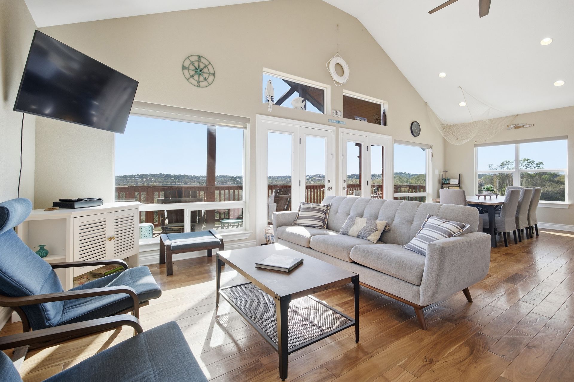 Welcome to lakefront living at Canyon Lake, where sparkling blue waters and sweeping Hill Country views set the backdrop for everyday living. Built in 2013, this north shore waterfront home offers a rare opportunity with short-term rental potential and no HOA — ideal as a full-time residence, weekend escape, or income-producing investment. Designed to maximize panoramic lake views, the main living area is upstairs with vaulted ceilings, abundant natural light, and an open-concept layout. Double French doors lead to a spacious covered balcony overlooking the water — great for morning coffee or sunset cocktails. The upstairs primary suite offers a private retreat with a large walk-in closet and spa-like bath with dual vanities, and a frameless glass walk-in shower. A well-appointed half bath completes the upper level. Downstairs, two additional bedrooms share a dual bath and feature stained concrete floors and generous closet space. A dedicated utility room, three owner/storage closets, pre-plumbing for a water softener, and a two-car garage provide functionality and convenience. A second covered patio expands the outdoor living space. Enjoy added privacy with a gated entrance and fenced yard, all just minutes from multiple boat ramps, parks, dining, and shopping. With over 80 miles of shoreline and some of the clearest waters in Central Texas, Canyon Lake is known as the place “Where Water Sports are King.” Don’t miss your chance to own this exceptional slice of lake life.