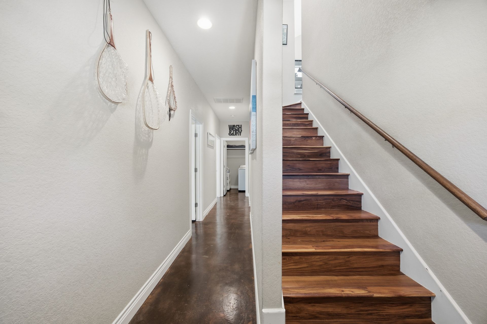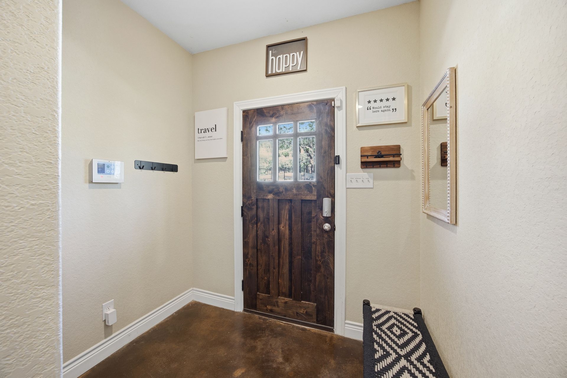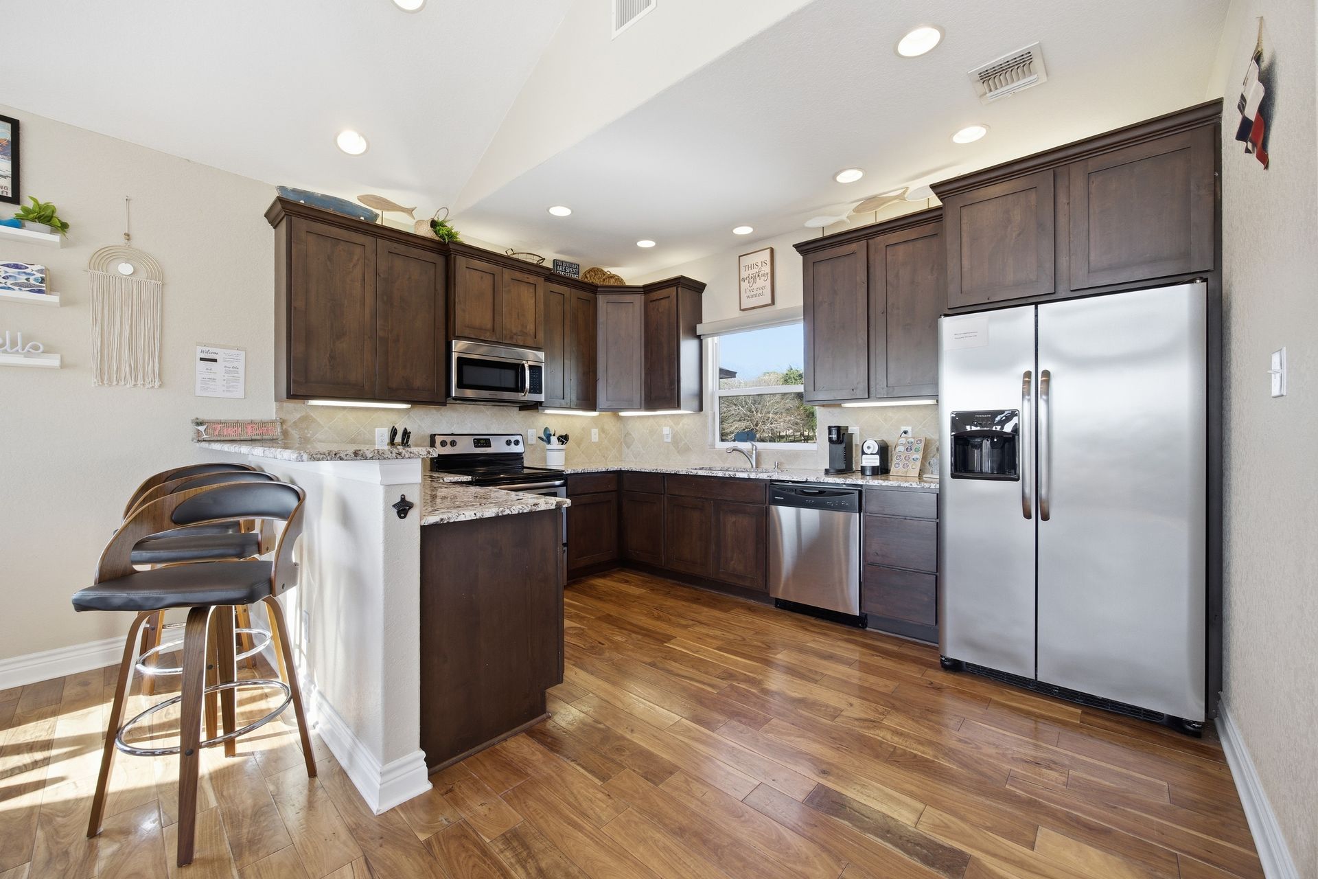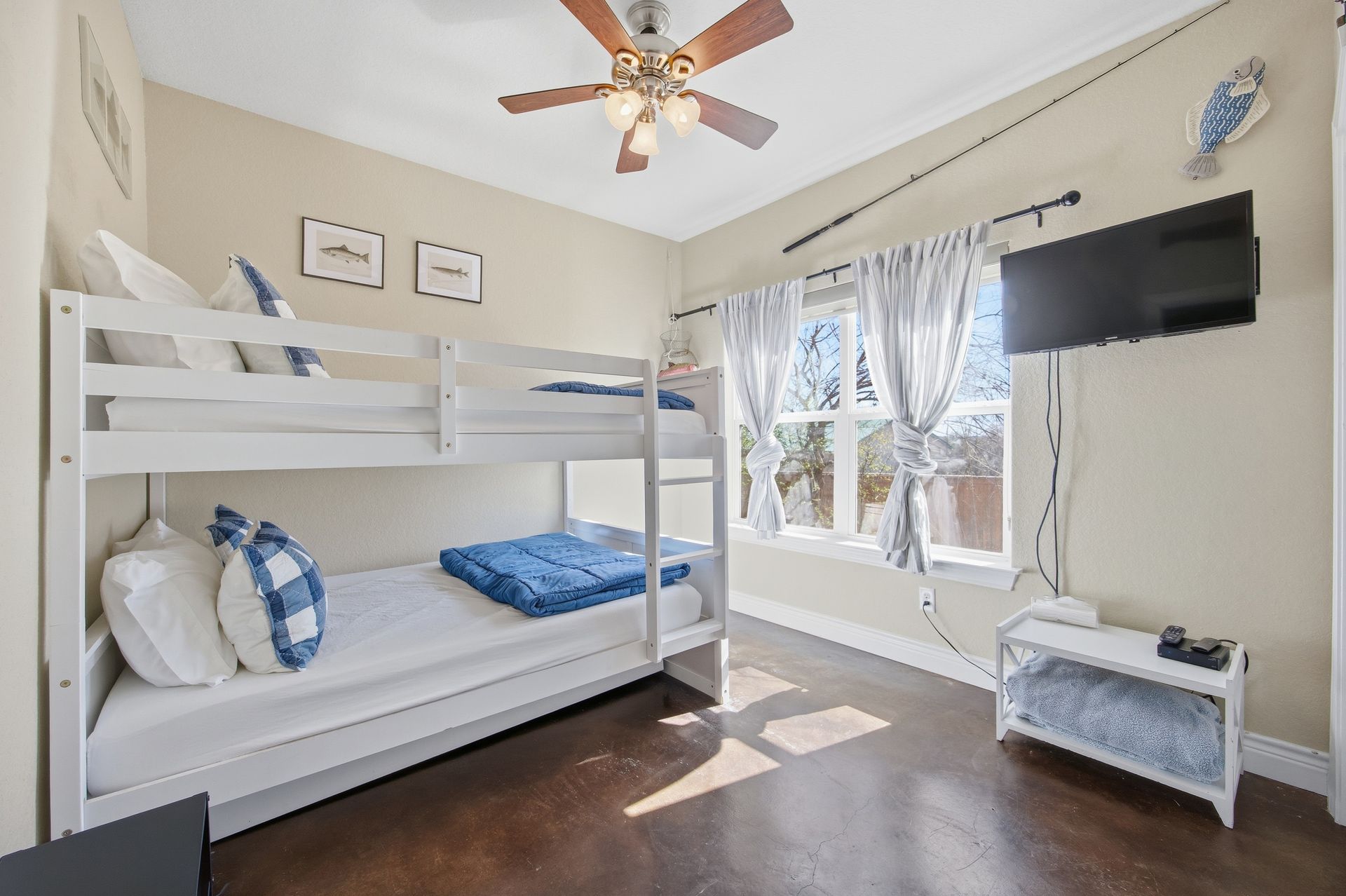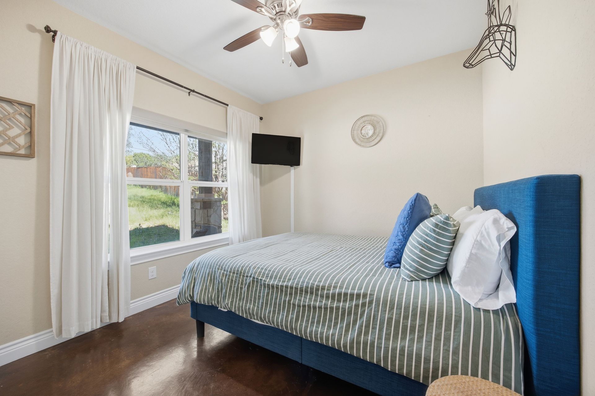 Welcome to lakefront living at Canyon Lake, where sparkling blue waters and sweeping Hill Country views set the backdrop for everyday living. Built in 2013, this north shore waterfront home offers a rare opportunity with short-term rental potential and no HOA — ideal as a full-time residence, weekend escape, or income-producing investment. Designed to maximize panoramic lake views, the main living area is upstairs with vaulted ceilings, abundant natural light, and an open-concept layout. Double French doors lead to a spacious covered balcony overlooking the water — great for morning coffee or sunset cocktails. The upstairs primary suite offers a private retreat with a large walk-in closet and spa-like bath with dual vanities, and a frameless glass walk-in shower. A well-appointed half bath completes the upper level. Downstairs, two additional bedrooms share a dual bath and feature stained concrete floors and generous closet space. A dedicated utility room, three owner/storage closets, pre-plumbing for a water softener, and a two-car garage provide functionality and convenience. A second covered patio expands the outdoor living space. Enjoy added privacy with a gated entrance and fenced yard, all just minutes from multiple boat ramps, parks, dining, and shopping. With over 80 miles of shoreline and some of the clearest waters in Central Texas, Canyon Lake is known as the place “Where Water Sports are King.” Don’t miss your chance to own this exceptional slice of lake life.