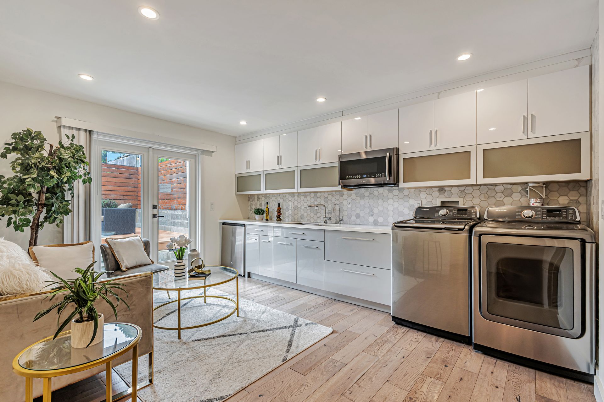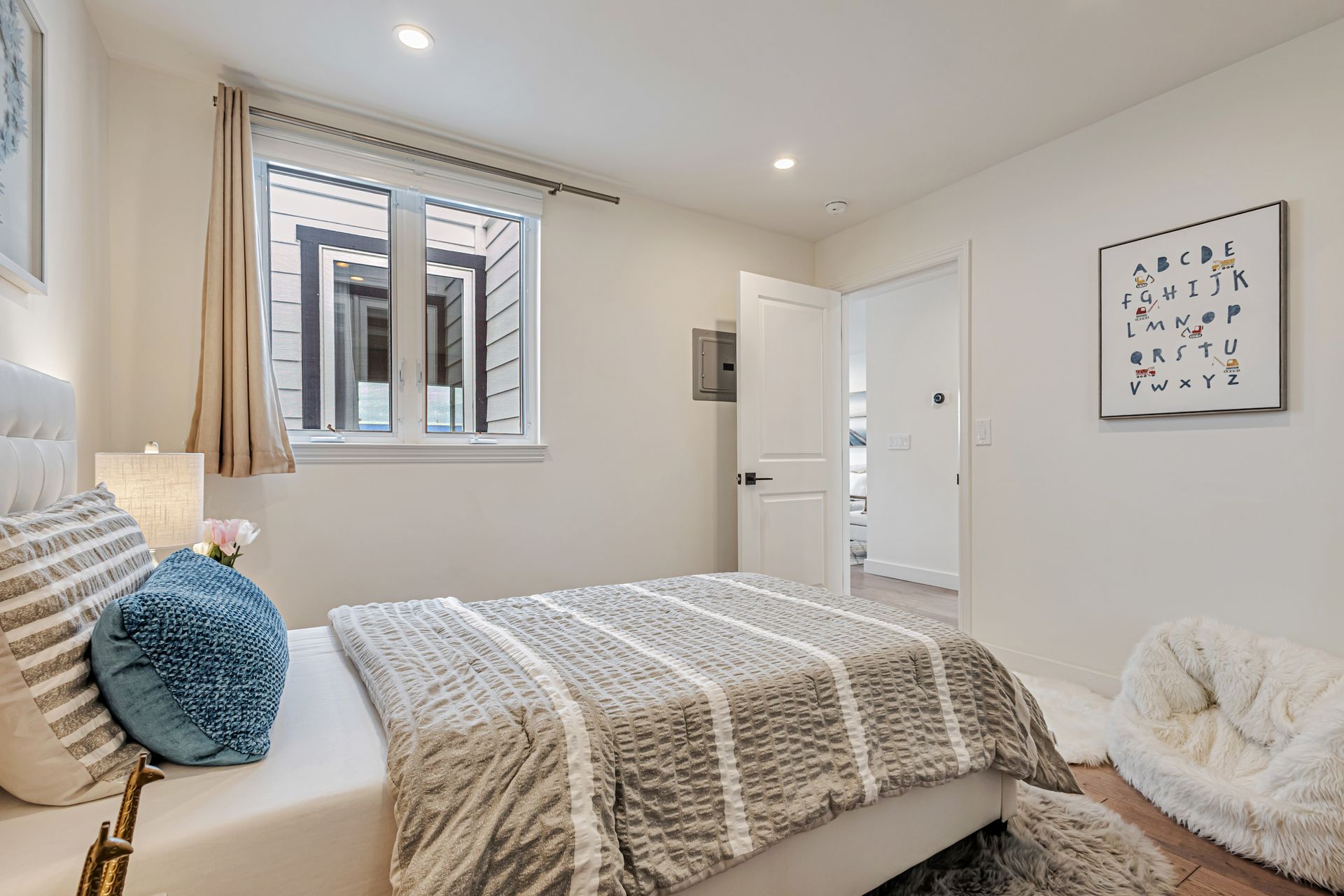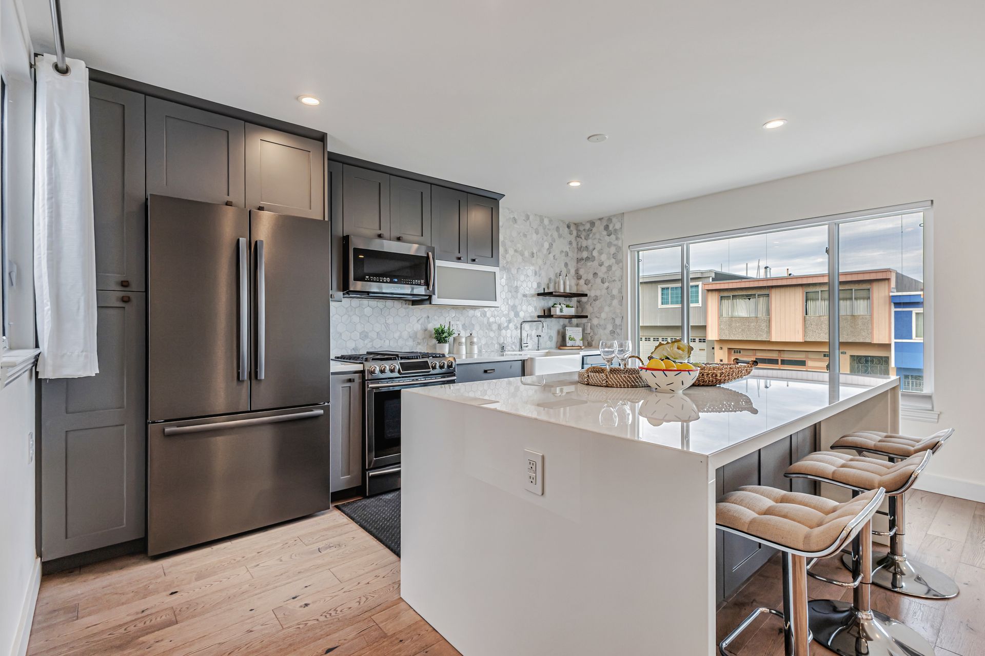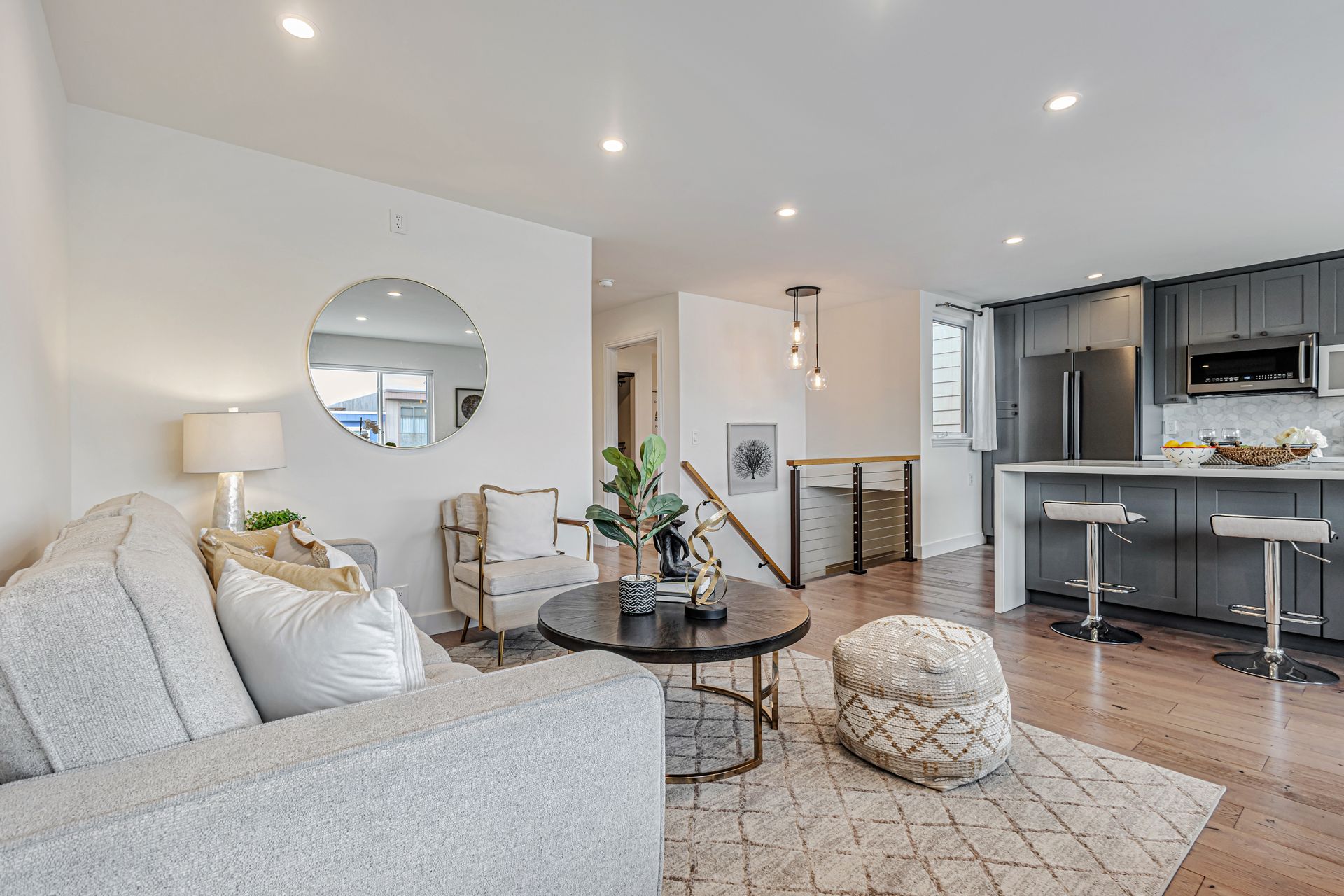 This beautifully reimagined 4-bedroom/4-bathroom single-family home, approximately 1,905 sqft, combines modern aesthetics with functional living. An inviting open floor concept, living and dining area with views of the bay, a chef's kitchen featuring an expansive center island, soft-close cabinetry, premium appliances, custom window coverings and stylish finishes that complement the rich hardwood floors throughout. Upstairs, the serene primary suite offers a spa-inspired en-suite bath, two additional bedrooms, a hall bathroom with washer/dryer hookup. The versatile lower level includes a cozy lounge with sliding barn door, wet bar, washer and dryer, private bedroom with en-suite bath, additional hall bath, and mudroom ideal for multi-generational living, guests, or a home office. Step outside to a custom-landscaped, low-maintenance backyard patio perfect for relaxation. Security system, a two-car side-by-side garage adds convenience and peace of mind. Ideally located near McLaren Park, Palega Recreation Center, top schools including Cornerstone Academy, San Bruno Avenue's vibrant dining & shopping, public transit, Hwy 101/280, SF downtown & SFO, this Portola gem makes city living effortless. Welcome to your dream home!