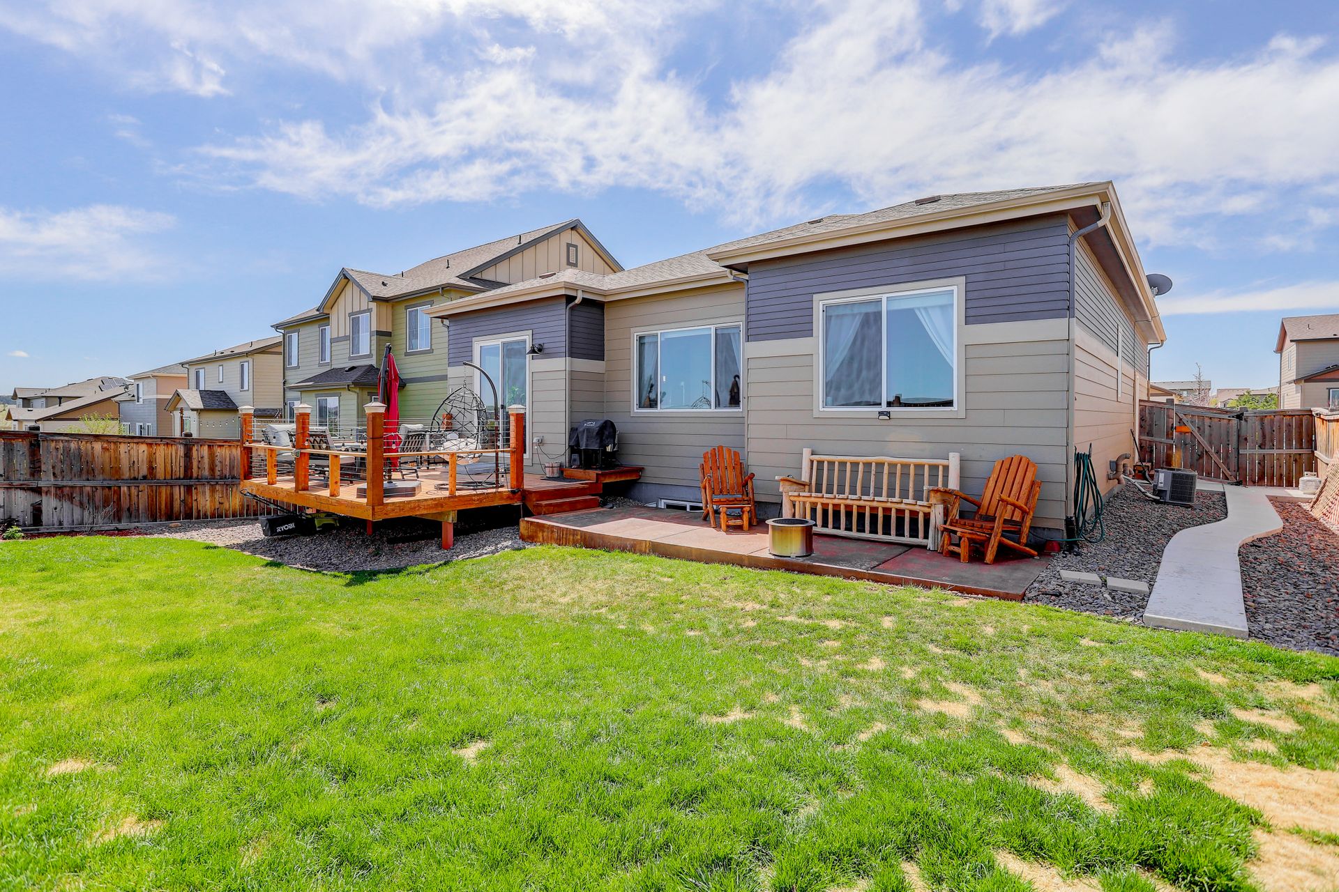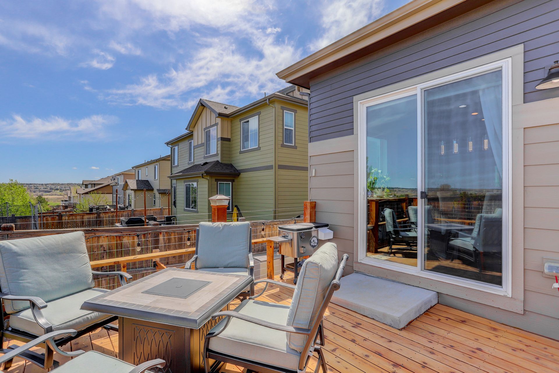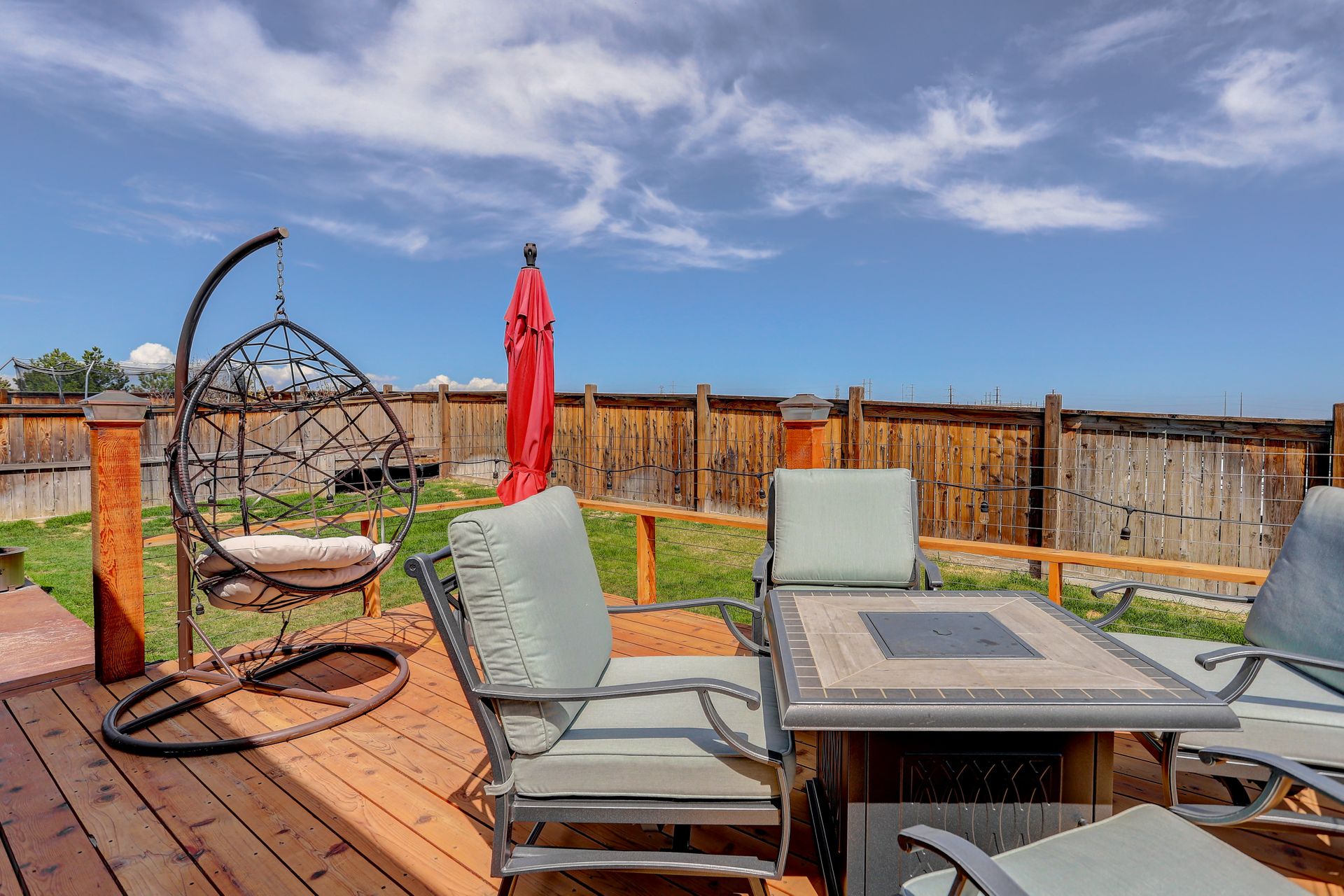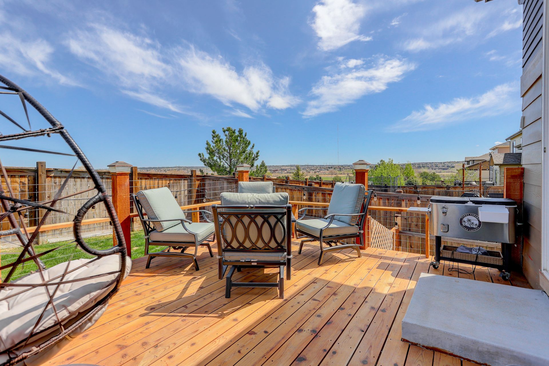 Exit outside to a private backyard sanctuary, featuring a deck and patio space ideal for grilling, relaxing, or hosting under Colorado’s big blue skies.