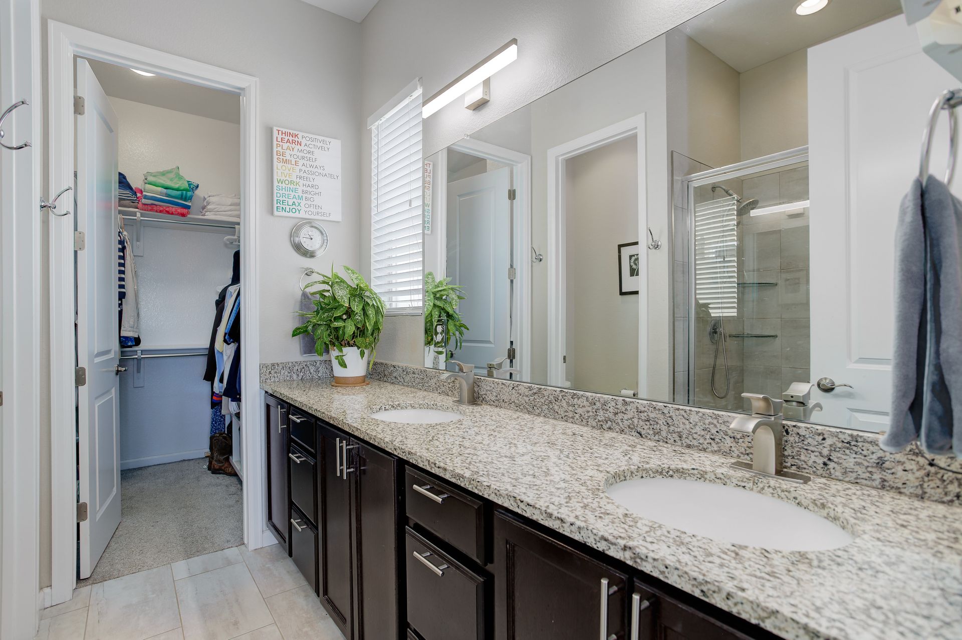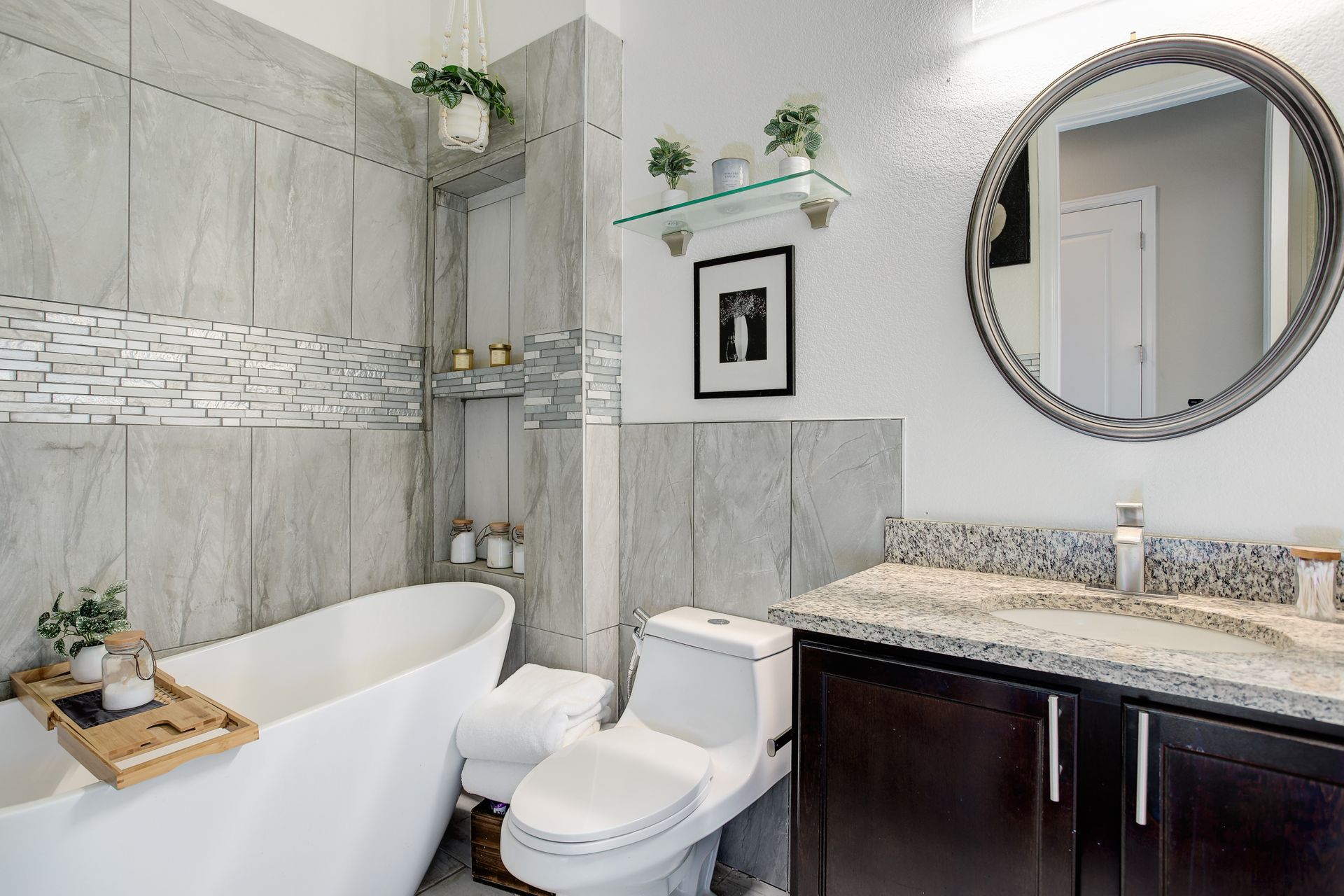 The spacious living room features custom built-in shelving to showcase your favorite books and keepsakes, and an elegant electric fireplace that adds ambiance with the touch of a button. Tucked away for privacy, the primary suite offers a quiet retreat with its own en suite bath and walk-in closet. The secondary full bathroom has been tastefully remodeled to feel like your own personal spa, complete with a relaxing slipper tub.