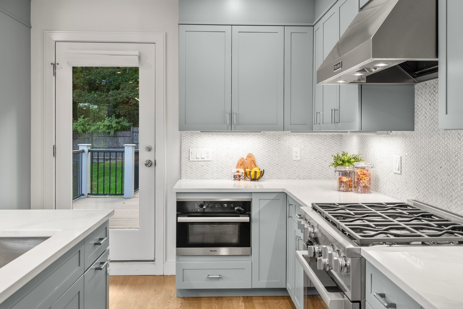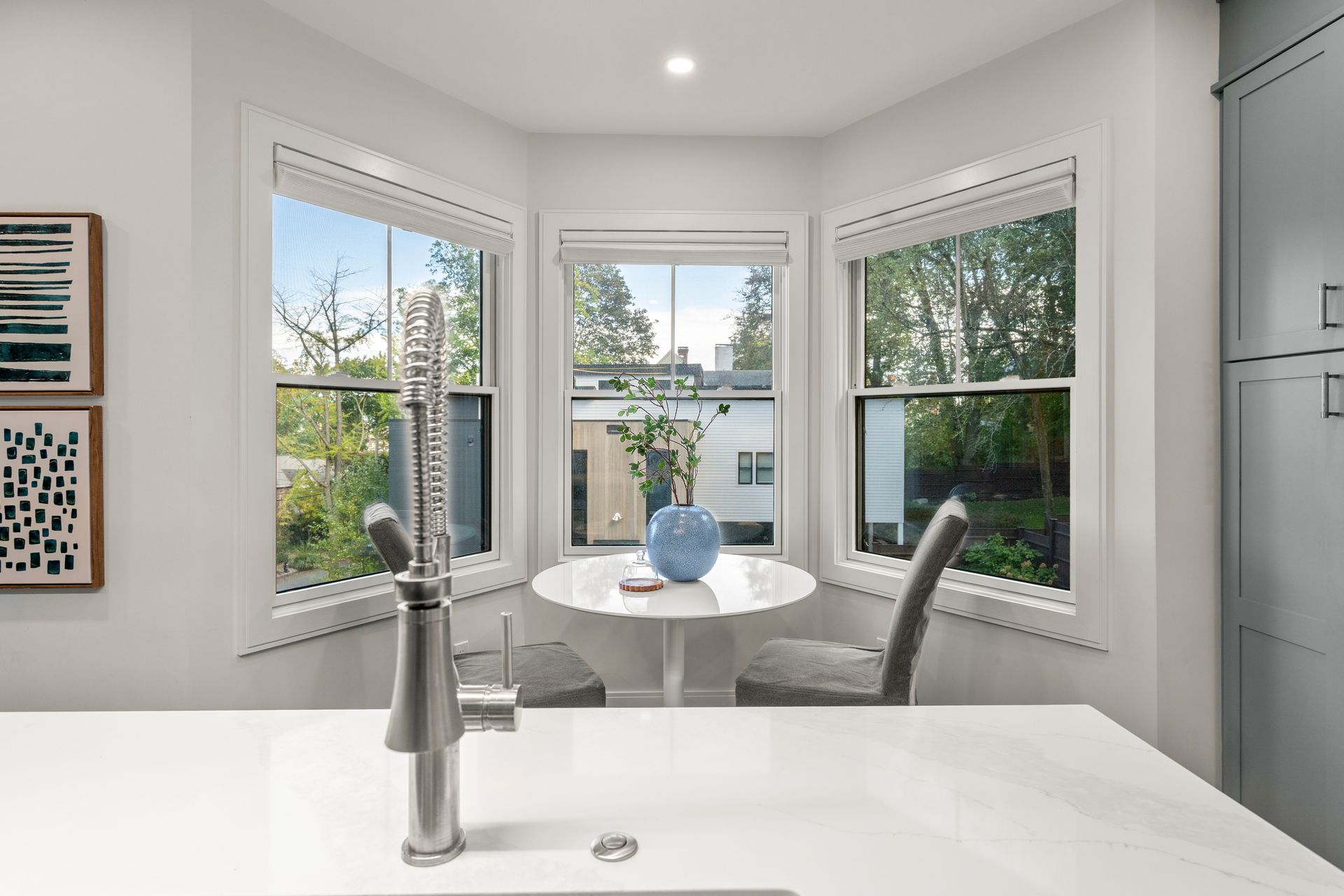 A private entrance leads to the main living level, which features a bright living room with access to a front deck with great city views, a family room with a fireplace, a dining room, and a chef’s kitchen complete with an island, breakfast bar, Miele appliances, and a charming bay window seating area—perfect for enjoying your morning coffee.