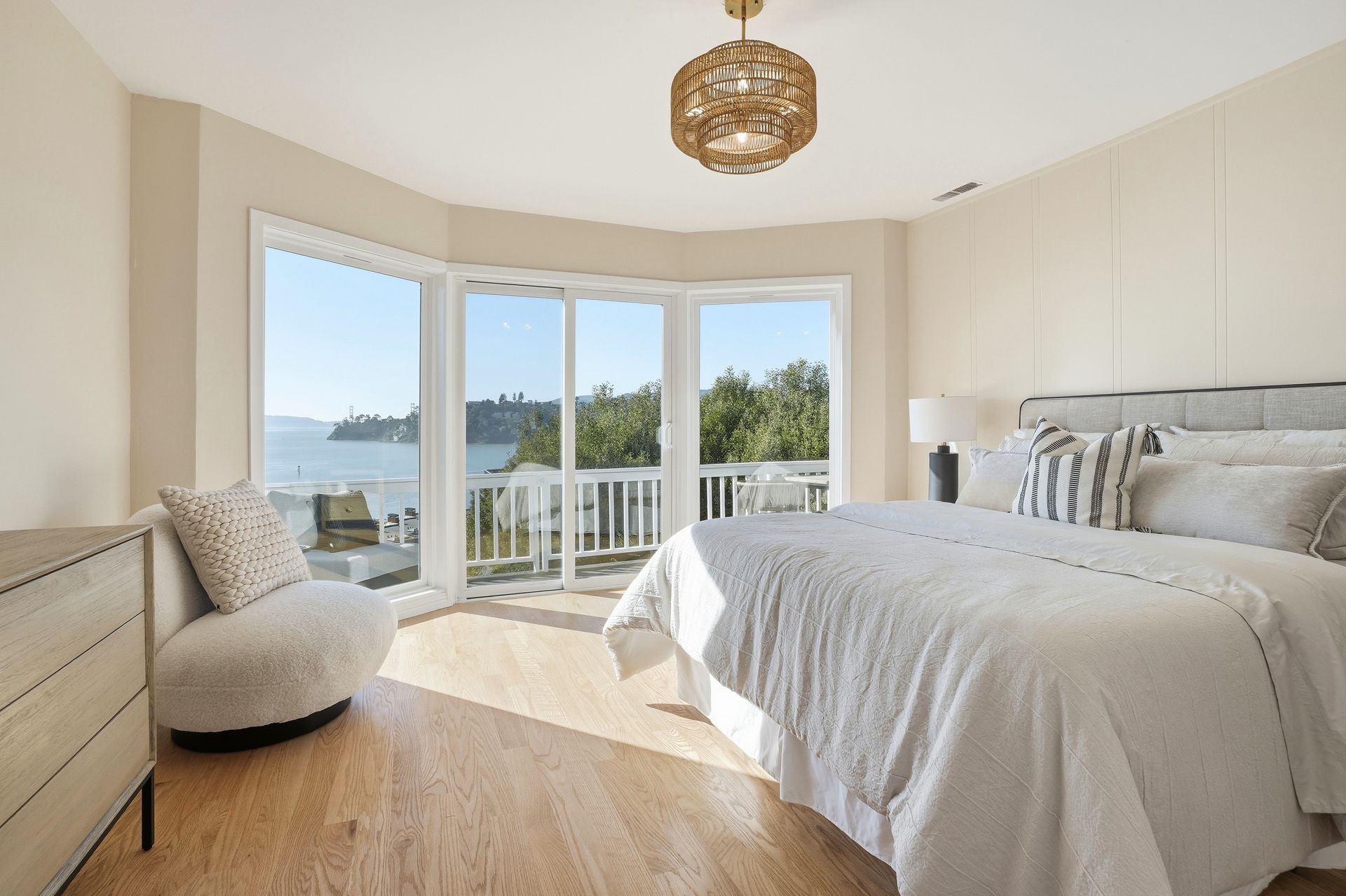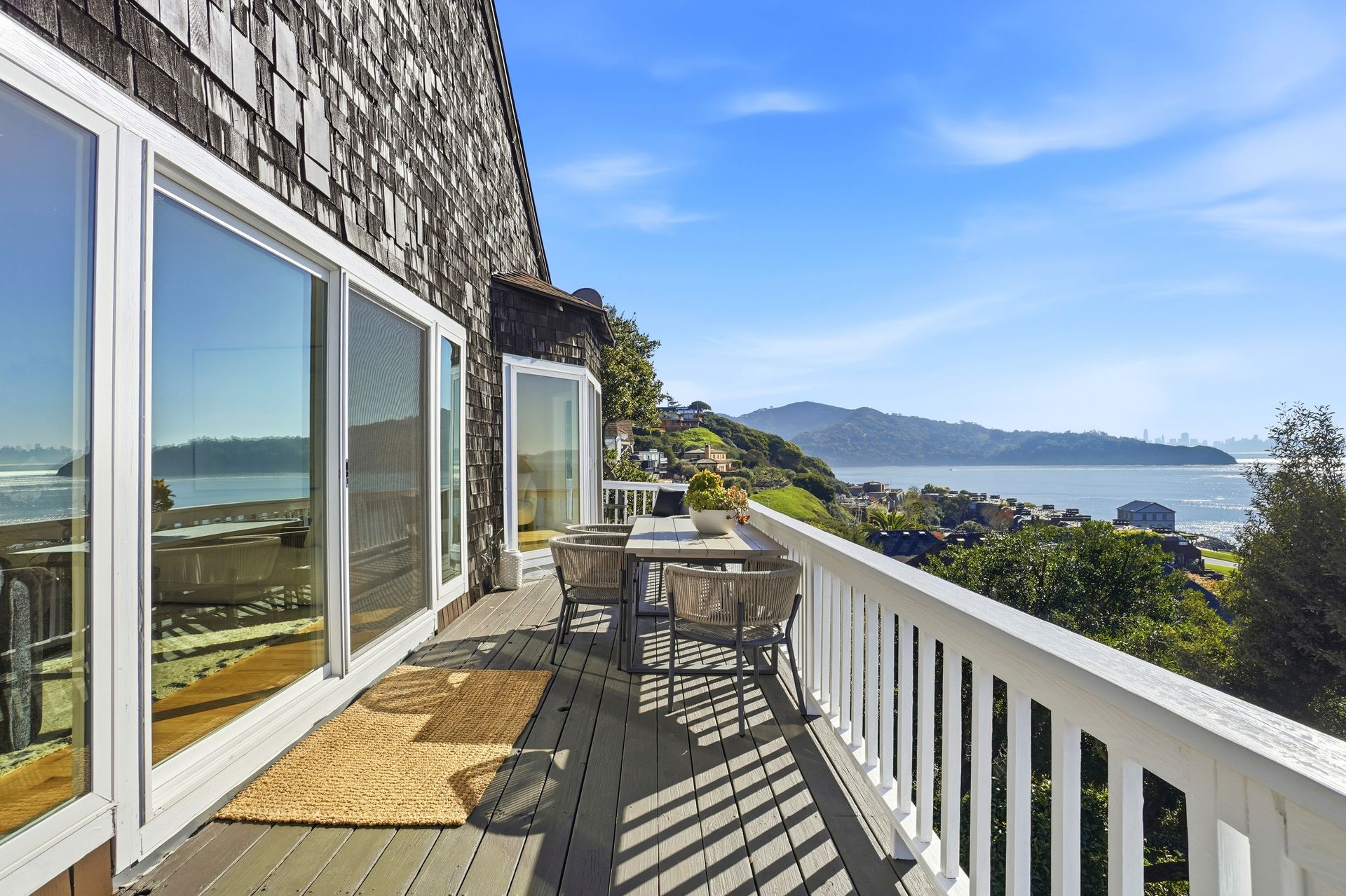 From the decks, the views stretch wide and cinematic—across the San Francisco skyline, the Golden Gate Bridge, Angel Island, Belvedere, Richardson Bay, the Corinthian Yacht Club, the base of Mt. Tamalpais, and Downtown Tiburon below. As the day winds down, sunsets wash the bay in color, turning evening into an experience.