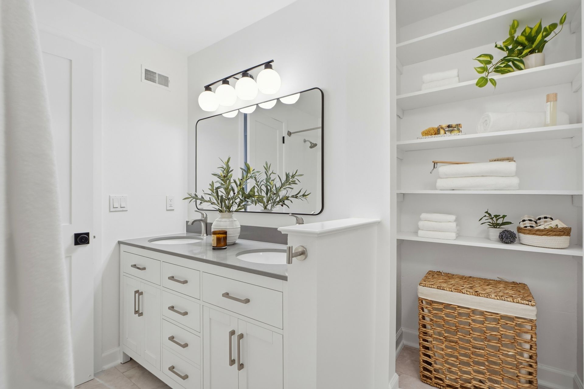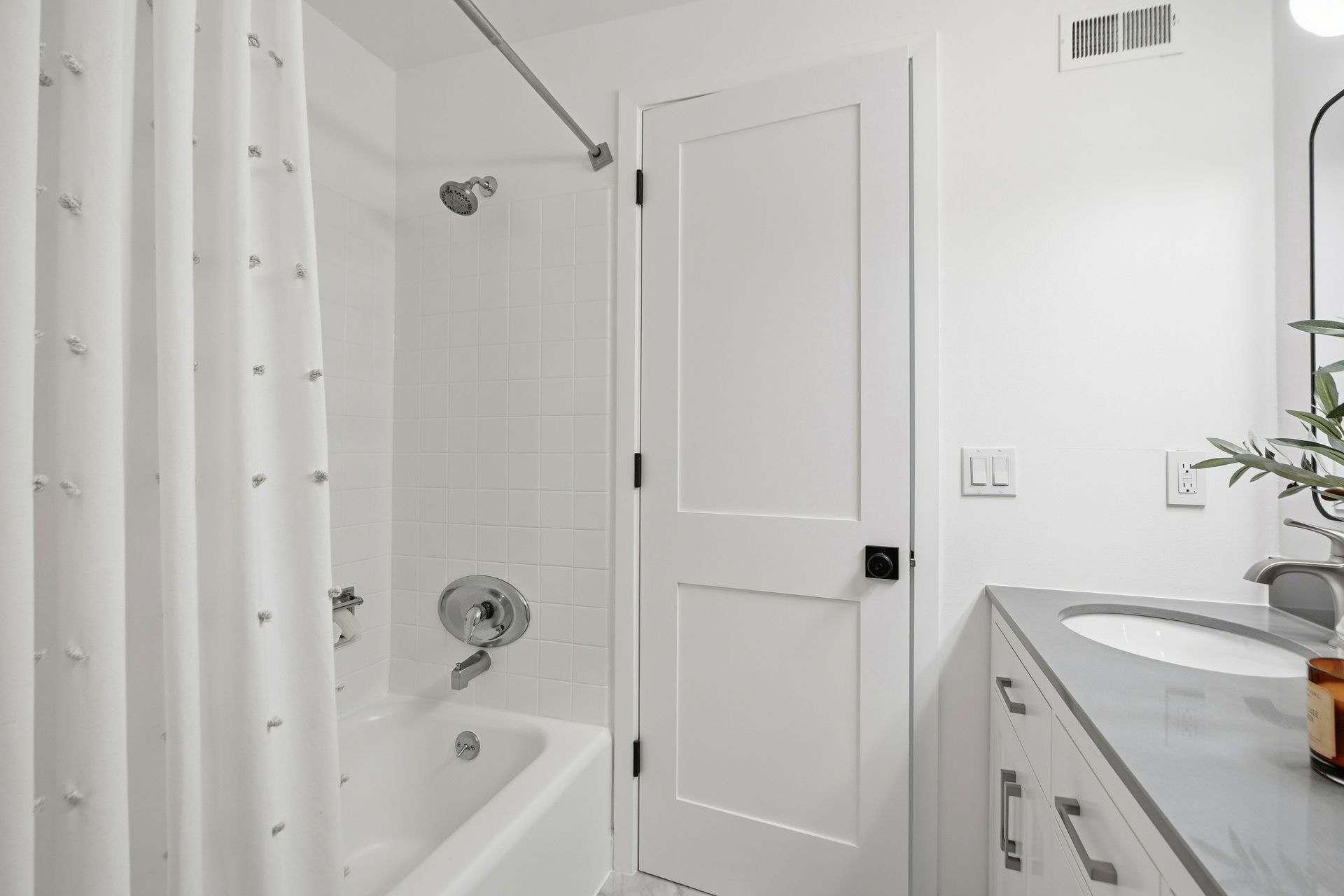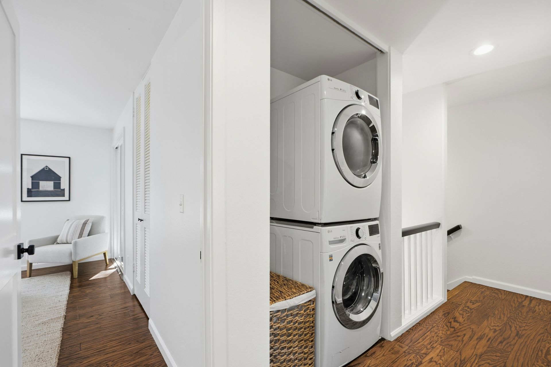 Inside, you'll find fresh paint, newer dual-pane windows, solid core interior doors, upgraded AC, and a furnace for modern comfort and peace of mind. The inviting living area showcases custom built-in shelving, creating both character and functional storage. The kitchen is equipped with updated appliances, and a Nest thermostat for energy-conscious comfort year-round. Also on the main level is a recently updated bathroom. Upstairs, the primary bedroom includes a generous walk-in closet and an attached covered deck to enjoy warm evenings or morning coffee. Two additional bedrooms, an updated bathroom with a double vanity sink and washer and dryer are also conveniently located upstairs for everyday ease.
