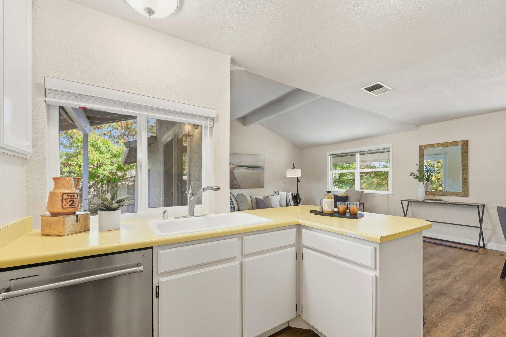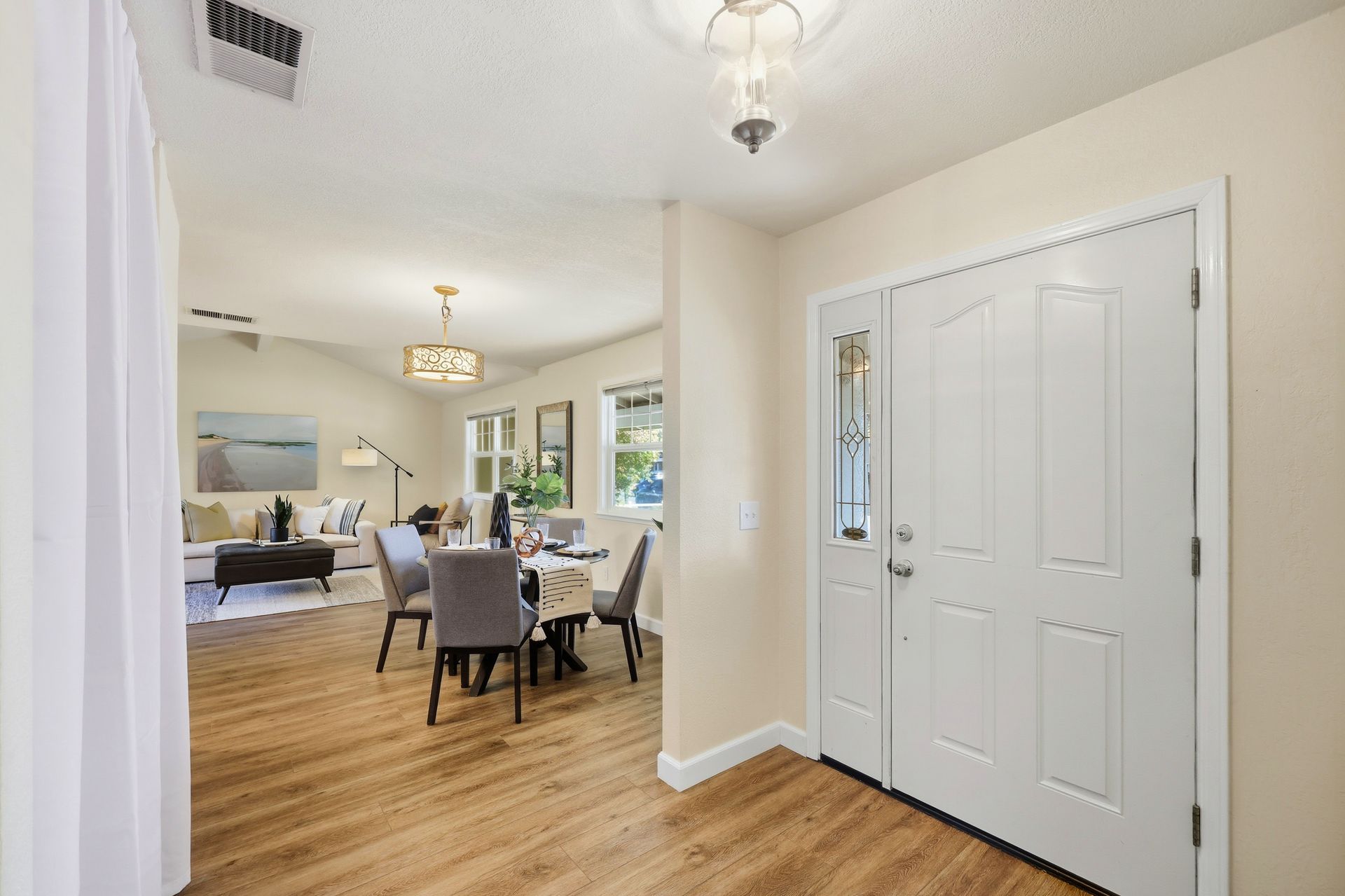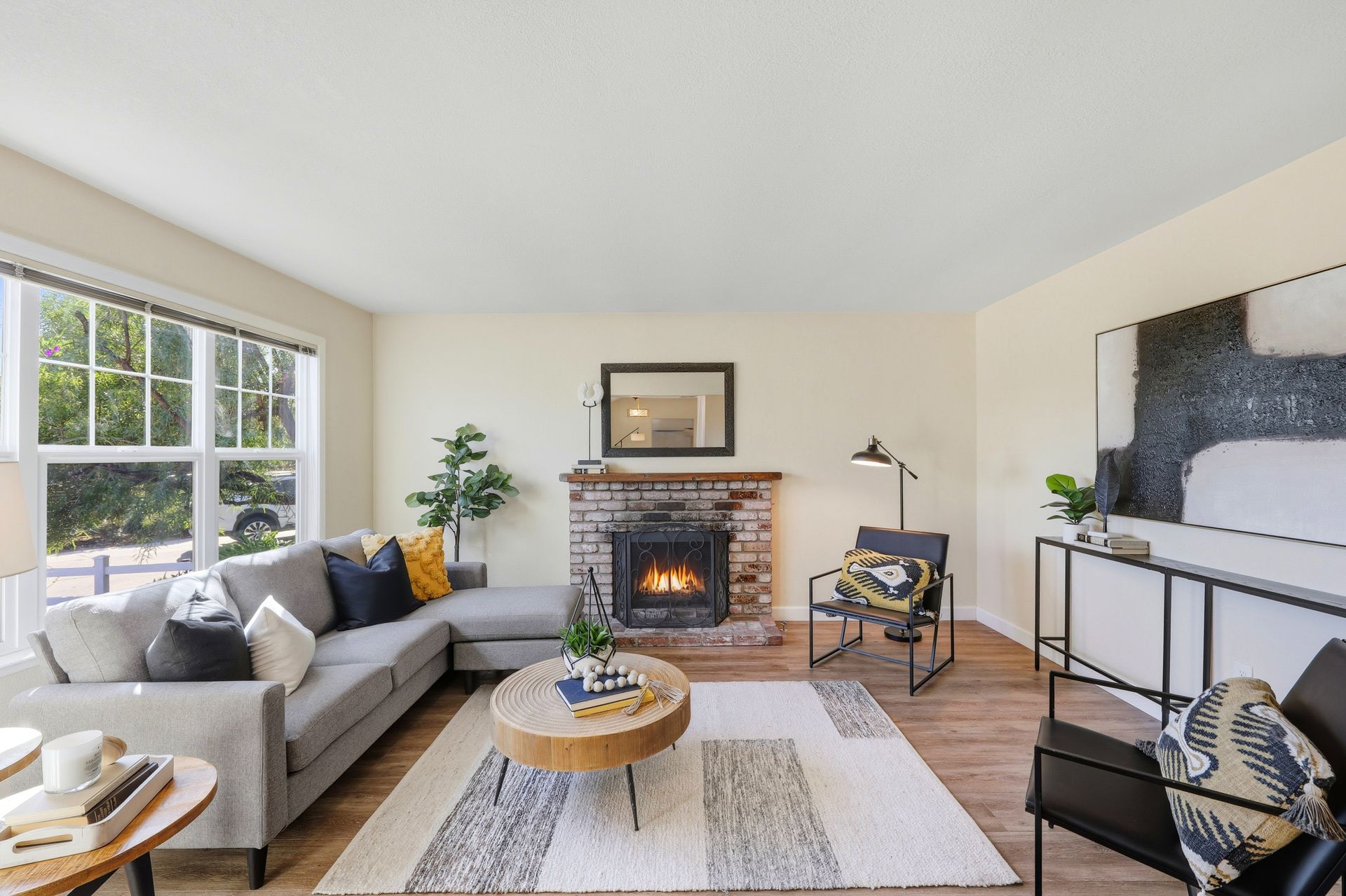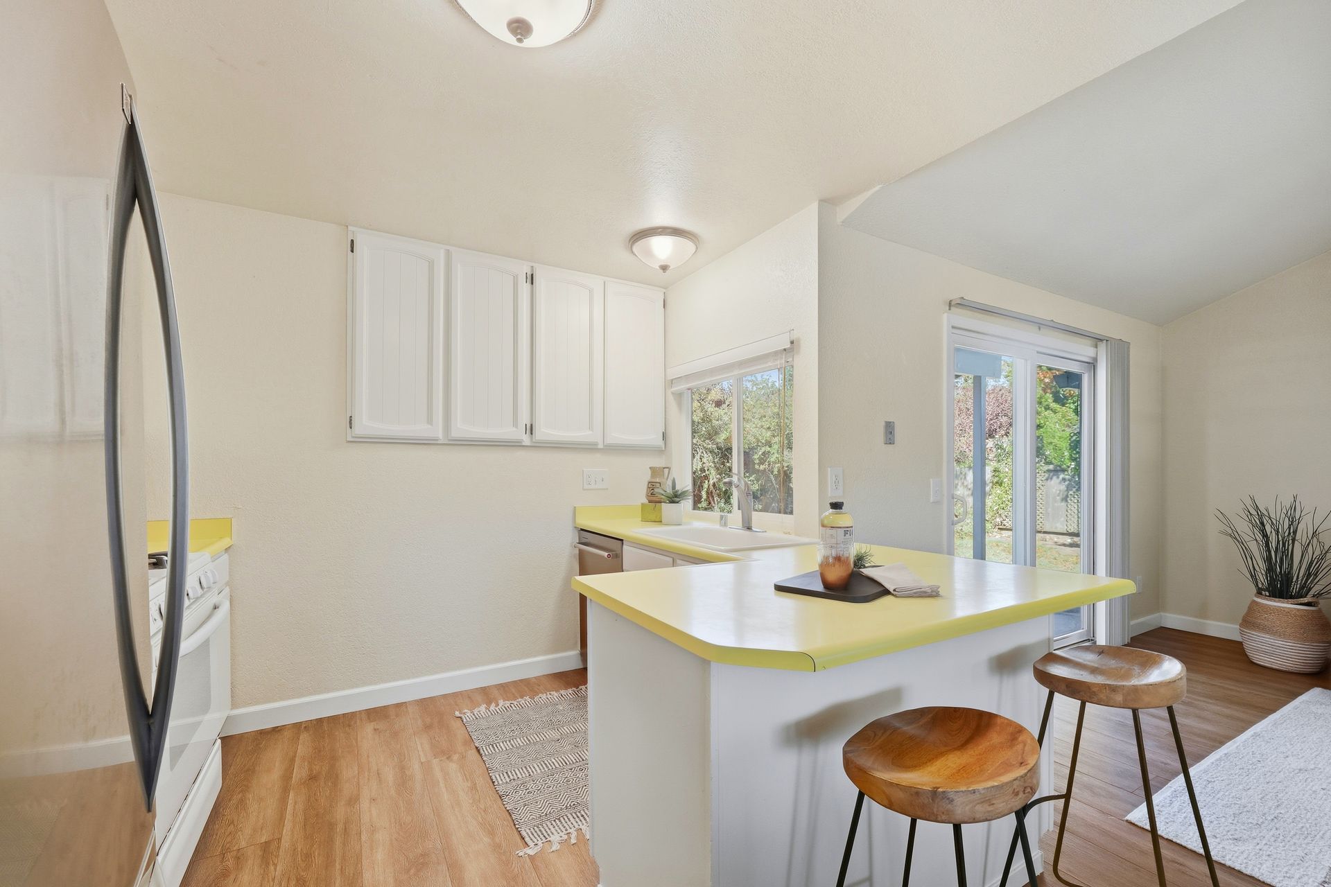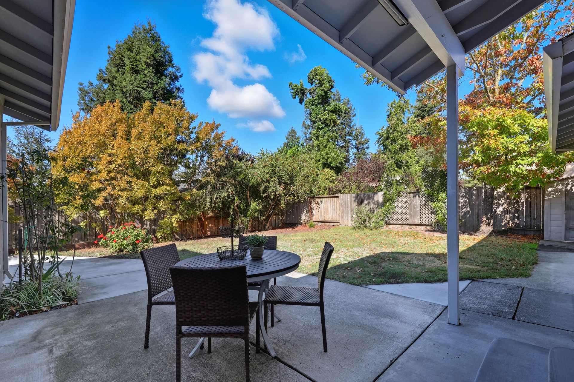 Welcome home to this inviting single-story residence offering 1,408± square feet of comfortable livable space with three bedrooms and two full baths. The light-filled living room features a wood-burning fireplace, ideal for cozy evenings, while the kitchen opens to a casual family room that flows effortlessly to the backyard. A large sliding door leads to a spacious and private backyard nicely hardscaped to provide areas for dining, gardening, and relaxing in the hot tub. Recent upgrades enhance both style and comfort, including wide-plank high-quality COREtec flooring, Milgard dual-pane windows, fresh exterior paint, and a newer furnace and air conditioning system. Both bathrooms have been tastefully refreshed with newer vanities and paint. Additional features include a two-car garage and newer concrete driveway, offering convenience and curb appeal.
