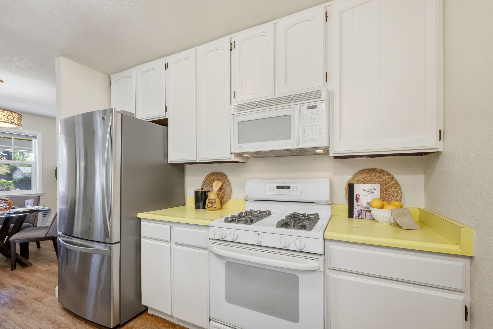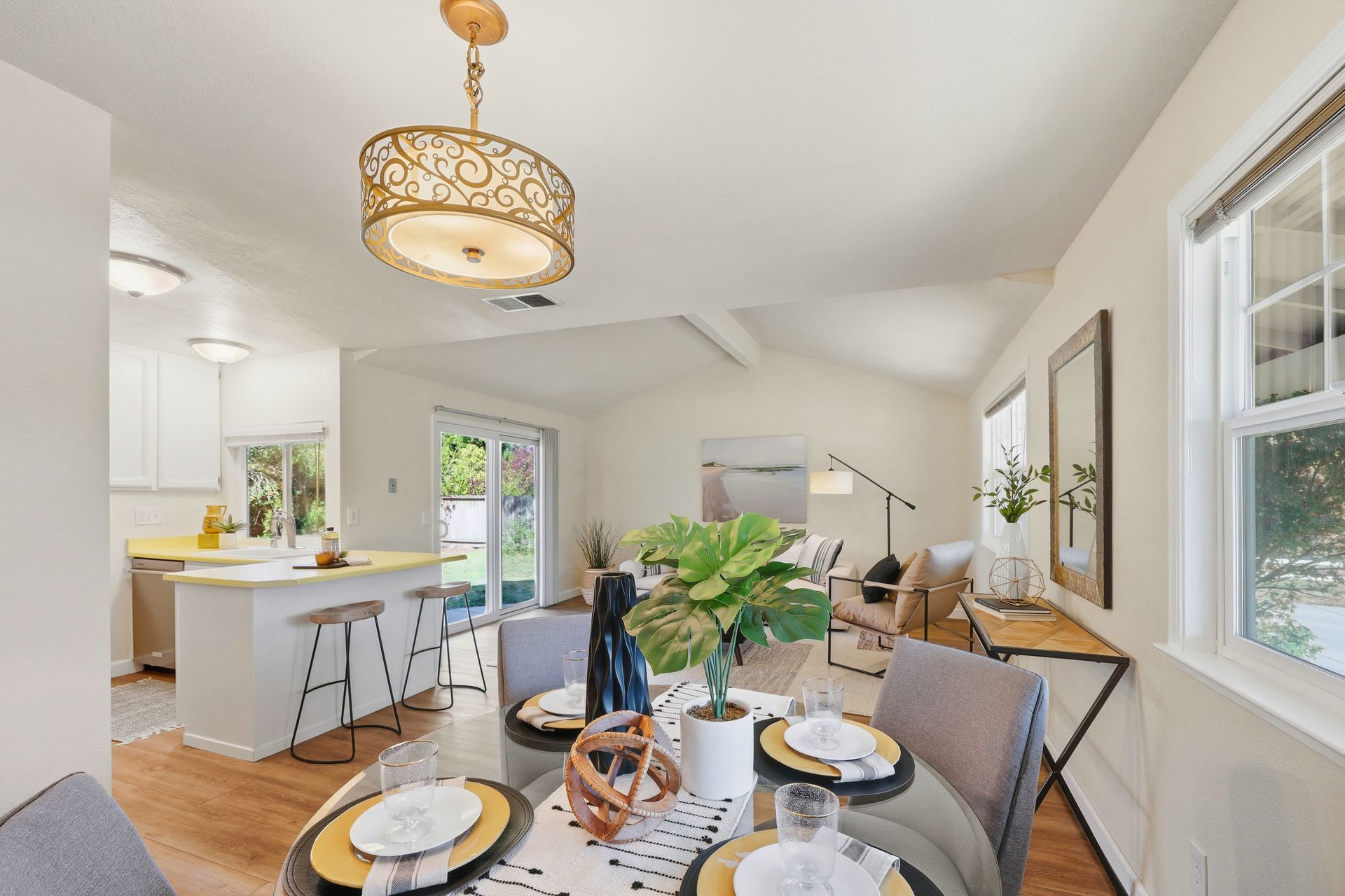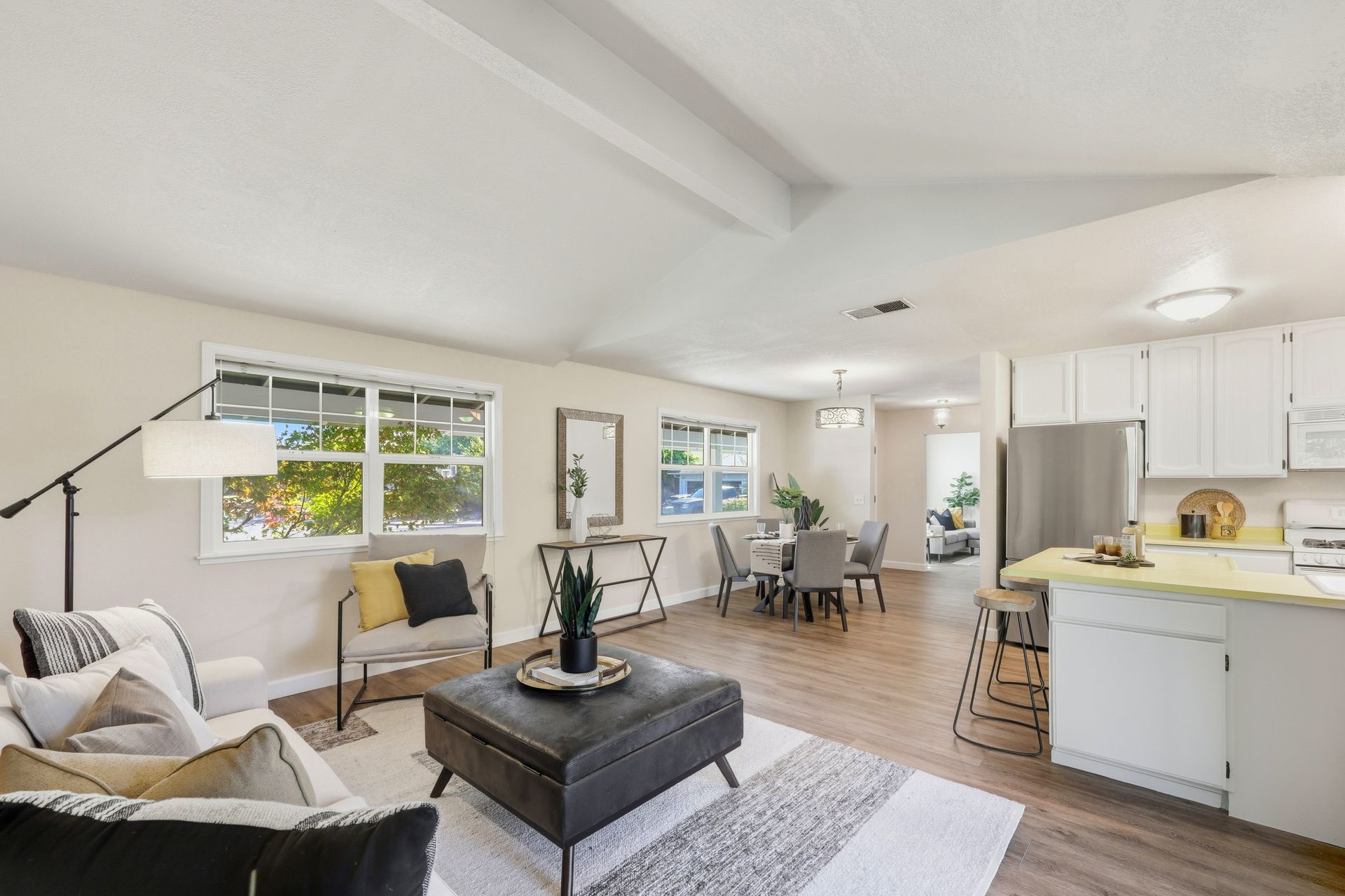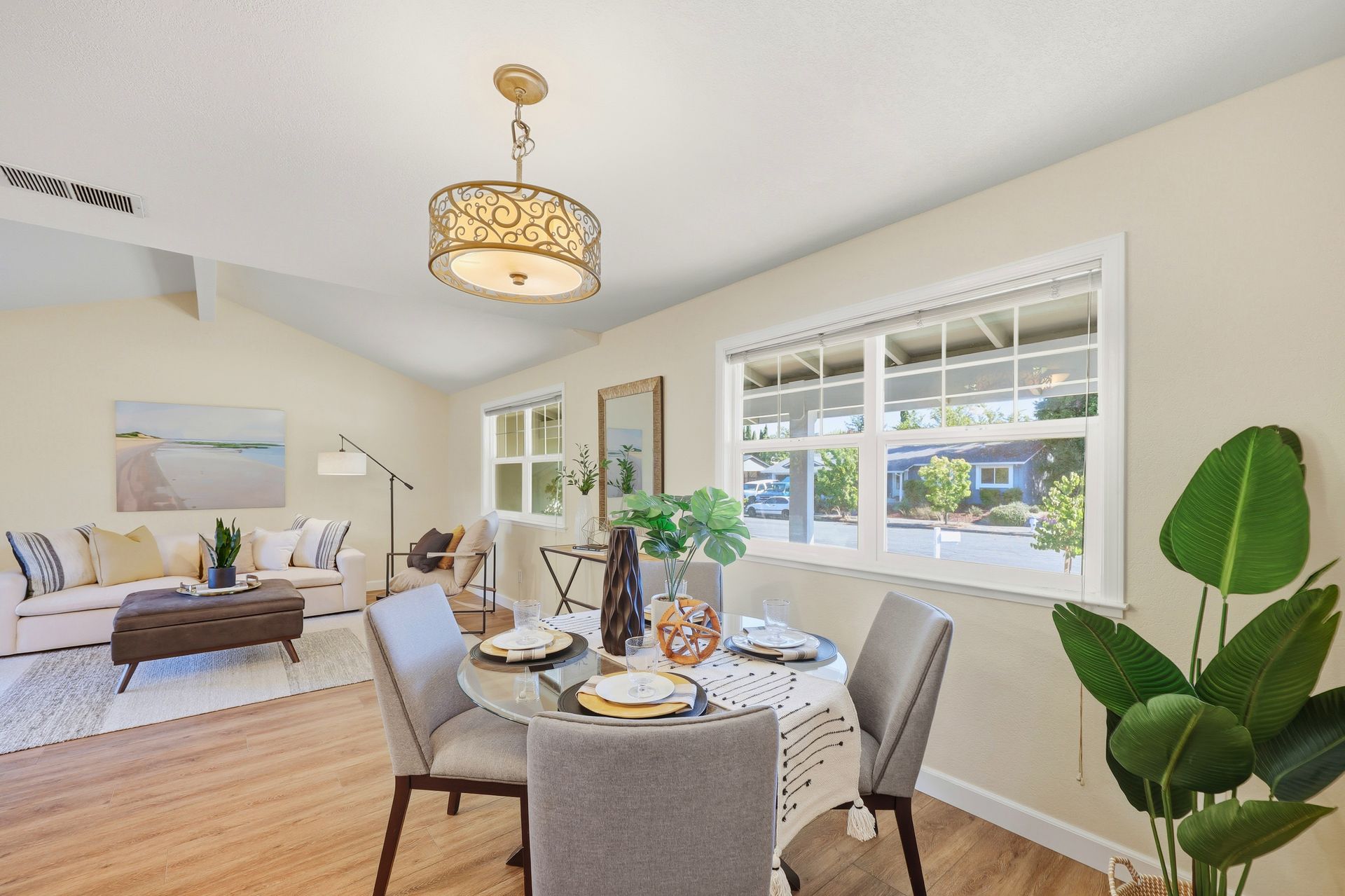 Welcome home to this inviting single-story residence offering 1,408± square feet of comfortable livable space with three bedrooms and two full baths. The light-filled living room features a wood-burning fireplace, ideal for cozy evenings, while the kitchen opens to a casual family room that flows effortlessly to the backyard. A large sliding door leads to a spacious and private backyard nicely hardscaped to provide areas for dining, gardening, and relaxing in the hot tub. Recent upgrades enhance both style and comfort, including wide-plank high-quality COREtec flooring, Milgard dual-pane windows, fresh exterior paint, and a newer furnace and air conditioning system. Both bathrooms have been tastefully refreshed with newer vanities and paint. Additional features include a two-car garage and newer concrete driveway, offering convenience and curb appeal.