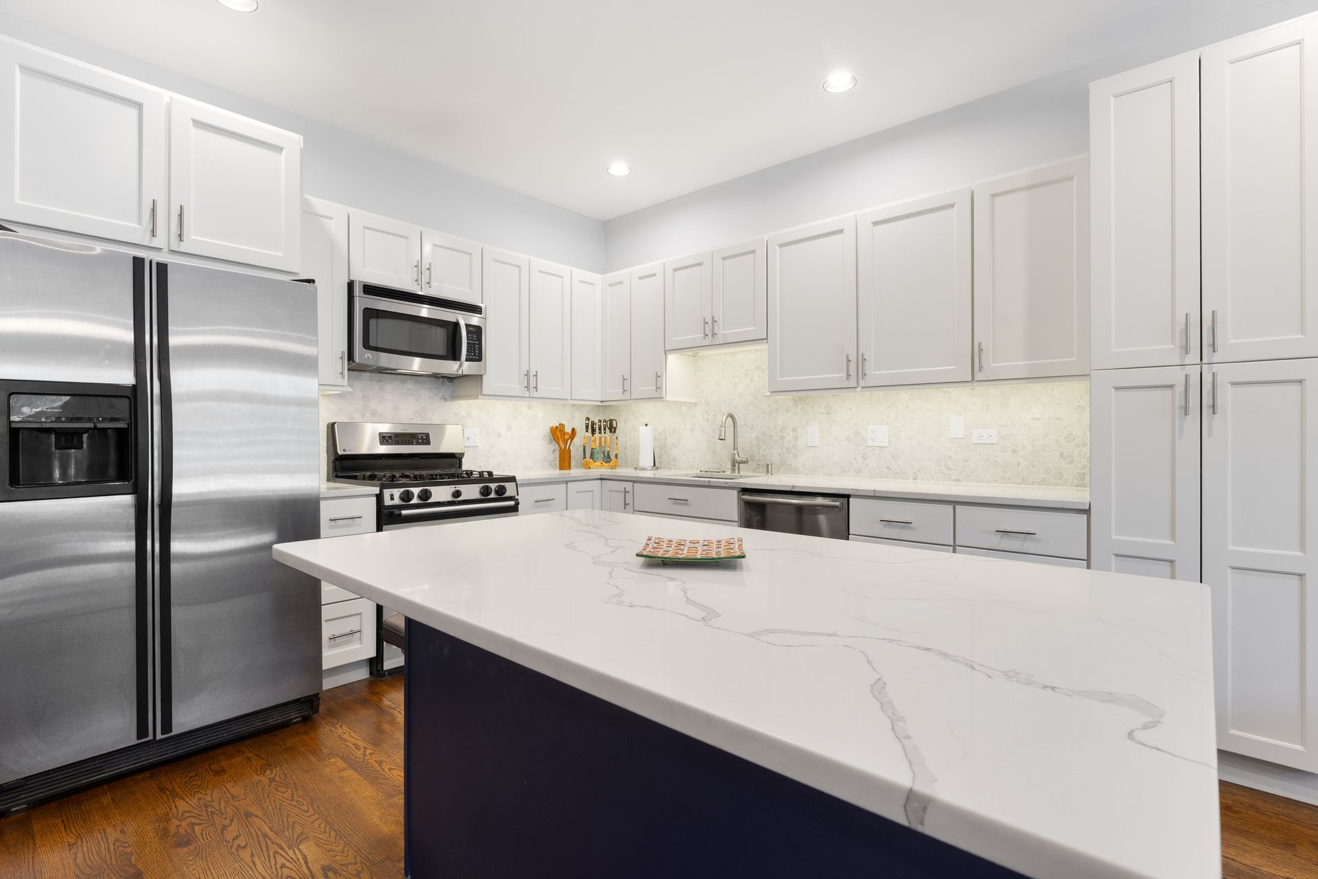 If you've been waiting for the perfect Roscoe Village home, stop scrolling - this is it! This extra-wide, fully updated two-bed, two-bath condo is a total knockout. You'll walk in and instantly notice the fresh, refinished oak hardwood floors and the kind of open layout that just works for real life. The kitchen? Pure showstopper. Crisp white shaker cabinets, sparkling quartz counters, a navy island with a breakfast bar that says "gather here," plus a beverage center and marble backsplash that ties it all together. There's room for a dining table that seats 8-10 - because why not host? - and the oversized living room comes with a marble-wrapped gas fireplace that screams cozy sophistication. The king-sized primary suite has a walk-in closet that's been professionally designed (goodbye clutter!) and a fully renovated en-suite bath with dual quartz vanities, a rain shower, and a soaking tub for those spa-at-home moments. The second bedroom is big enough for guests or a work-from-home setup, with its own gorgeous, renovated full bath. Add in side-by-side laundry, a rear balcony for morning coffee, tandem parking, and a separate storage room - plus a brand-new water heater - and you've got a move-in-ready gem. Best of all? You're steps to the CTA, minutes from Roscoe Village and Lincoln/Belmont dining and shopping, and right in the middle of one of Chicago's most lovable neighborhoods.