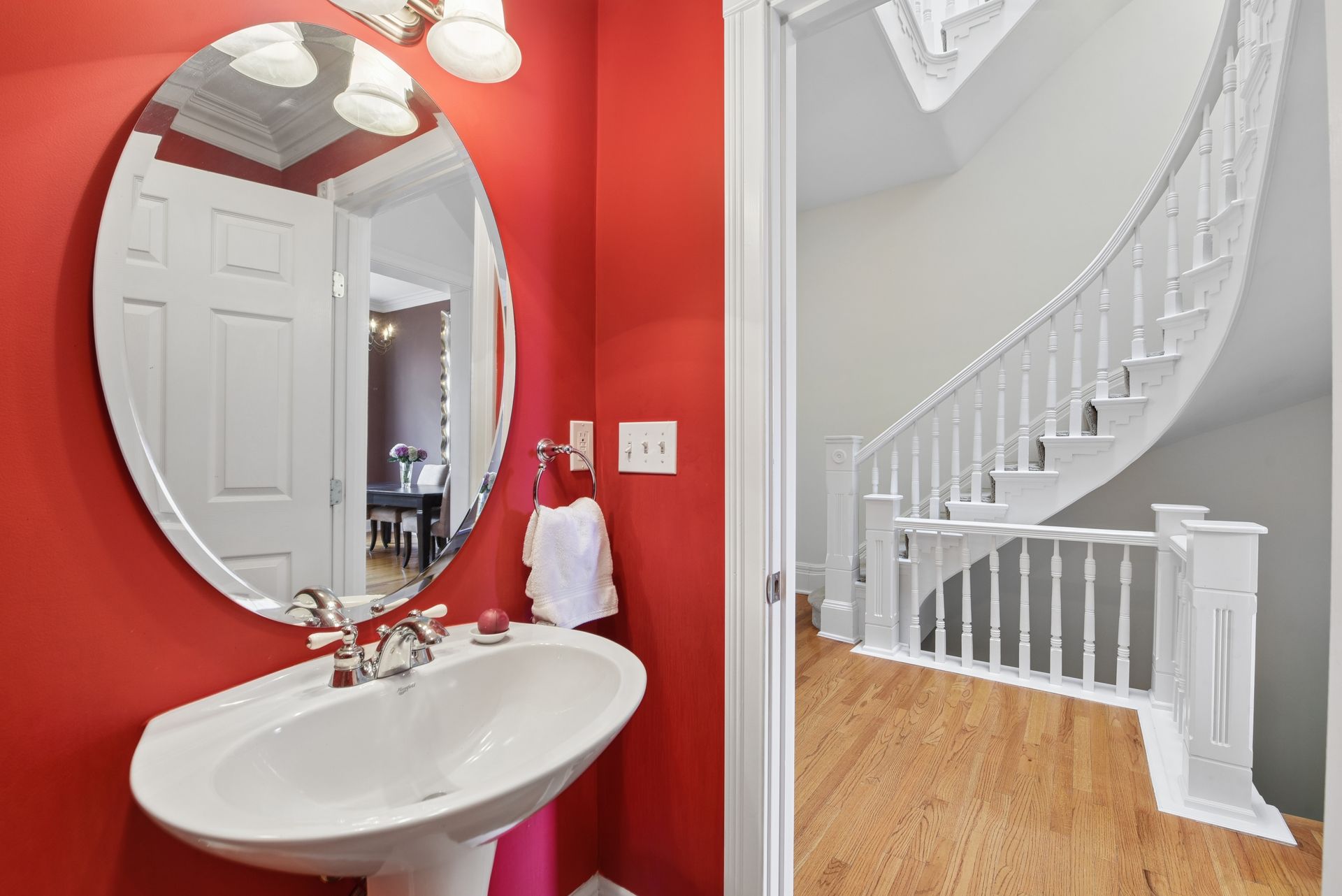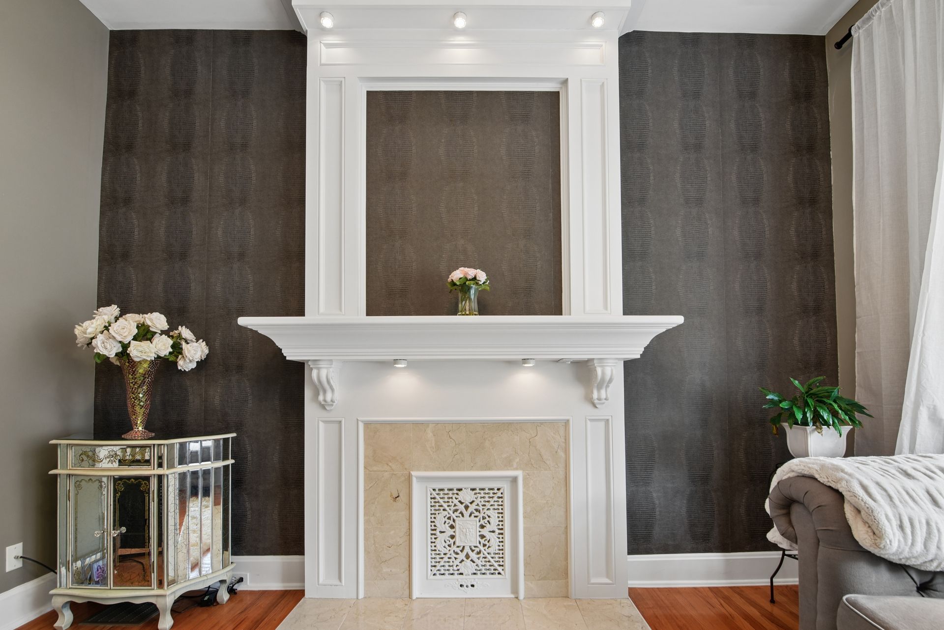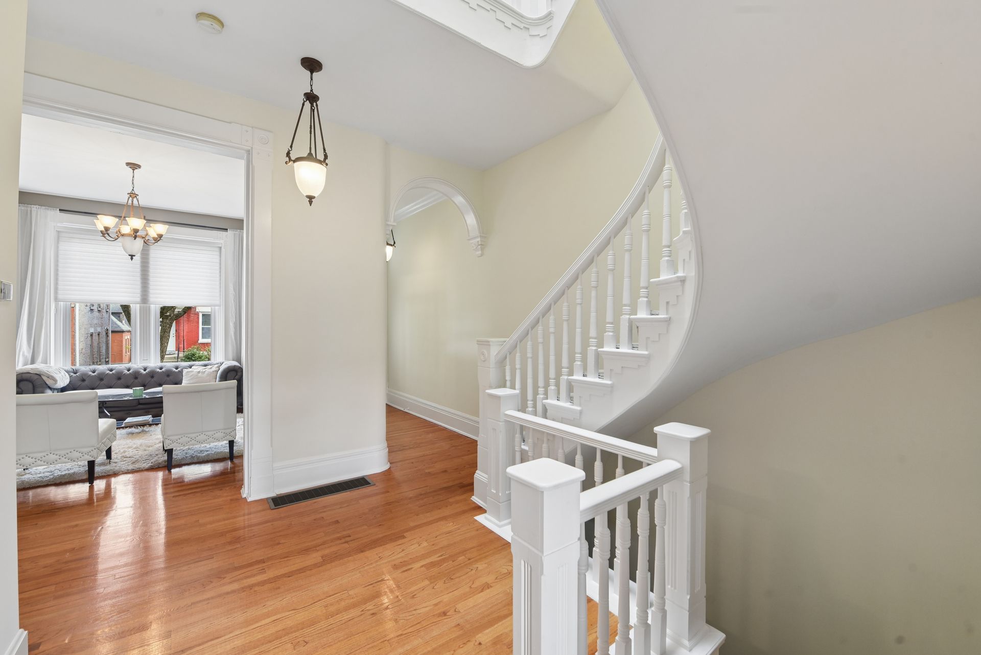 A dramatic, gracefully curving central staircase anchors the home—an architectural showpiece that immediately captures attention. Soaring ceilings, tall baseboards, fireplace, and an abundance of original details create a rich, layered backdrop that feels both timeless and elevated.