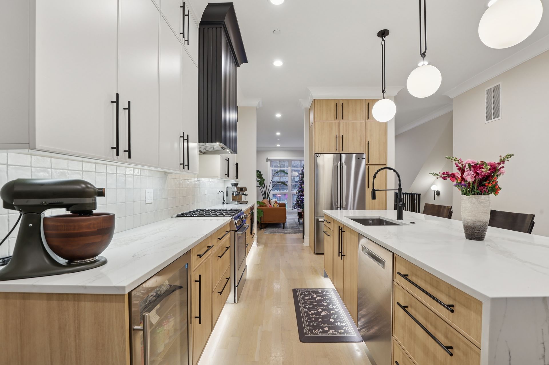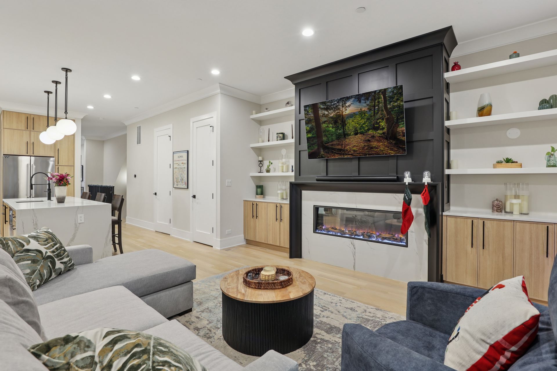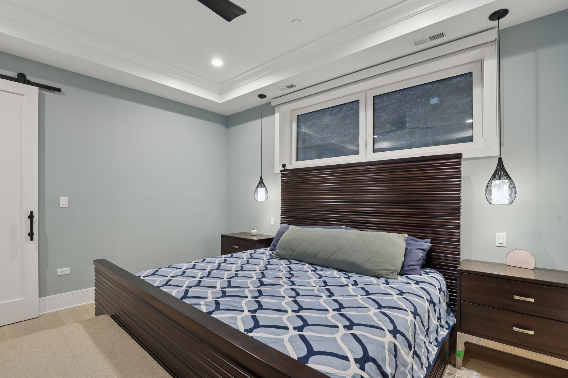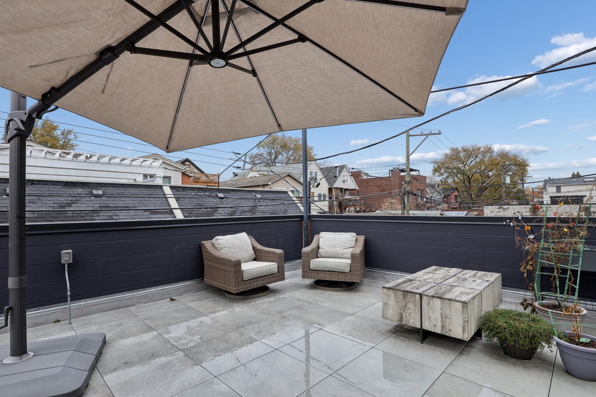 Gorgeous Roscoe Village Duplex Down with Four Bedrooms! Professionally designed with top-of-the-line finishes and exceptional attention to detail, with amazing craftsmanship. Enjoy the chef's kitchen with contemporary cabinets, quartz countertops, a large island, and stainless steel appliances, including a beverage center. Relax in the beautiful family room off the kitchen with custom built-in bookcases and a gorgeous fireplace. Family room leads to a private, covered terrace with a ceiling fan and 10-foot folding windows/doors. Perfect space for grilling and entertaining! Many luxury finishes, such as eight-foot doors, seven-inch wide-plank flooring, and custom-powered shades with a remote. Live your best life in the lower level with high ceilings and radiant heat, with four bedrooms and two baths. It boasts a spa-like primary suite with an enormous walk-in closet. The impressive primary bath has a double vanity, separate shower and free-standing soaking tub, with stunning designer tiles and light fixtures. This home has an amazing outdoor space that leads to a terrace from the family room, back deck and private garage roof deck. Garage parking is included in the price. Everything you are looking for is in the heart of Roscoe Village. Walk to the el, grocery stores, boutiques and amazing restaurants.