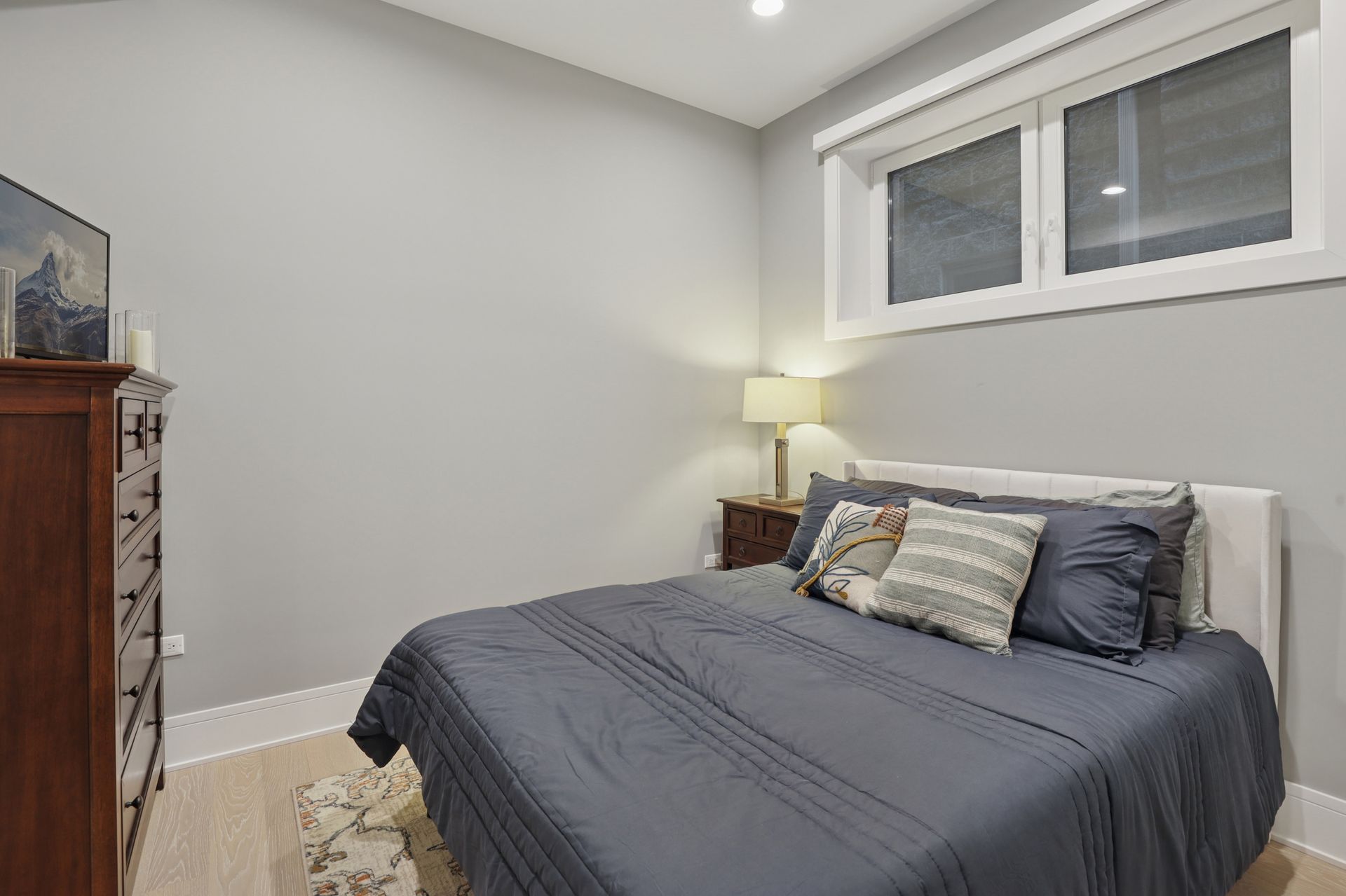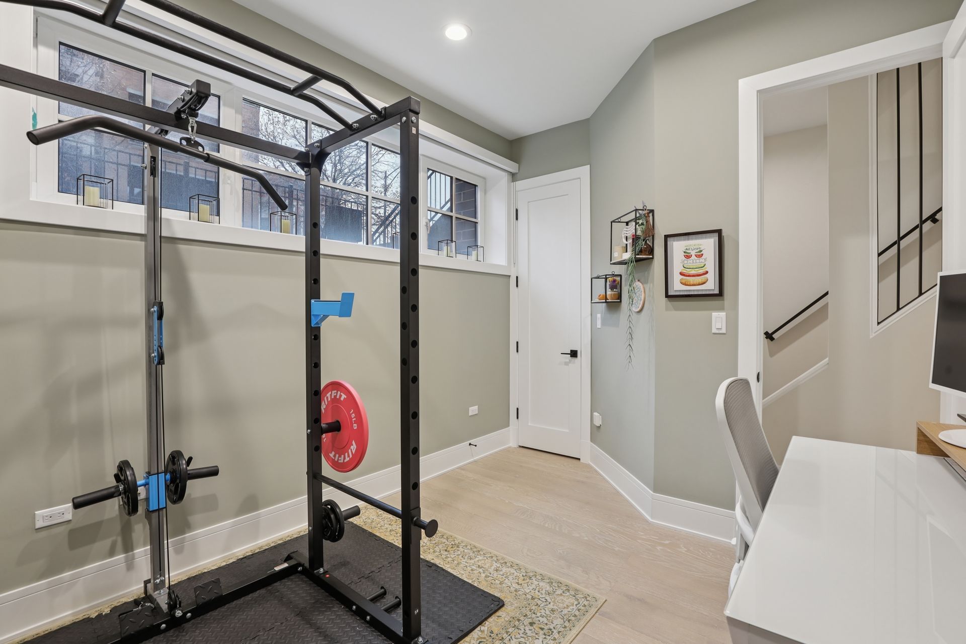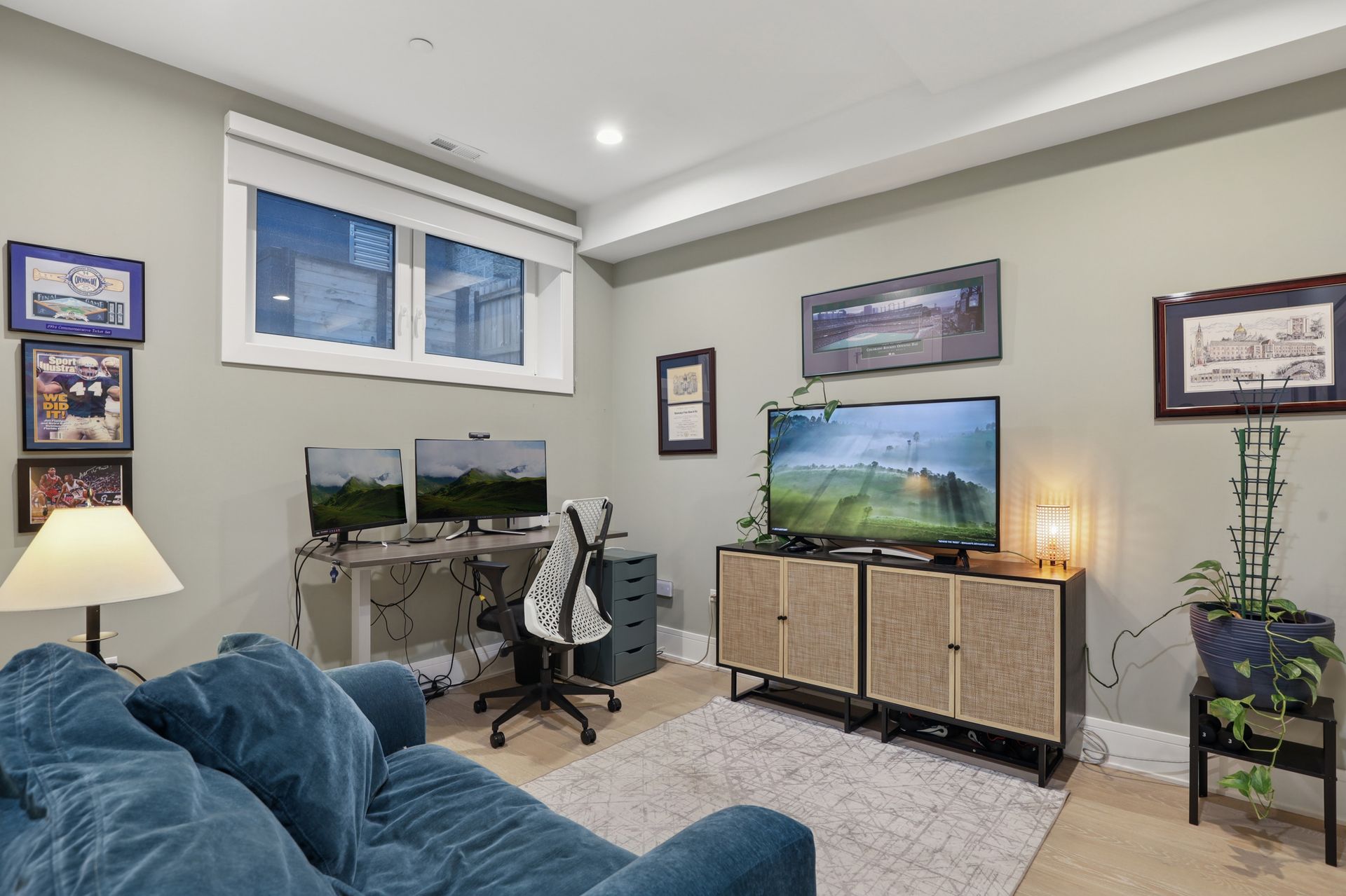 Gorgeous Roscoe Village Duplex Down with Four Bedrooms! Professionally designed with top-of-the-line finishes and exceptional attention to detail, with amazing craftsmanship. Enjoy the chef's kitchen with contemporary cabinets, quartz countertops, a large island, and stainless steel appliances, including a beverage center. Relax in the beautiful family room off the kitchen with custom built-in bookcases and a gorgeous fireplace. Family room leads to a private, covered terrace with a ceiling fan and 10-foot folding windows/doors. Perfect space for grilling and entertaining! Many luxury finishes, such as eight-foot doors, seven-inch wide-plank flooring, and custom-powered shades with a remote. Live your best life in the lower level with high ceilings and radiant heat, with four bedrooms and two baths. It boasts a spa-like primary suite with an enormous walk-in closet. The impressive primary bath has a double vanity, separate shower and free-standing soaking tub, with stunning designer tiles and light fixtures. This home has an amazing outdoor space that leads to a terrace from the family room, back deck and private garage roof deck. Garage parking is included in the price. Everything you are looking for is in the heart of Roscoe Village. Walk to the el, grocery stores, boutiques and amazing restaurants.