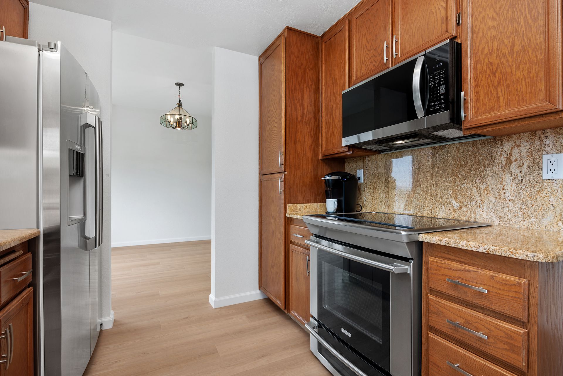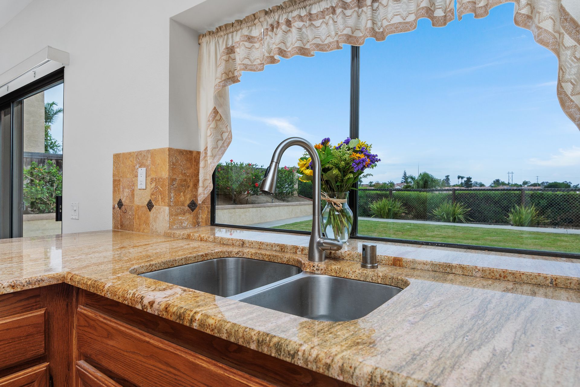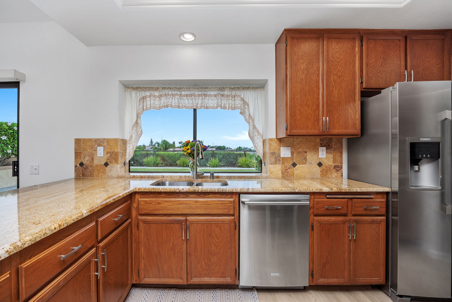 Inside, the home welcomes you with volume ceilings, newer pearl oak wood-look luxury vinyl plank flooring, and fresh carpet. The functional kitchen is designed with granite countertops, a stone backsplash, ample cabinetry, and a breakfast bar that opens to the informal dining area and family room. The family room’s updated ledger stone fireplace serves as a modern focal point, creating a warm gathering space. A formal living room and dining room add flexibility for entertaining or peaceful evenings at home.