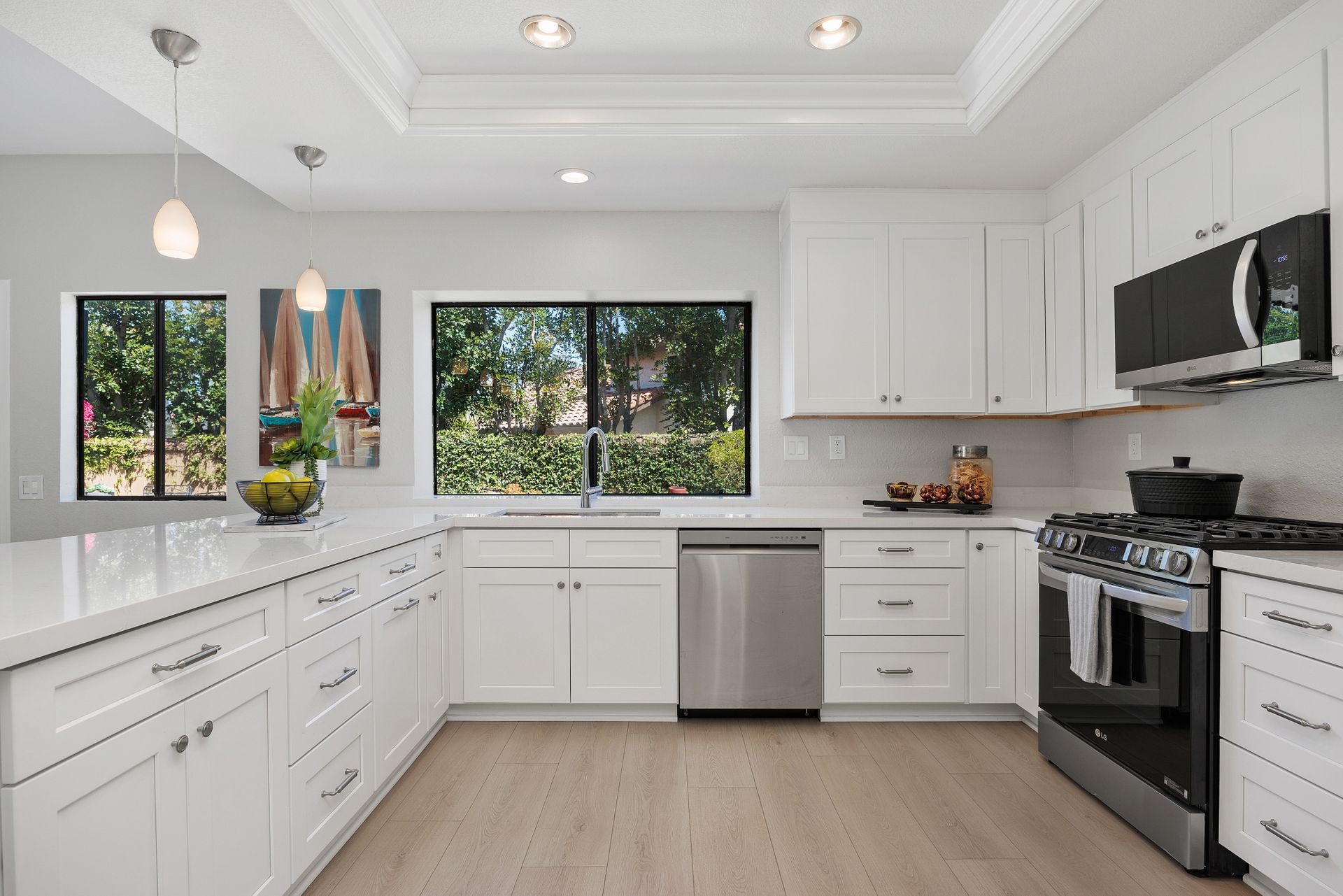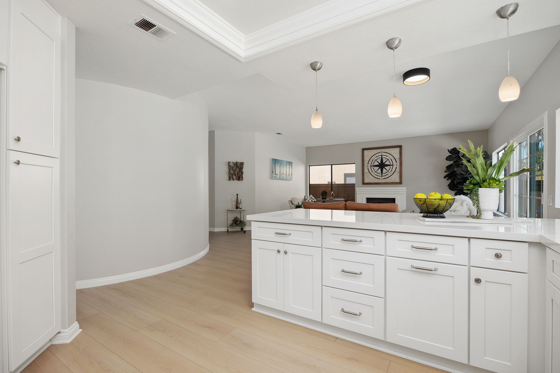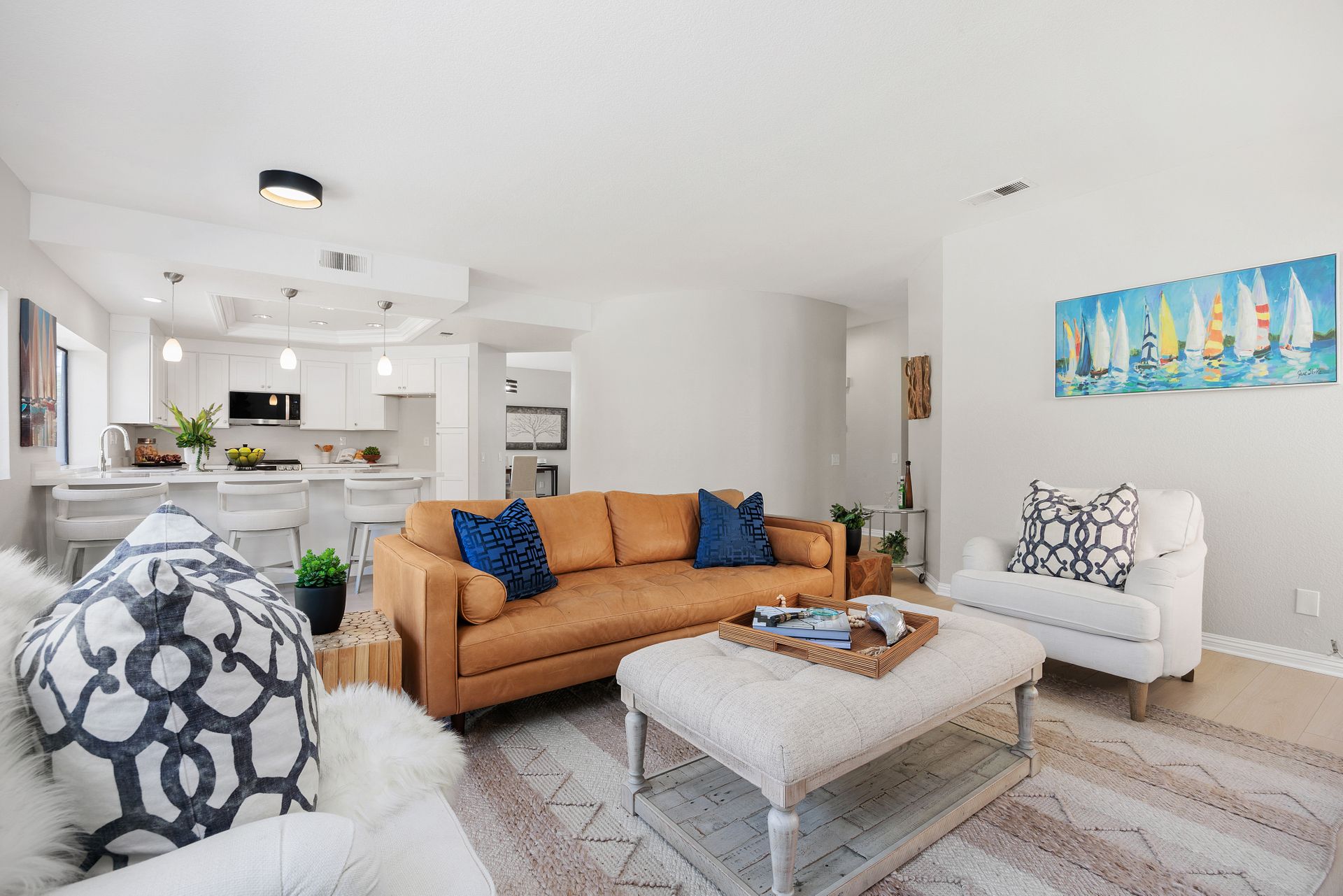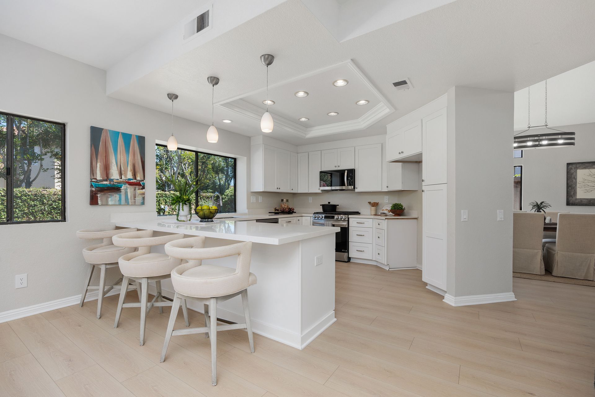 Stunning coastal-chic style shines in this newly updated Chateau del Norte home! The remodeled kitchen features newer sleek white slab counters, newer cabinetry with soft close feature, appliances and designer lighting. A breakfast bar with pendant lights opens seamlessly to the spacious family room, where a cozy fireplace creates an inviting focal point.