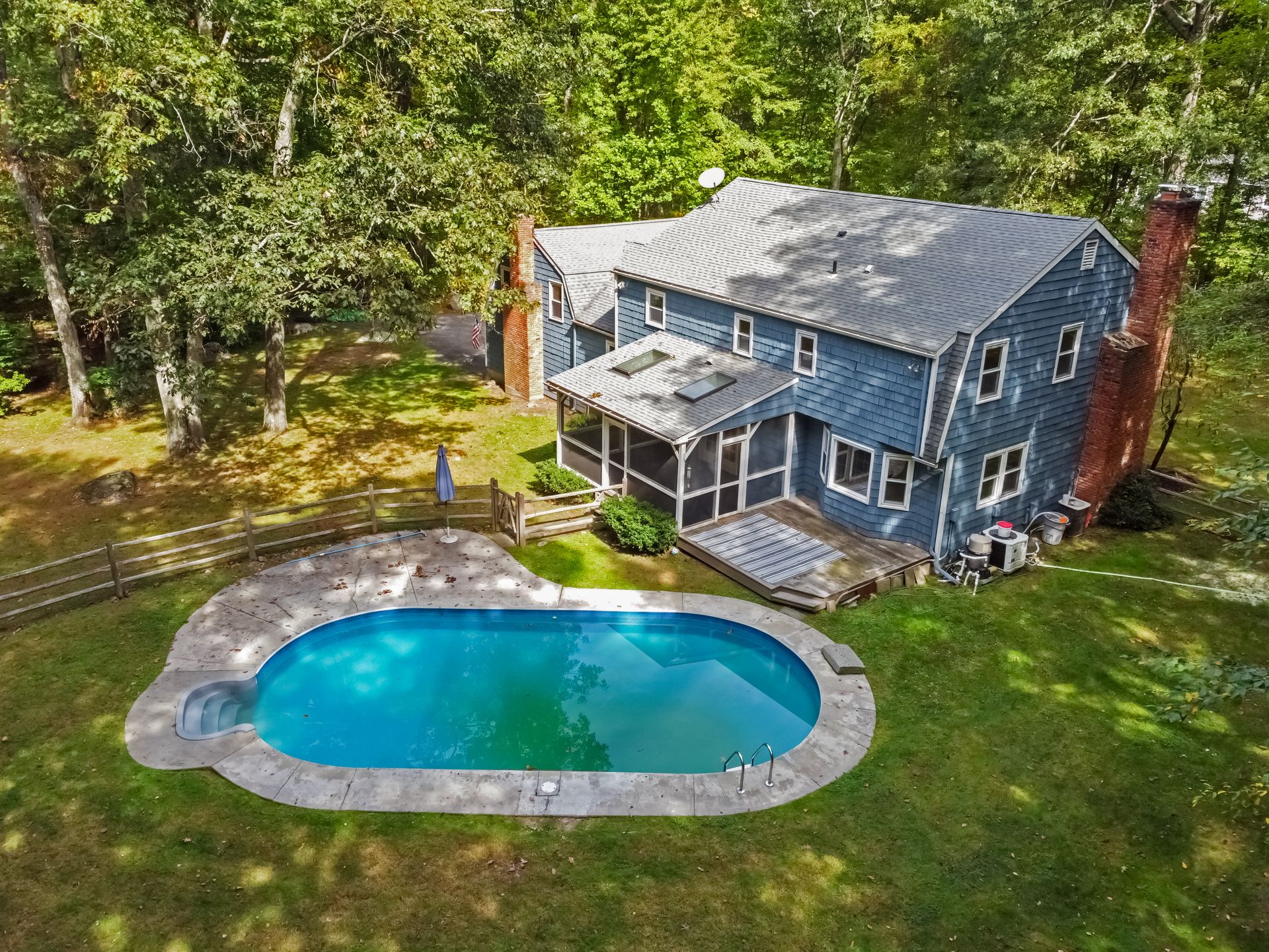 Welcome to 2 Winding Brook Road, a beautifully appointed 3,096 square foot Colonial with four bedrooms and two full and one half baths, set on 3.46 level acres in one of Newtown’s most desirable locations. From the moment you arrive, you’ll be drawn to the serene setting and inviting curb appeal. Once inside, the home continues to impress. The heart of the home is the chef’s kitchen, featuring a SubZero refrigerator, Wolf cooktop, GE double wall oven, granite-topped island, and cabinets galore. The kitchen opens to casual dining and entertaining spaces, with hardwood floors flowing throughout. Gather in the elegant living room with its cozy fireplace, host guests in the formal dining room, or relax in the walk-up family room where a second fireplace creates the perfect ambiance. Upstairs, the spacious primary suite offers a welcoming retreat with its own fireplace and a full bath featuring dual sinks and a shower. Three additional bedrooms are generously sized, and one provides access to a walk-up attic – ideal for extra storage. The finished 600 square foot lower level is ideal for a media room, playroom, or home gym. Step outside to enjoy the level backyard, vinyl inground pool, and a screened-in porch - great for summer evenings - plus a deck for convenient access to the yard. Additional highlights include three fireplaces, central A/C, walk up attic and hardwood floors throughout. This home blends comfort, function, and charm - ready to welcome its next owner. Schedule your private showing today and make this beautiful property yours!