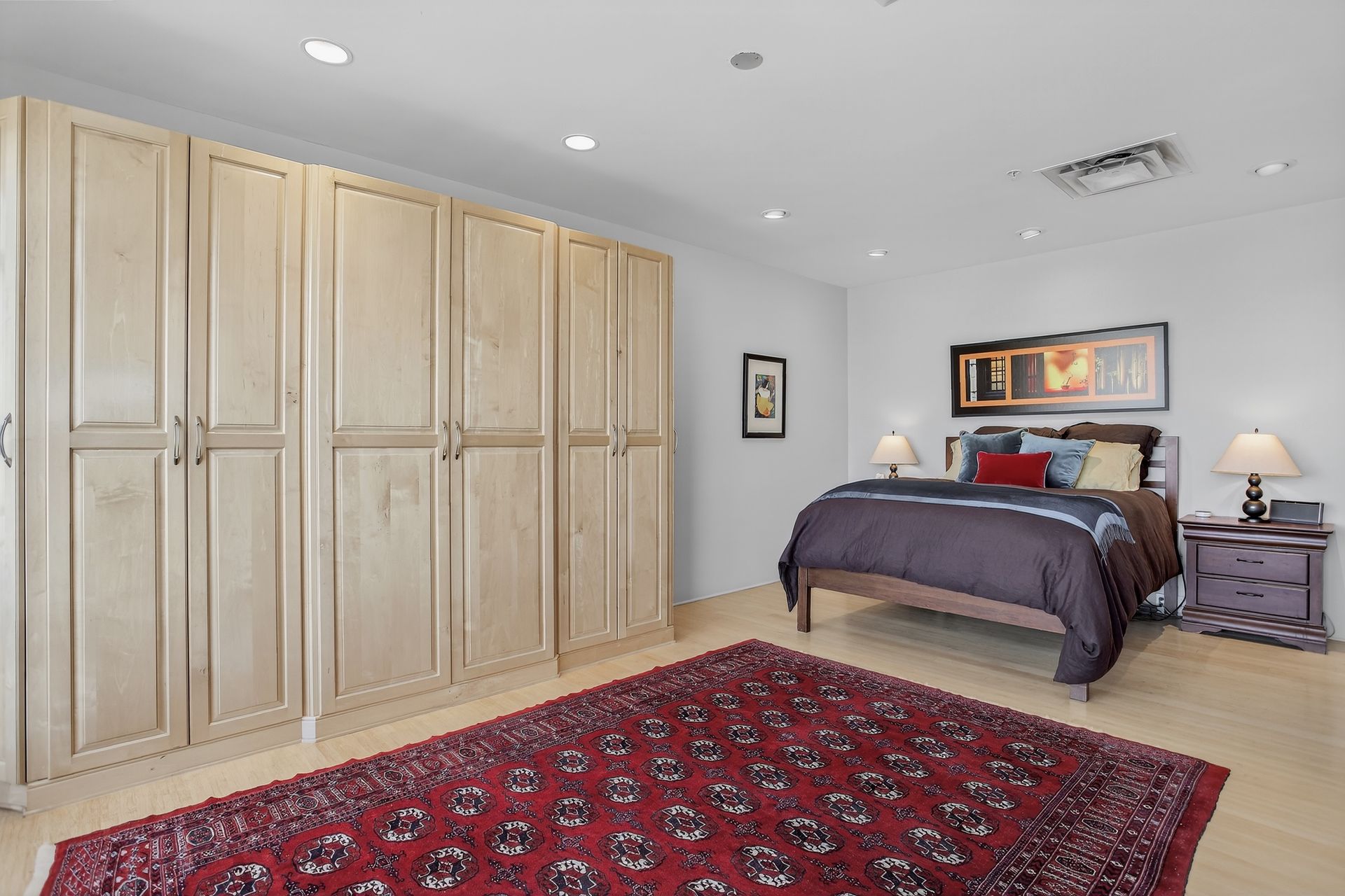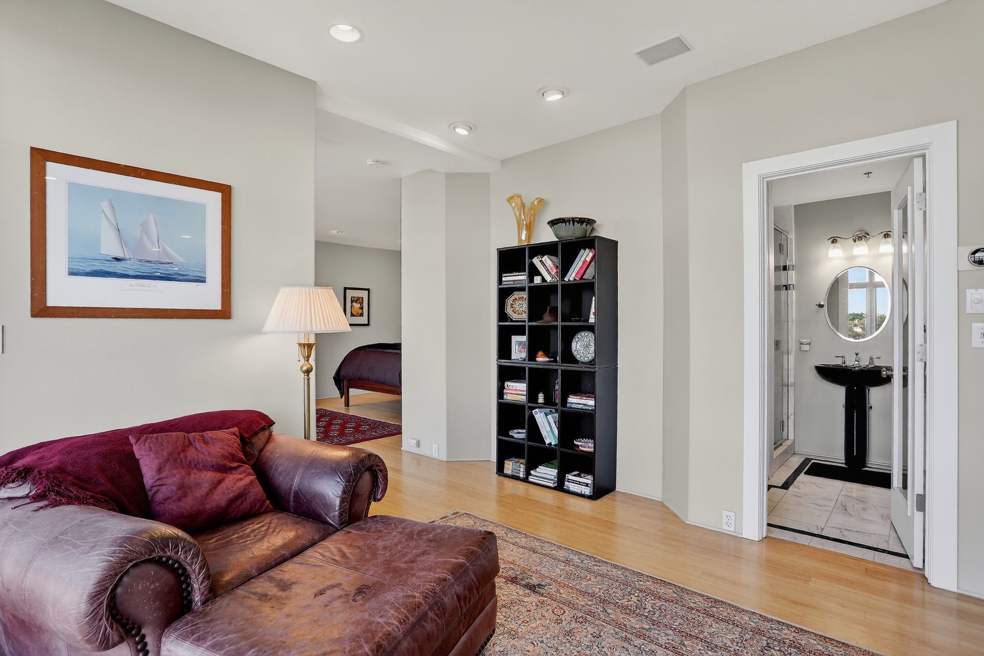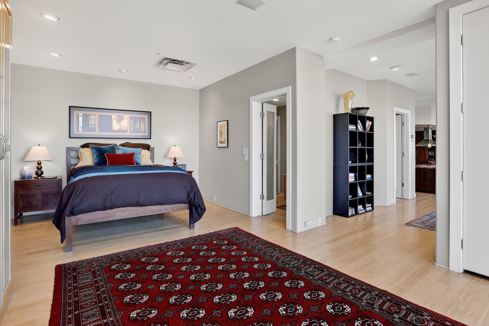 The primary suite functions as a true sanctuary, featuring an en-suite bath, ample closet space, and an attached flex area ideal for a home office or guest lounge. The second bedroom is non-conforming but offers exceptional versatility for a creative studio, library, or overnight visitors. Additional features include two assigned parking spaces, a storage unit, in-unit laundry, and smart upgrades like a Nest thermostat.