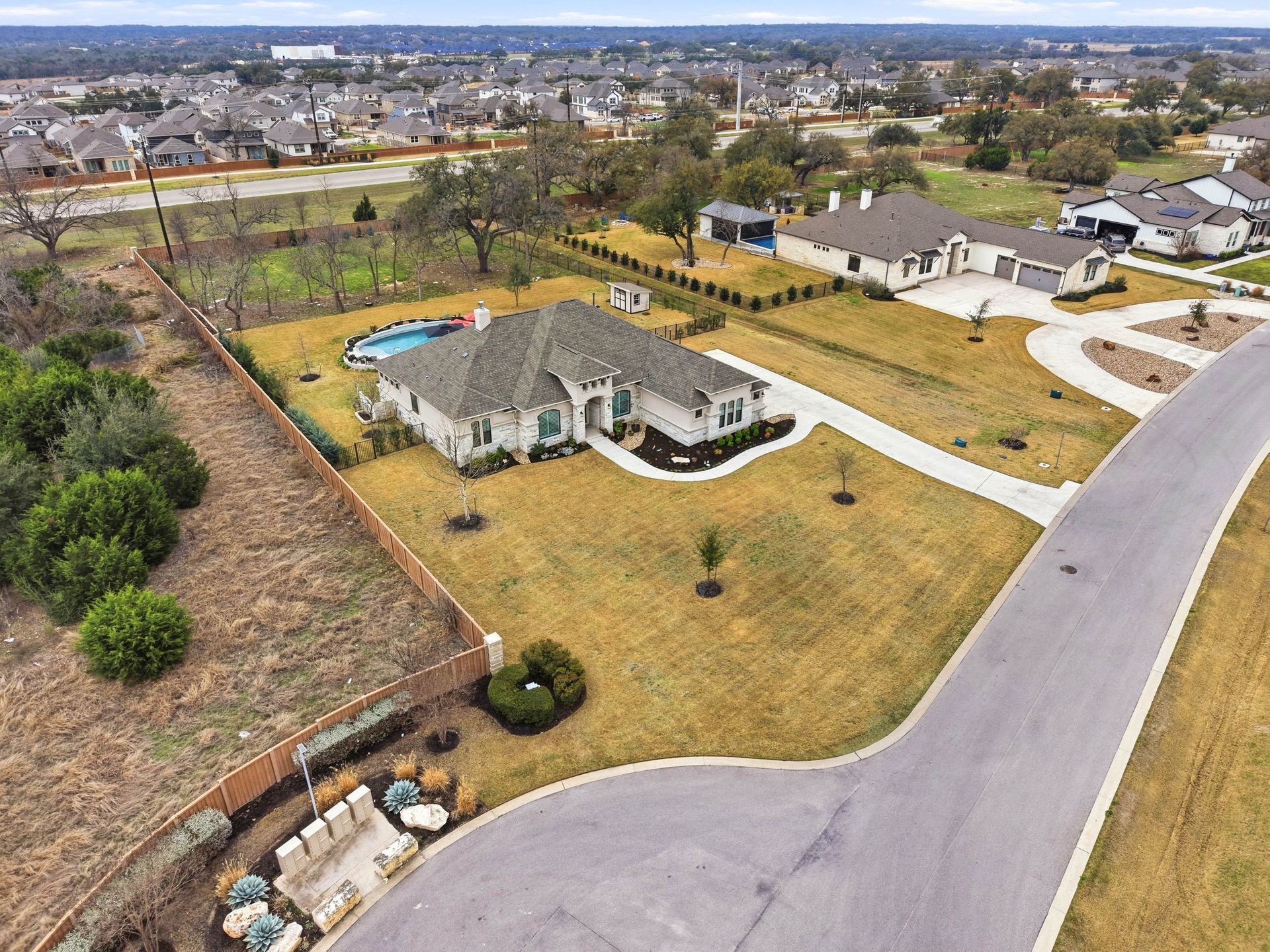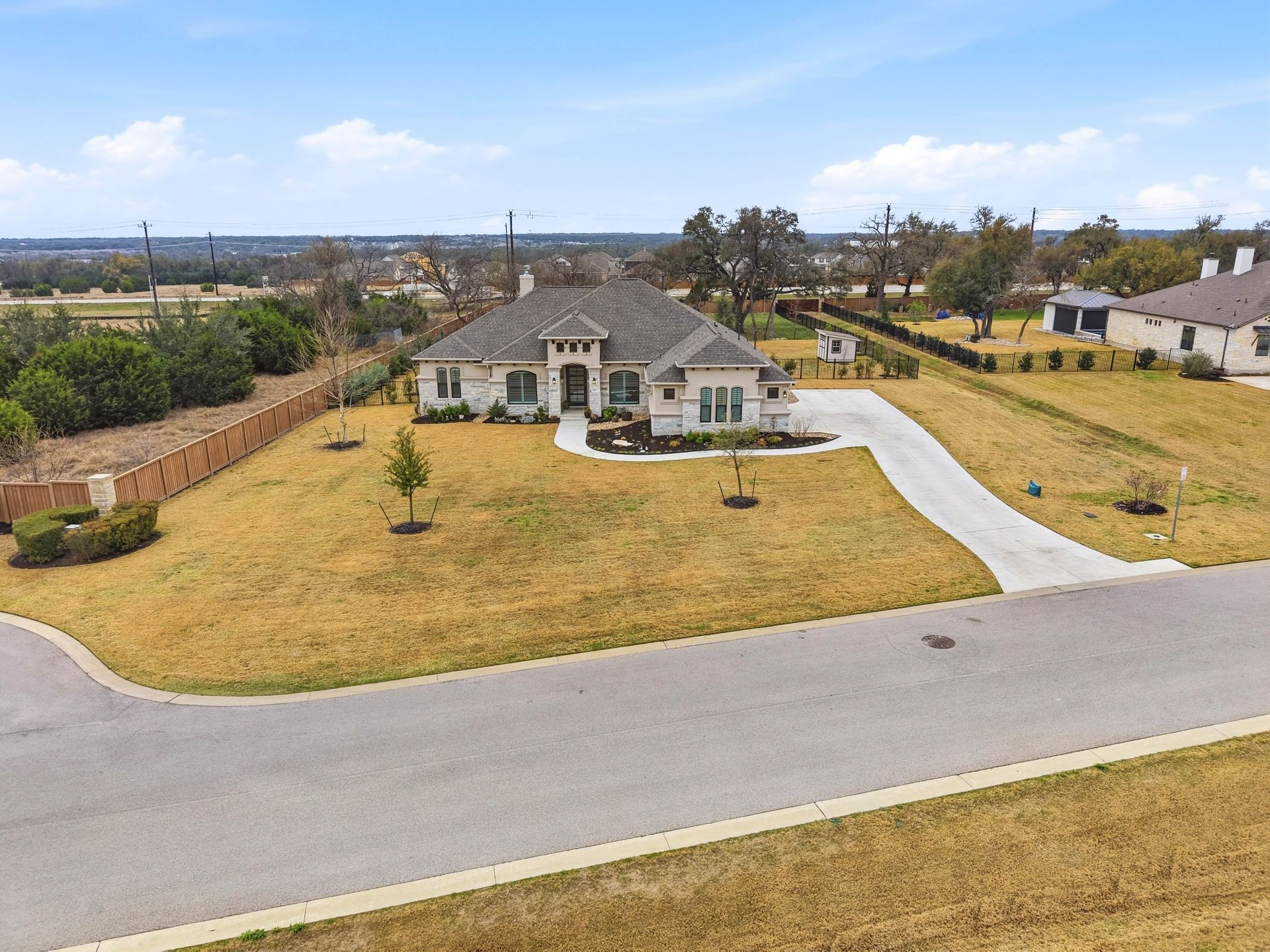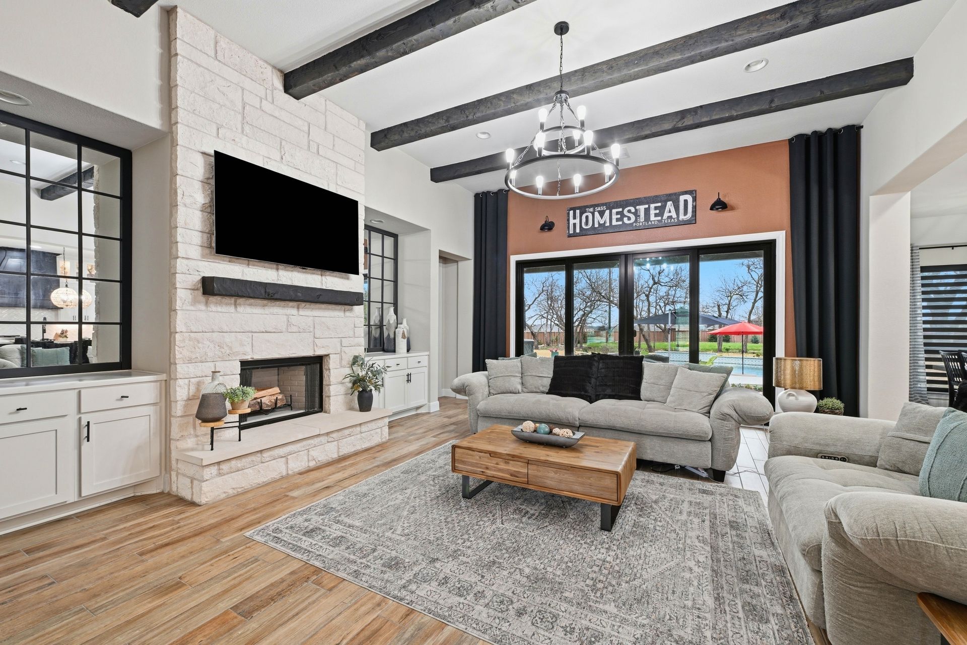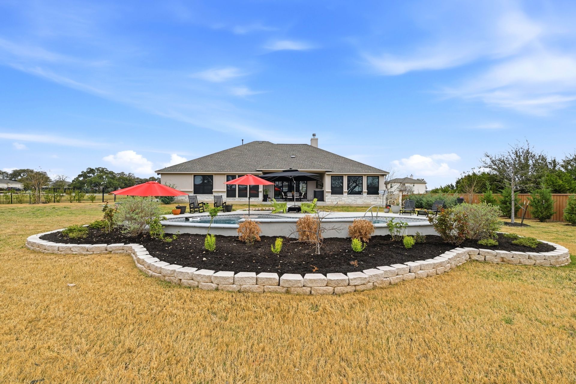 Welcome to this stunning custom-built four-bedroom, three-bathroom home in the highly sought-after Highland Village Subdivision, where timeless elegance meets everyday comfort. From the moment you enter, you’re greeted by soaring ceilings, rich architectural beams, and walls of windows that flood the home with natural light. The expansive layout offers both grandeur and warmth, creating the perfect setting for entertaining and relaxed living alike. The chef’s kitchen is truly the heart of the home, featuring double ovens, a gas cooktop, abundant floor-to-ceiling cabinetry, and stylish finishes all opening seamlessly to the impressive living area. A striking stone fireplace anchors the space, while exposed beams add character and charm you won’t find just anywhere. The spacious primary suite is a peaceful retreat with a beautifully designed ensuite bath, offering the perfect place to unwind at the end of the day. Three additional generously sized bedrooms provide flexibility for guests, a home office, or growing households. Venture outside and prepare to fall in love. Your private backyard oasis awaits...complete with a sparkling pool paradise, ideal for cooling off on warm Texas days or hosting unforgettable gatherings. The large, covered patio creates an inviting outdoor living space for year-round enjoyment. The perimeter of the lot is lined with plenty of trees for added privacy for the years to come. A convenient storage shed adds functionality without sacrificing beauty, and the large lot provides plenty of room to relax and play. This exceptional property blends luxury details, thoughtful design, and resort-style outdoor living all in one of the area’s most desirable neighborhoods.
