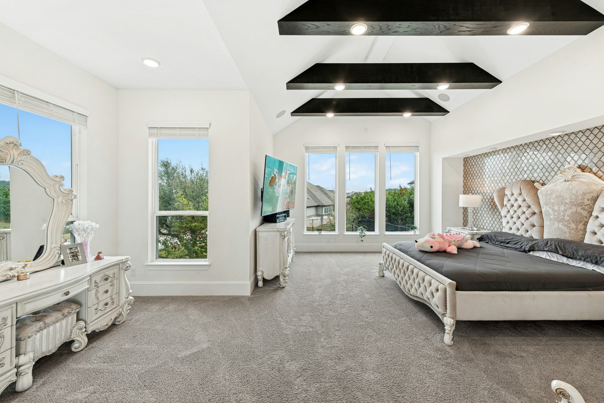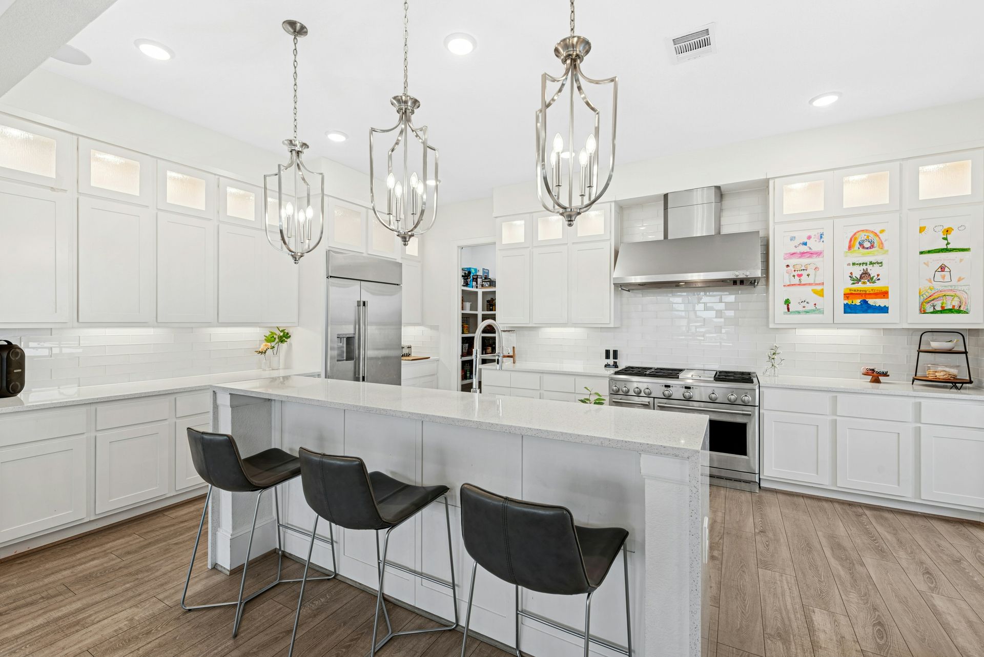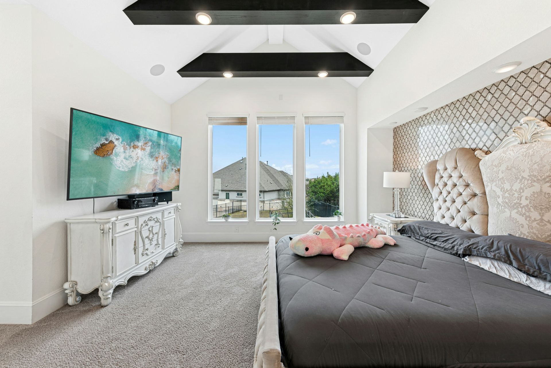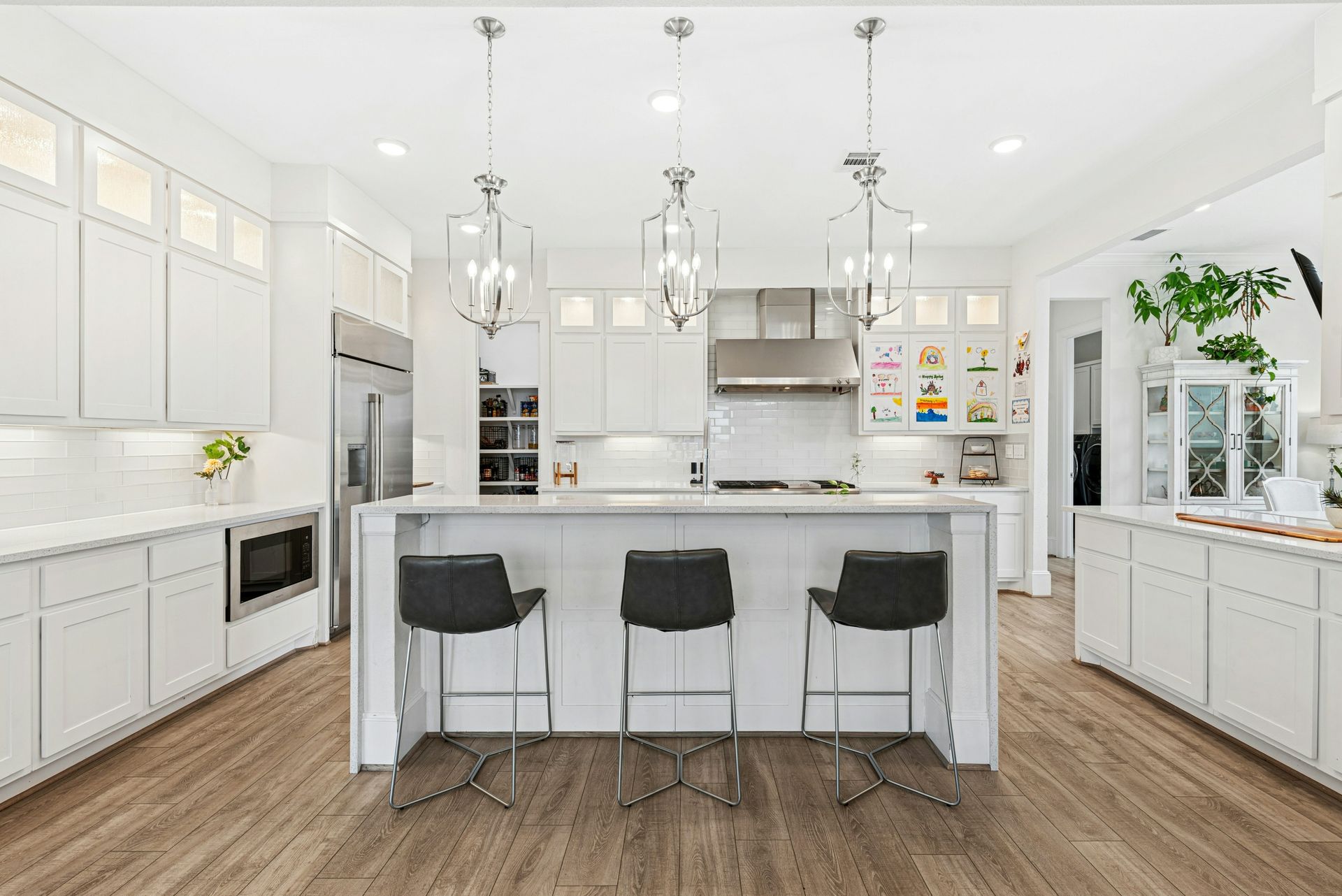 As you enter, soaring ceilings and walls of windows bathe the foyer, family room, and living areas in natural light, seamlessly blending the indoor and outdoor environments. The heart of the home is an expansive gourmet kitchen equipped for any culinary pursuit, perfectly positioned adjacent to the welcoming family room. A graceful, curved staircase leads upstairs to a spacious game and media room—ideal for hosting gatherings or enjoying quiet evenings with loved ones.