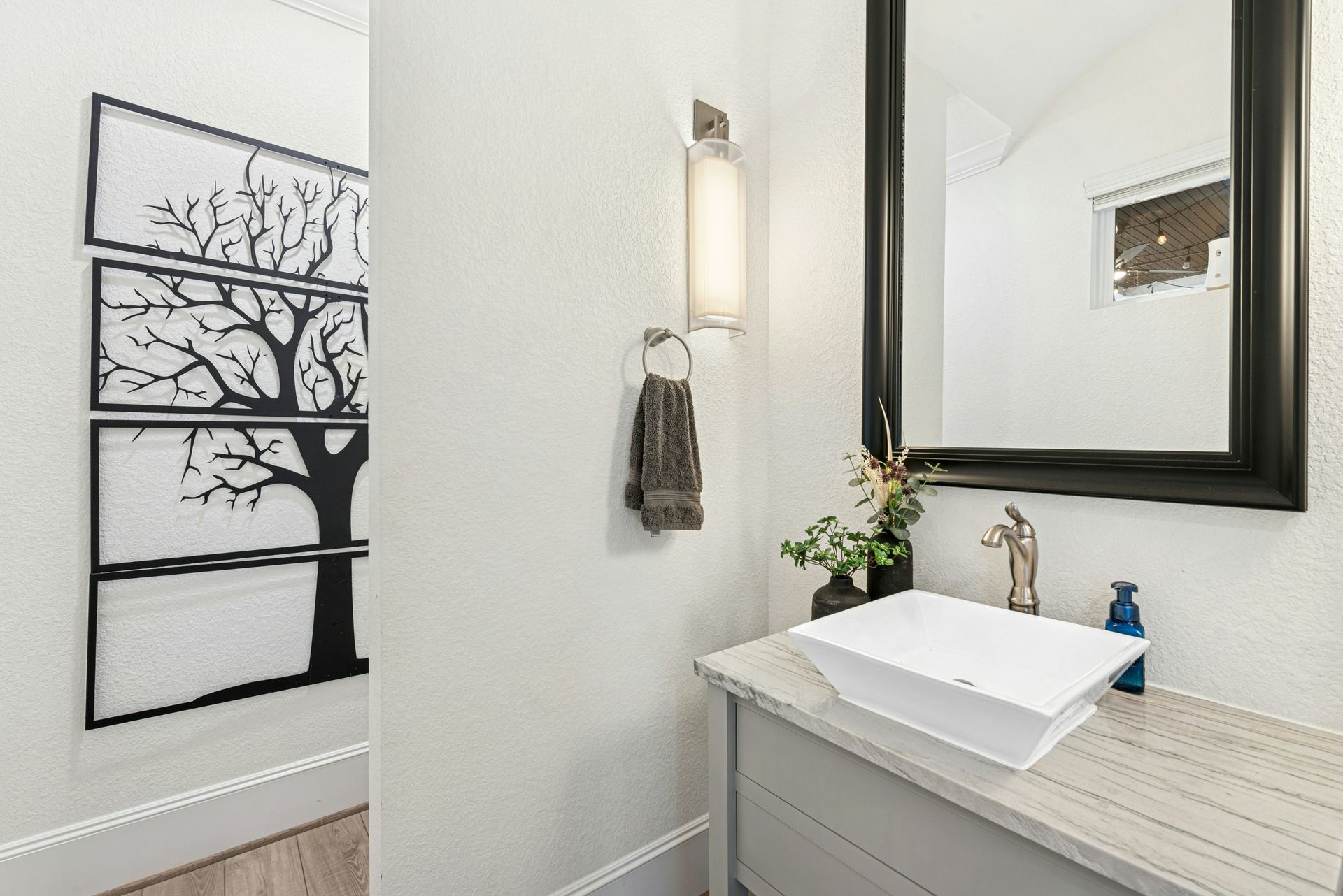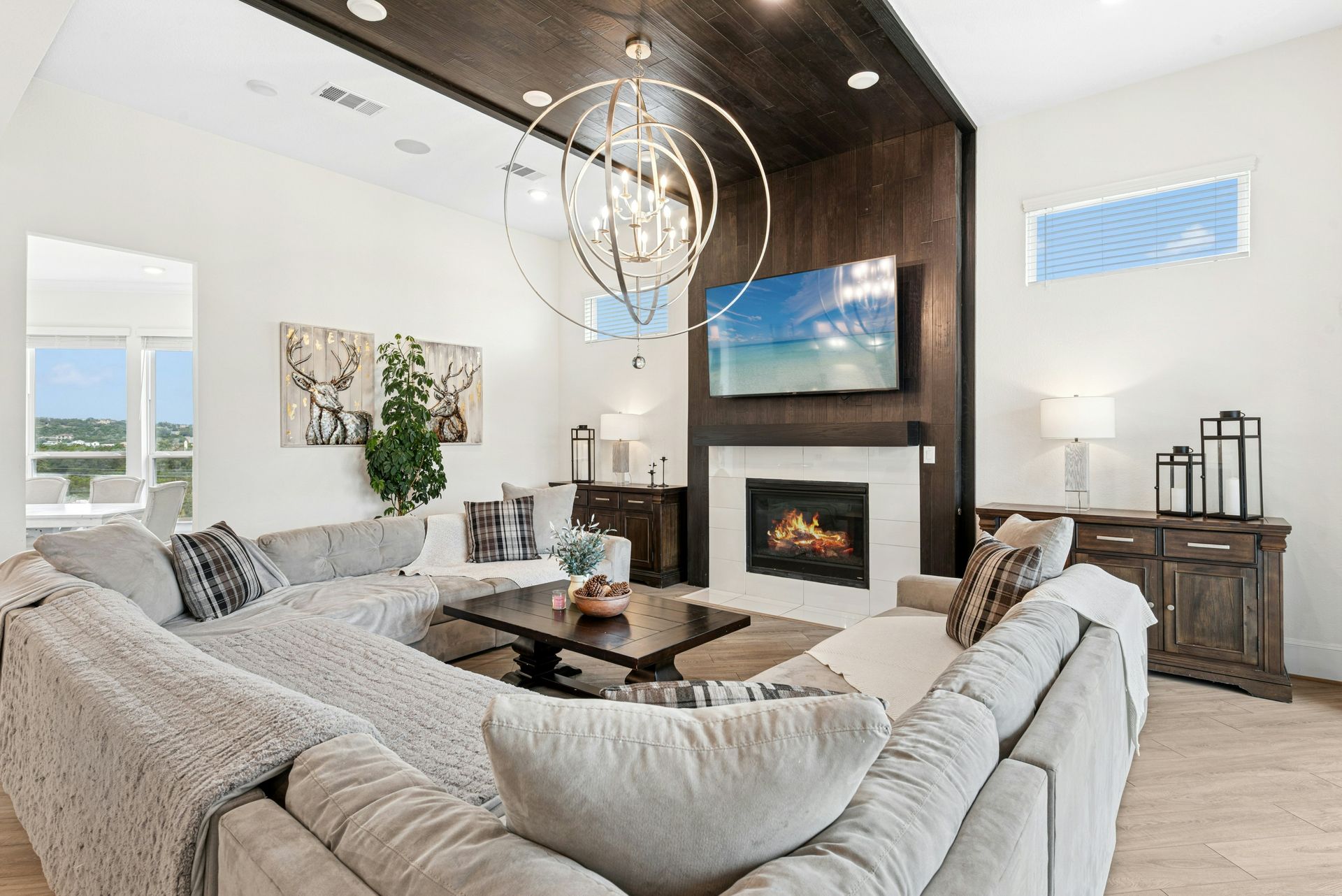 The design emphasizes premium craftsmanship throughout: think coffered ceilings, refinished hardwood floors, recessed lighting, and a statement gas-log fireplace. Entertain effortlessly with a covered patio that opens to serene, treed vistas, providing an expansive outdoor living area.