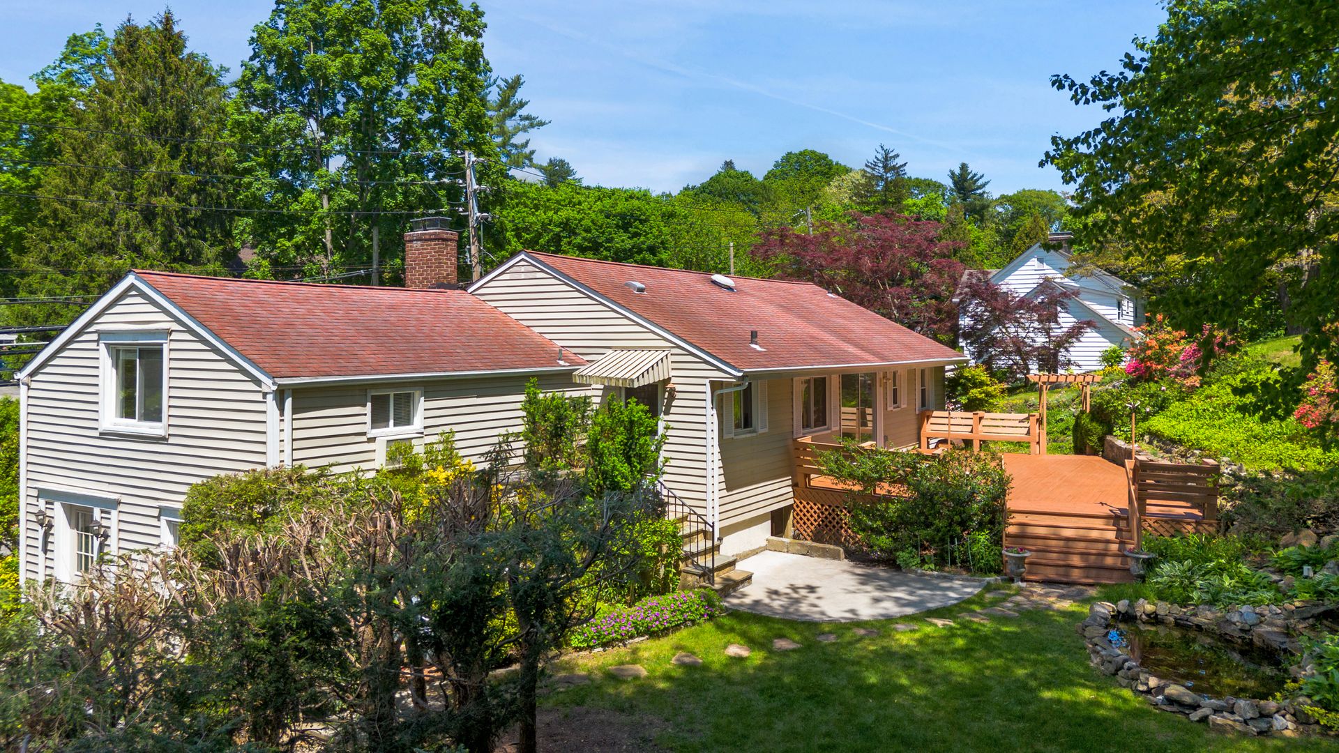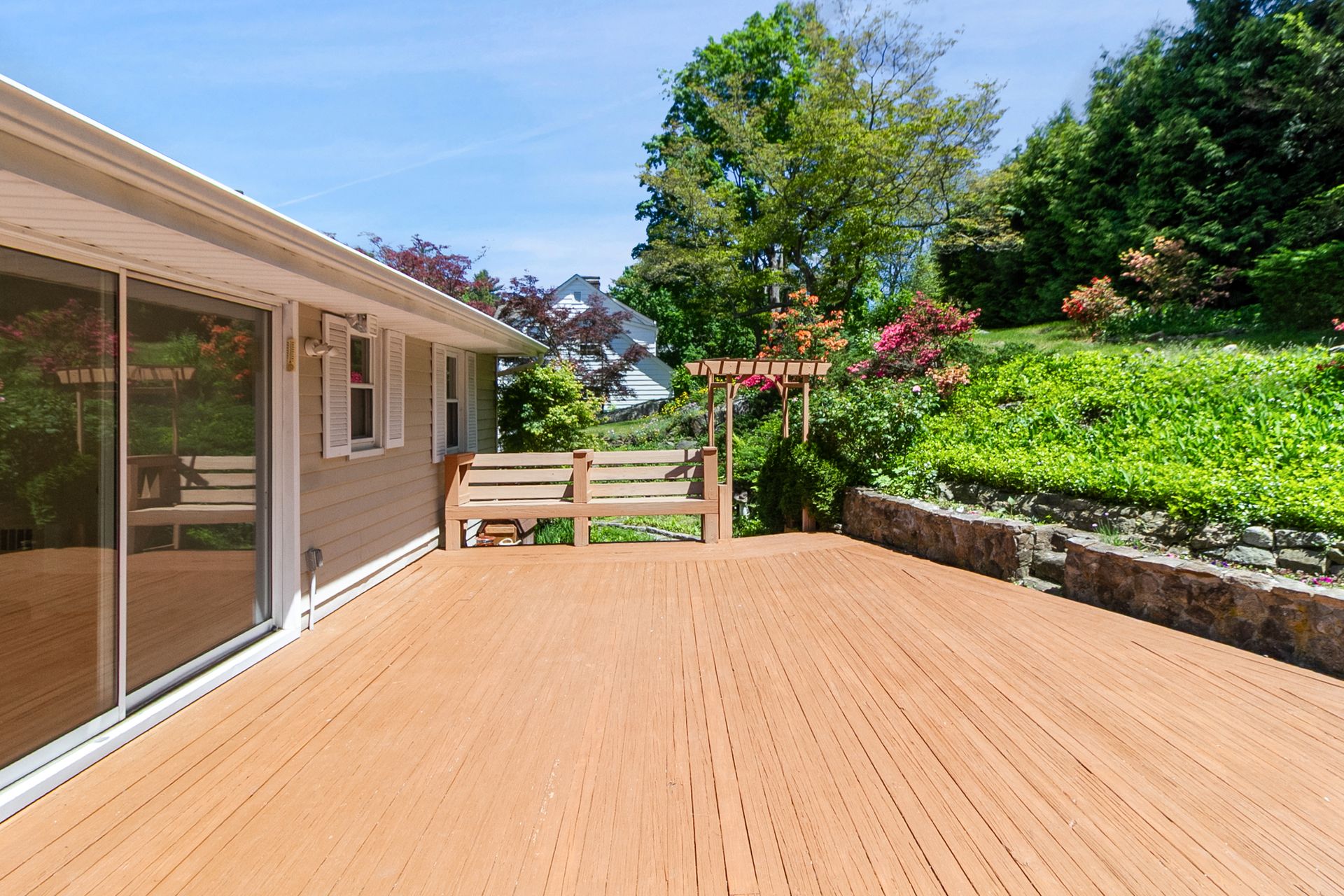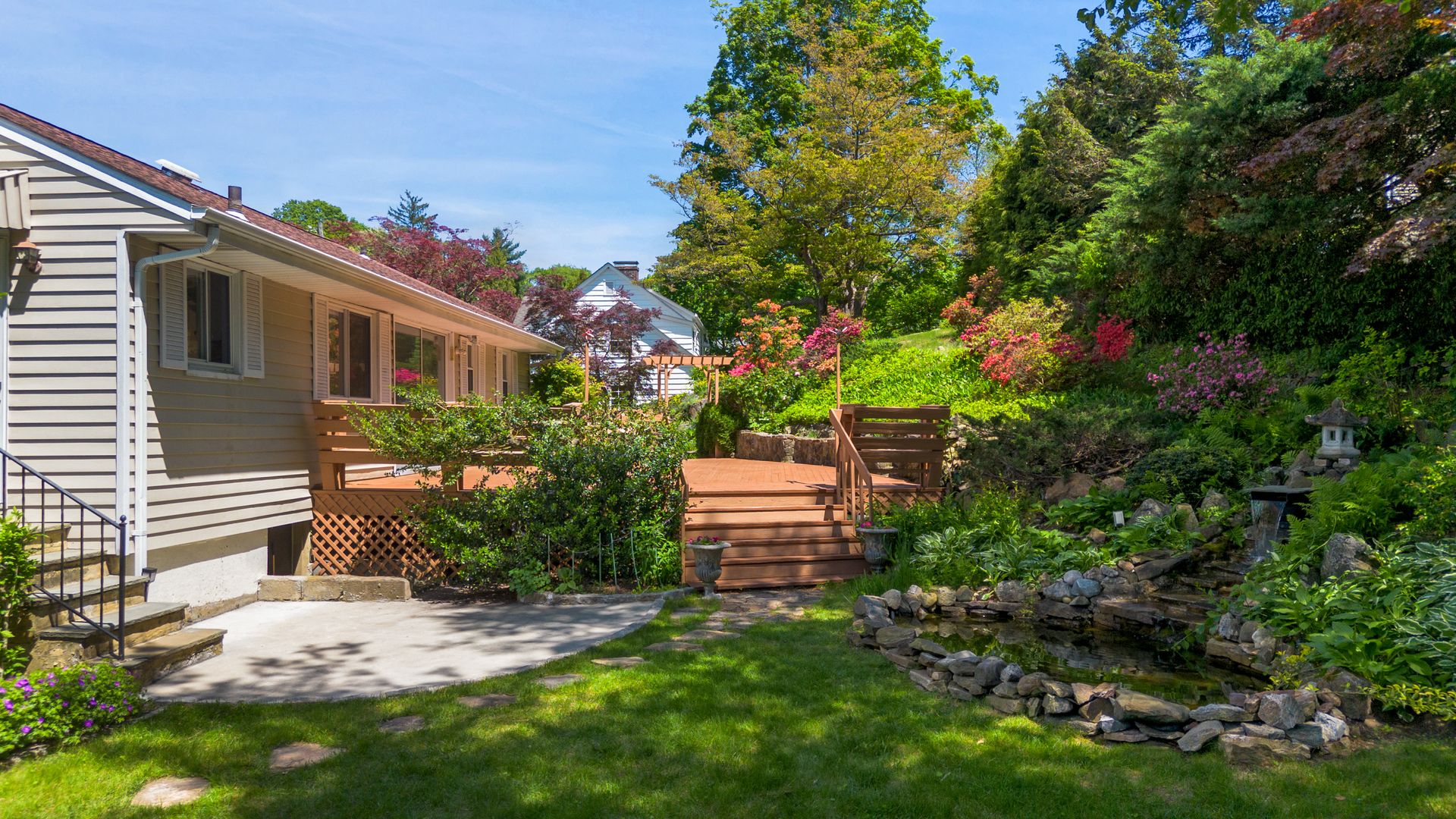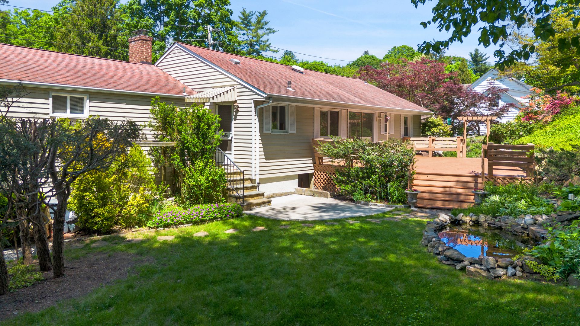 Head outside to your private oasis: an expansive deck overlooks a tranquil koi pond surrounded by mature, lush plantings, creating an ideal setting for outdoor gatherings or quiet mornings with coffee.