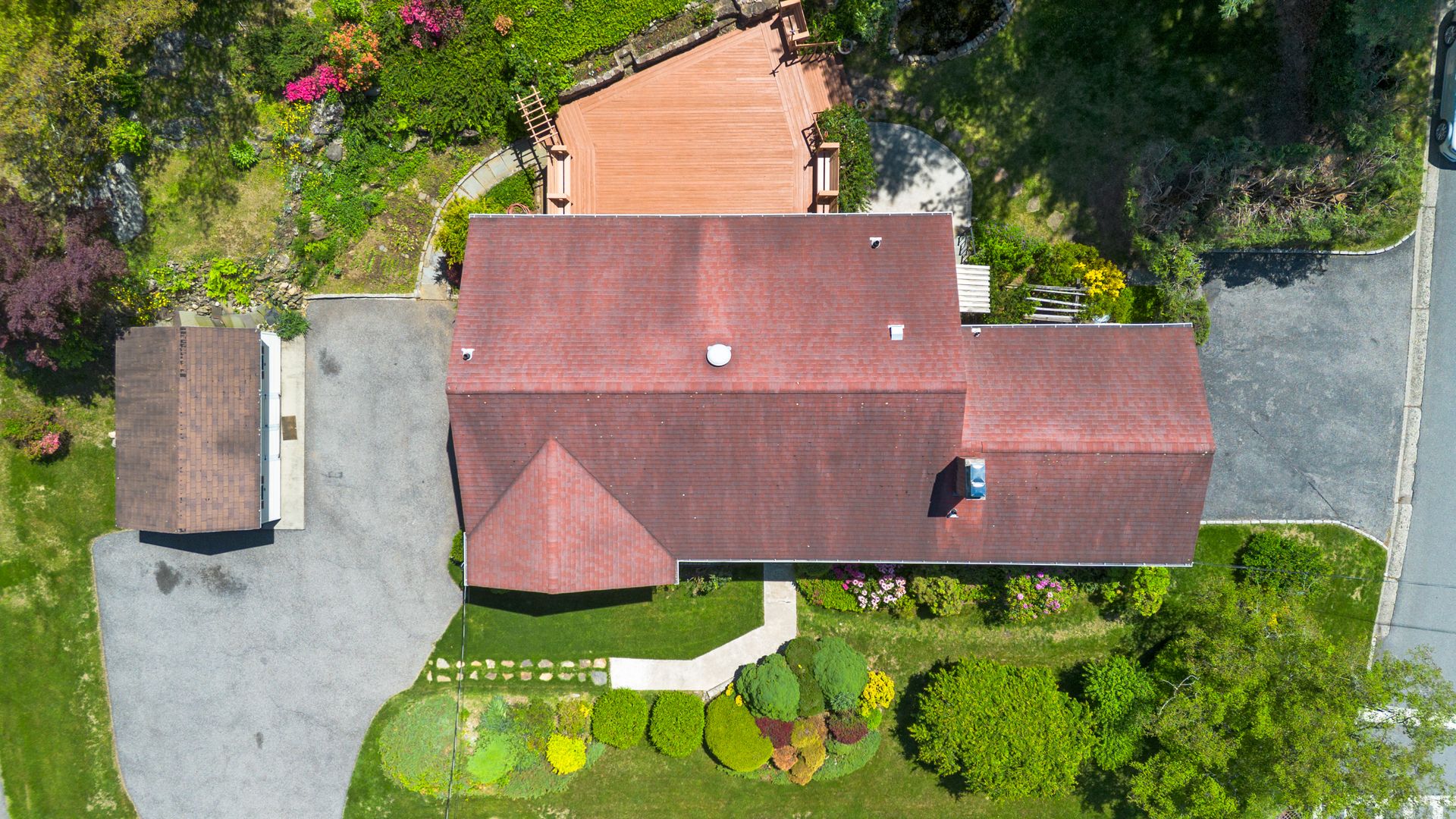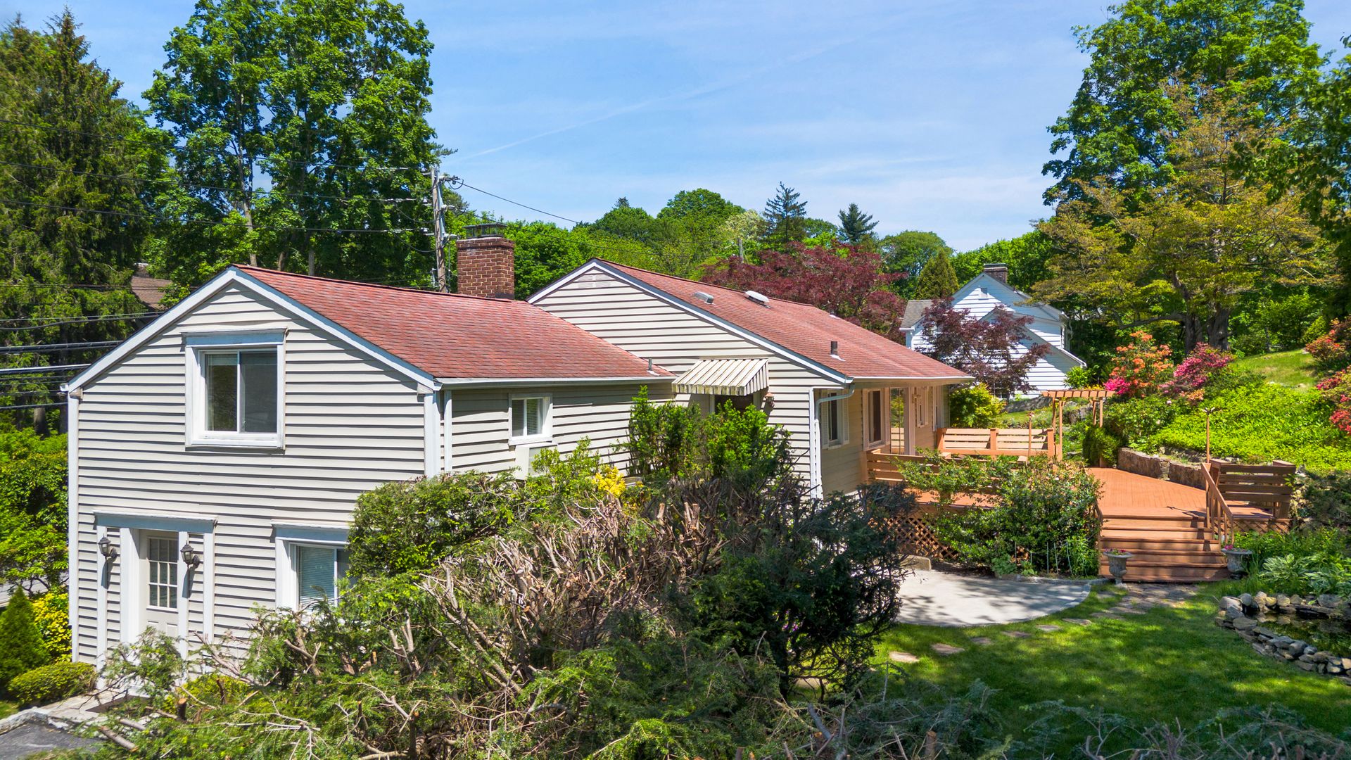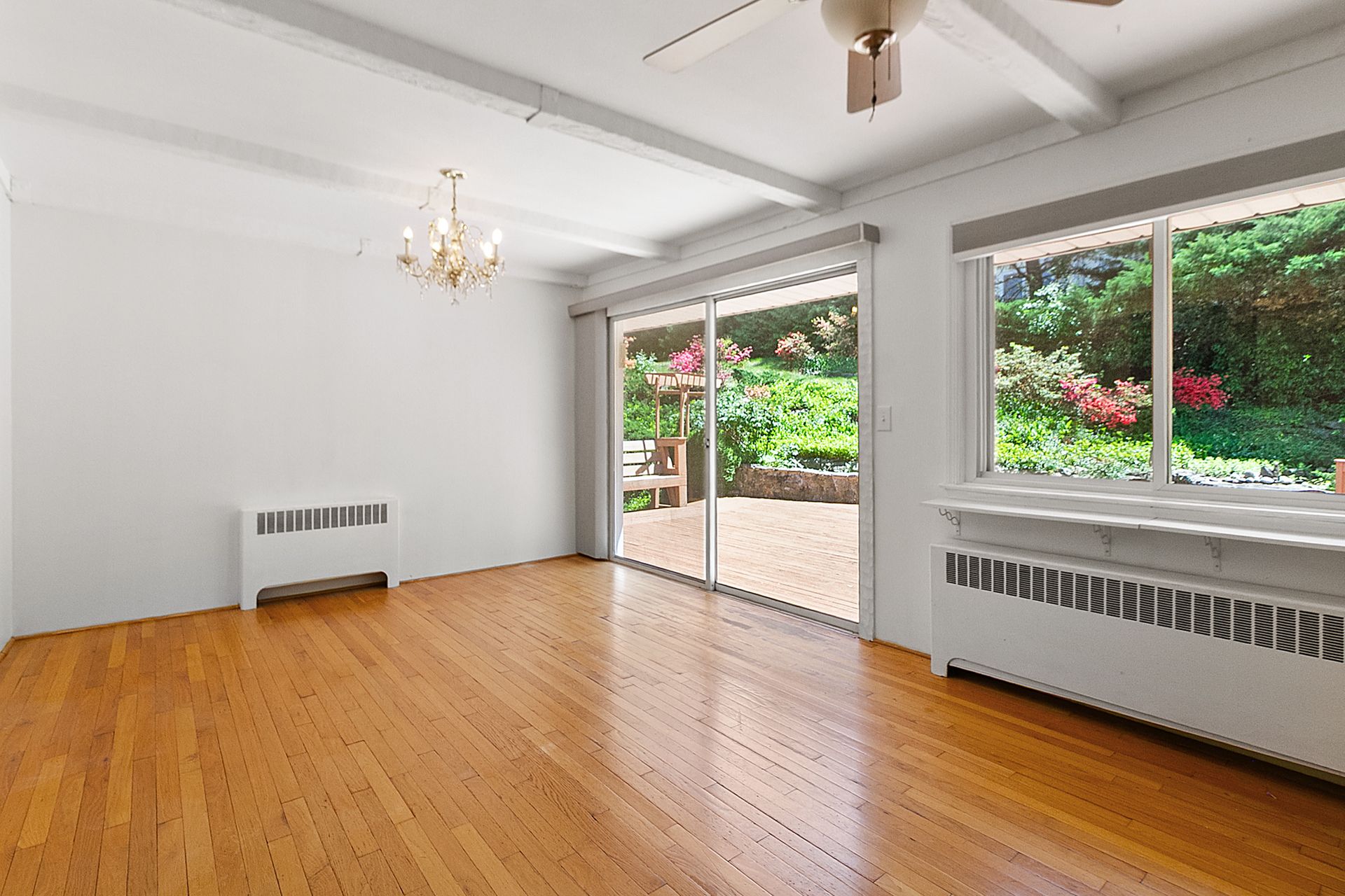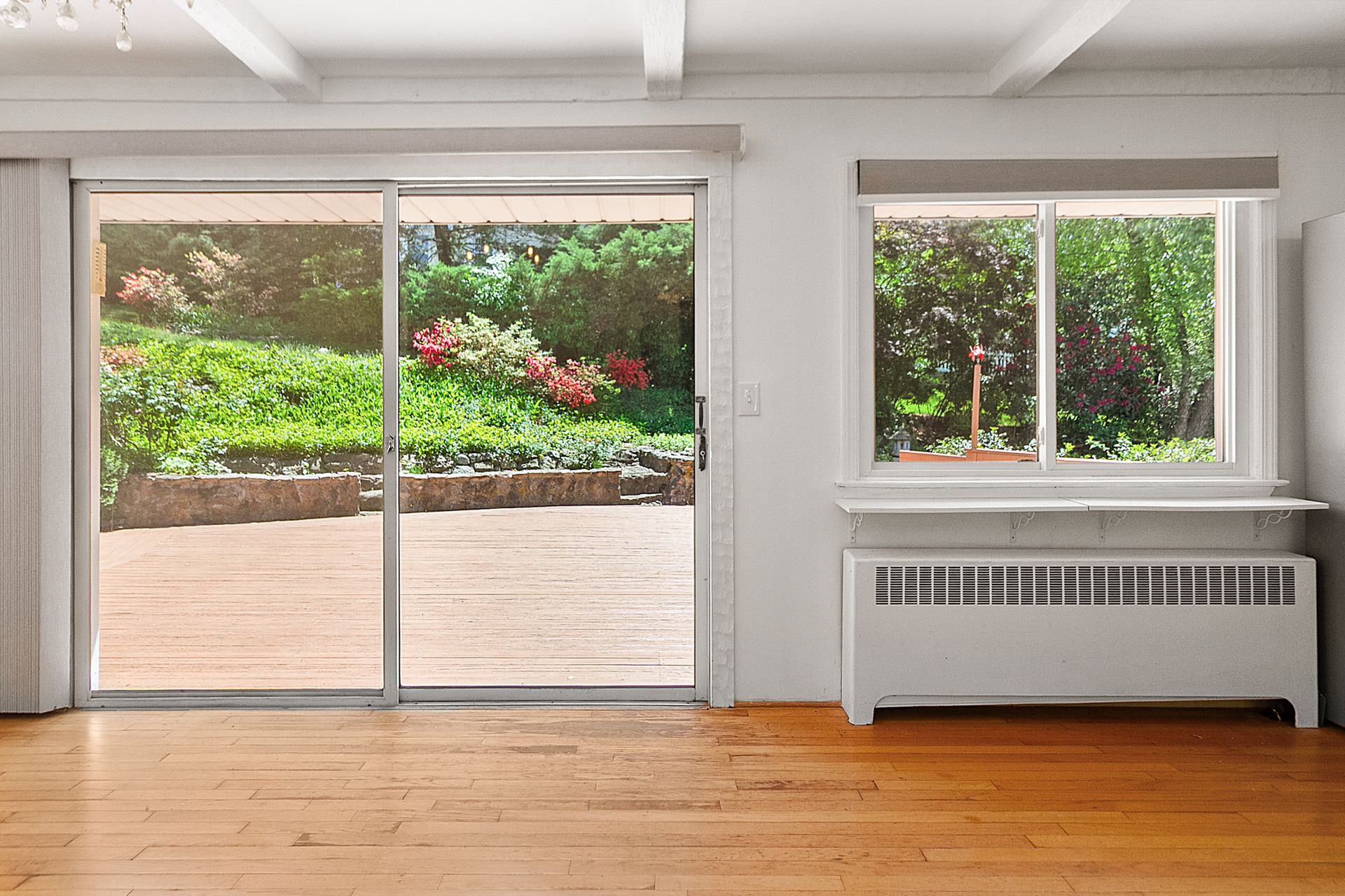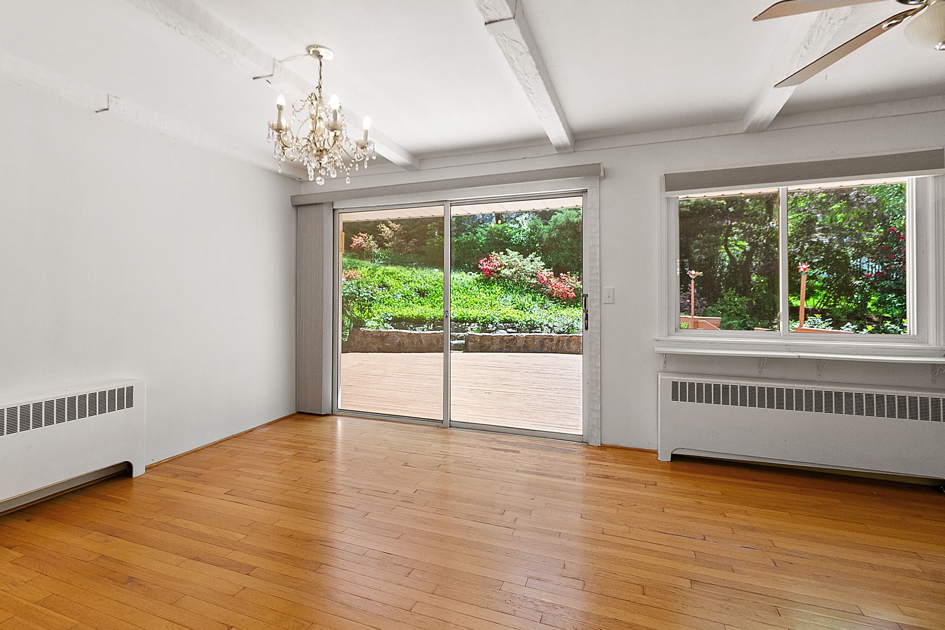 Head outside to your private oasis: an expansive deck overlooks a tranquil koi pond surrounded by mature, lush plantings, creating an ideal setting for outdoor gatherings or quiet mornings with coffee.