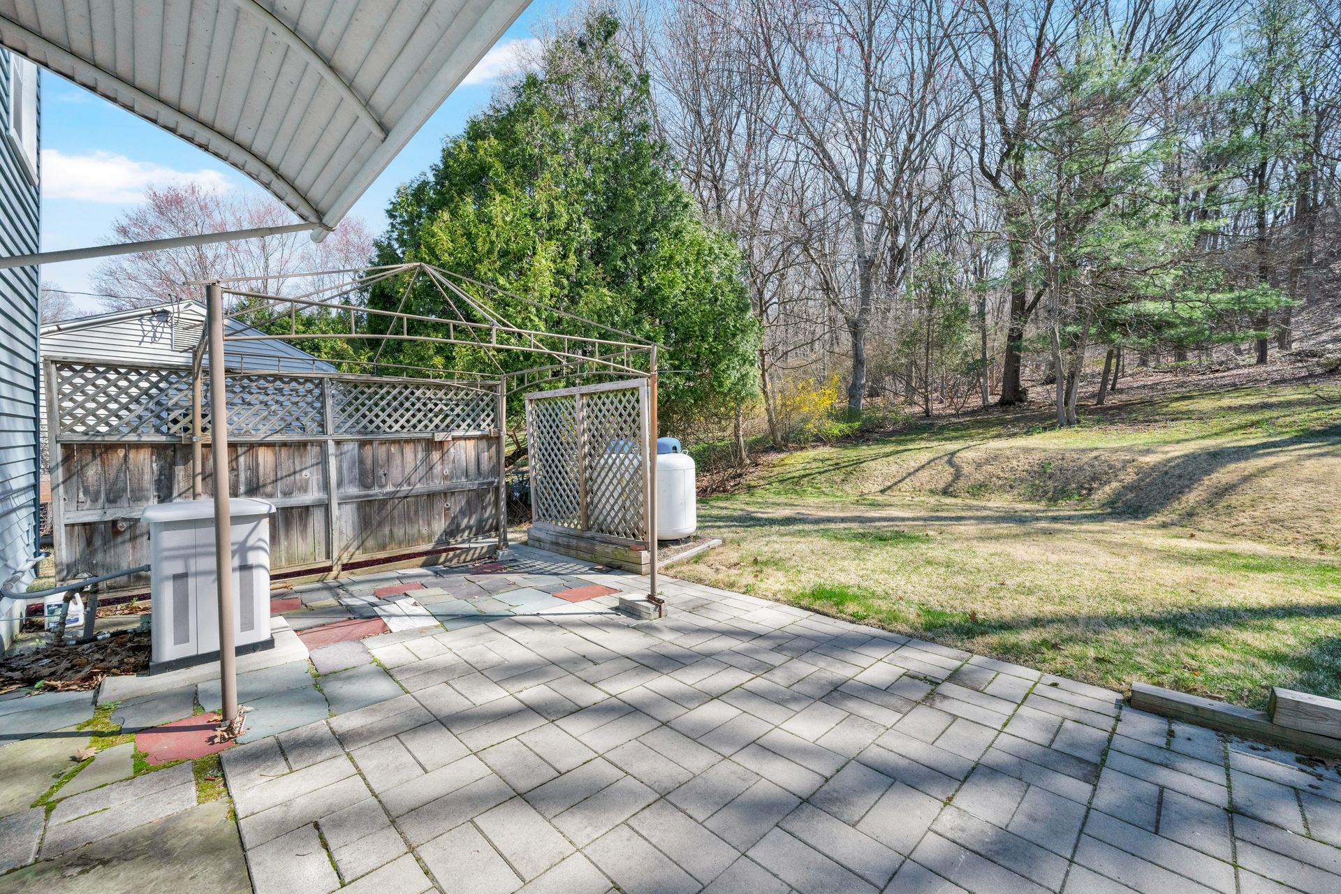 Step outside to enjoy a private backyard setting with a patio—perfect for relaxing or entertaining—along with a gazebo frame ready for your choice of cover to create a shaded outdoor retreat. The yard abuts a wooded area, enhancing both privacy and the connection to nature.