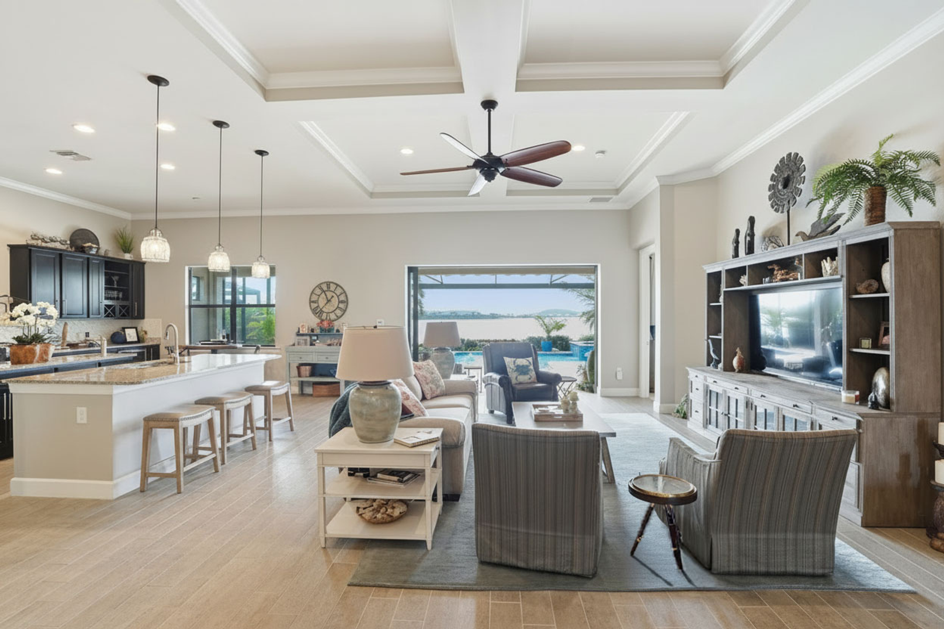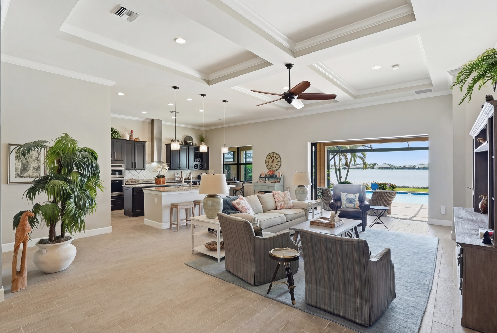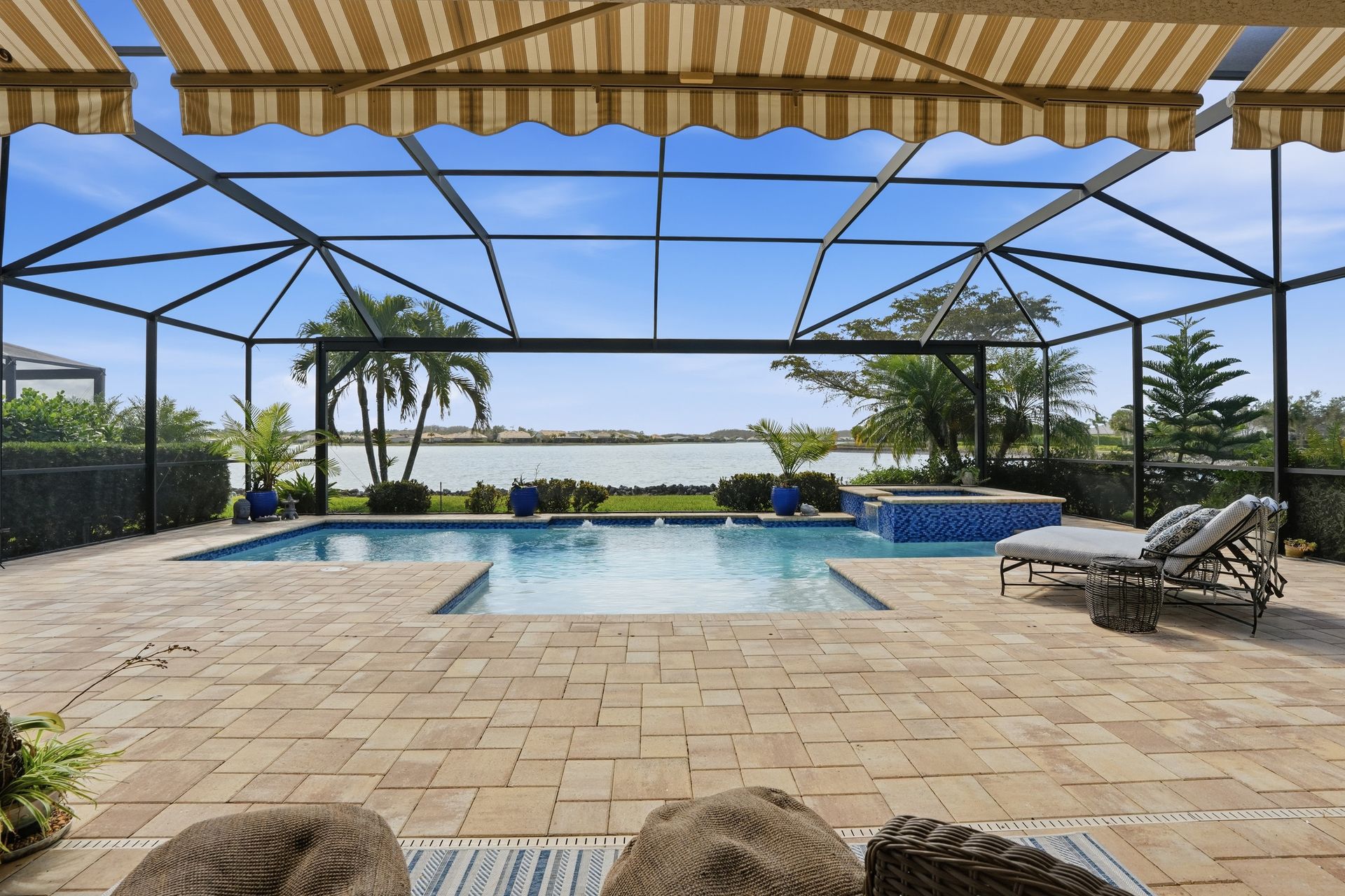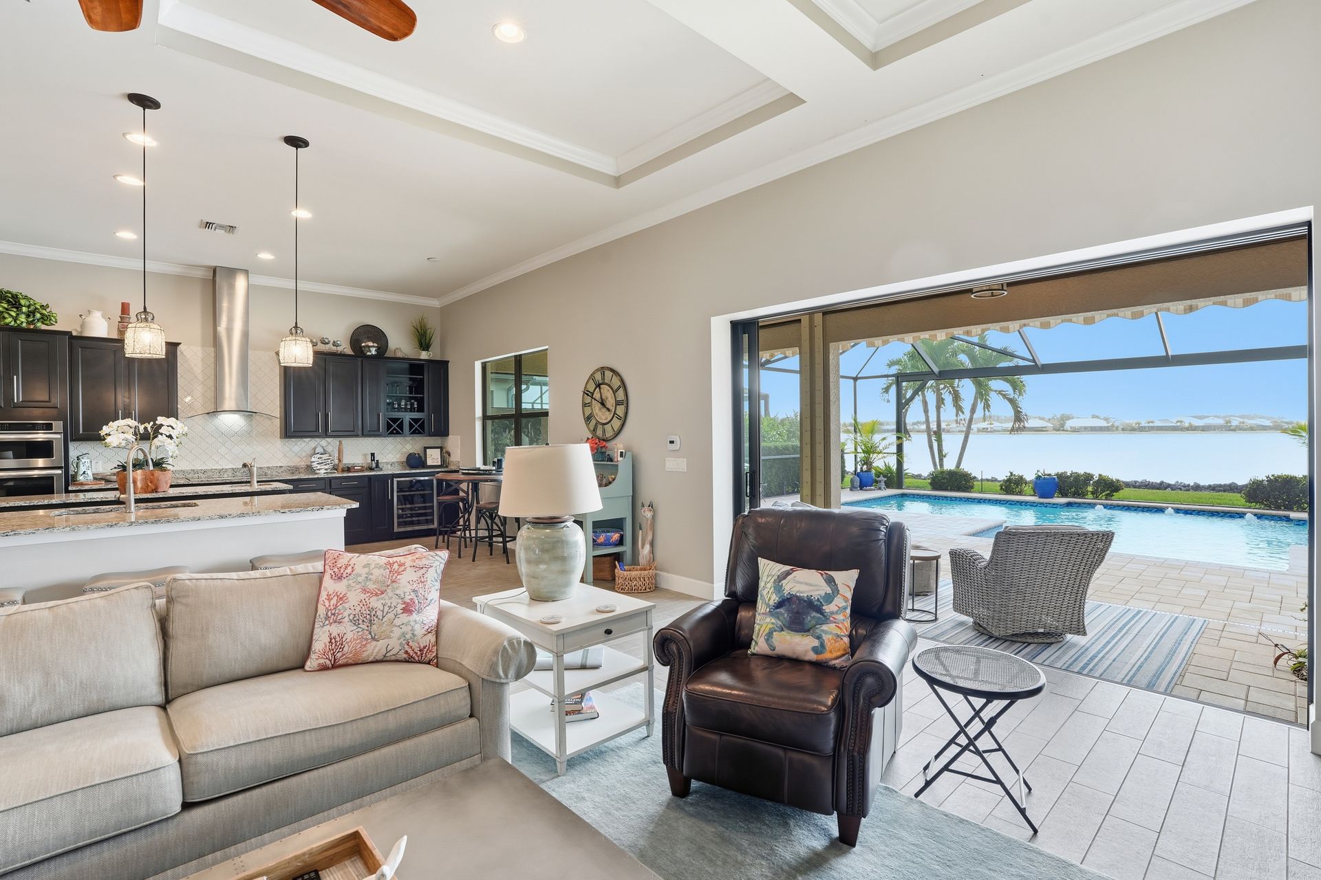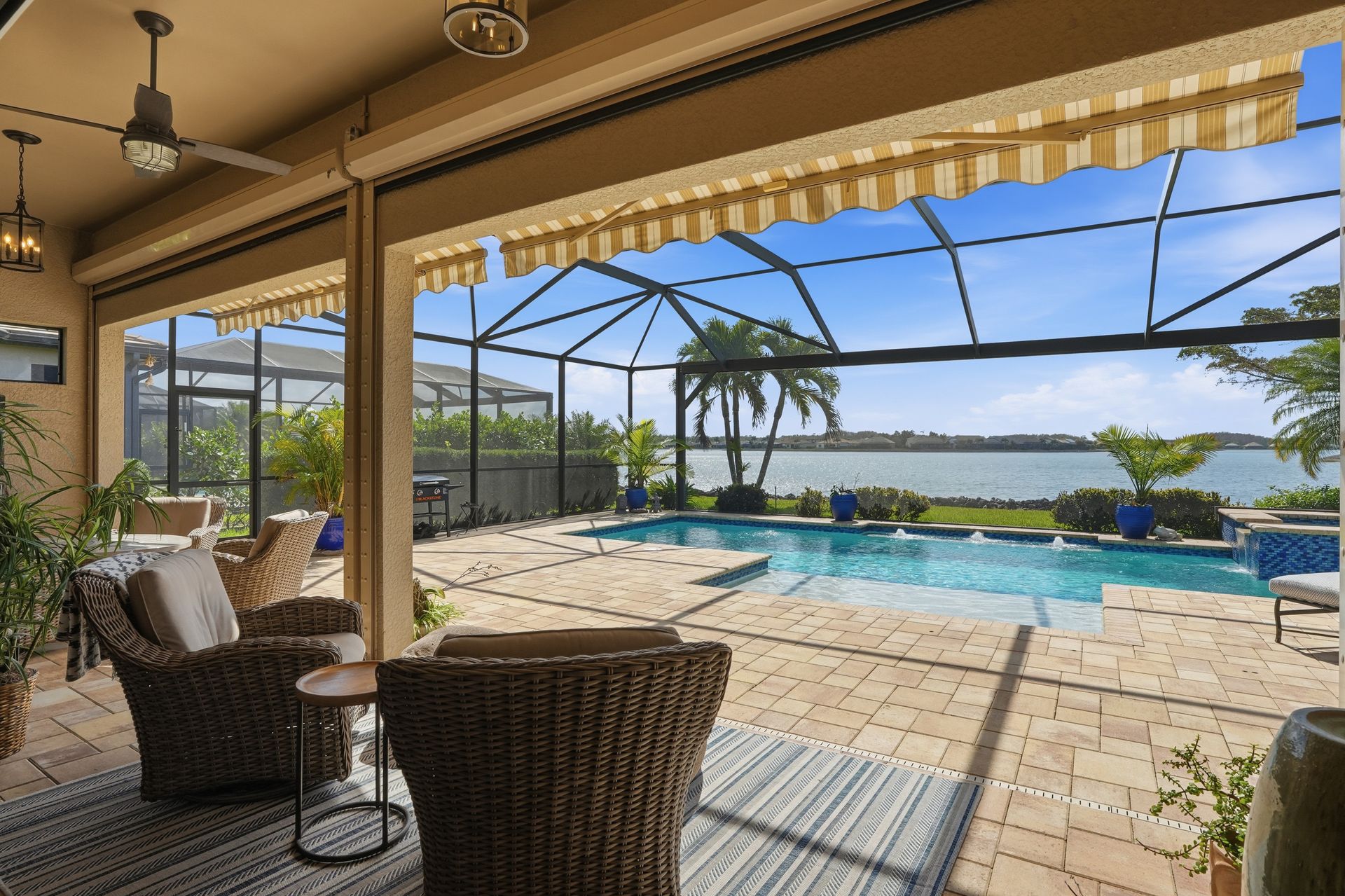 Live like you're on vacation every day in this gorgeous waterfront home overlooking the sparkling 240-acre lake, located in exciting Estero SW Florida! Welcome to the gated community of Corkscrew Shores with resort-style amenities. Glass front doors open to the entry with wide open views of the pool and water. Screened-in, covered lanai with room for indoor and outdoor entertaining. Custom heated pool and spa with bubblers, sun shelf, and waterfall. Quality finishes include crown molding, coffered ceiling, and a custom serving bar with barn door. Chef’s dream kitchen with double islands/sinks, and beverage station. Owner’s retreat with water views, dual sinks, and custom walk-in closet. Feel protected with IMPACT windows and electric hurricane shutter. Furnishings negotiable. Finished three-car garage with interlocking flooring, insulated garage door, custom cabinetry/storage, and oversized fan. NO CDD OR CLUB FEES. NOT IN A FLOOD ZONE. Amenity island features: zero edge pool with fountains, spa, indoor/outdoor restaurant and bar, firepits, kayak and canoe launch, fishing pier, non gas boating, 24-hour state of the art fitness, movement studio, basketball, tennis, bocce, ping pong, pickleball courts, playground, picnic area. Close to FGCU, Airport, Hertz Arena, open air shopping and dining.