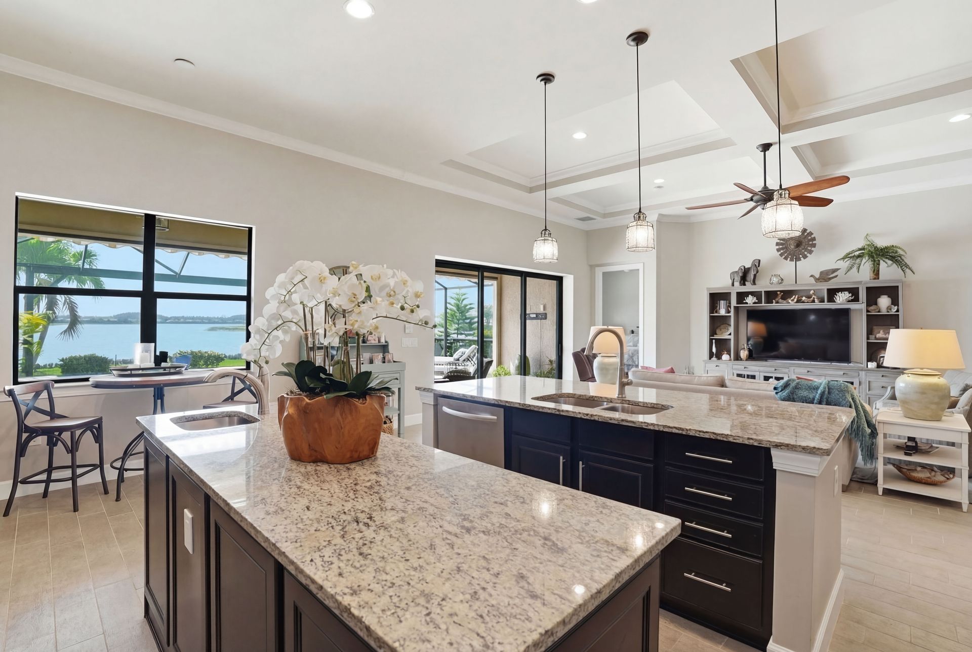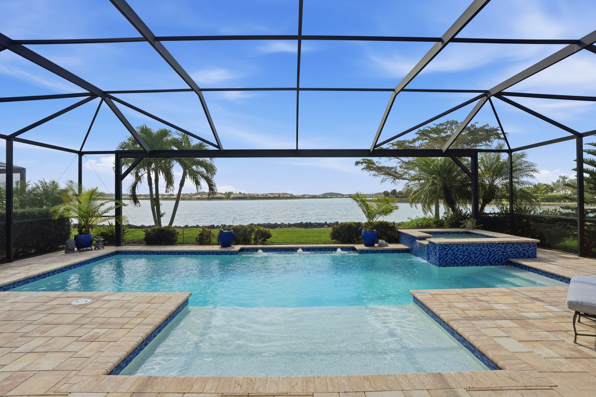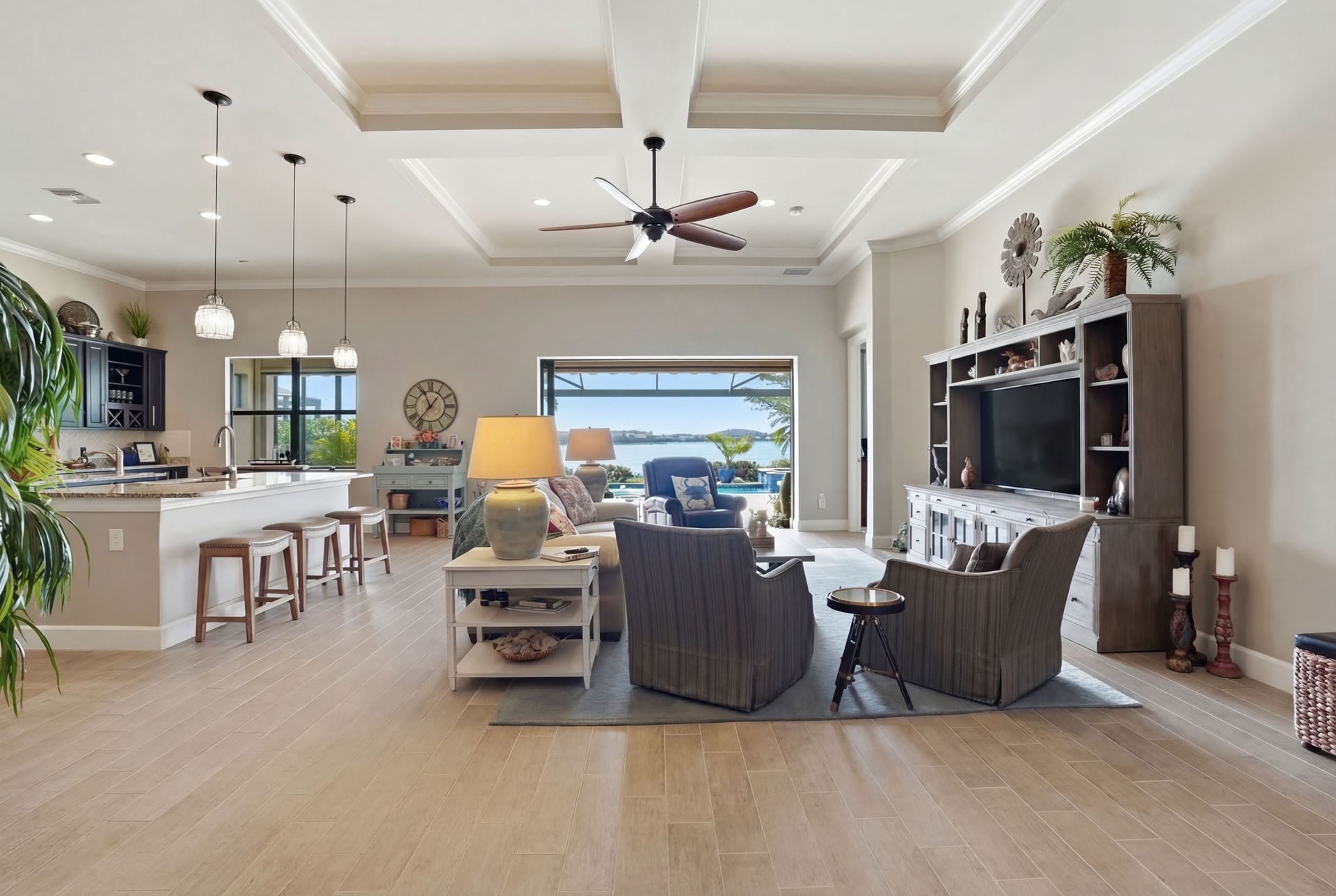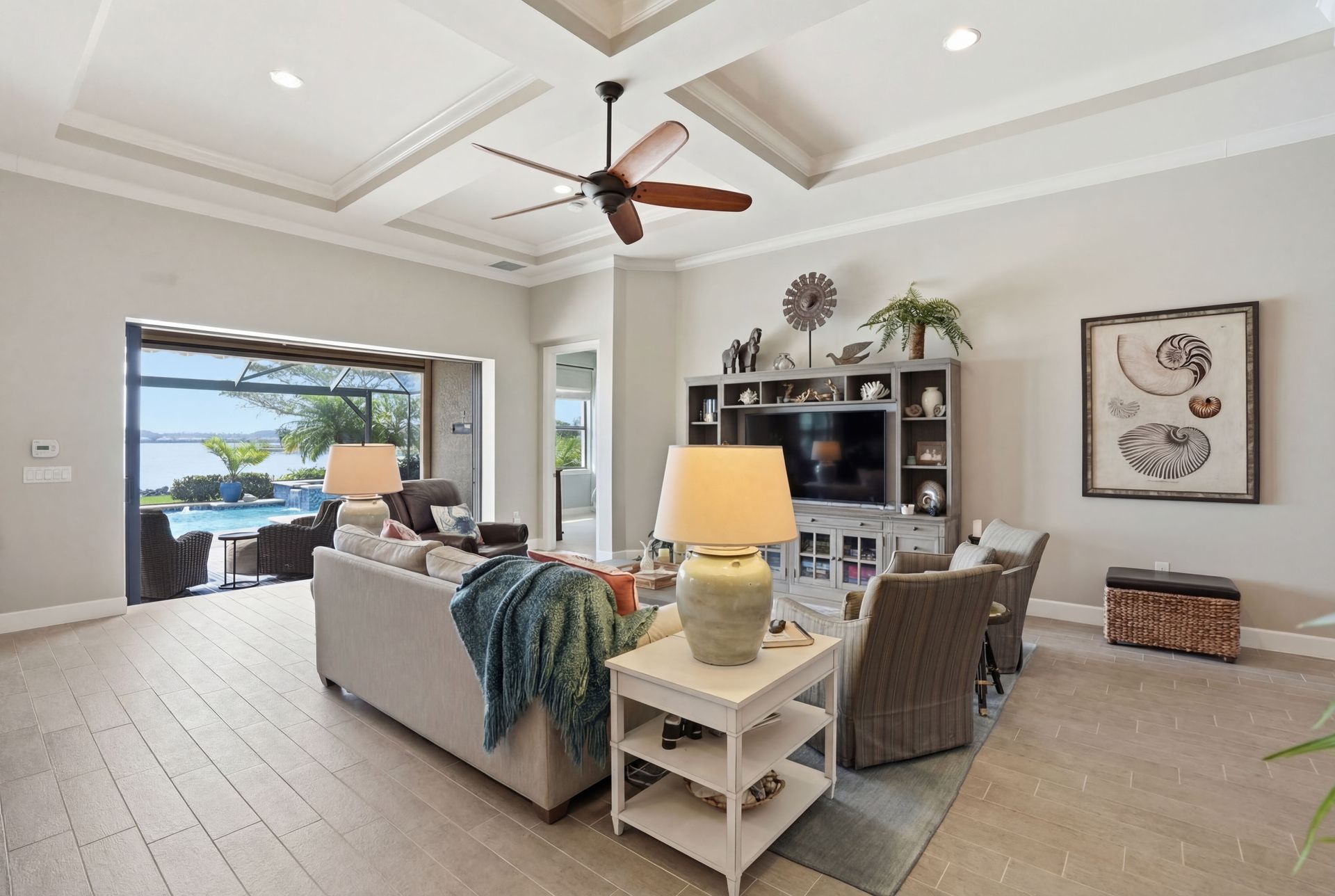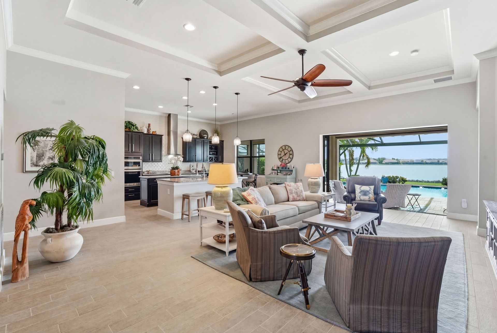 Live like you're on vacation every day in this gorgeous waterfront home overlooking the sparkling 240-acre lake, located in exciting Estero SW Florida! Welcome to the gated community of Corkscrew Shores with resort-style amenities. Glass front doors open to the entry with wide open views of the pool and water. Screened-in, covered lanai with room for indoor and outdoor entertaining. Custom heated pool and spa with bubblers, sun shelf, and waterfall. Quality finishes include crown molding, coffered ceiling, and a custom serving bar with barn door. Chef’s dream kitchen with double islands/sinks, and beverage station. Owner’s retreat with water views, dual sinks, and custom walk-in closet. Feel protected with IMPACT windows and electric hurricane shutter. Furnishings negotiable. Finished three-car garage with interlocking flooring, insulated garage door, custom cabinetry/storage, and oversized fan. NO CDD OR CLUB FEES. NOT IN A FLOOD ZONE. Amenity island features: zero edge pool with fountains, spa, indoor/outdoor restaurant and bar, firepits, kayak and canoe launch, fishing pier, non gas boating, 24-hour state of the art fitness, movement studio, basketball, tennis, bocce, ping pong, pickleball courts, playground, picnic area. Close to FGCU, Airport, Hertz Arena, open air shopping and dining.