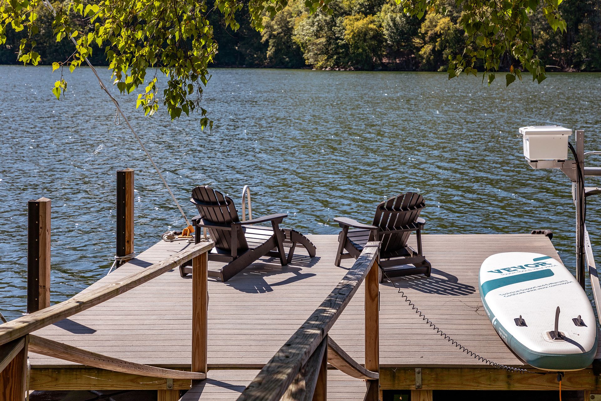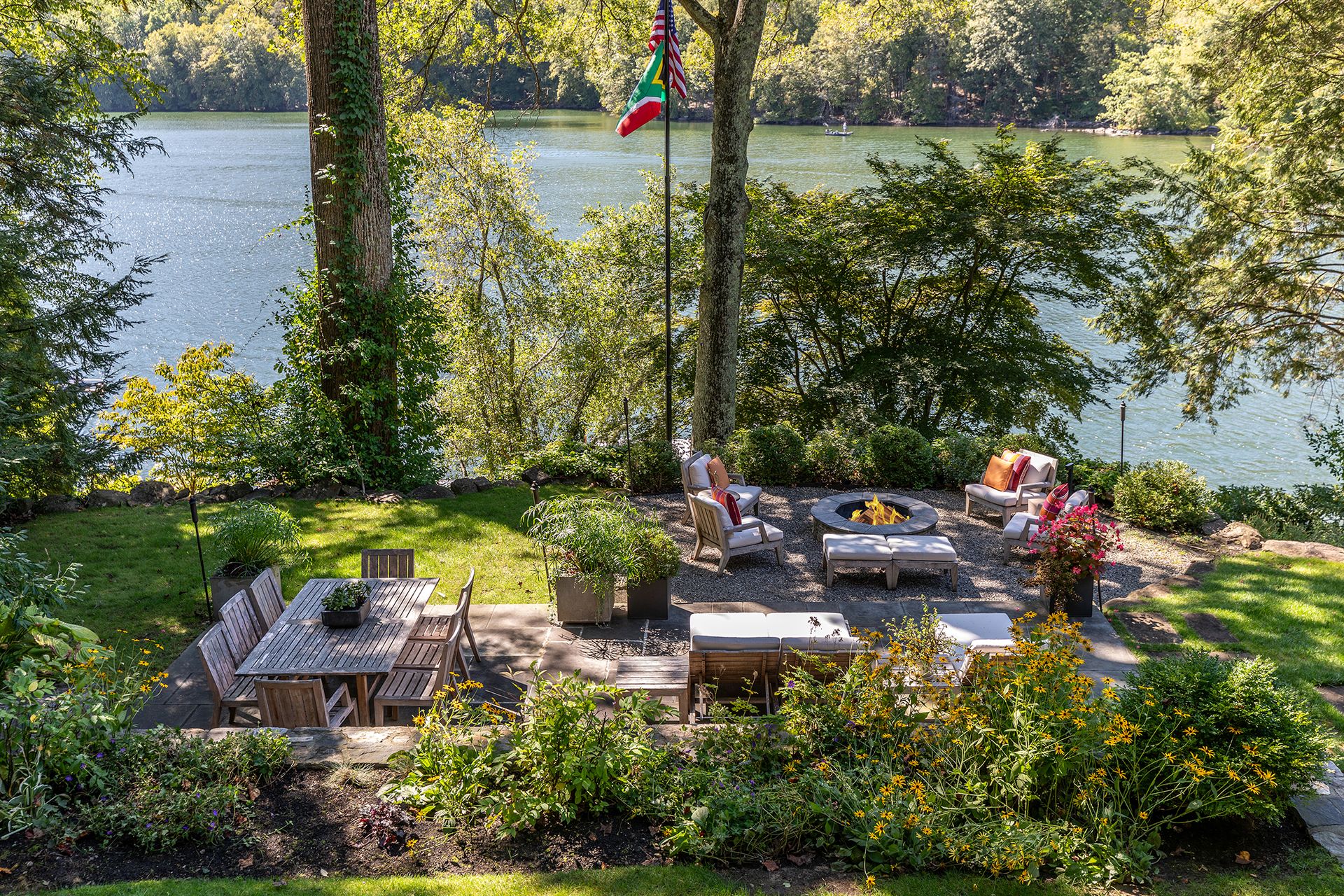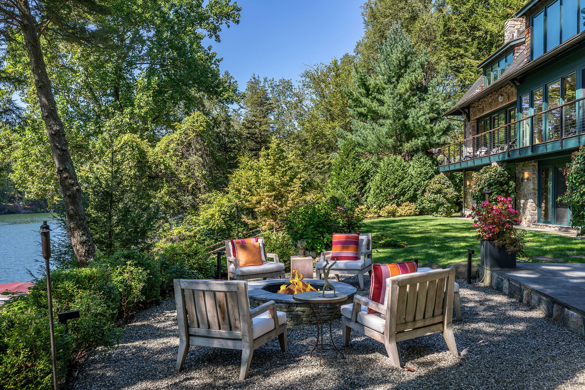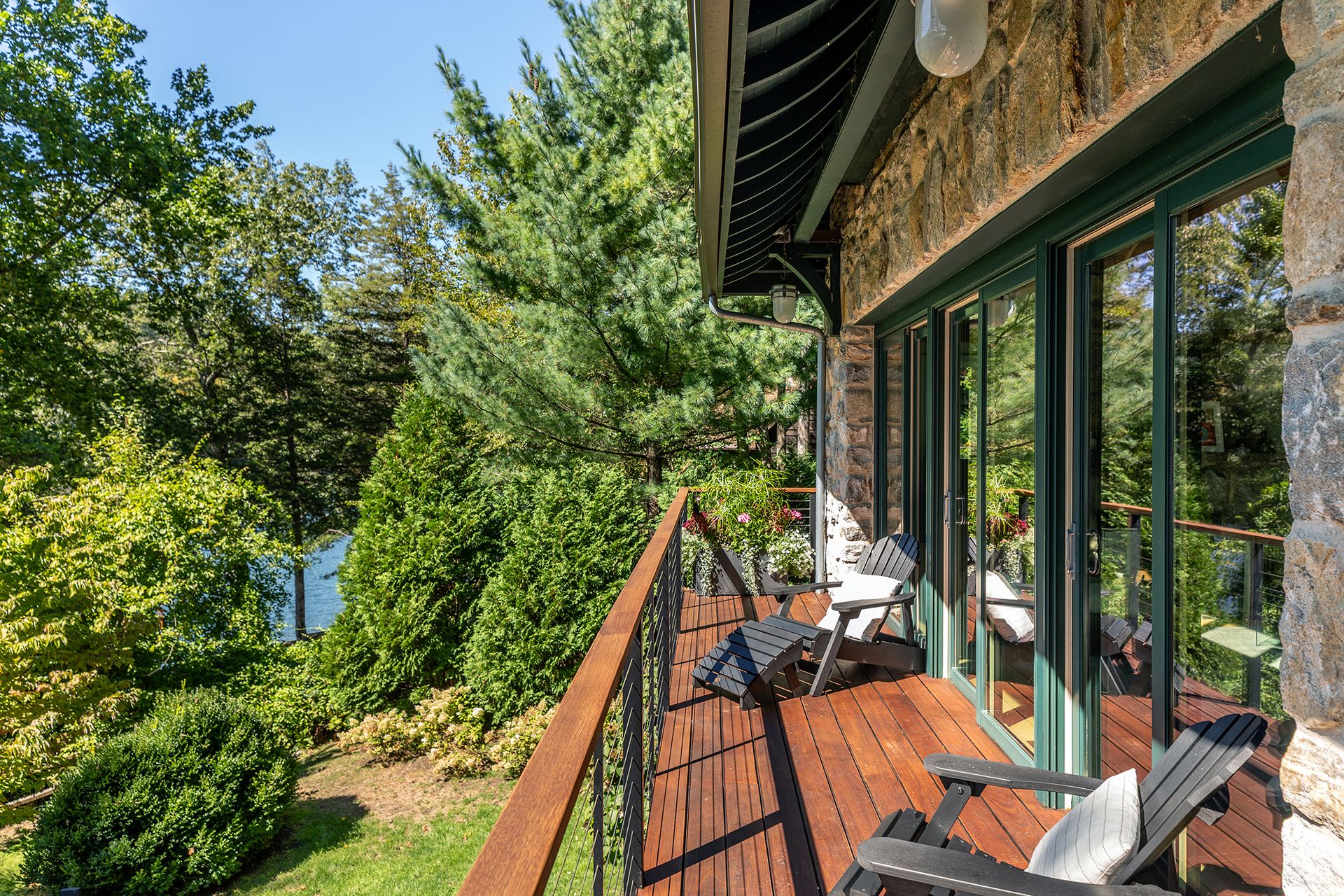 Craftsman style wood & iron staircase leads to second & lower levels. Intricate ceiling detail functions as art with an intriguing iron chandelier at the center. The open plan is highlighted by a full floor to ceiling stone fireplace as the focal point. Designed with lake enjoyment in mind, sliders lead from the great room and kitchen to the Ipe deck as well as from the lower level family room & bedroom suite to the level yard & lakefront.