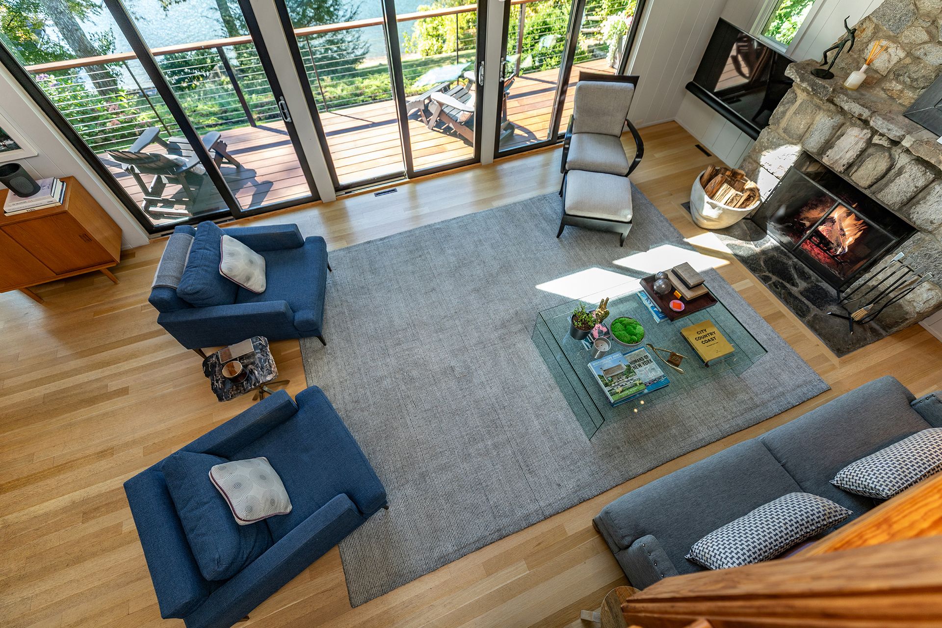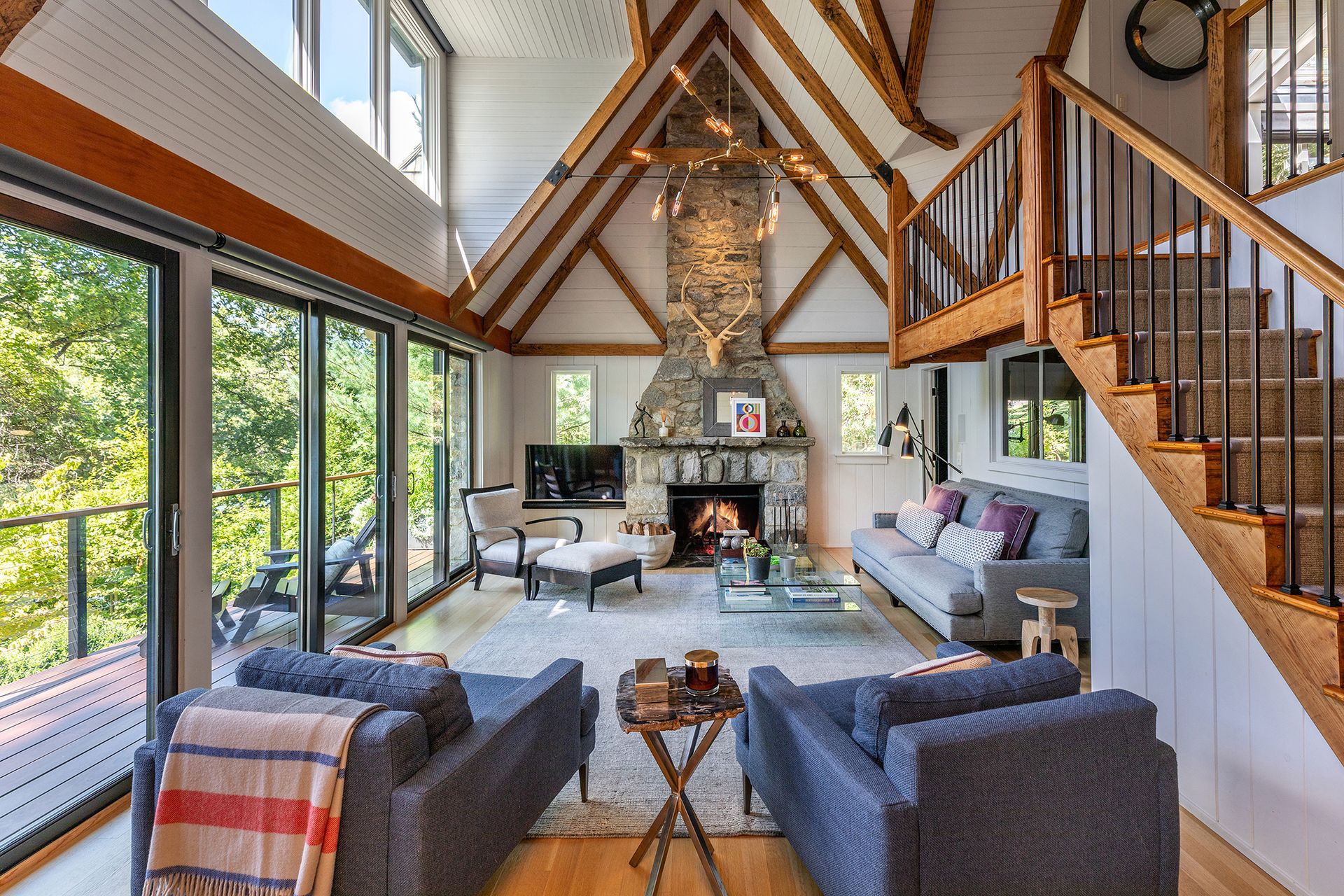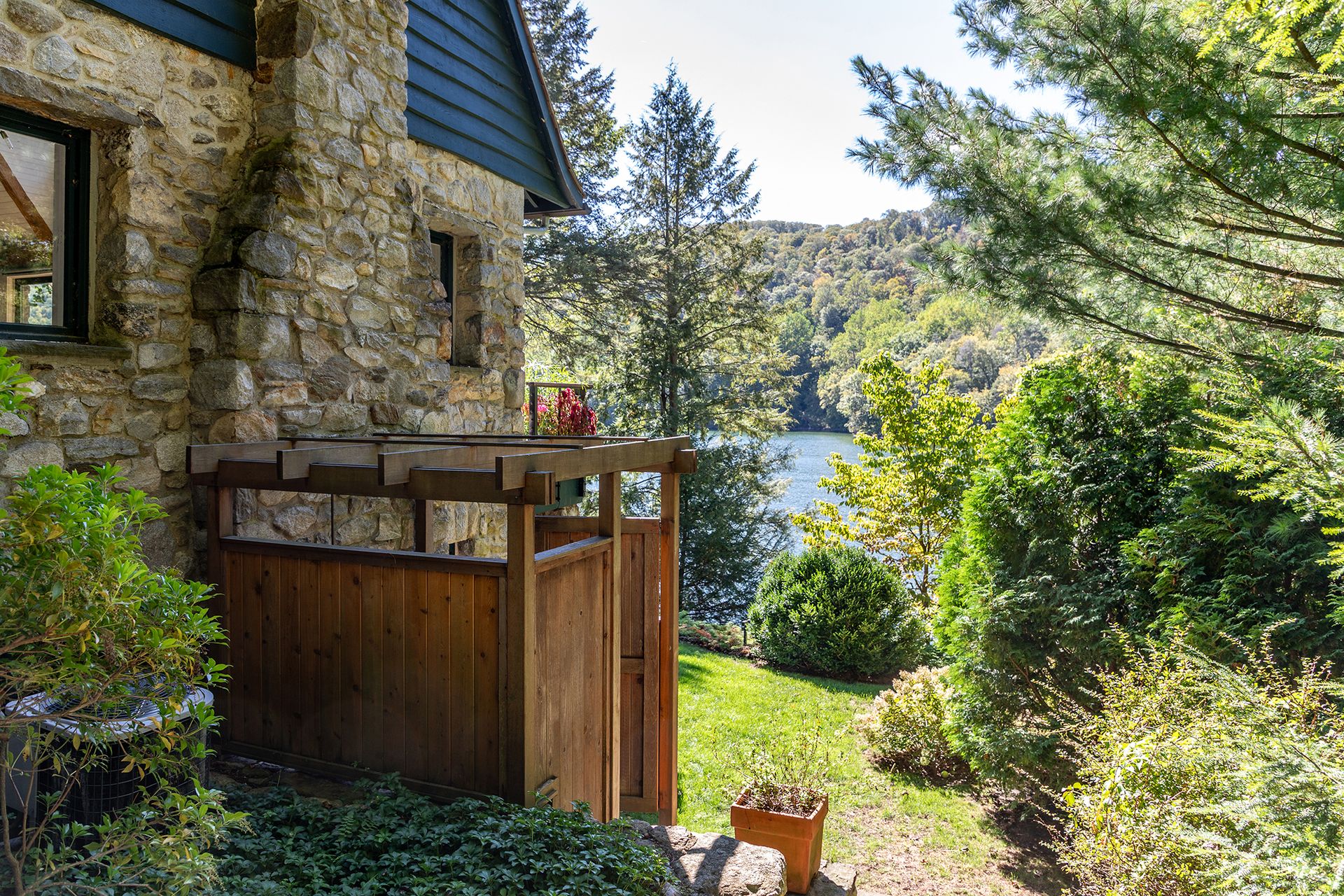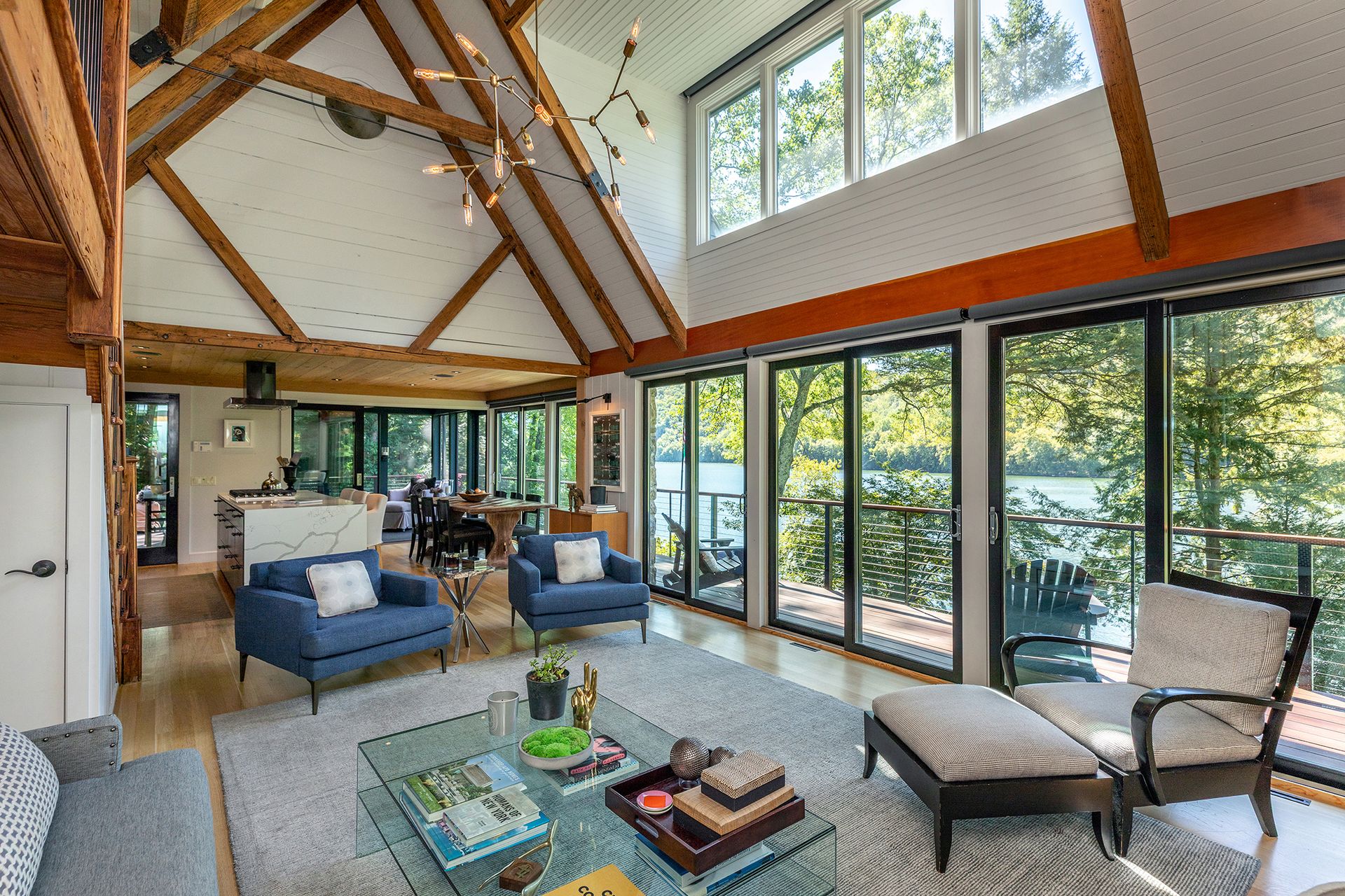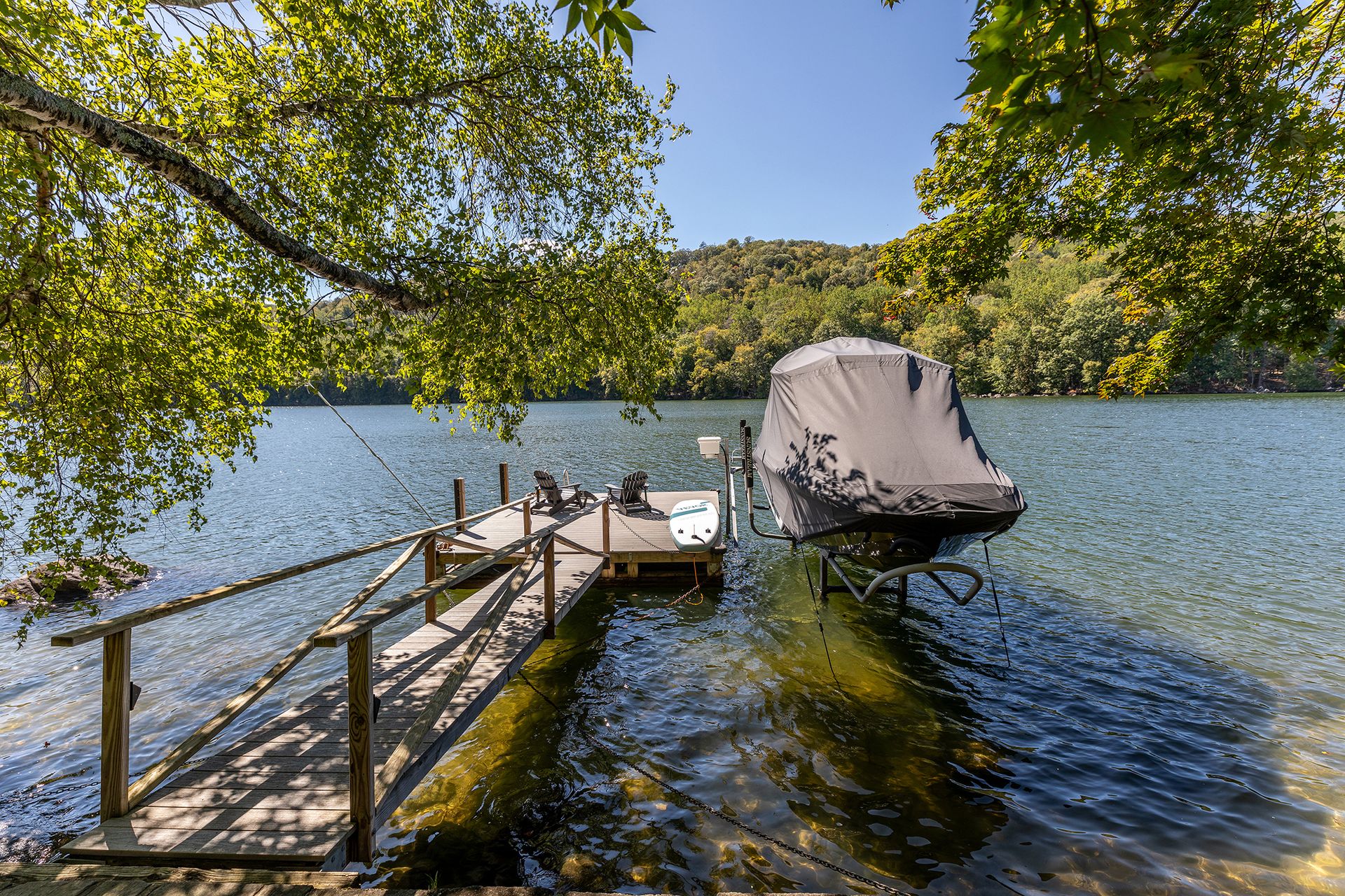 Craftsman style wood & iron staircase leads to second & lower levels. Intricate ceiling detail functions as art with an intriguing iron chandelier at the center. The open plan is highlighted by a full floor to ceiling stone fireplace as the focal point. Designed with lake enjoyment in mind, sliders lead from the great room and kitchen to the Ipe deck as well as from the lower level family room & bedroom suite to the level yard & lakefront.