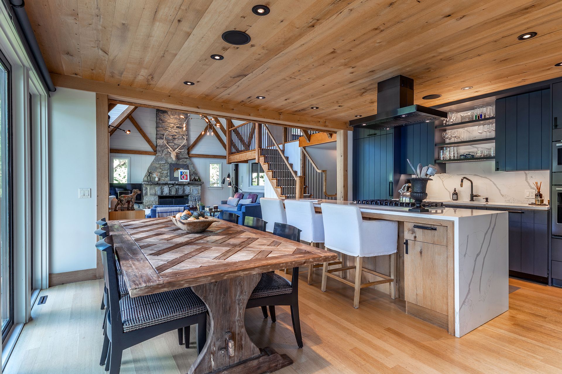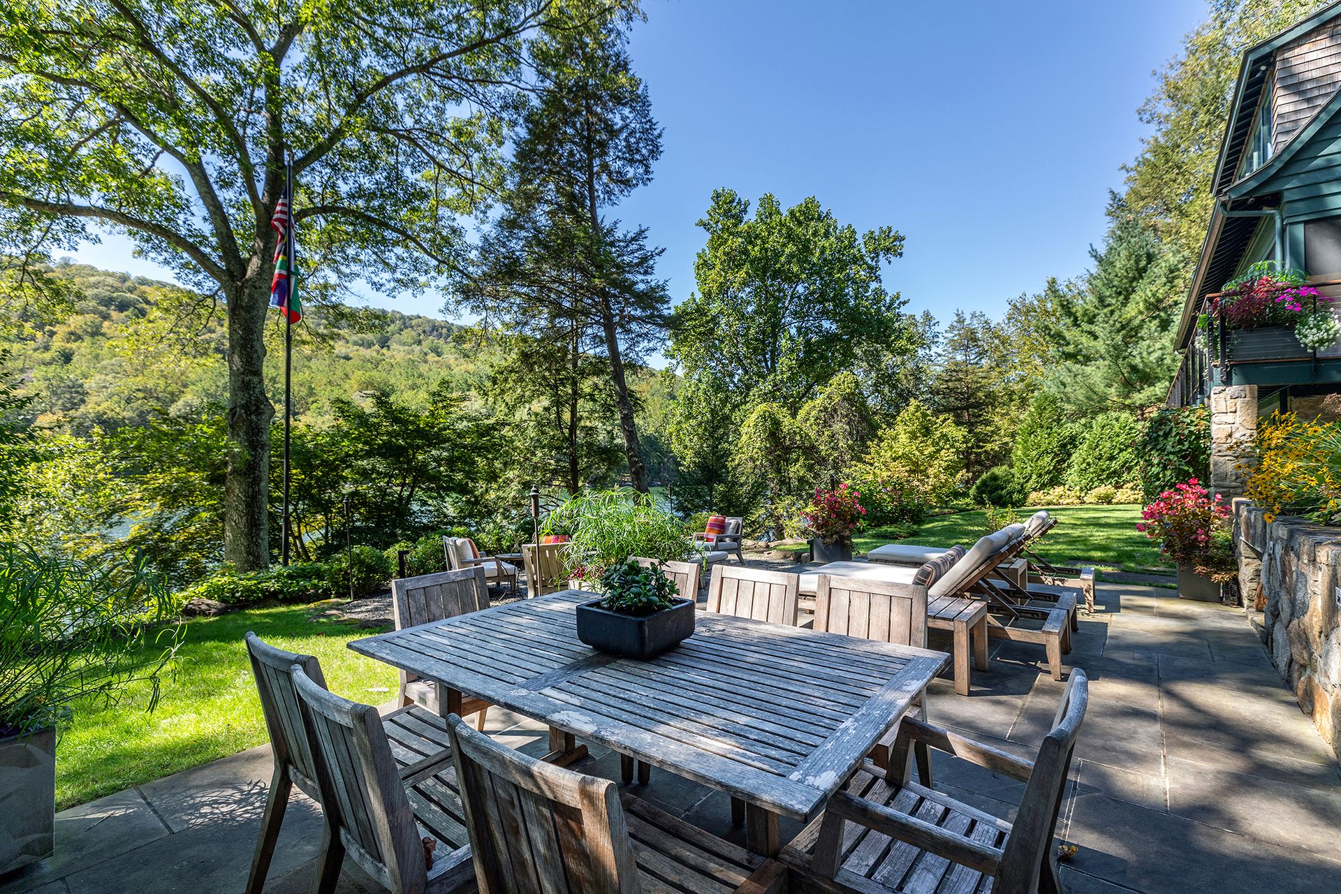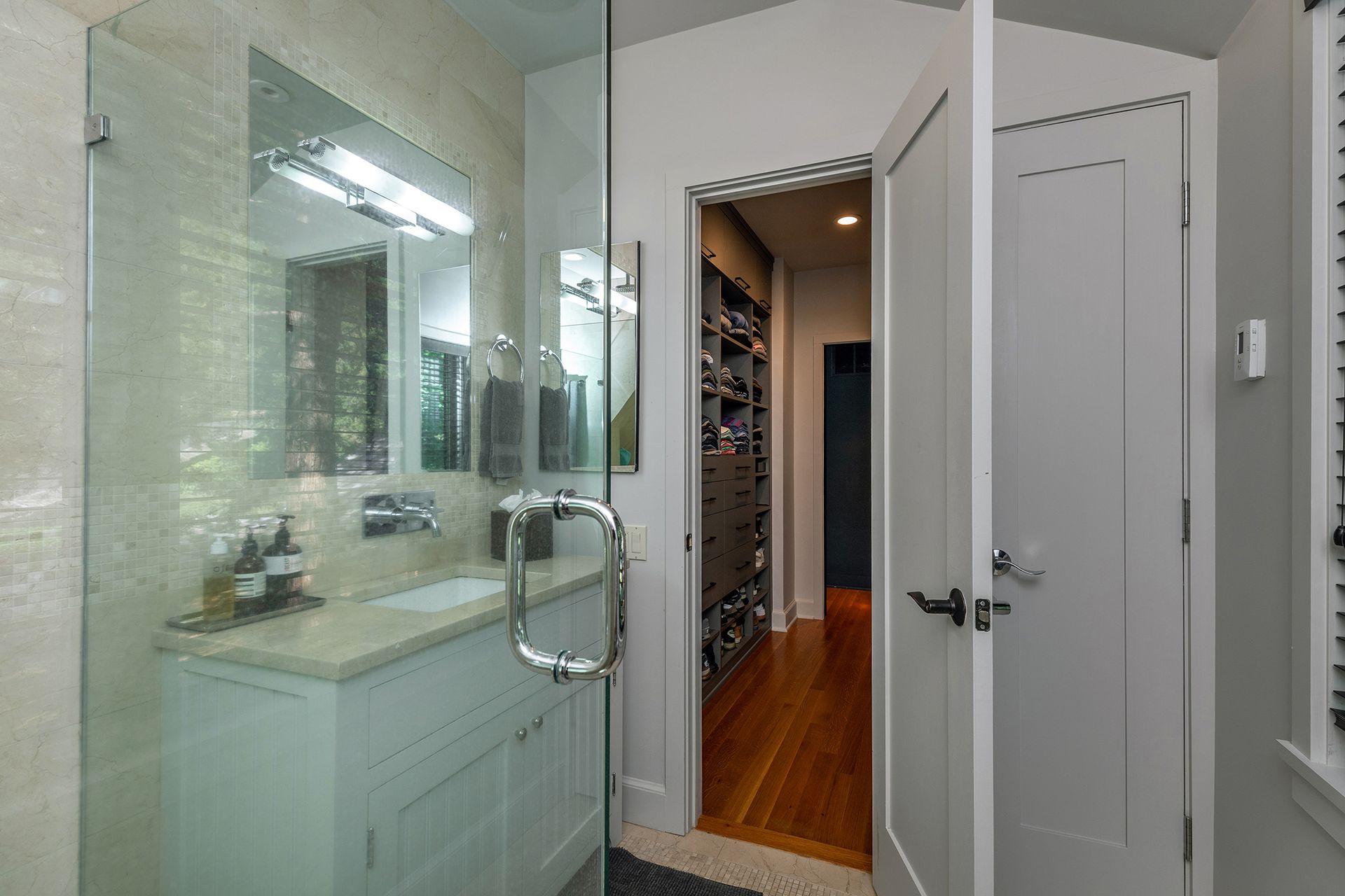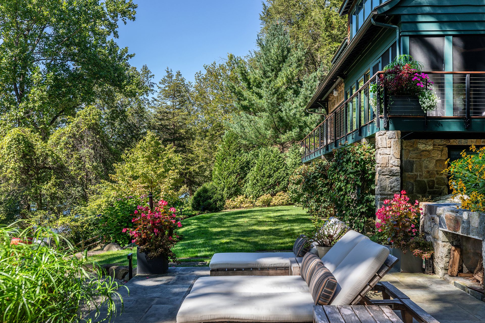 Craftsman style wood & iron staircase leads to second & lower levels. Intricate ceiling detail functions as art with an intriguing iron chandelier at the center. The open plan is highlighted by a full floor to ceiling stone fireplace as the focal point. Designed with lake enjoyment in mind, sliders lead from the great room and kitchen to the Ipe deck as well as from the lower level family room & bedroom suite to the level yard & lakefront.