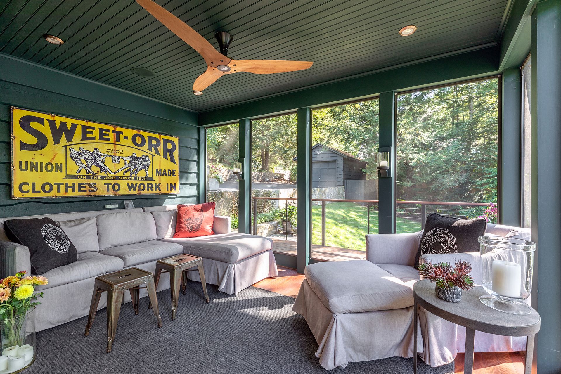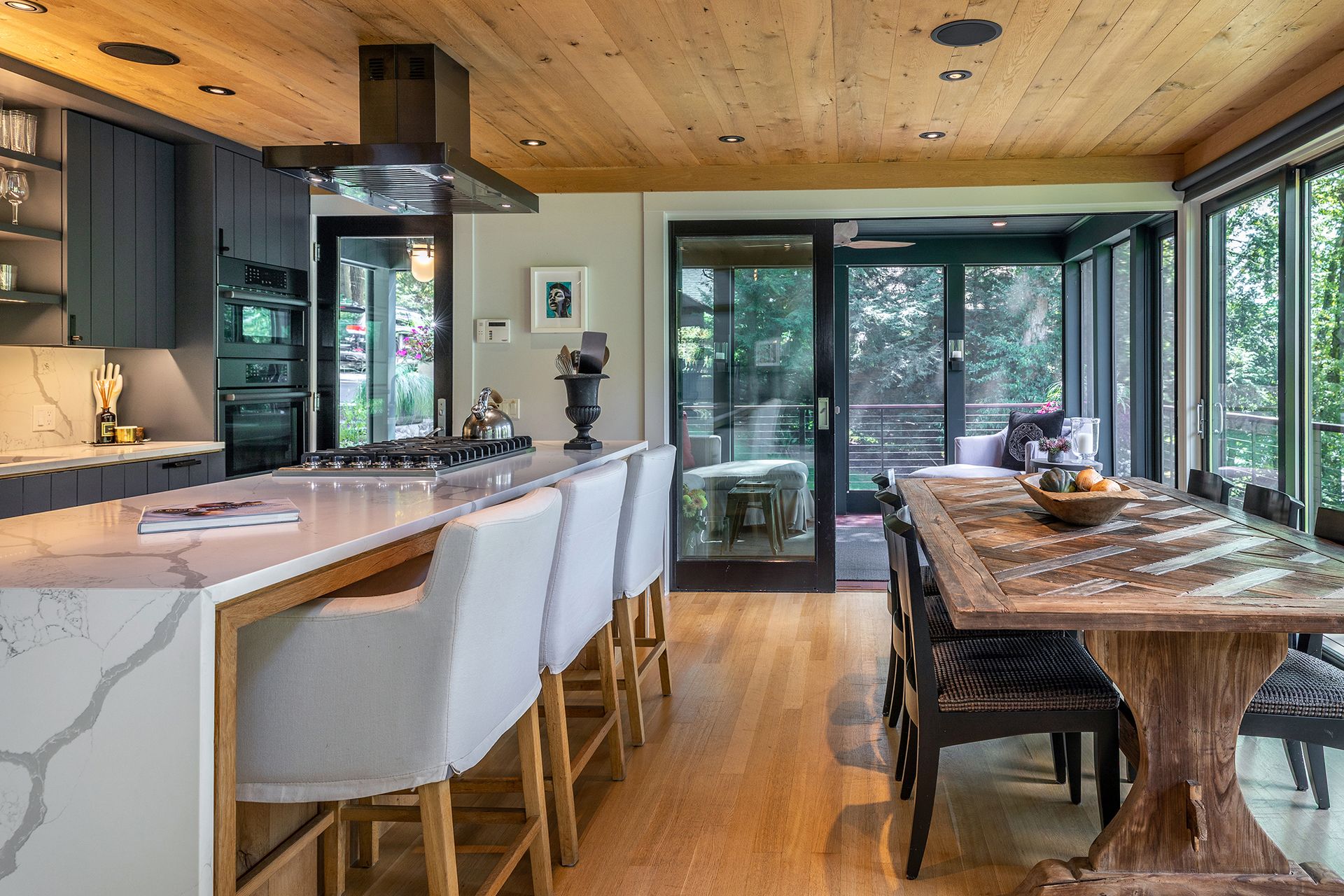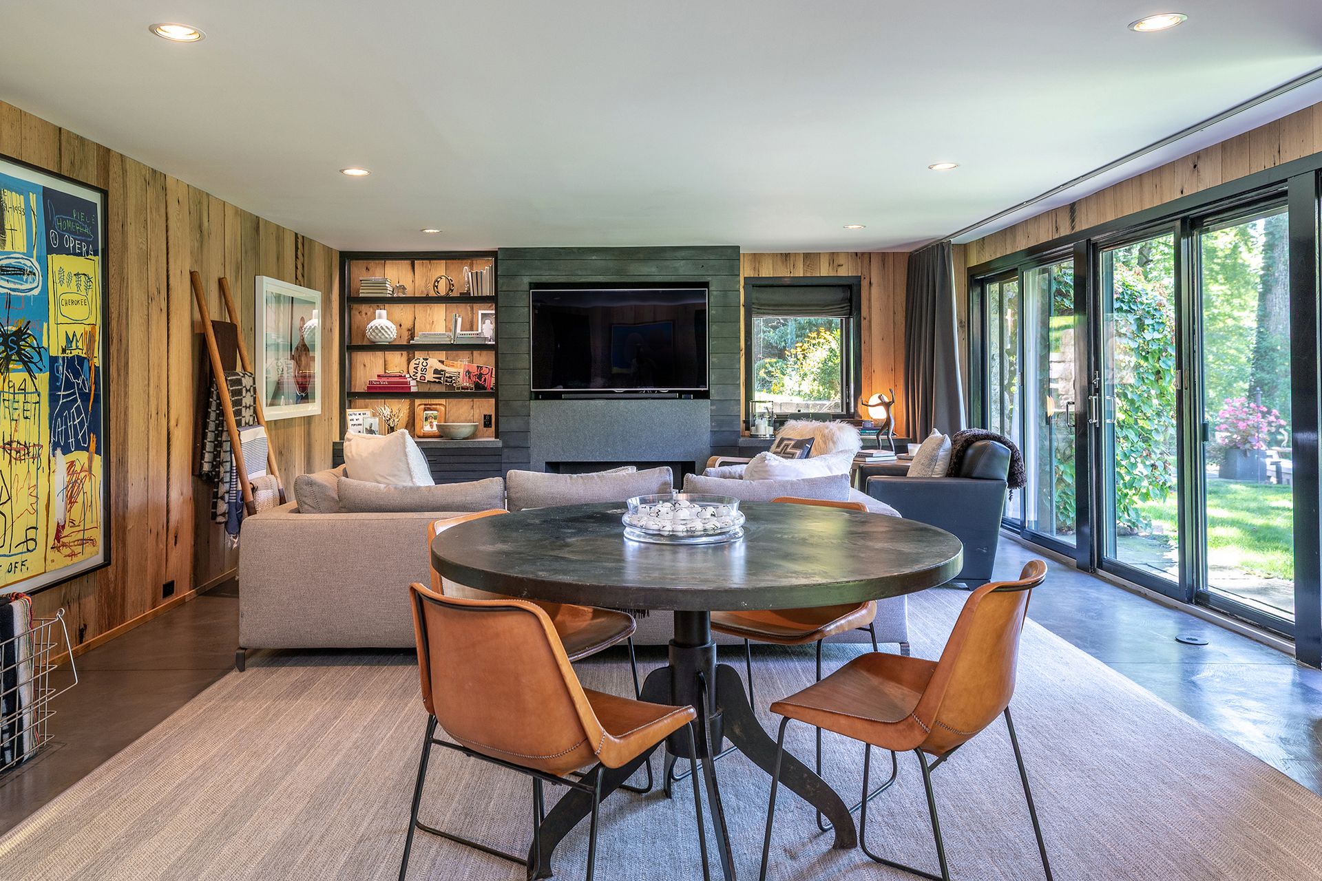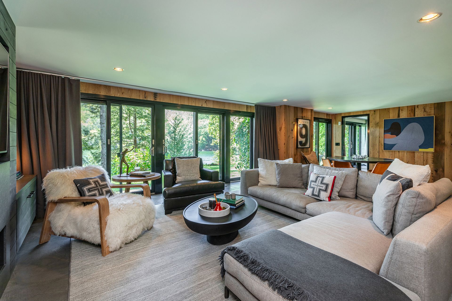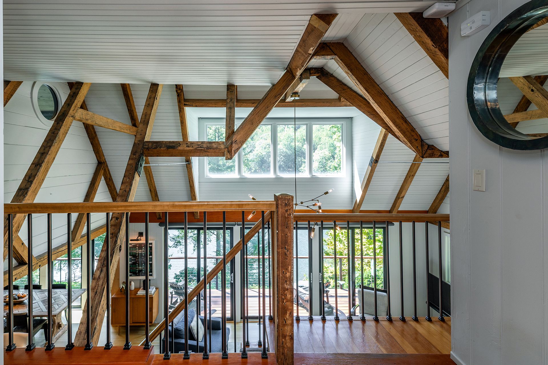 Craftsman style wood & iron staircase leads to second & lower levels. Intricate ceiling detail functions as art with an intriguing iron chandelier at the center. The open plan is highlighted by a full floor to ceiling stone fireplace as the focal point. Designed with lake enjoyment in mind, sliders lead from the great room and kitchen to the Ipe deck as well as from the lower level family room & bedroom suite to the level yard & lakefront.