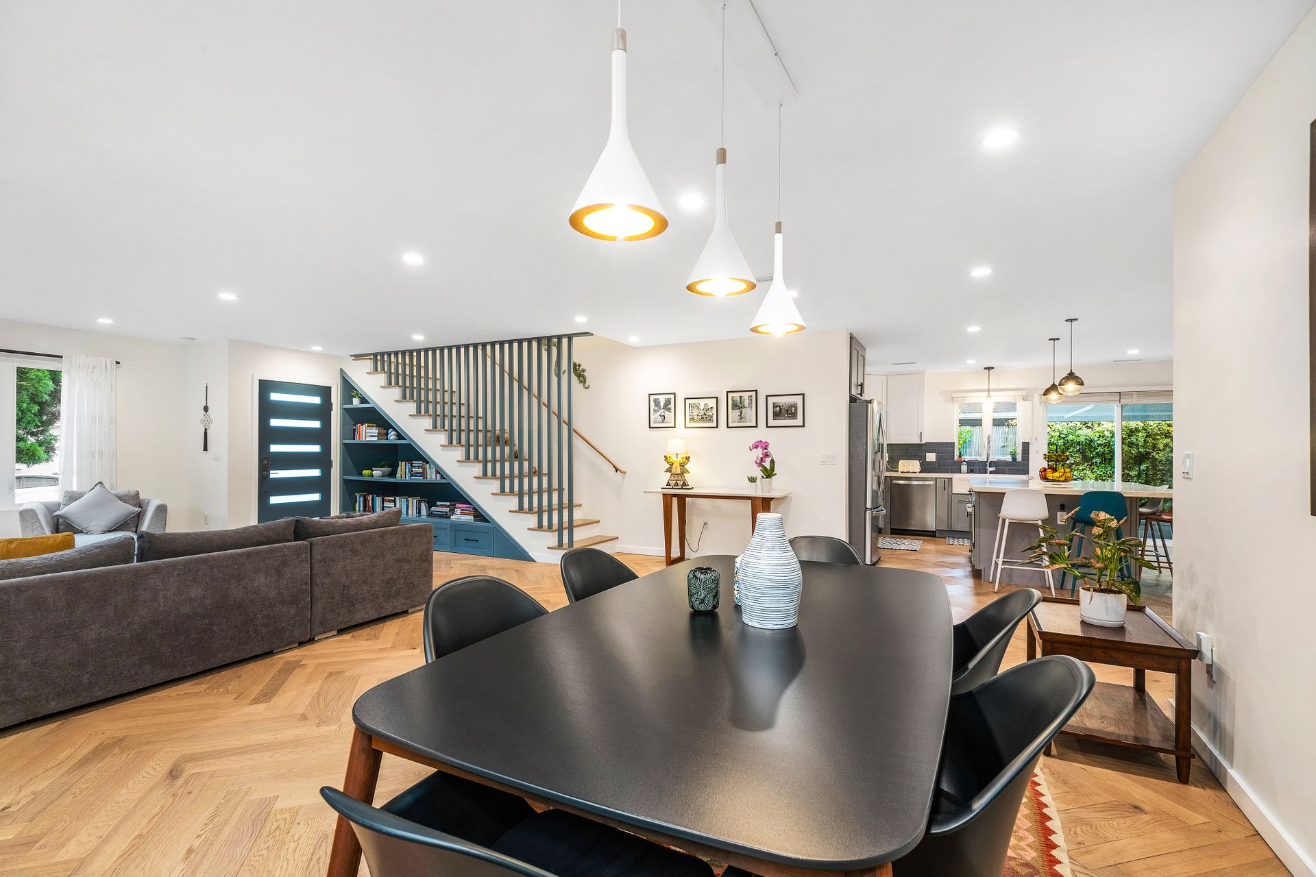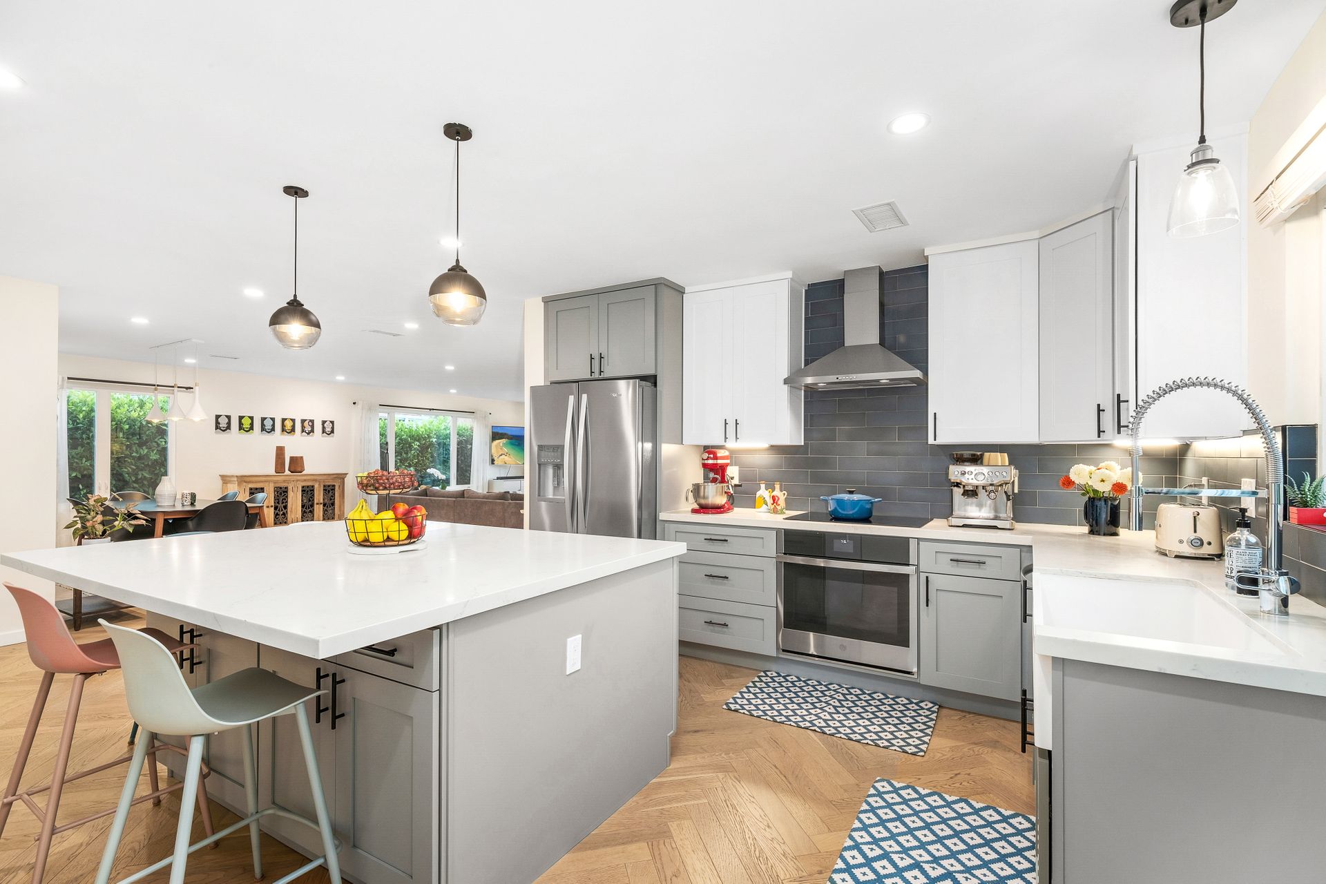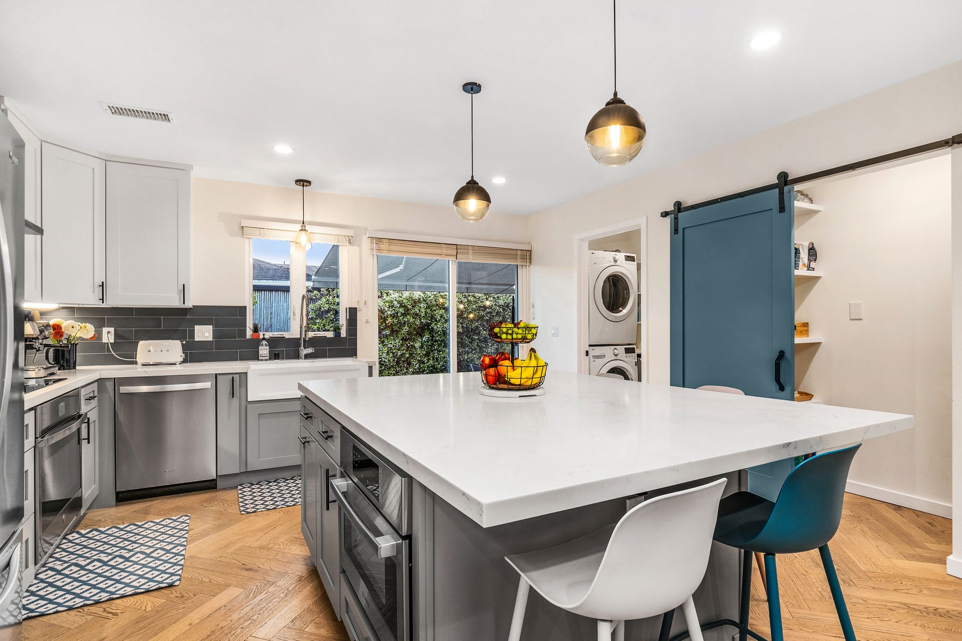 A manicured front lawn welcomes you into an open-concept layout where the living room, dining area, and kitchen flow seamlessly together, ideal for everyday living and entertaining. The remodeled (2021) kitchen boasts quartz countertops, shaker cabinetry, a central island, modern appliances, and a walk-in pantry. A laundry room sits just off the kitchen for added convenience.
