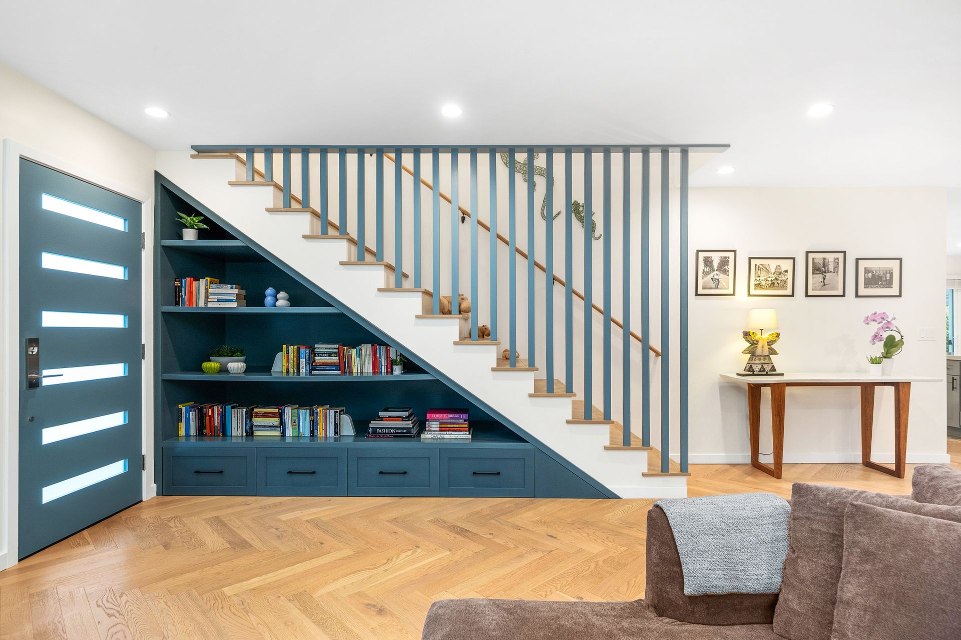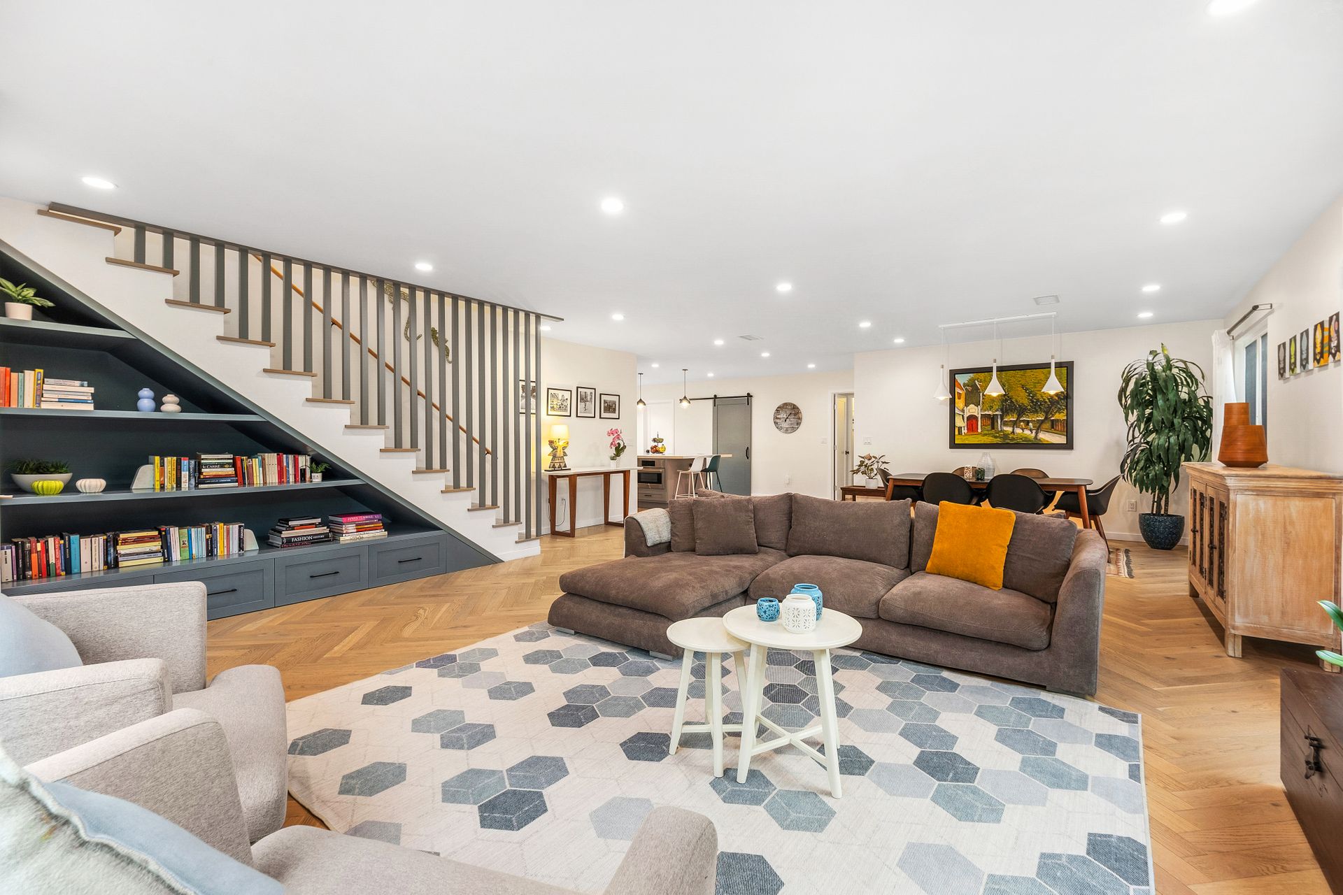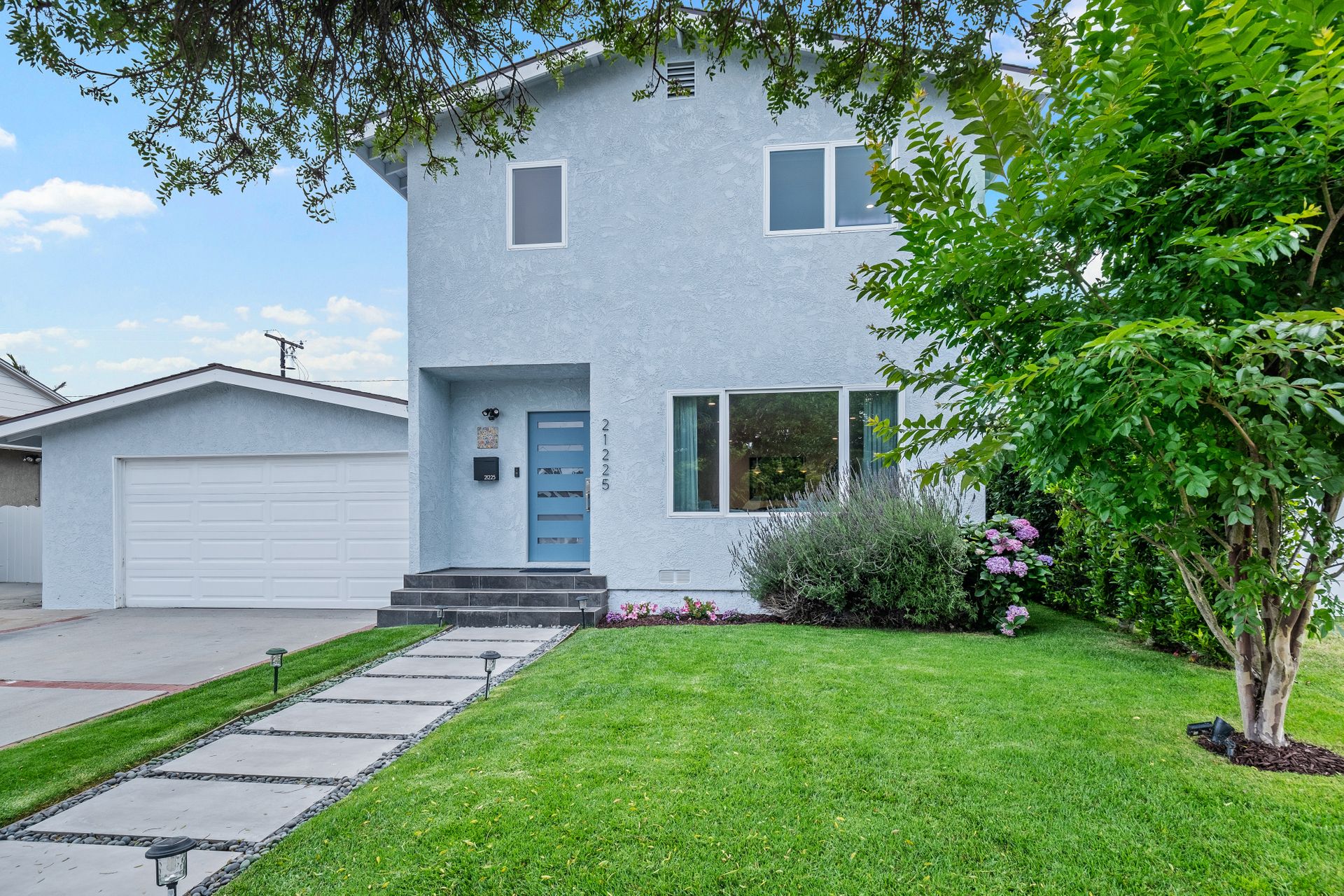A manicured front lawn welcomes you into an open-concept layout where the living room, dining area, and kitchen flow seamlessly together, ideal for everyday living and entertaining. The remodeled (2021) kitchen boasts quartz countertops, shaker cabinetry, a central island, modern appliances, and a walk-in pantry. A laundry room sits just off the kitchen for added convenience.