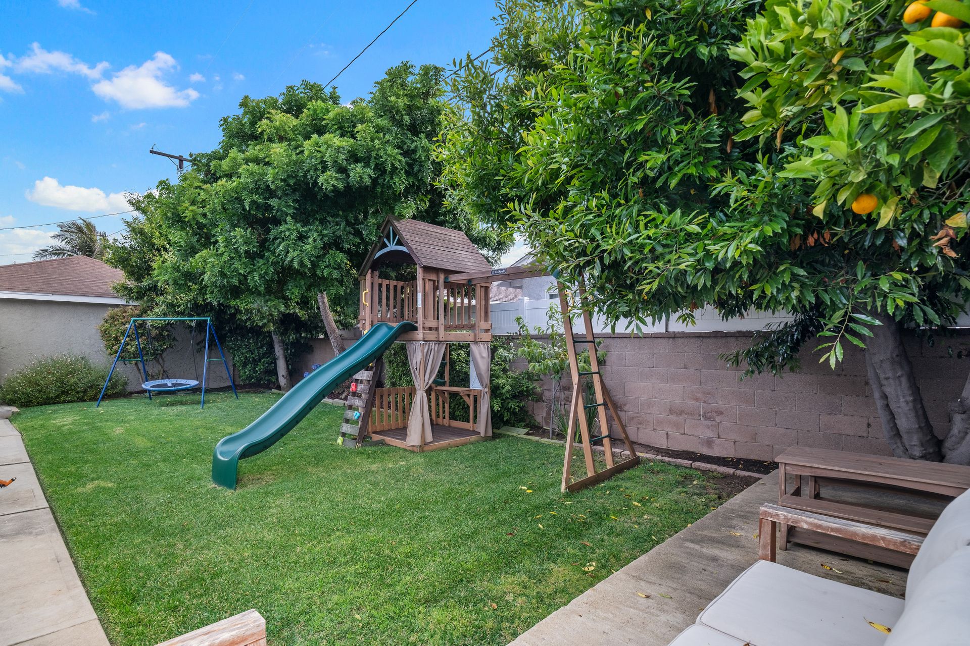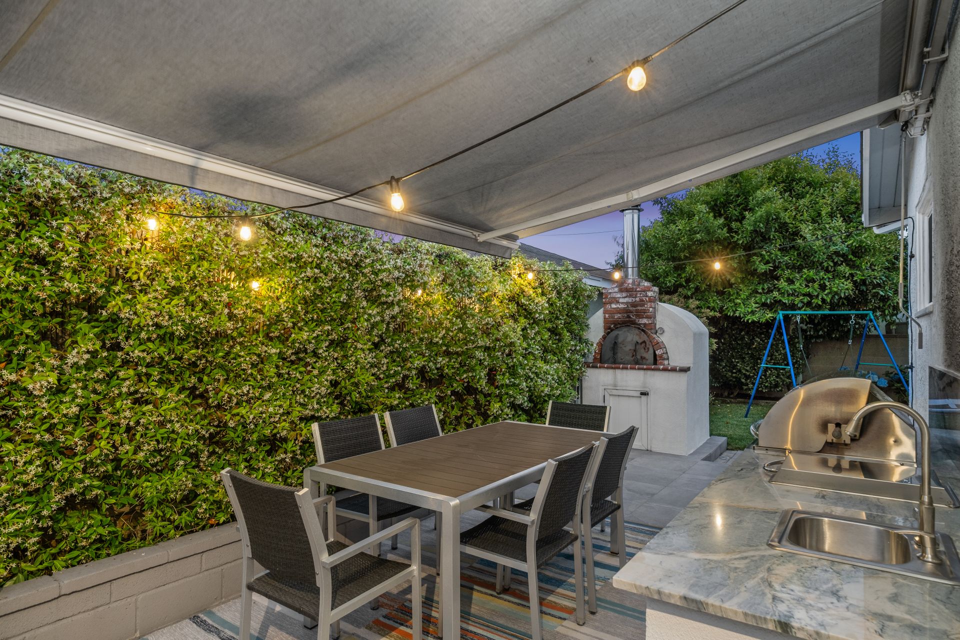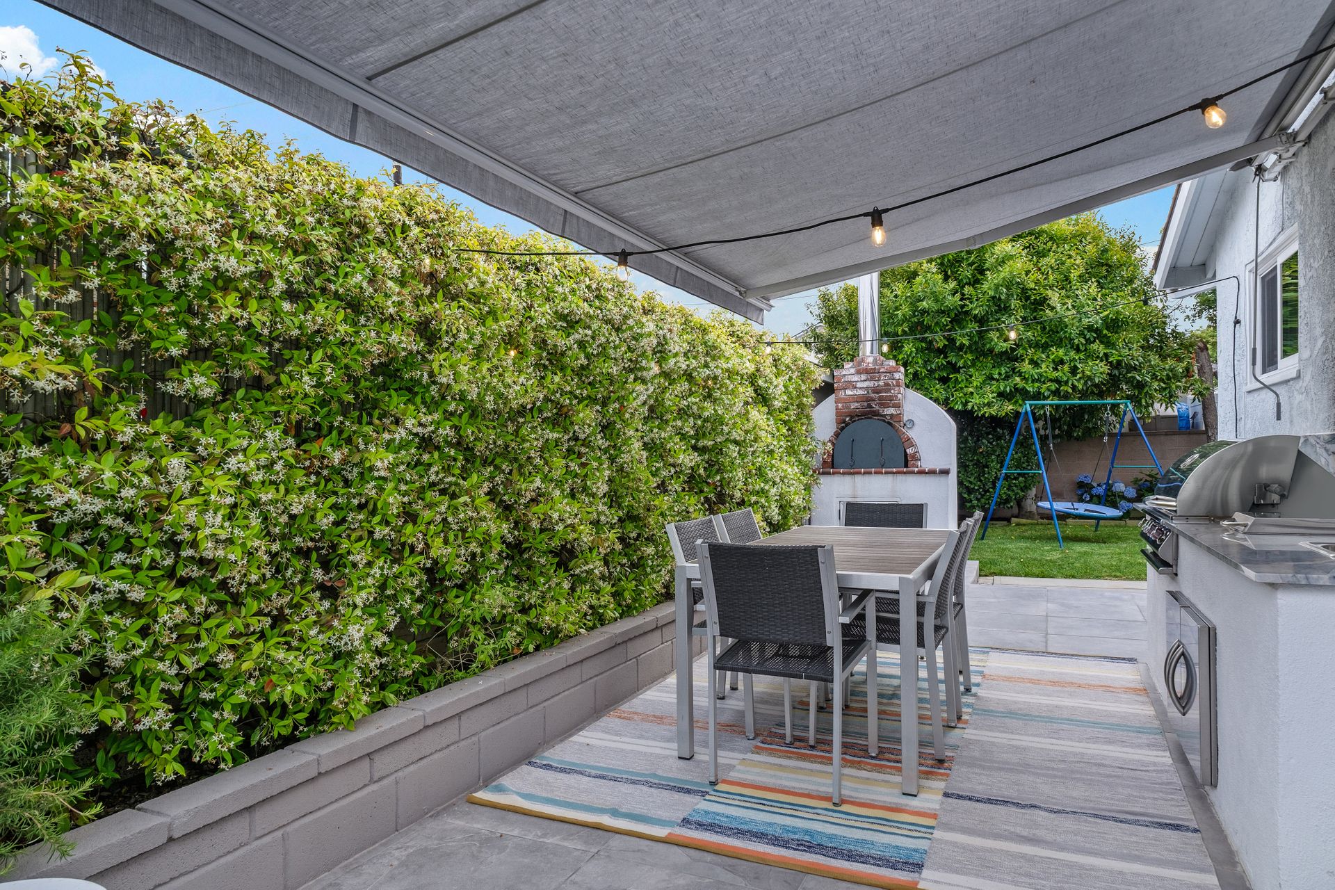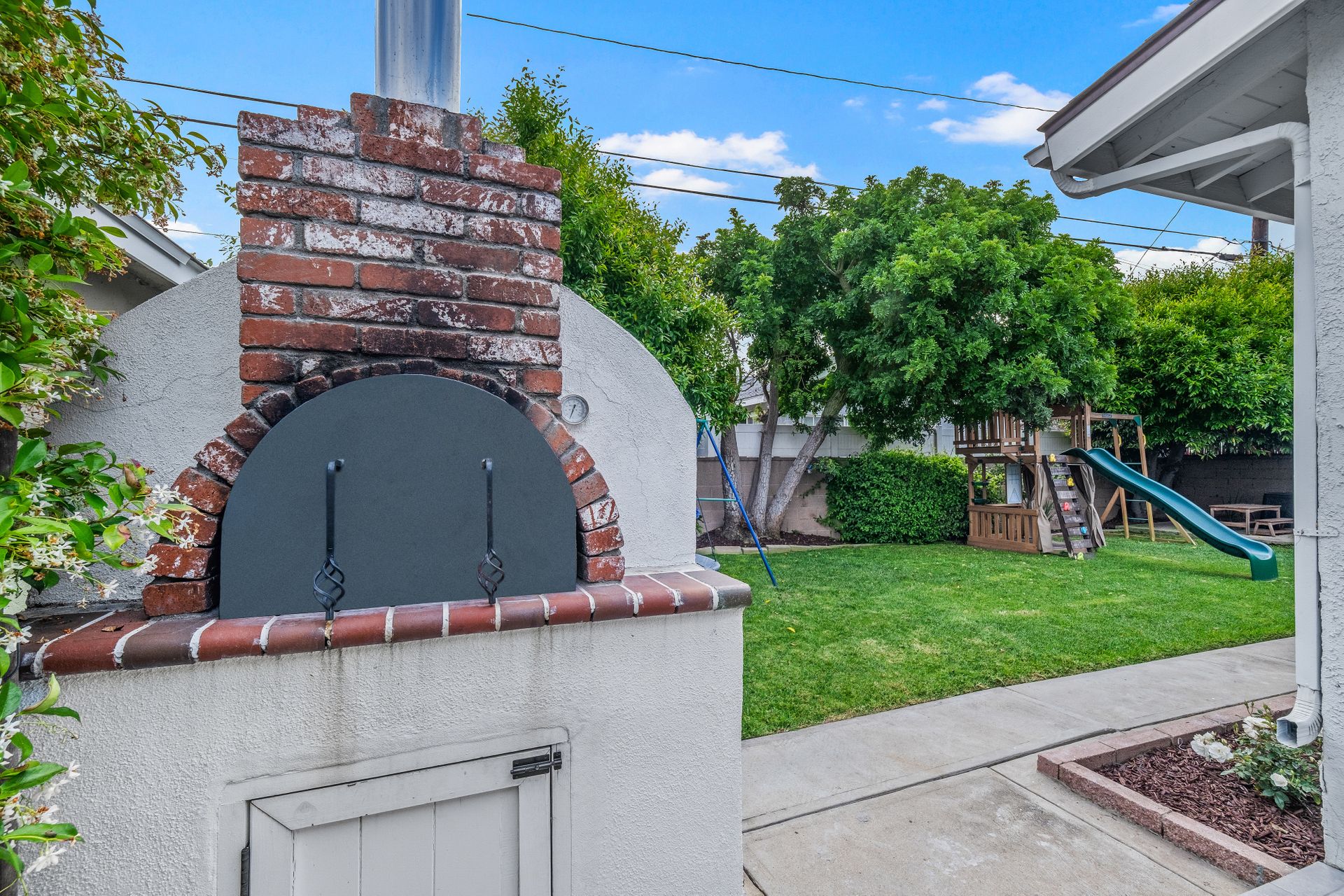 The entertainer’s dream side yard includes an outdoor kitchen with a built-in barbecue, pizza oven, propane burner, sink, seating area, gorgeous imported granite countertop and a lemon tree. The backyard is a private retreat, featuring a grassy lawn, colorful flowers, an orange tree, and a play structure.