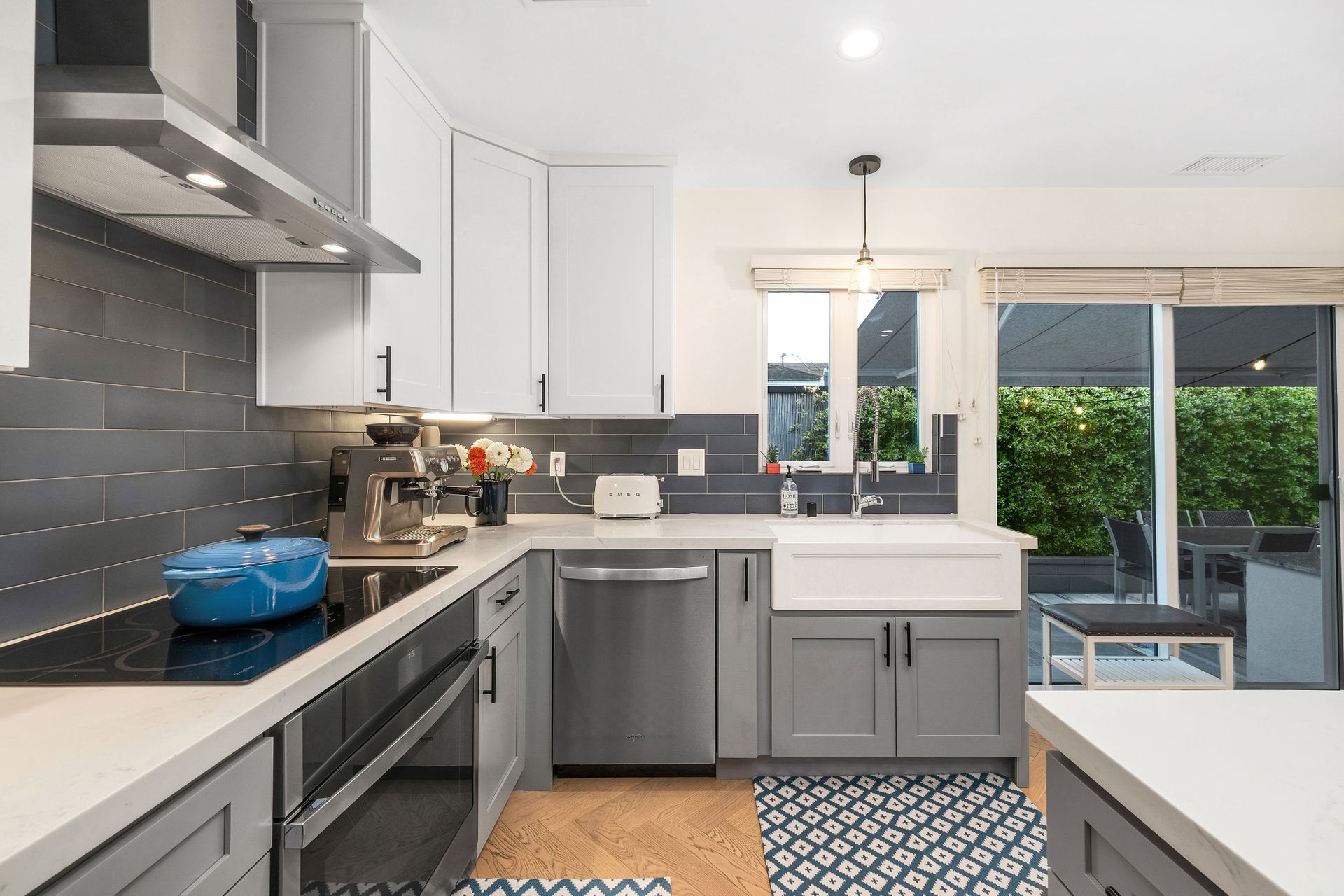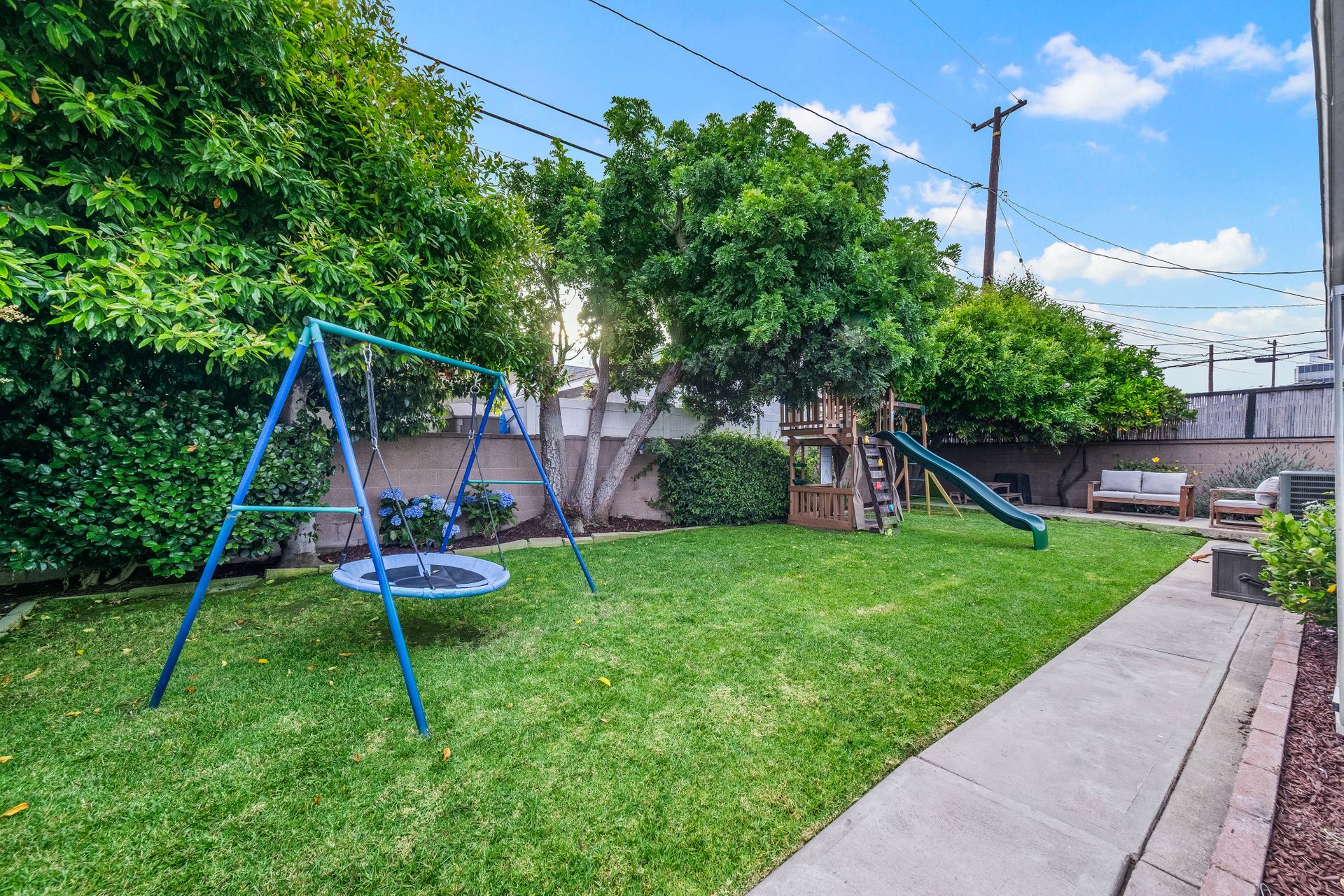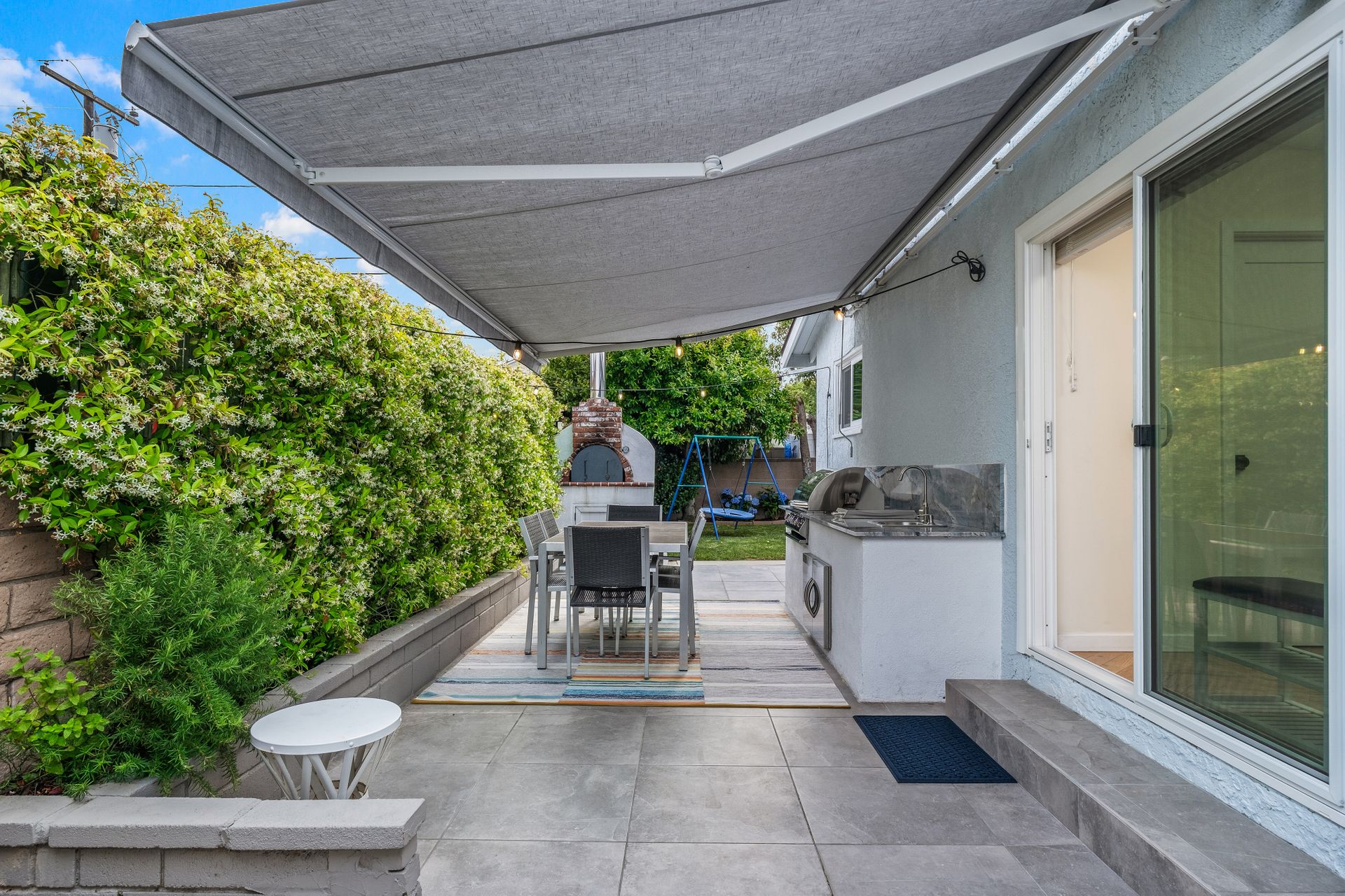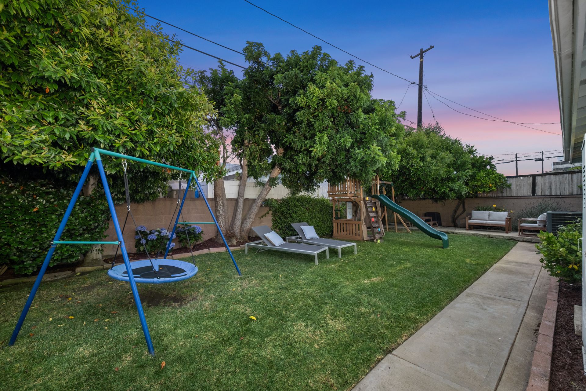 The entertainer’s dream side yard includes an outdoor kitchen with a built-in barbecue, pizza oven, propane burner, sink, seating area, gorgeous imported granite countertop and a lemon tree. The backyard is a private retreat, featuring a grassy lawn, colorful flowers, an orange tree, and a play structure.