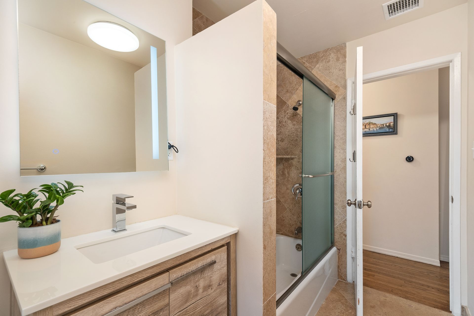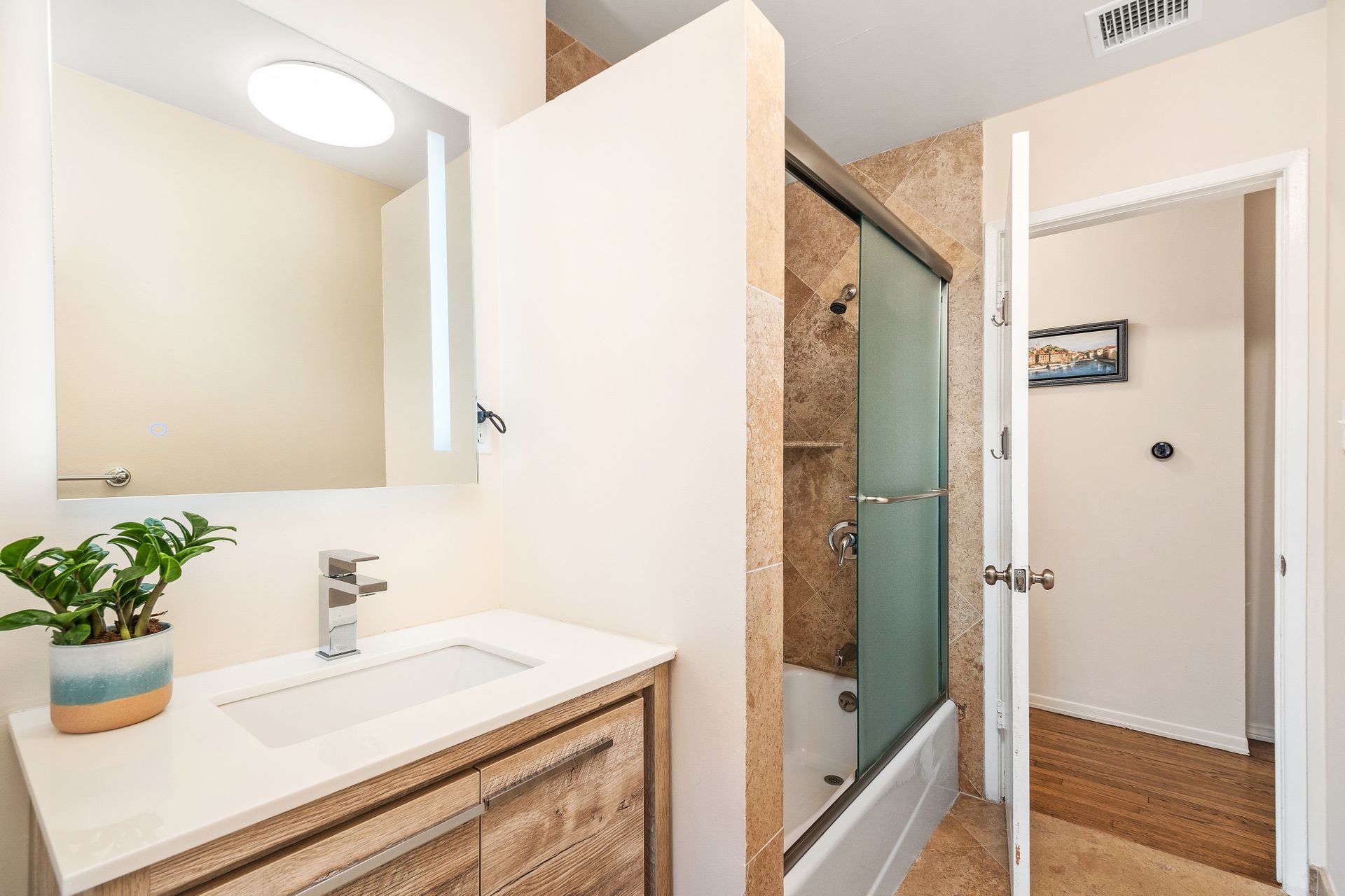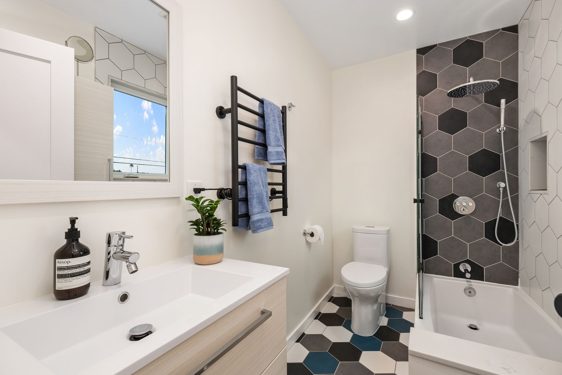 The downstairs includes three bedrooms, a full bath, and a three-quarter bath toward the back of the home. Upstairs, the spacious and private primary suite offers an en-suite bath and charming neighborhood views.