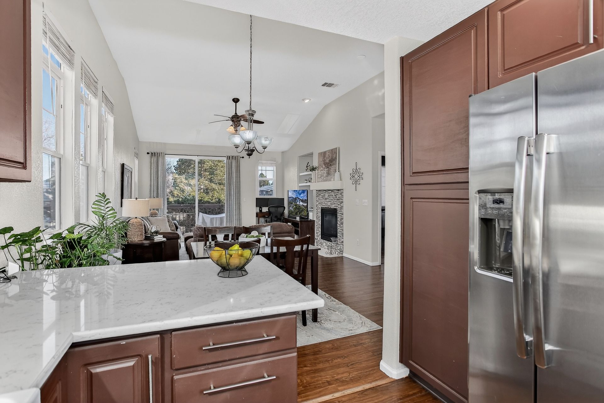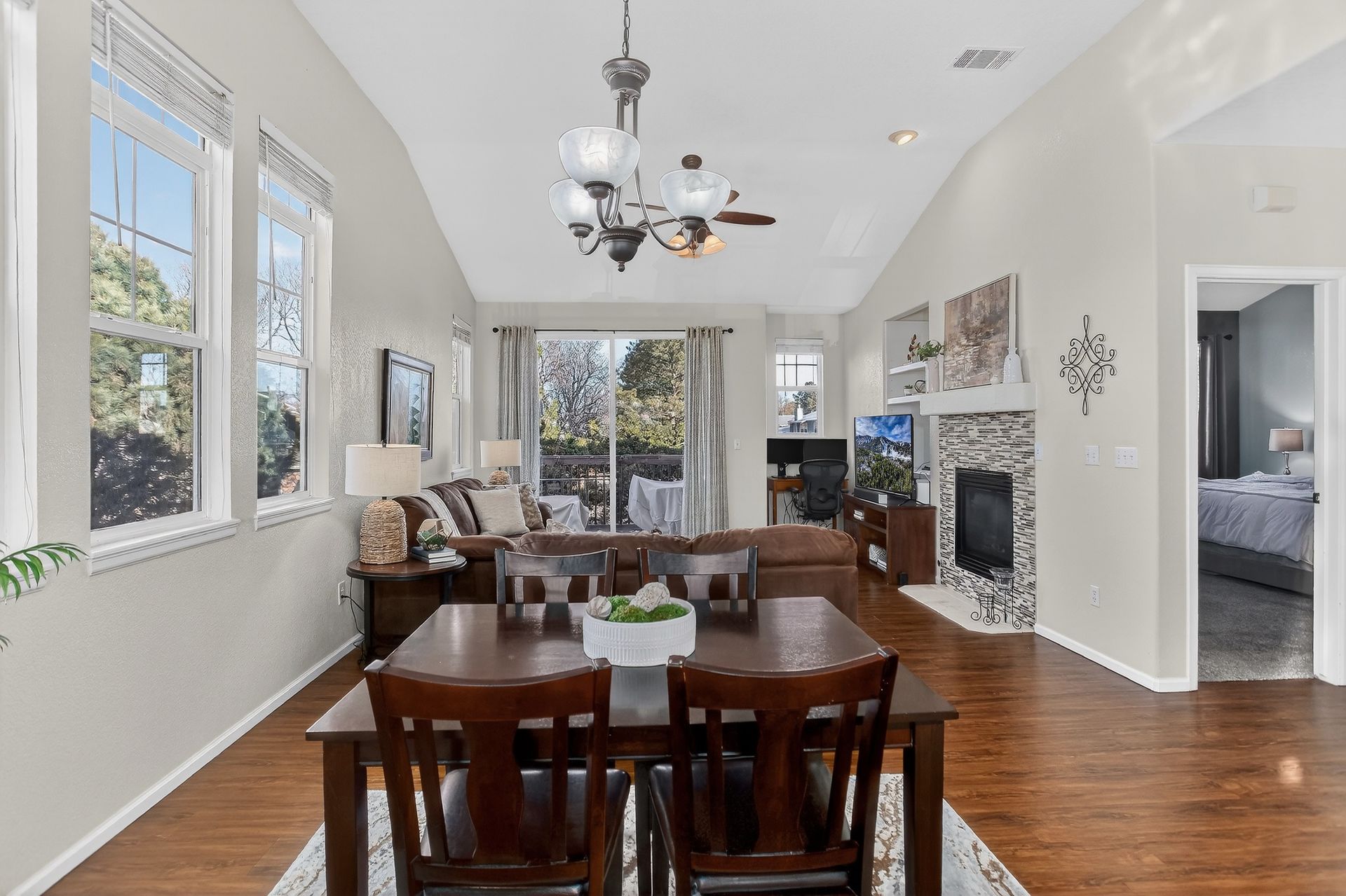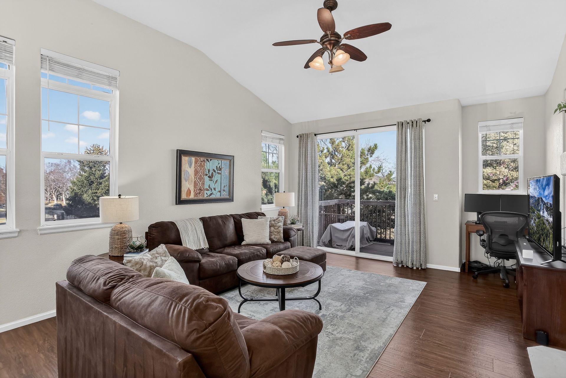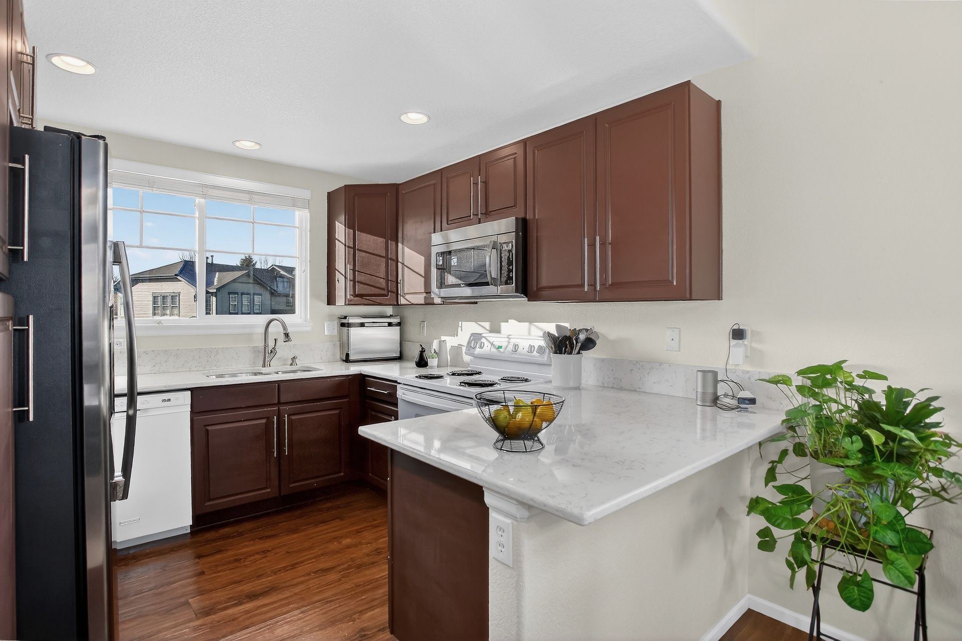 Welcome home! This lovely sunny bright open townhome features 1,319 square feet of one-level living. It is in a beautiful, gated community with two bedrooms and two bathrooms featuring a kitchen with new quartz counters and all appliances included, a large living room area with a gas fireplace, a tranquil outdoor space backing to open space with nice trees for privacy, a primary suite with a large walk-in closet and a full bathroom, a second large bedroom with a lot of storage and a full size laundry area. There is a one-car attached garage with nice storage shelves. New carpet, new flooring in the bathrooms, some new windows and blinds. Centrally located in the community and with easy access to Cherry Creek, downtown Denver, and DIA.