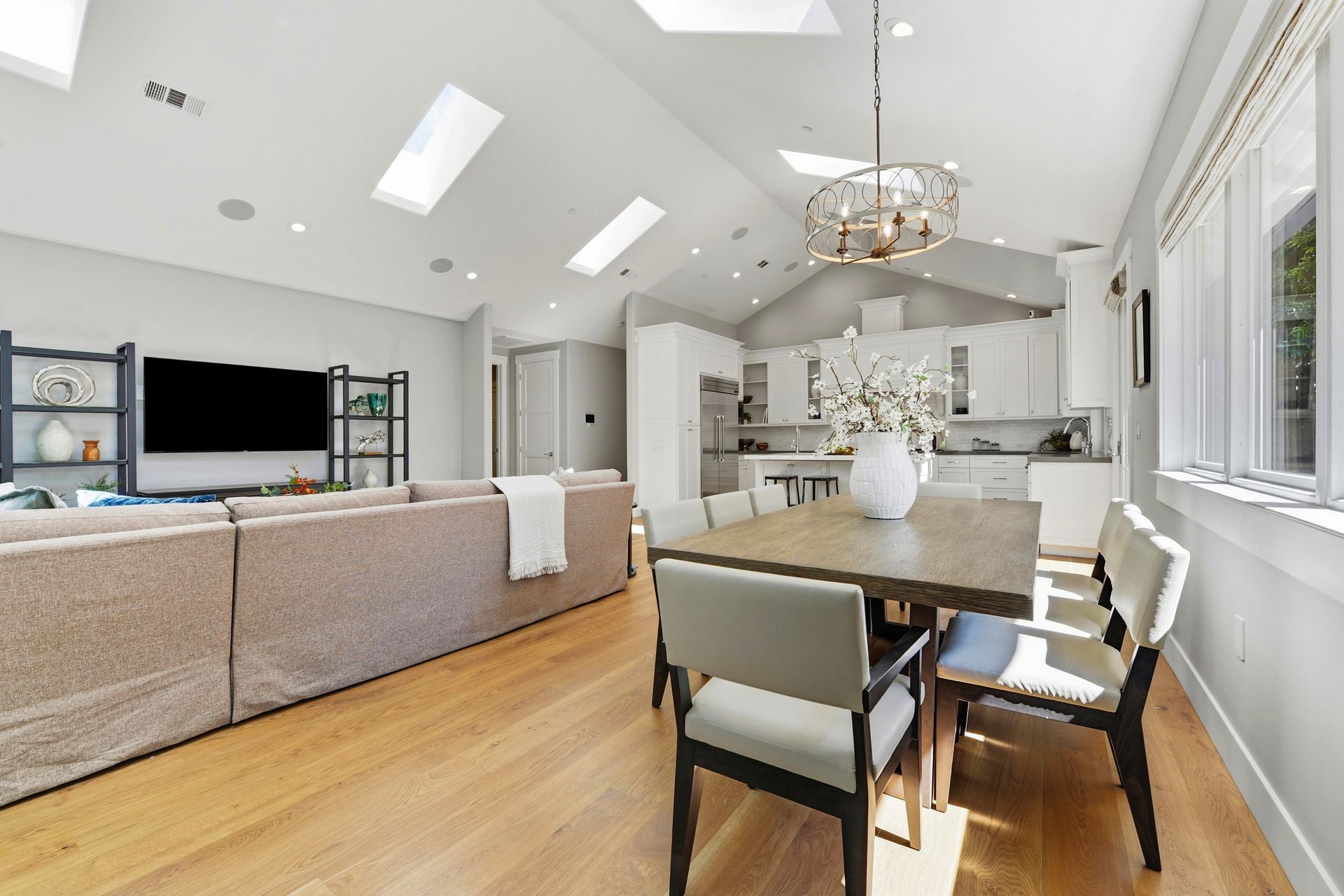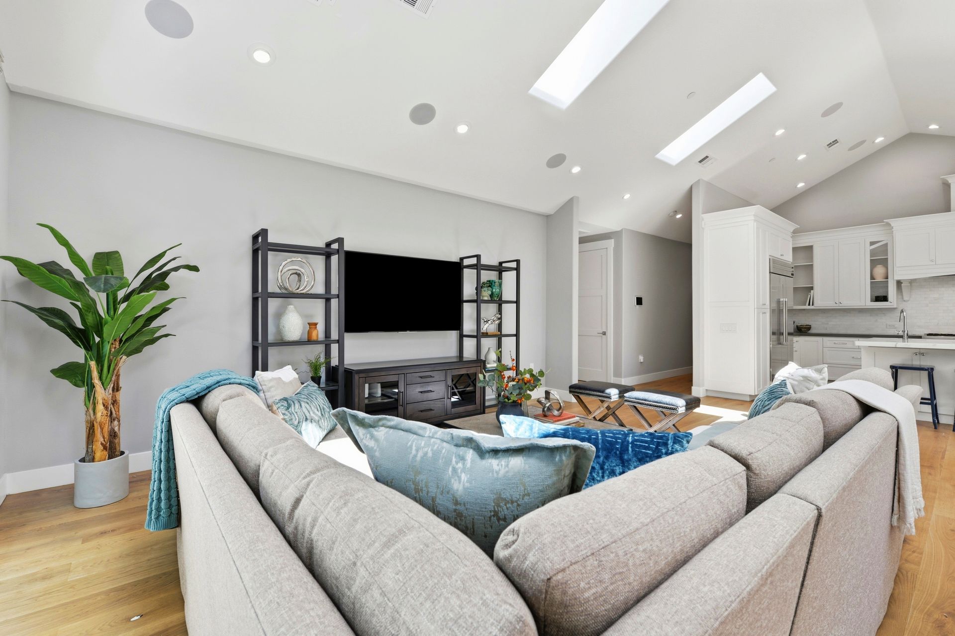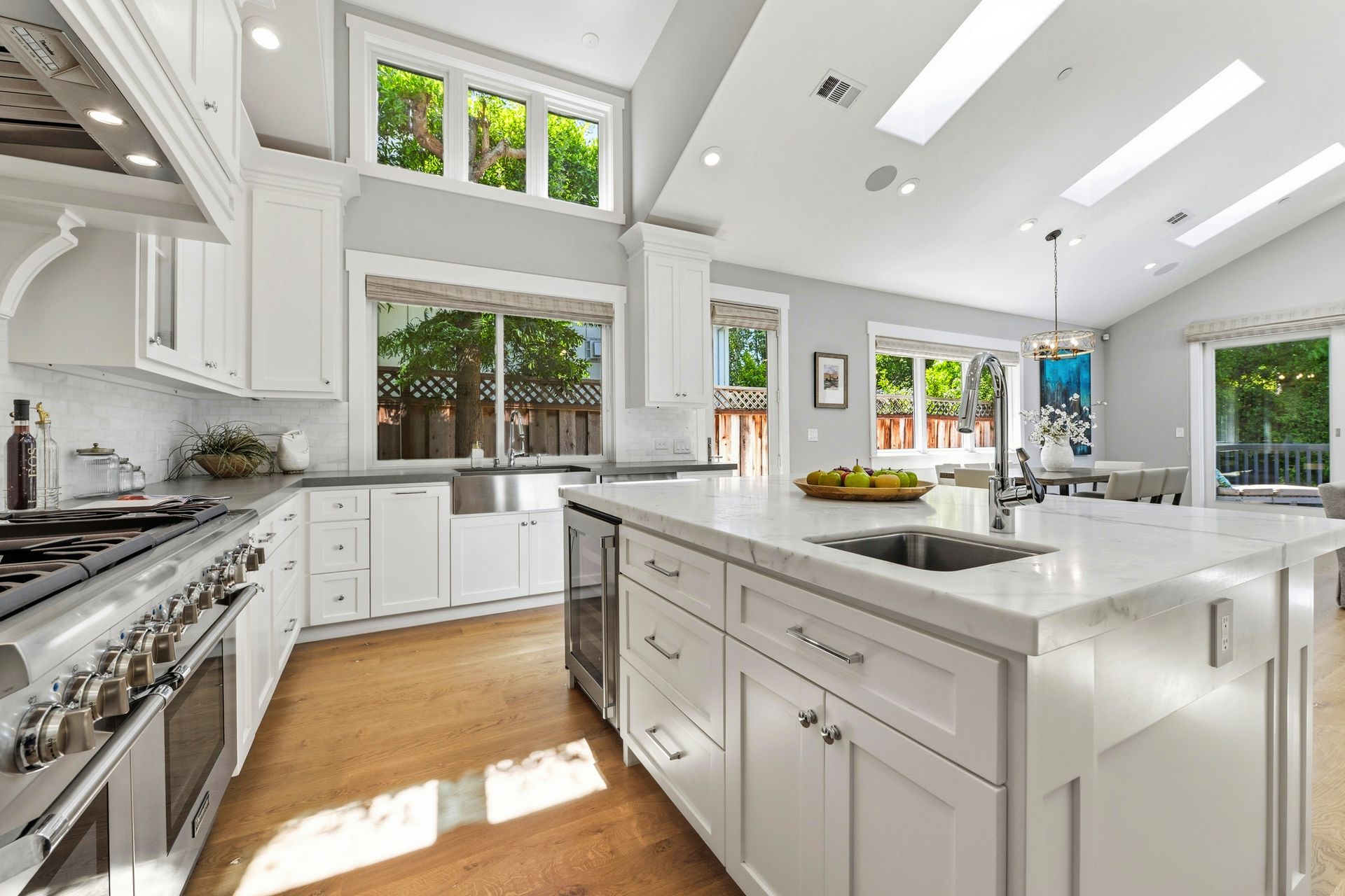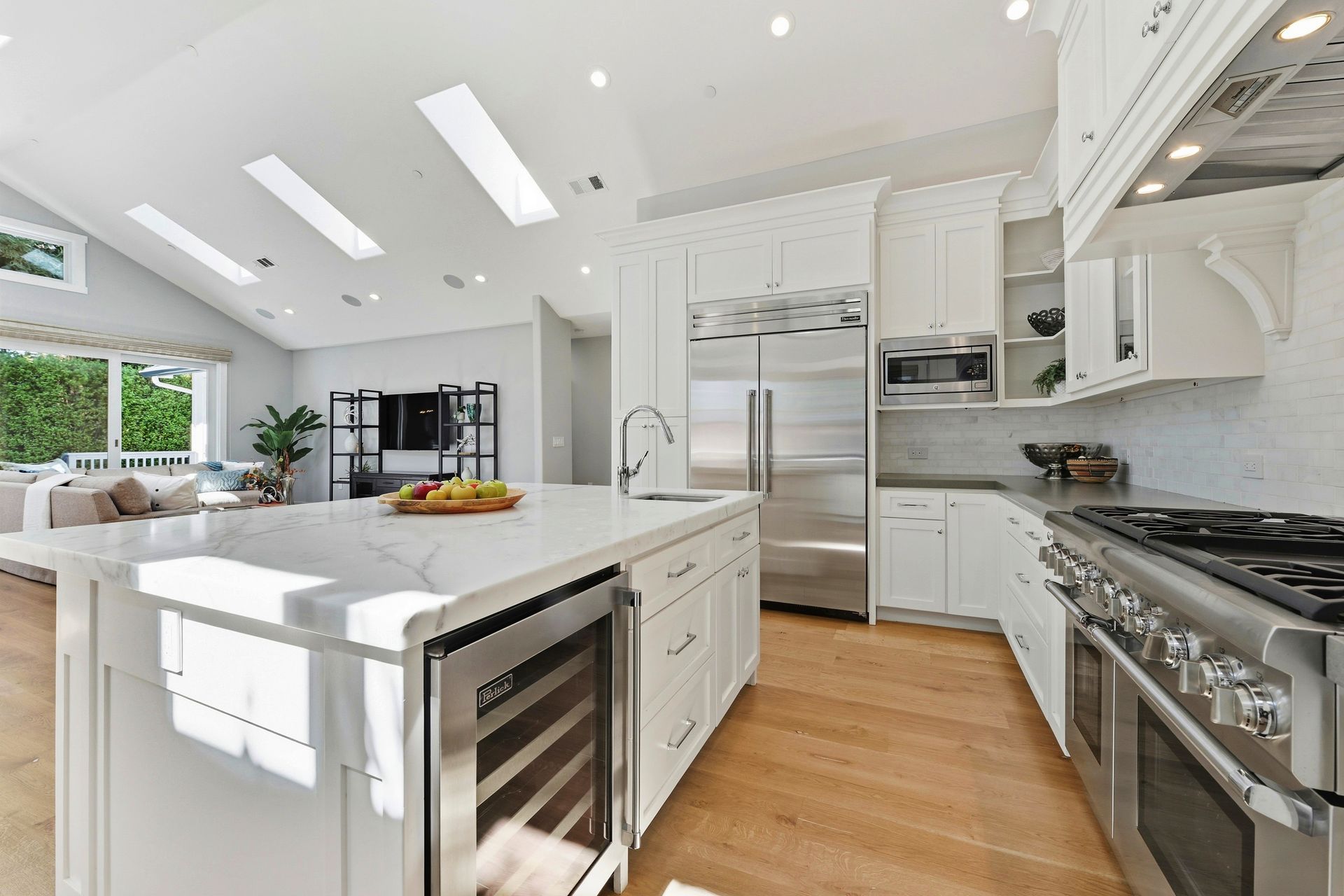 This approximately 2,486 square foot single-level home offers four bedrooms and three and a half bathrooms. The modern farmhouse-style design features vaulted ceilings, skylights and transom windows, to list just a few details creating a spacious and airy atmosphere throughout the living areas. The Calcutta marble island and Quartz countertops, and stainless appliances in the kitchen provide a sleek and functional space for the discerning chef, complemented by the vaulted ceilings, skylights and abundant windows that flood the space with natural light.
