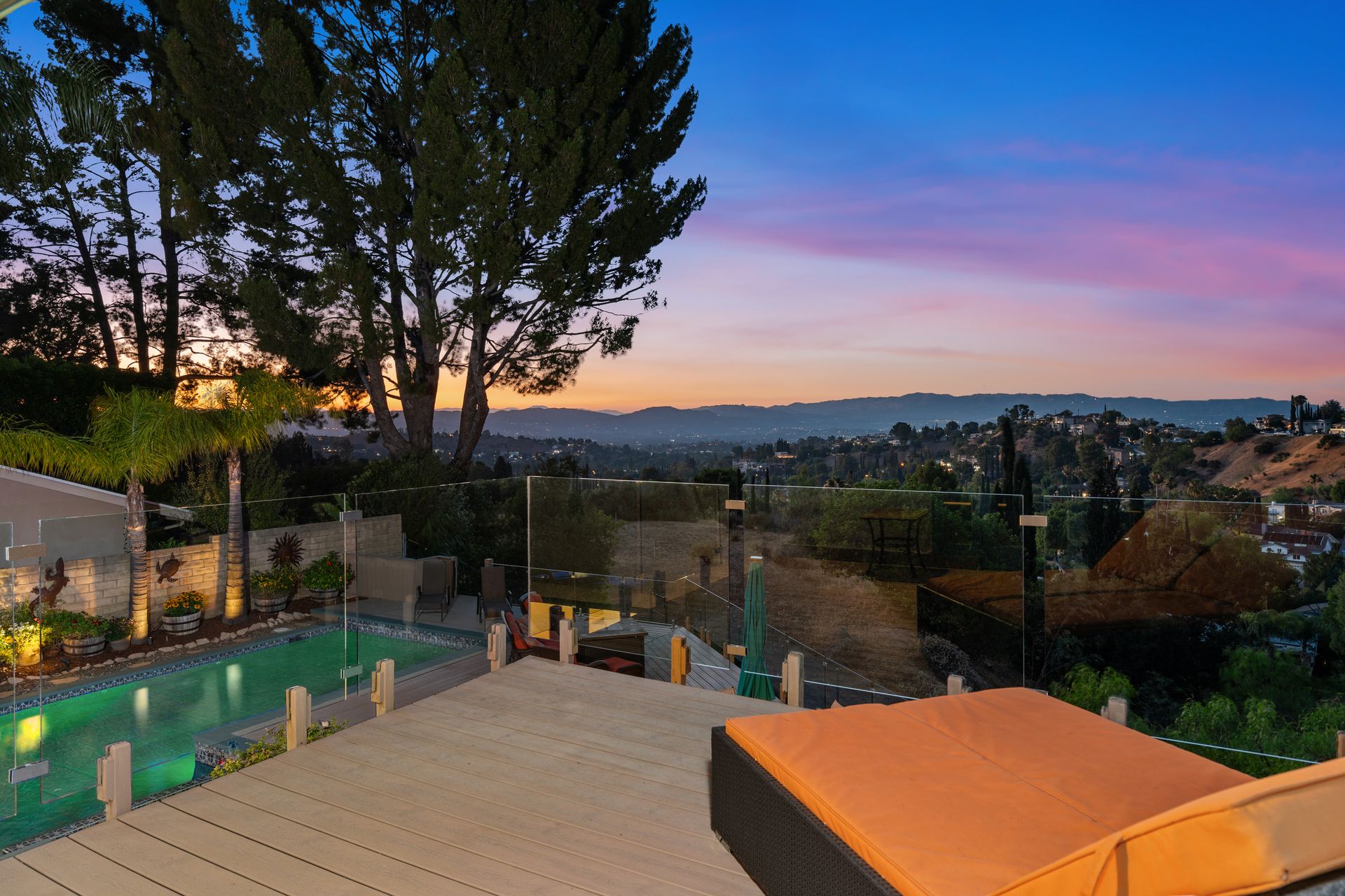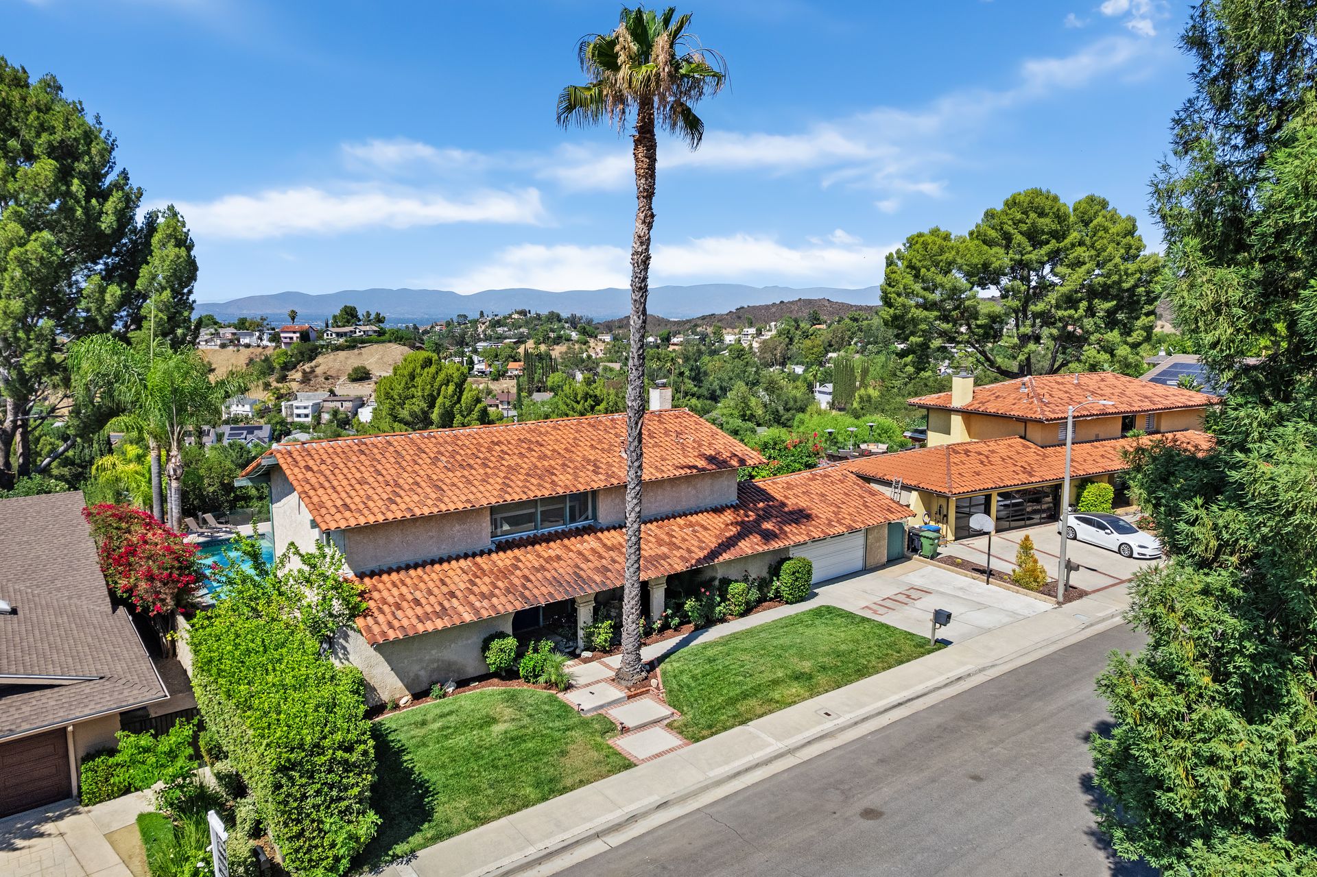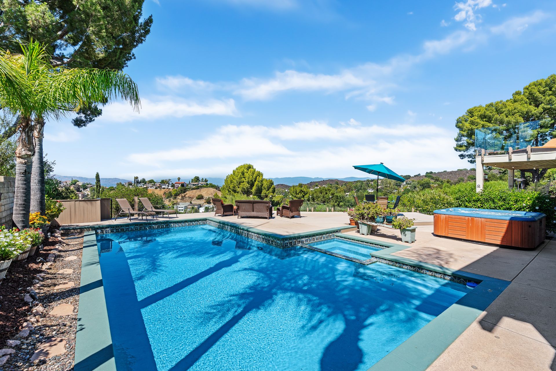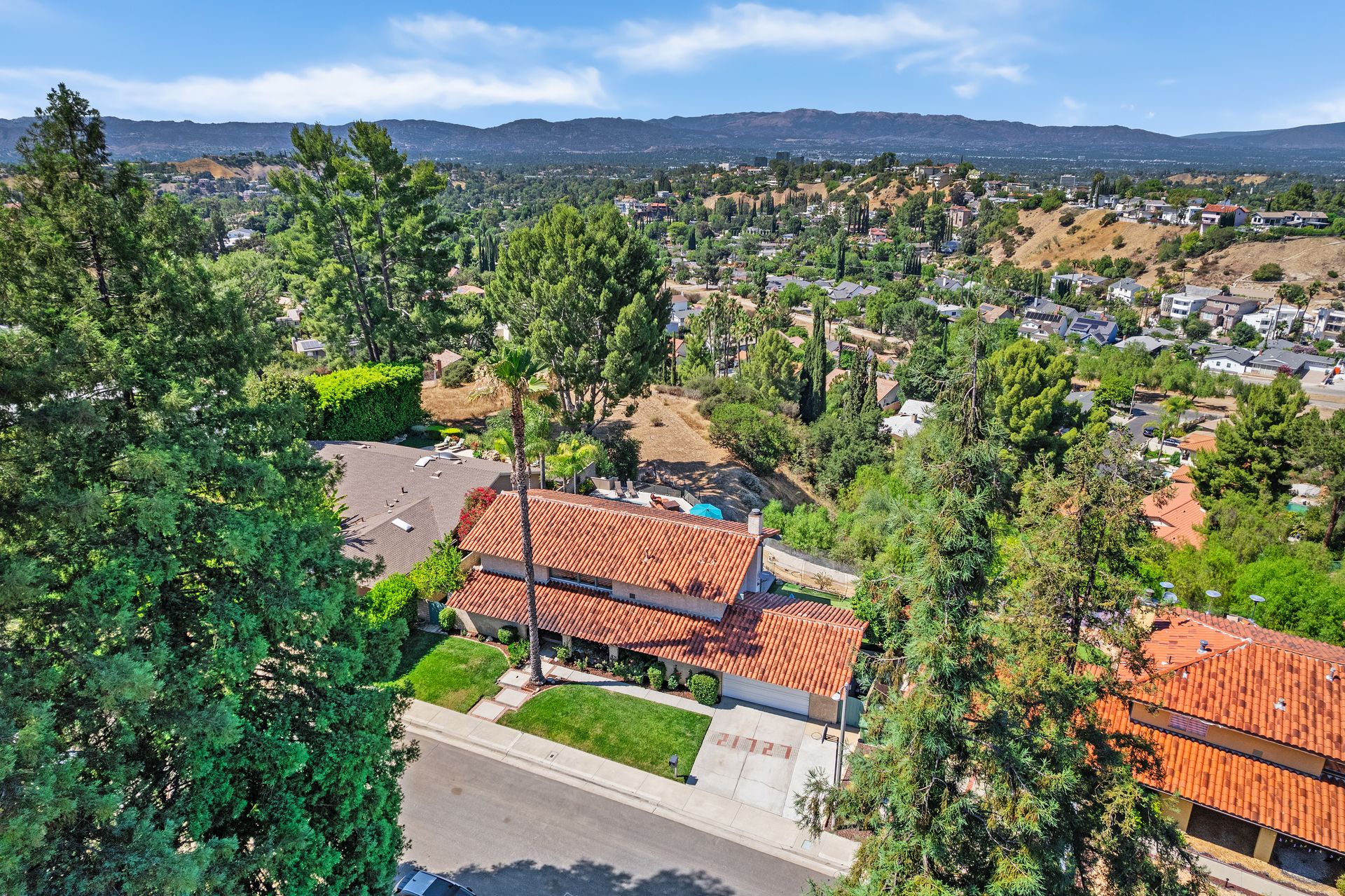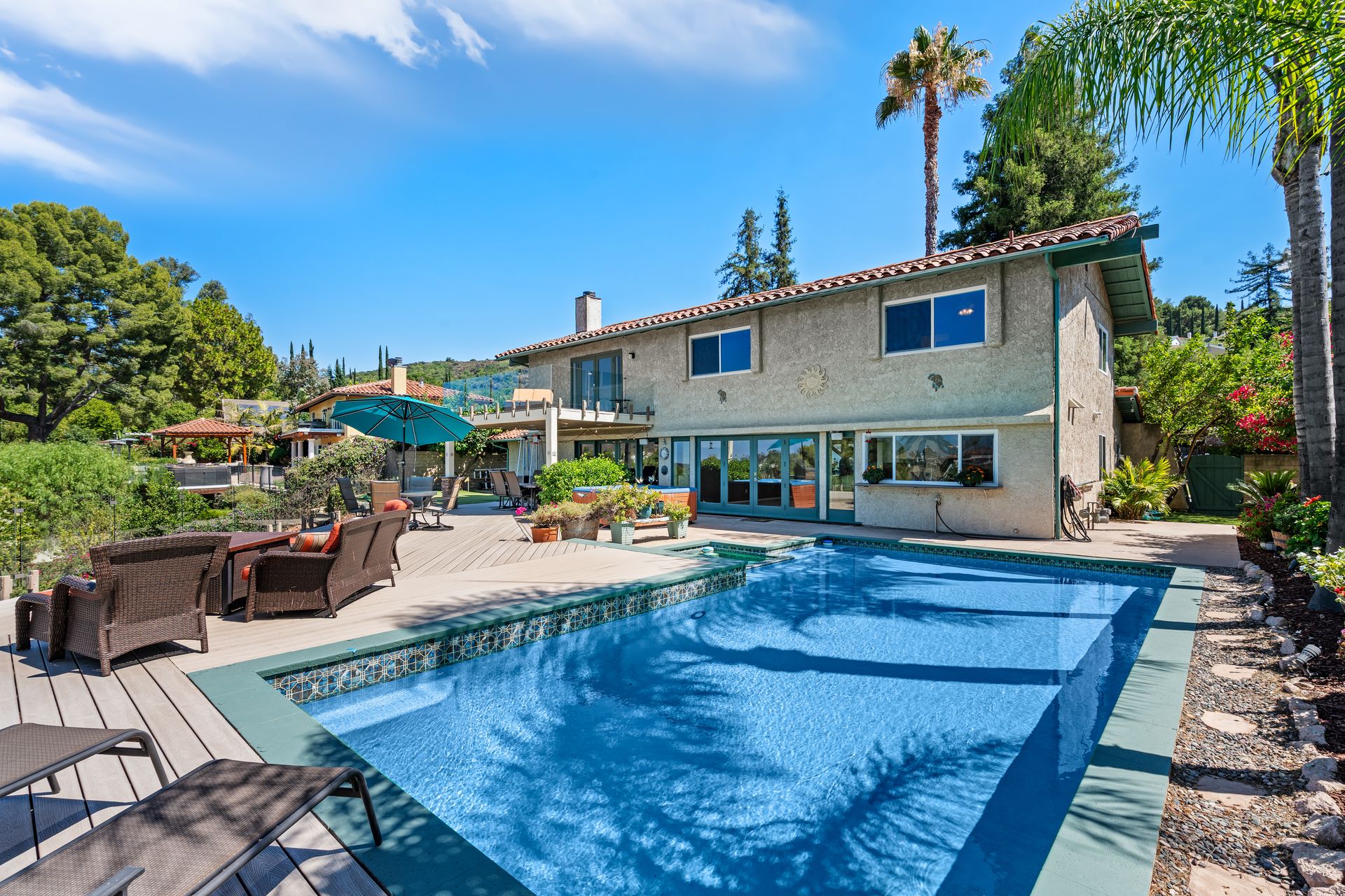 Huge price adjustment! This exceptional VIEW home is in Woodland Crest, a hidden gem nestled within the serene Santa Monica Mountains. The charming covered porch and beautifully landscaped dry creek enhance the curb appeal of this elegant Spanish-style residence. Enter through the double doors and be instantly drawn to a wall of glass that frames an unforgettable view, effortlessly blending indoor comfort with natural beauty. Designed for both intimate gatherings and grand celebrations, this home has been the setting for countless cherished memories. The renovated chef's kitchen is a true showpiece, featuring top-of-the-line Jenn-Air appliances, including a six-burner range with griddle, wine refrigerator, custom cabinetry, Quartzite countertops, a tumbled tile backsplash, and breakfast bar. The expansive family room offers custom-built-ins and a dramatic stone fireplace with a raised hearth ideal for cozy evenings. The primary suite is a private retreat with soaring vaulted ceilings, ample closet space, an updated bathroom with dual vanities, and a private balcony ideal for watching the sunrise and sunset. Two-story windows flood the home with natural light, creating an open and airy atmosphere throughout. Outside, the entertainer's backyard is a dream come true, complete with a covered patio, sparkling pool, putting green, and citrus trees. Host unforgettable gatherings on the massive Trex deck while taking in breathtaking city and mountain views. With the Los Angeles Rams' new training facility and the ambitious Warner Center 2035 Plan on the horizon, Woodland Hills is poised for exciting growth and transformation. Close proximity to luxury shopping, the beach, and exceptional schools makes this home not only a sanctuary but a smart investment in your future.