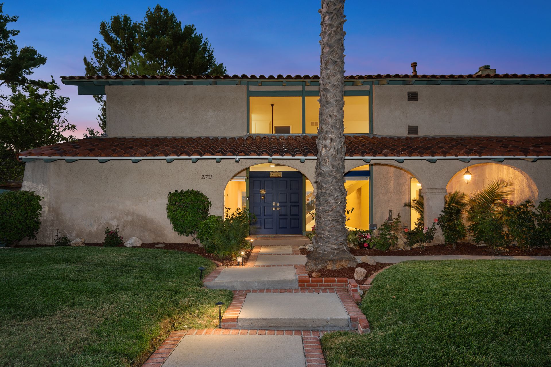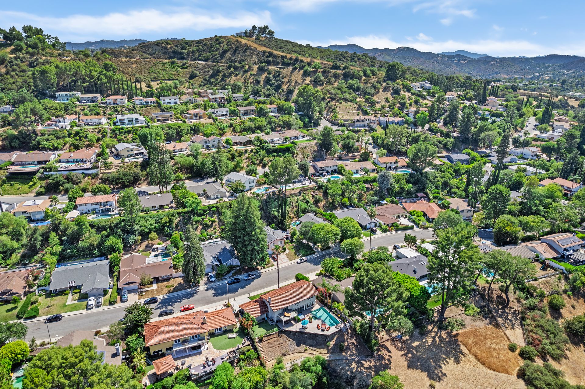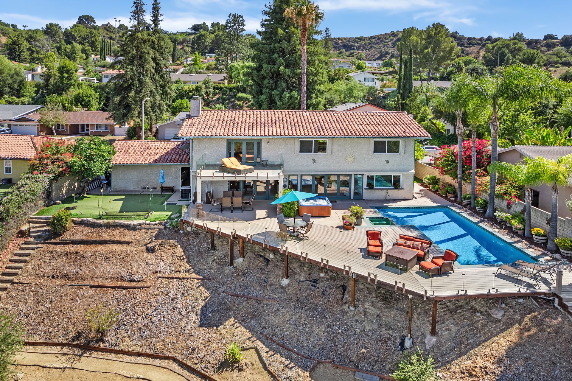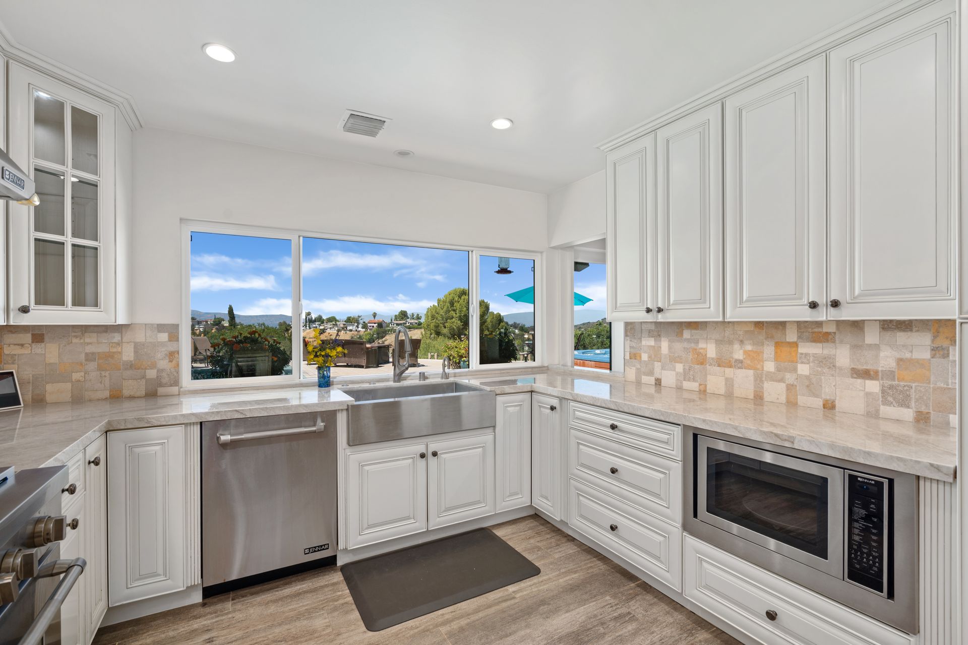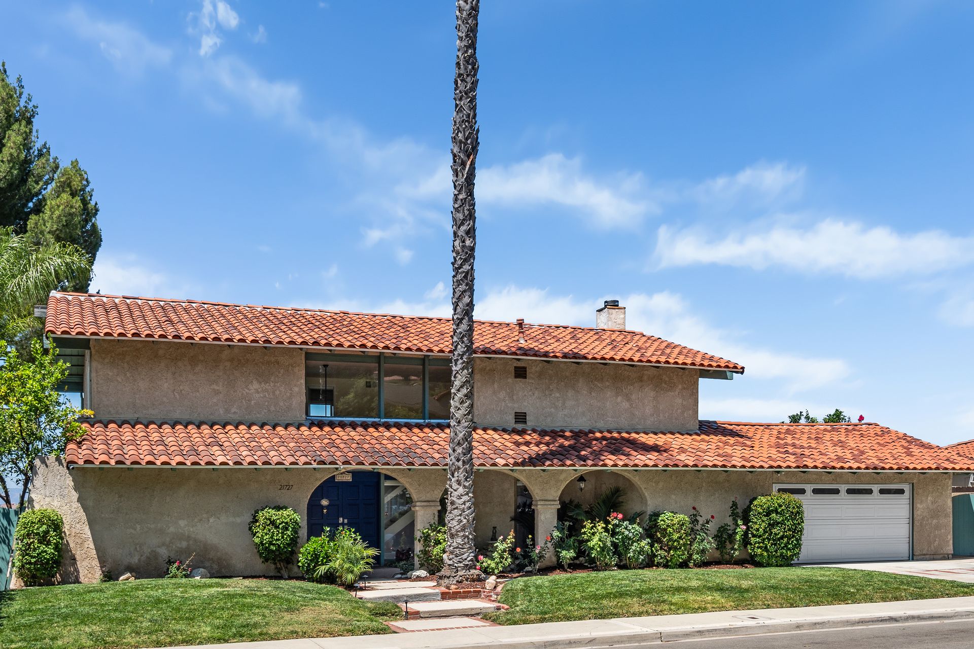 Huge price adjustment! This exceptional VIEW home is in Woodland Crest, a hidden gem nestled within the serene Santa Monica Mountains. The charming covered porch and beautifully landscaped dry creek enhance the curb appeal of this elegant Spanish-style residence. Enter through the double doors and be instantly drawn to a wall of glass that frames an unforgettable view, effortlessly blending indoor comfort with natural beauty. Designed for both intimate gatherings and grand celebrations, this home has been the setting for countless cherished memories. The renovated chef's kitchen is a true showpiece, featuring top-of-the-line Jenn-Air appliances, including a six-burner range with griddle, wine refrigerator, custom cabinetry, Quartzite countertops, a tumbled tile backsplash, and breakfast bar. The expansive family room offers custom-built-ins and a dramatic stone fireplace with a raised hearth ideal for cozy evenings. The primary suite is a private retreat with soaring vaulted ceilings, ample closet space, an updated bathroom with dual vanities, and a private balcony ideal for watching the sunrise and sunset. Two-story windows flood the home with natural light, creating an open and airy atmosphere throughout. Outside, the entertainer's backyard is a dream come true, complete with a covered patio, sparkling pool, putting green, and citrus trees. Host unforgettable gatherings on the massive Trex deck while taking in breathtaking city and mountain views. With the Los Angeles Rams' new training facility and the ambitious Warner Center 2035 Plan on the horizon, Woodland Hills is poised for exciting growth and transformation. Close proximity to luxury shopping, the beach, and exceptional schools makes this home not only a sanctuary but a smart investment in your future.