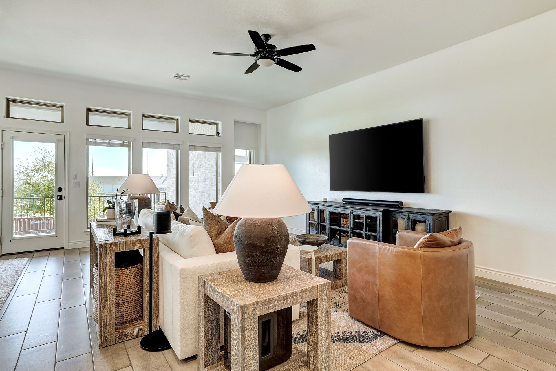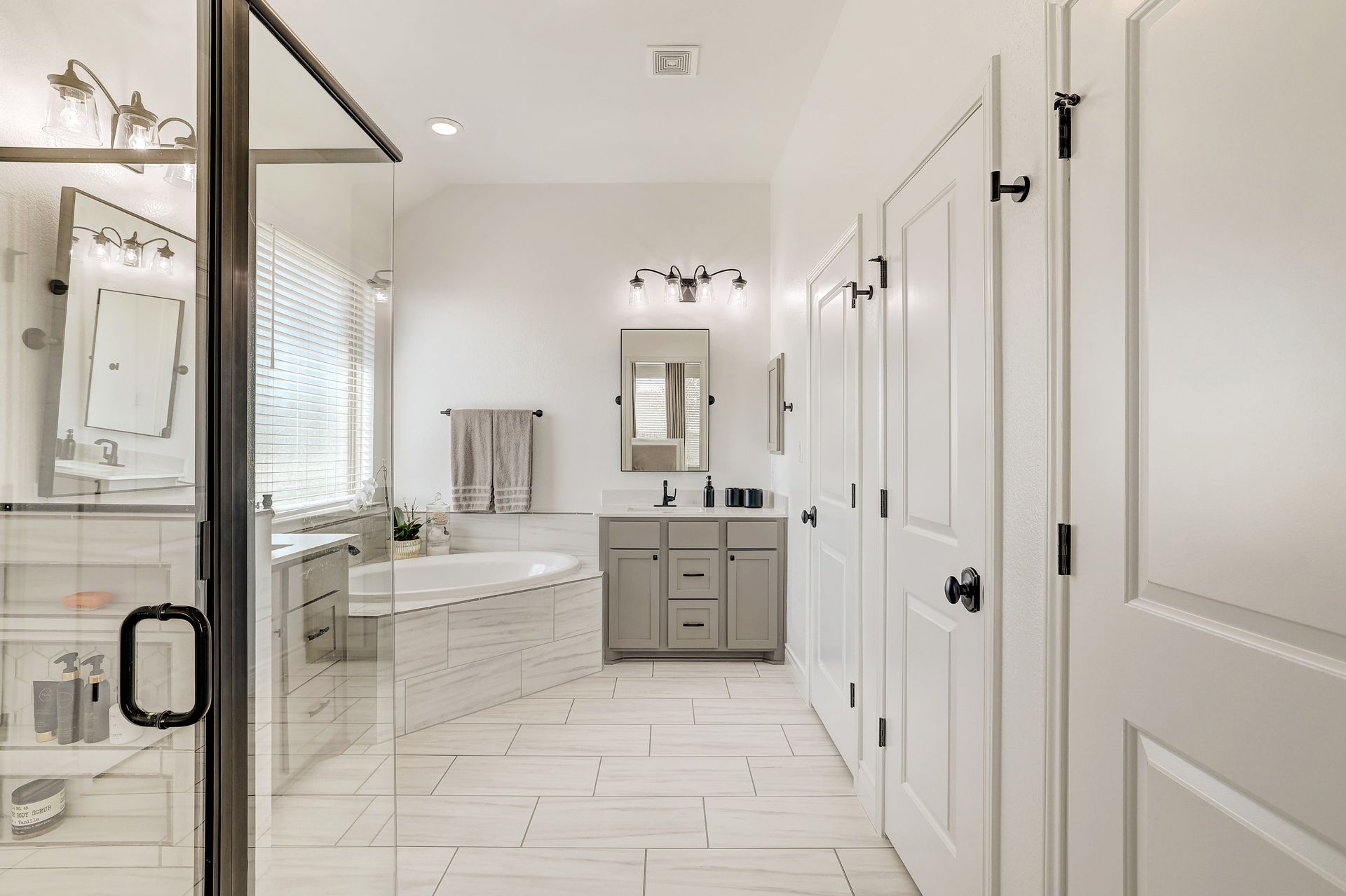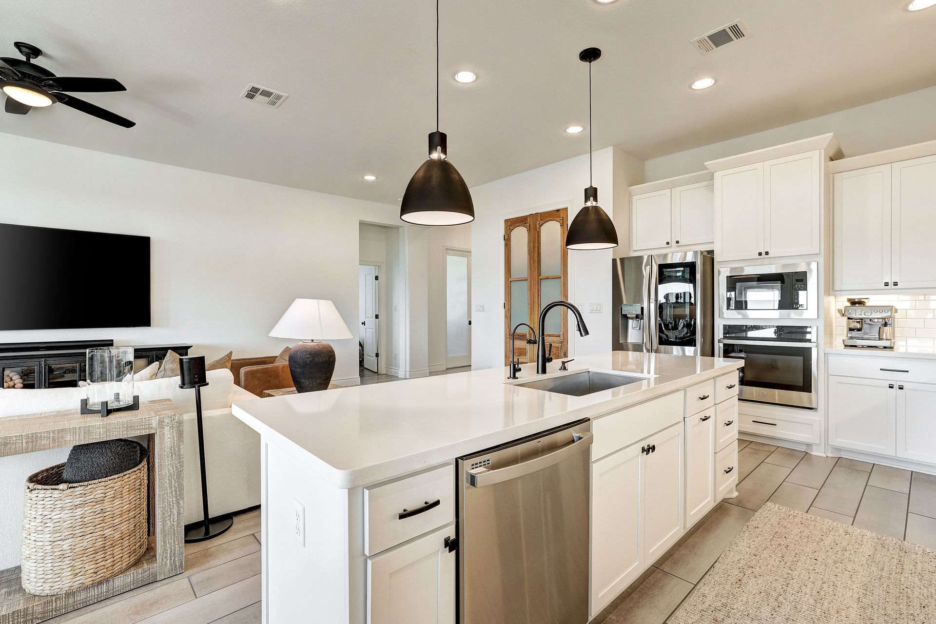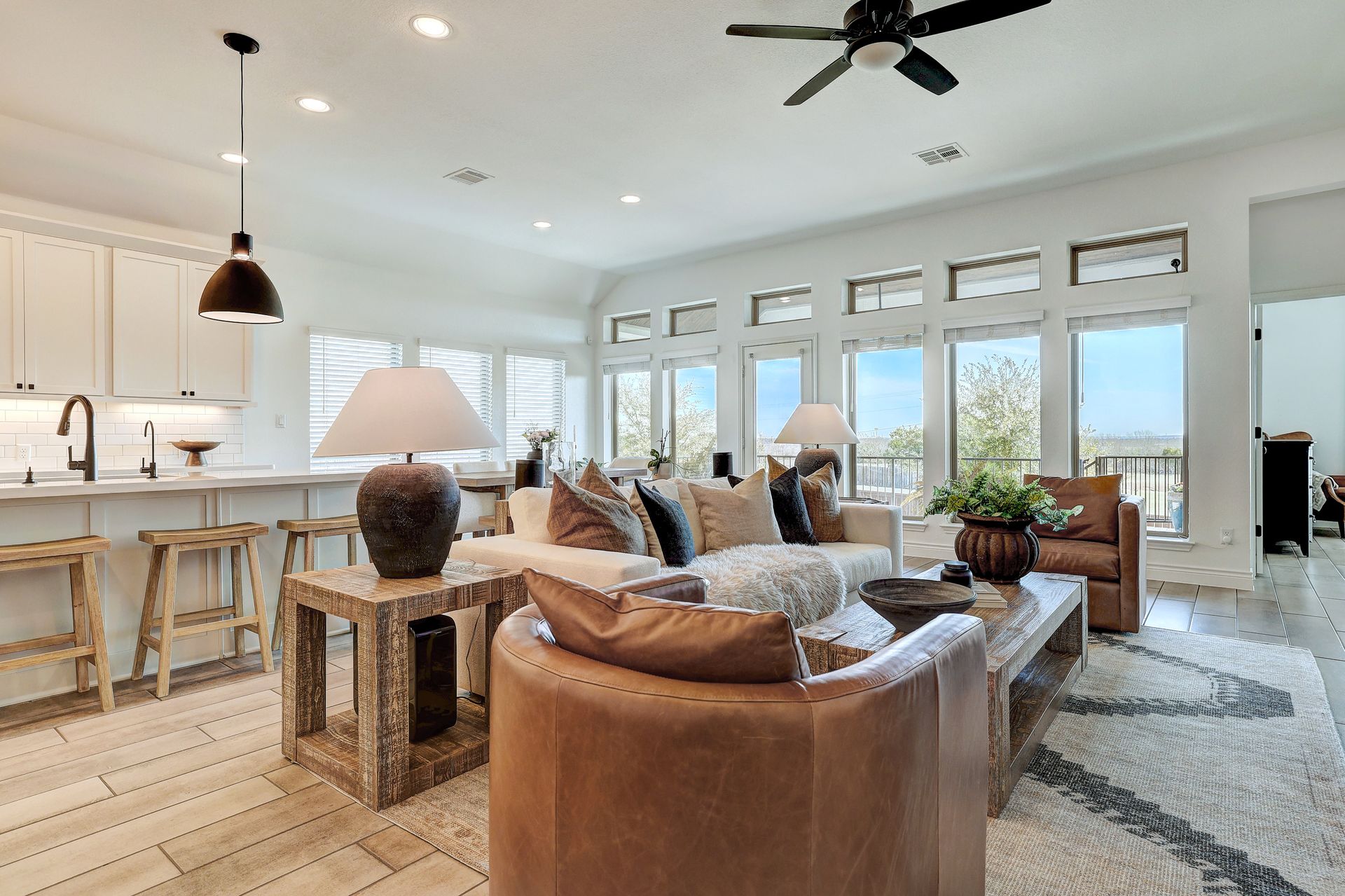 Durable wood-look tile flooring spans the entire home, providing both beauty and practicality. The kitchen is further enhanced with undermount lighting, great for meal preparation. Additional features include a water softener, custom shower niches in all bathrooms, a fully floored attic space, two-inch faux wood blinds, glass break sensors on the windows and permanent LED exterior lighting.