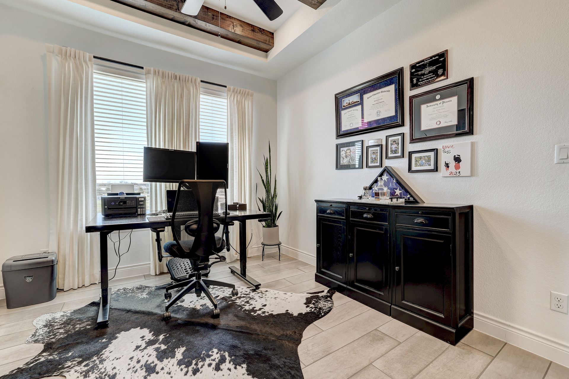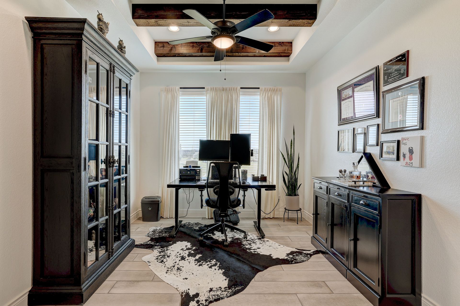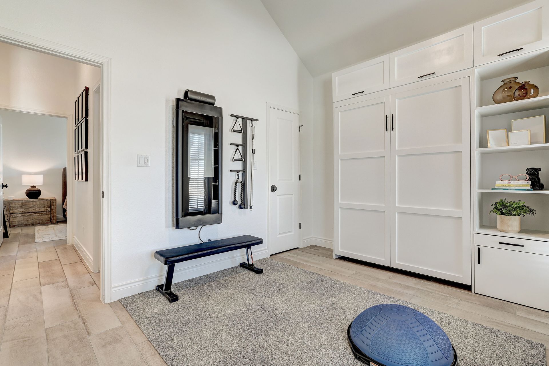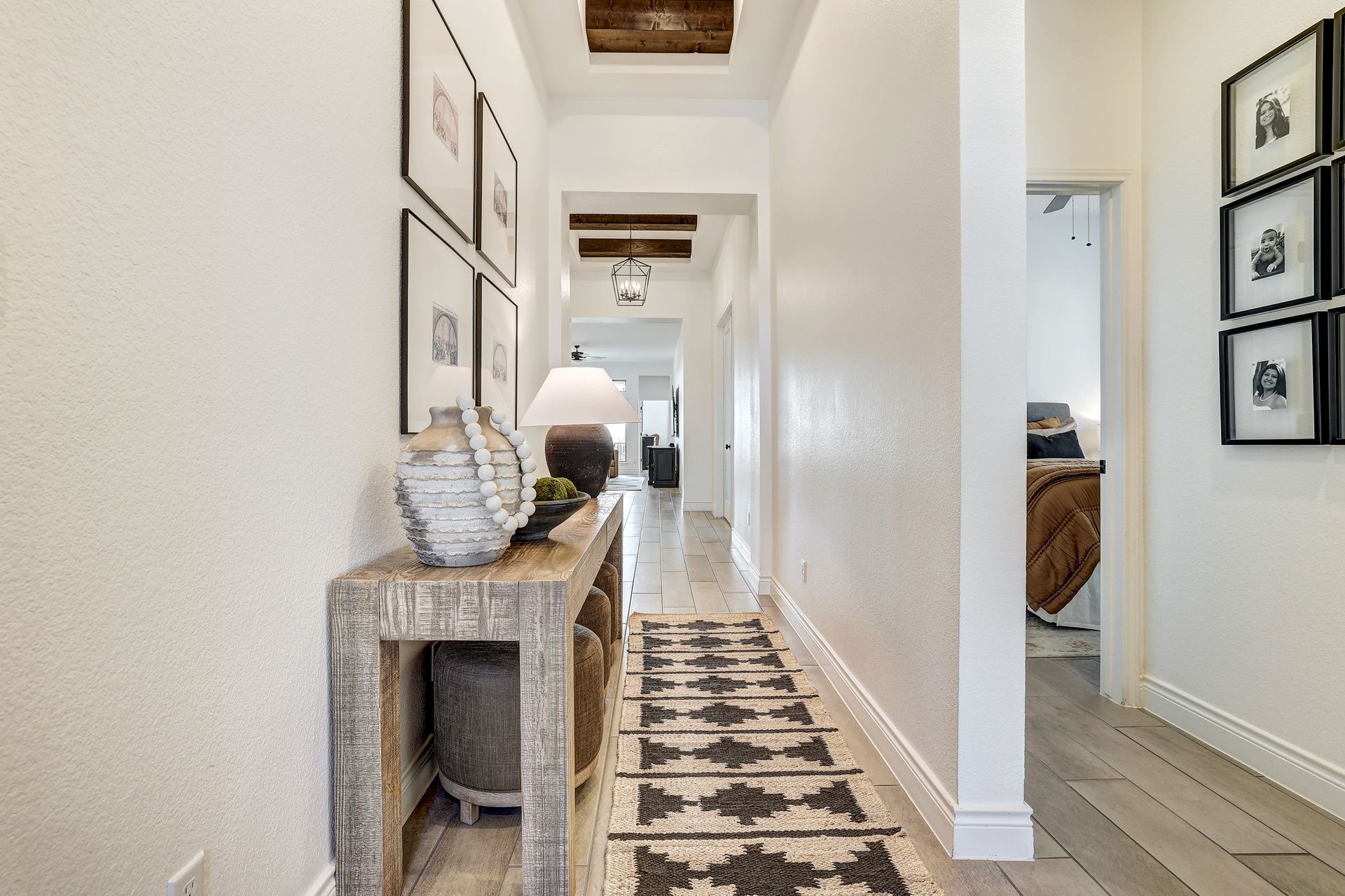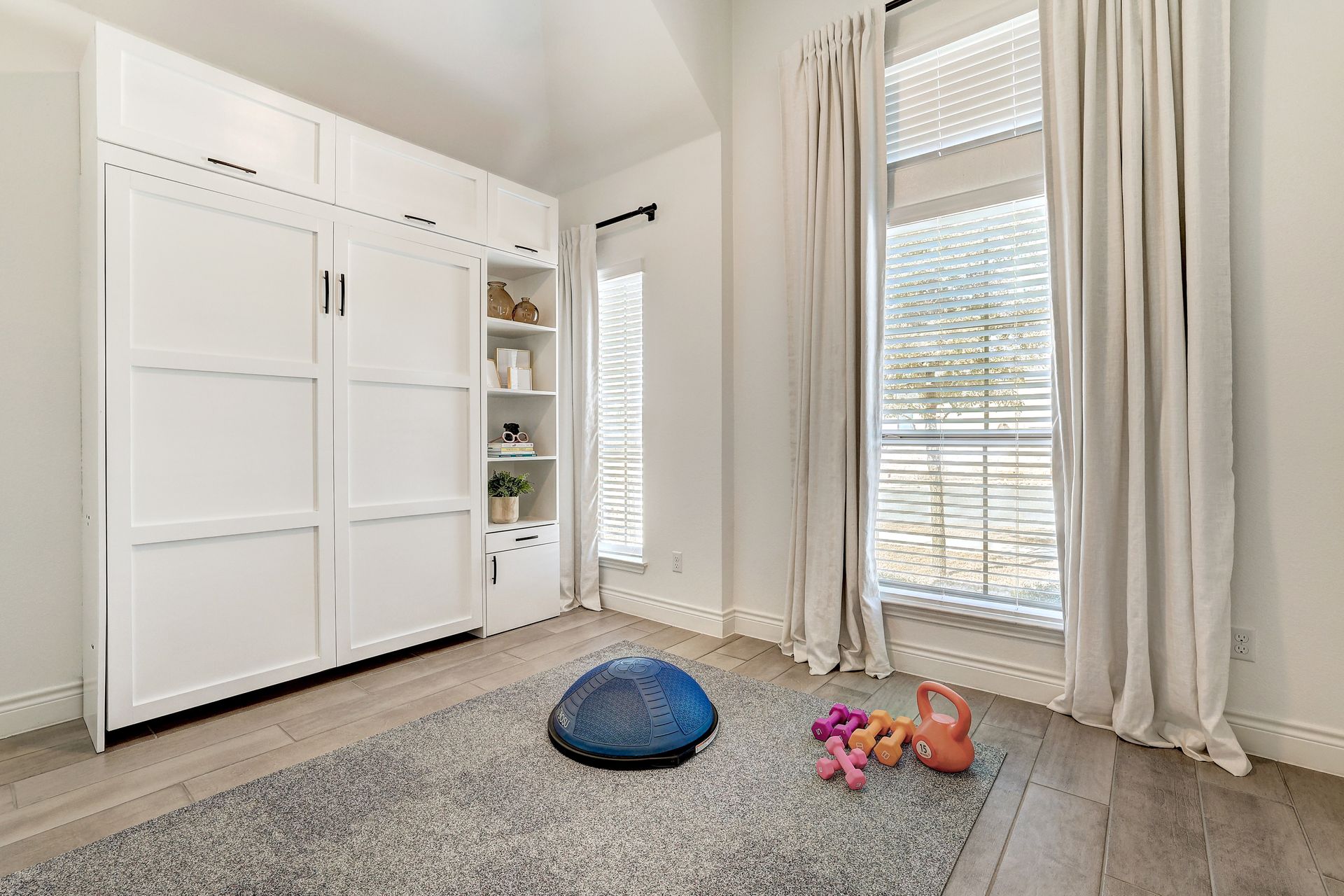 The entrance features elegant wood ceiling beams, adding a touch of rustic charm. One of the bedrooms features a versatile Murphy bed and custom closet organization. In addition, all the closets in the house have custom organization, maximizing space and convenience. Tray ceilings, ceiling fans and upgraded fixtures throughout, enhancing the home's modern appeal.
