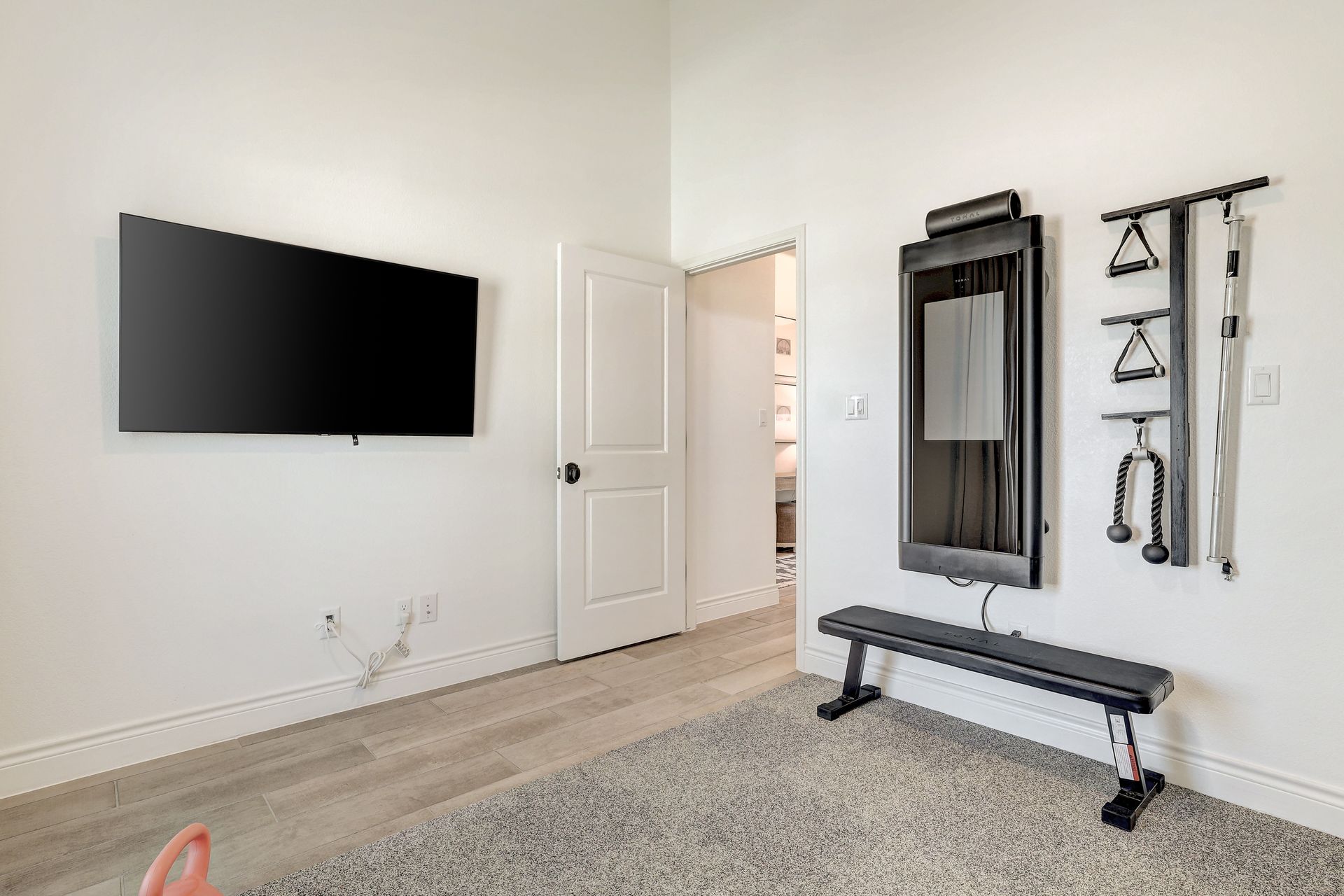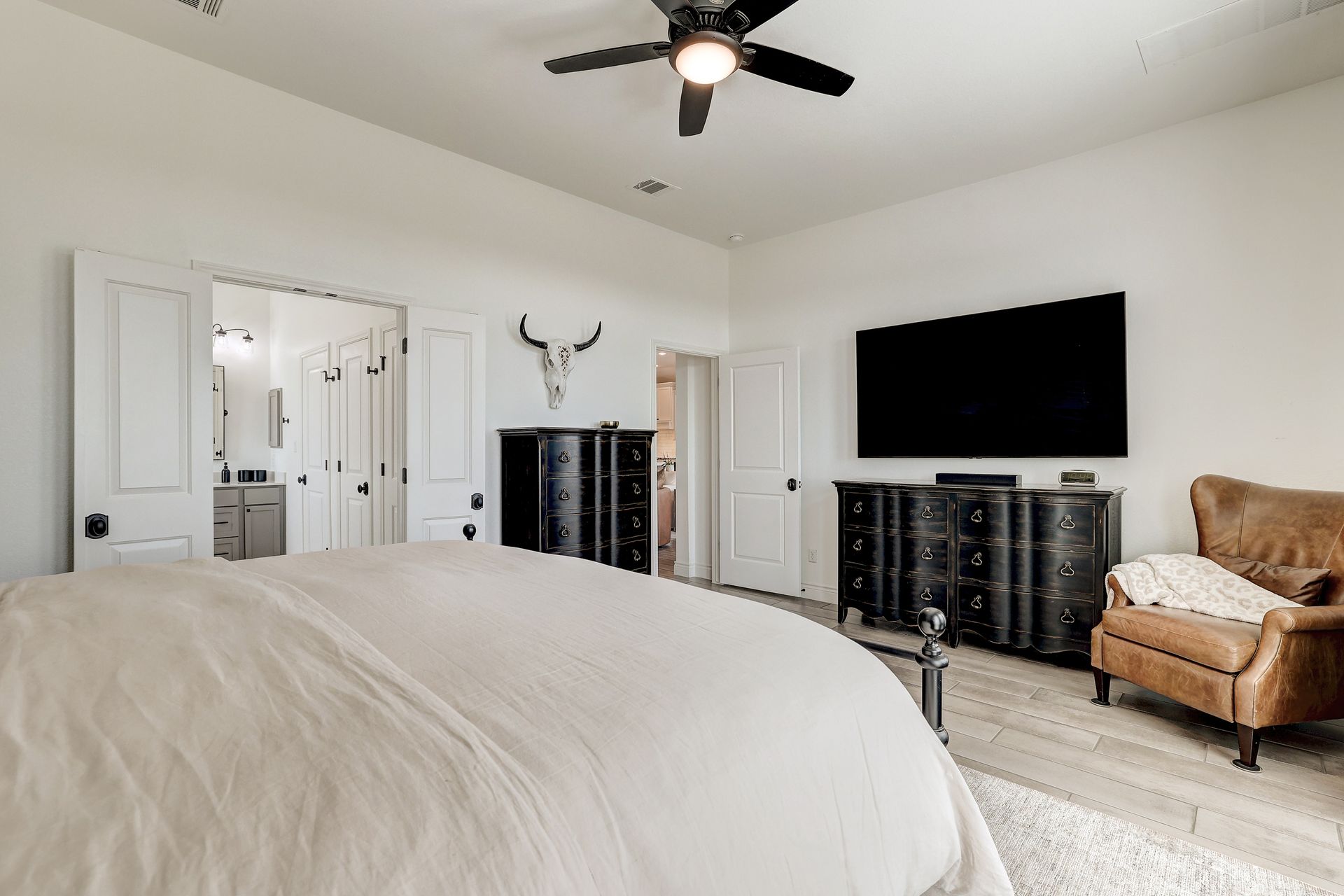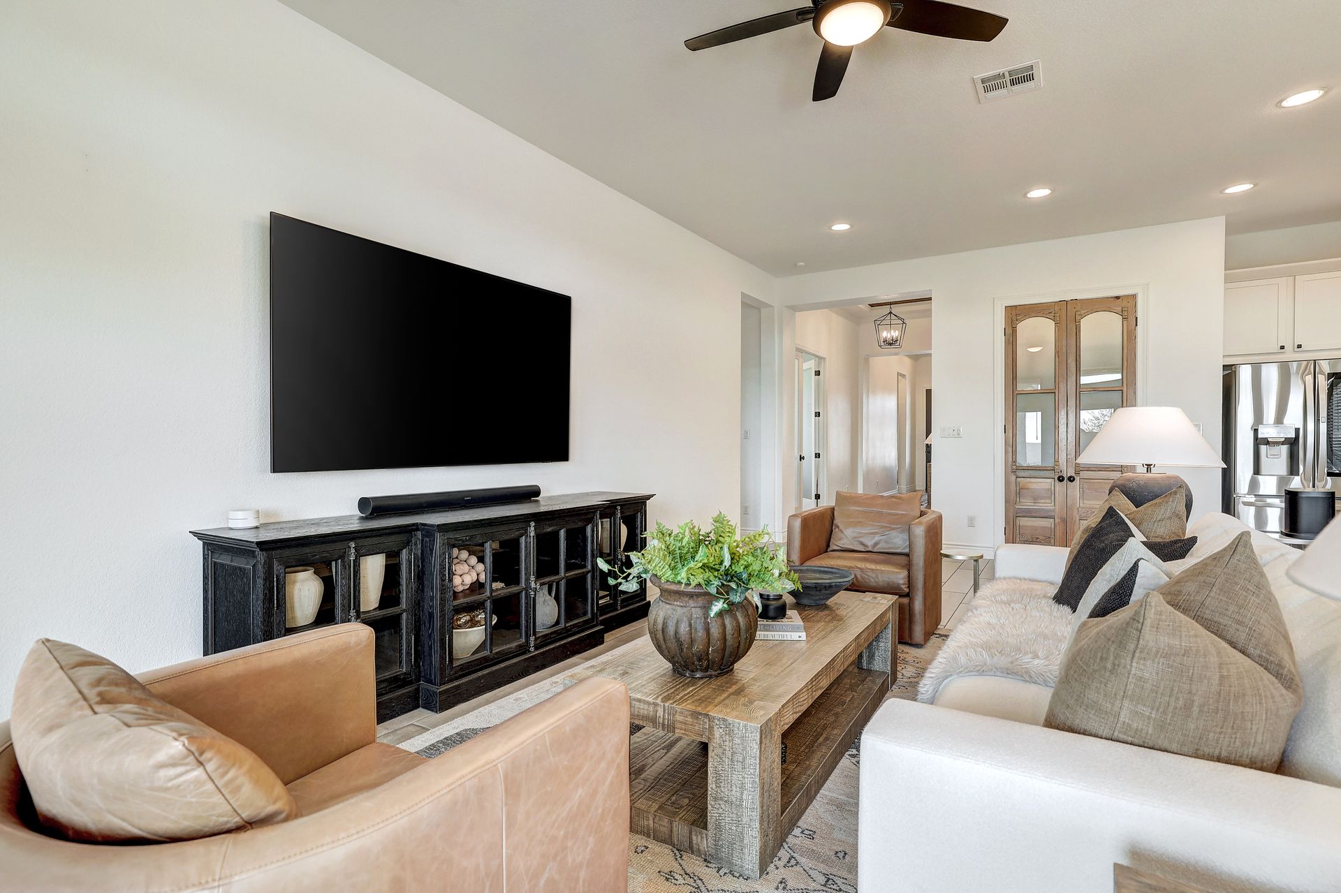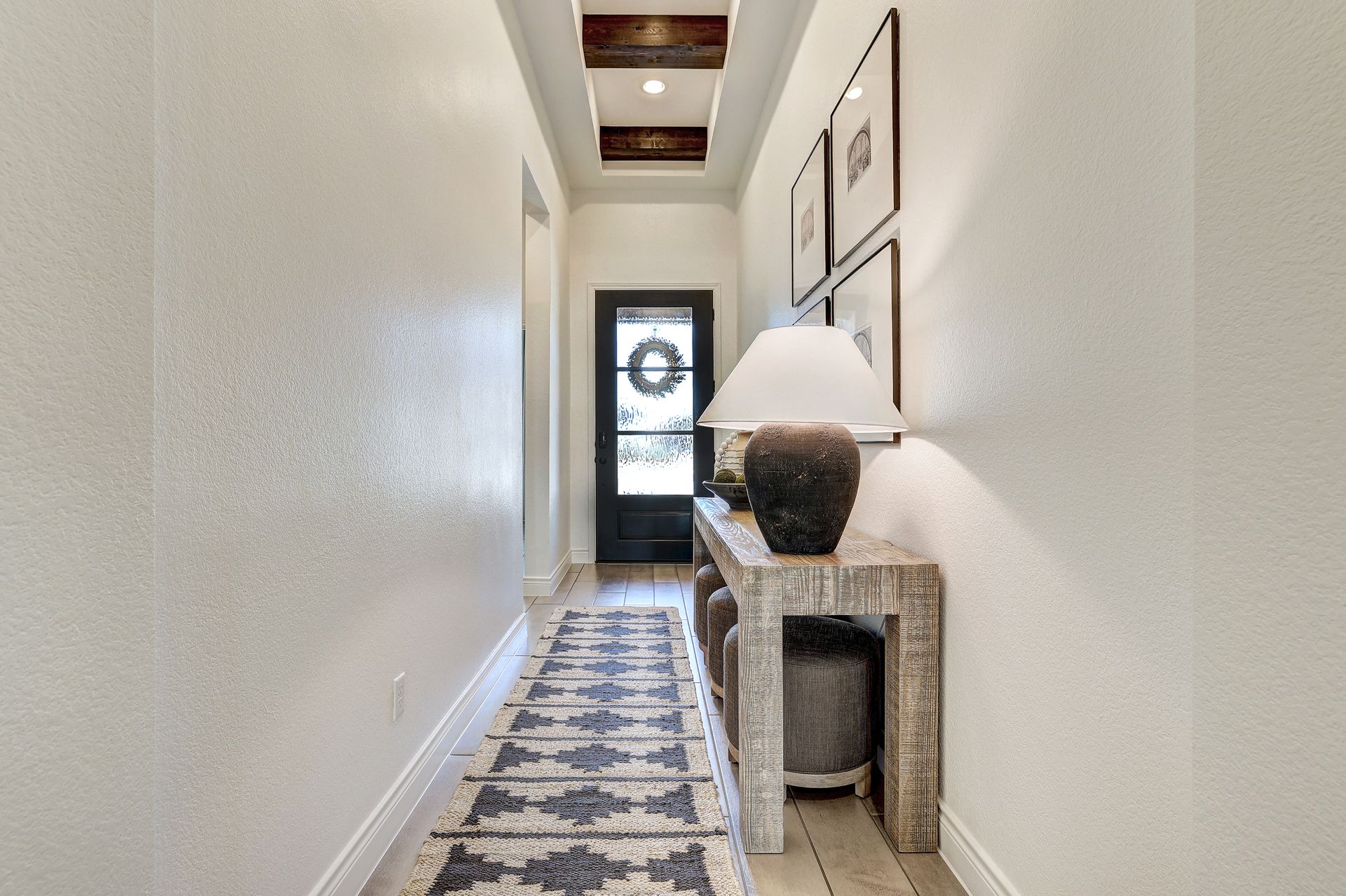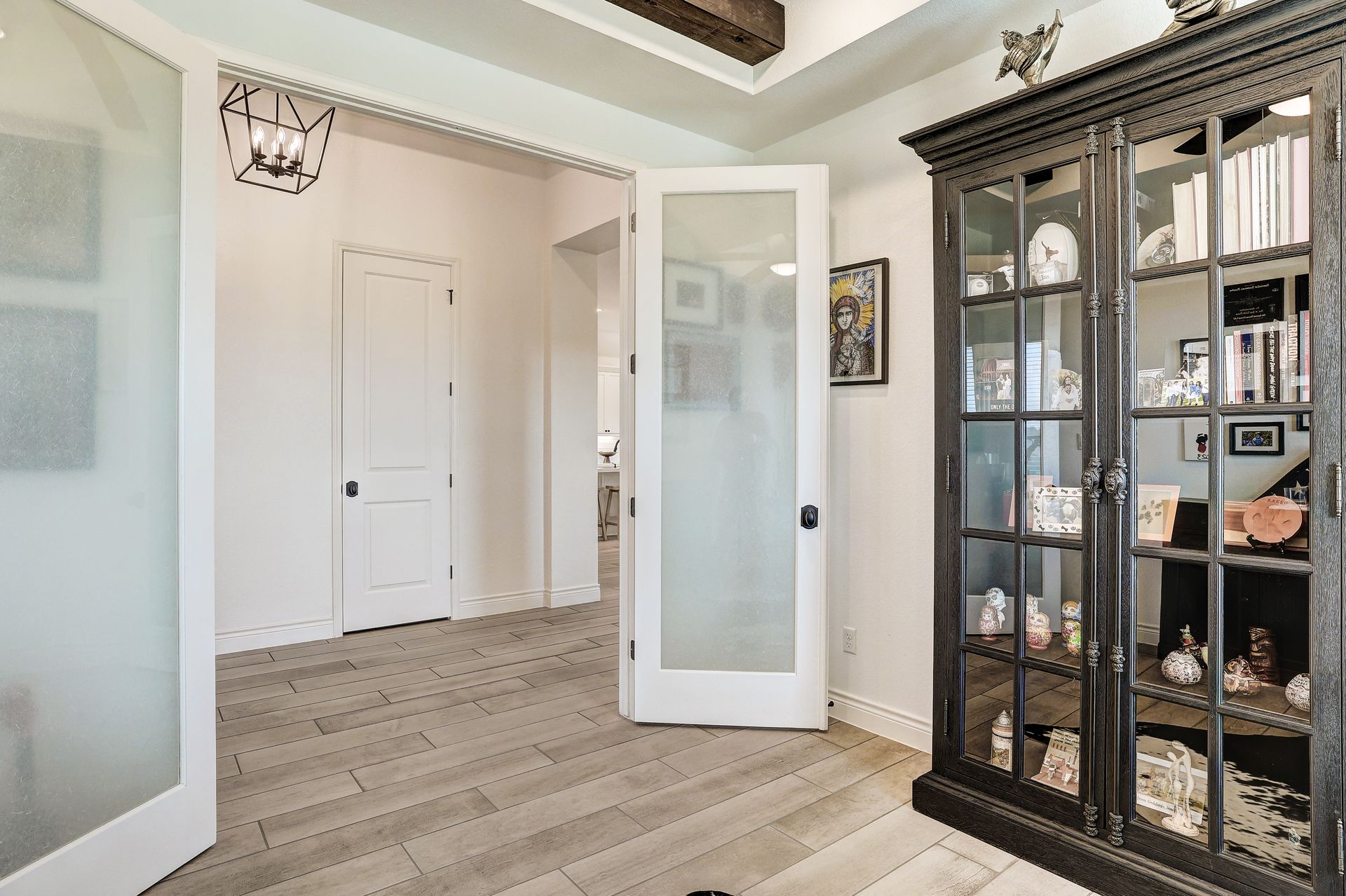The entrance features elegant wood ceiling beams, adding a touch of rustic charm. One of the bedrooms features a versatile Murphy bed and custom closet organization. In addition, all the closets in the house have custom organization, maximizing space and convenience. Tray ceilings, ceiling fans and upgraded fixtures throughout, enhancing the home's modern appeal.