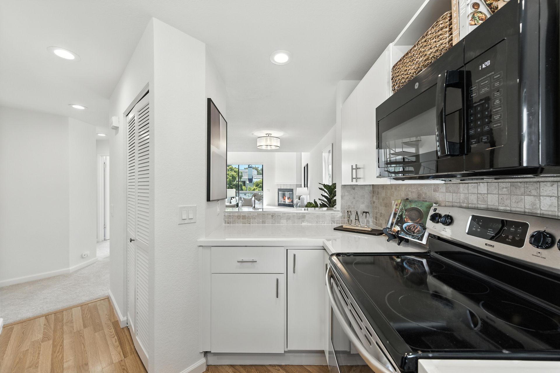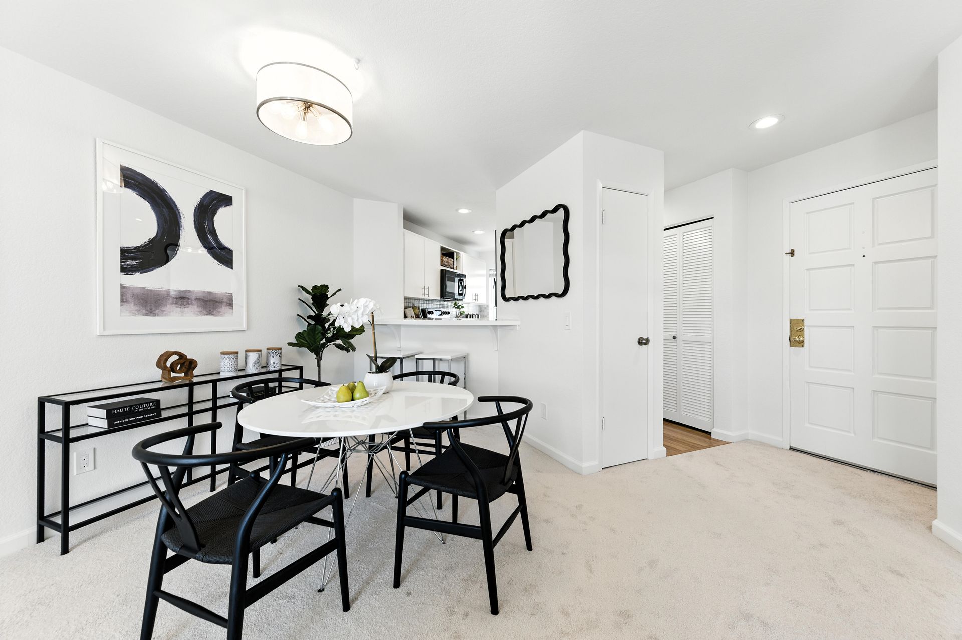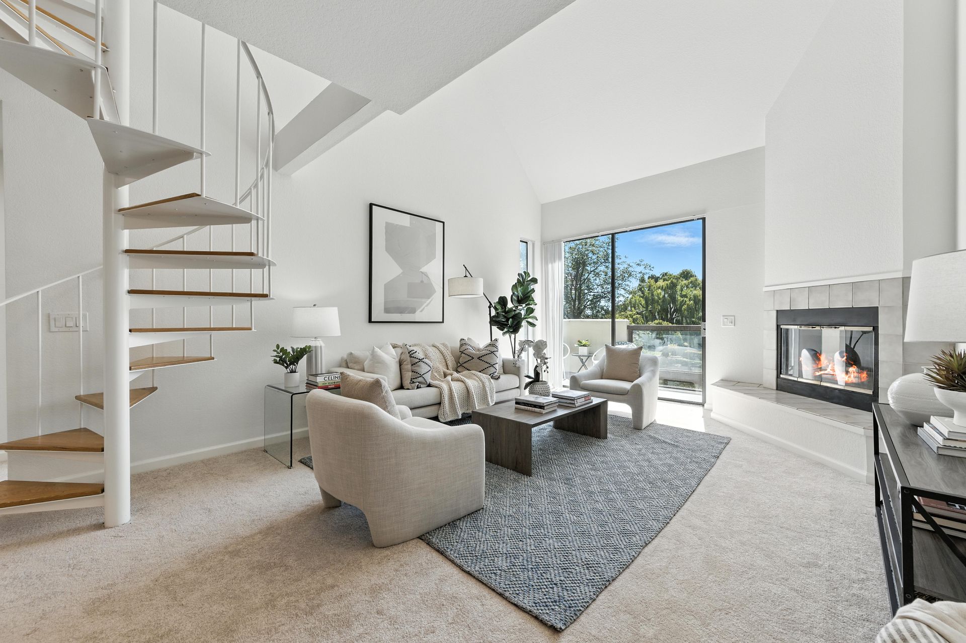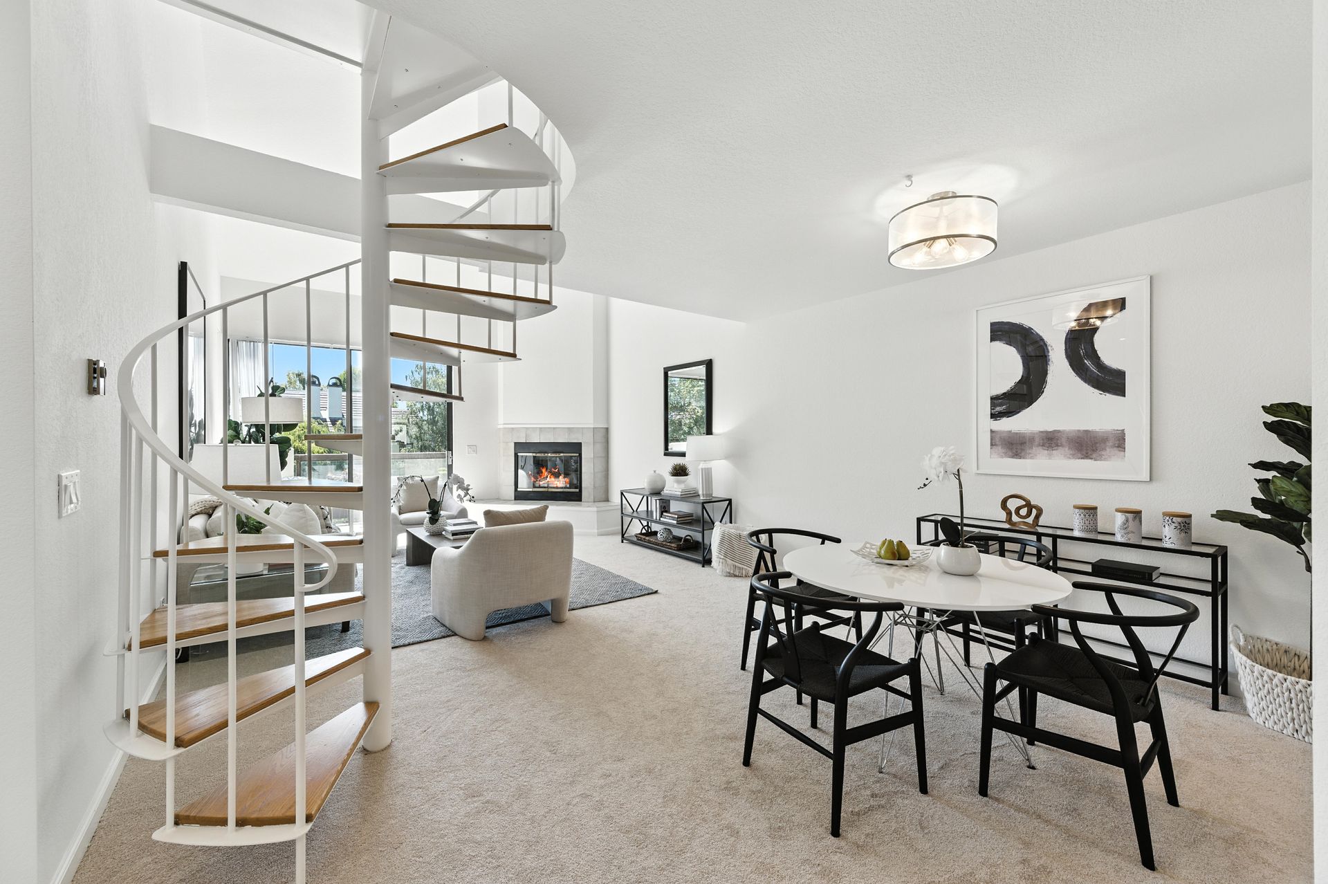 Wing it to 221 Shorebird Circle for a bird’s eye view of a willow-lined lagoon. This picturesque landscape nourishes both eye and soul and is a welcome sight from the Great Room and both bedrooms of this two-story, upper floor corner two-bedroom, two bathroom condo. Replete with lush greenery and water features, the setting creates for the occupants a sanctuary of tranquility far removed from the freeway, close to the greater Bay Area hustle and bustle.
