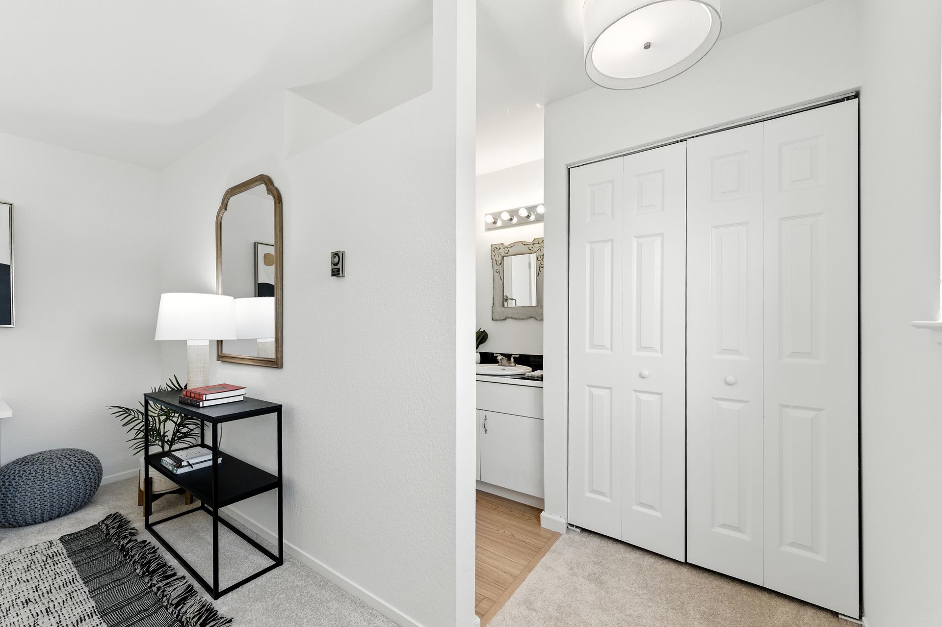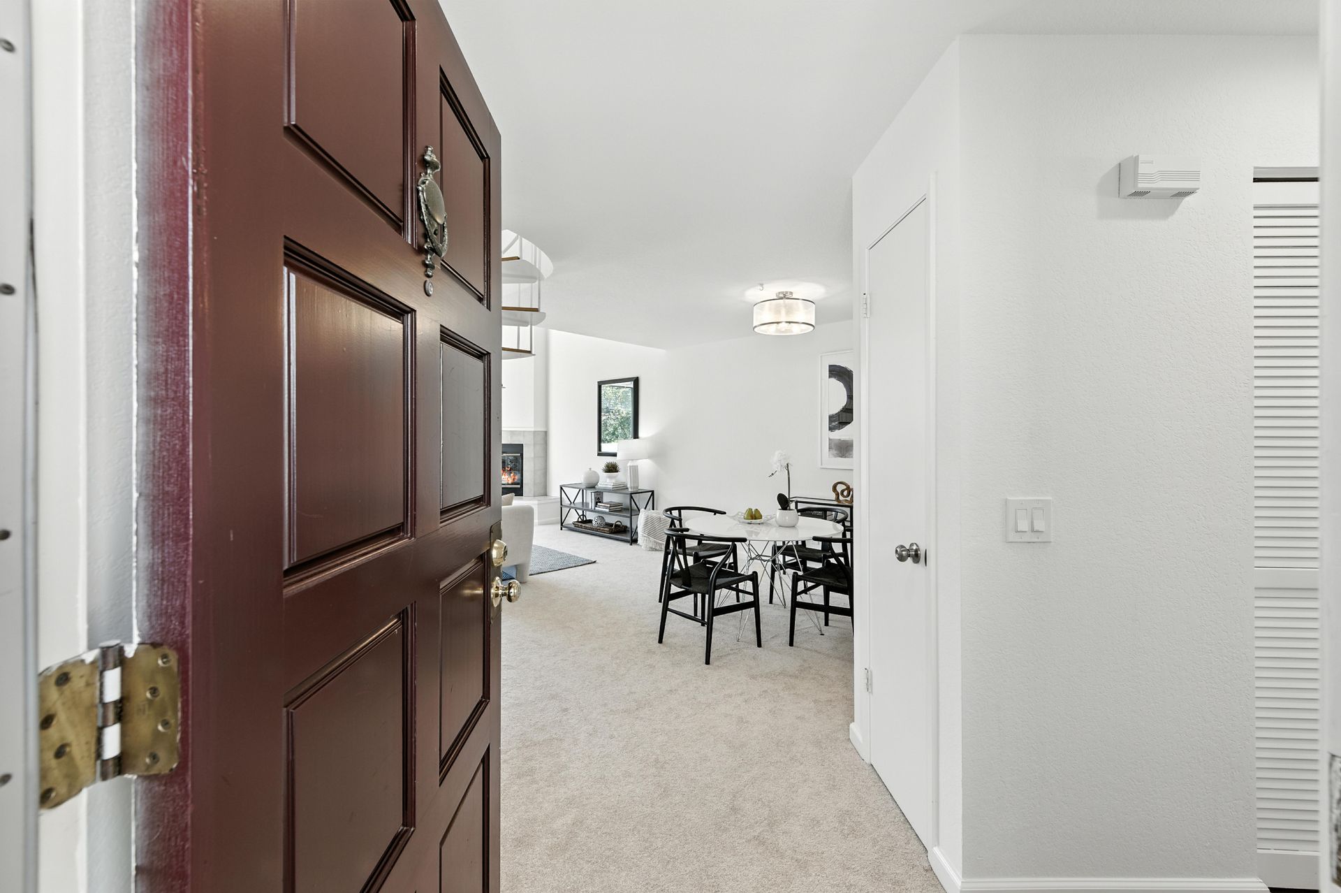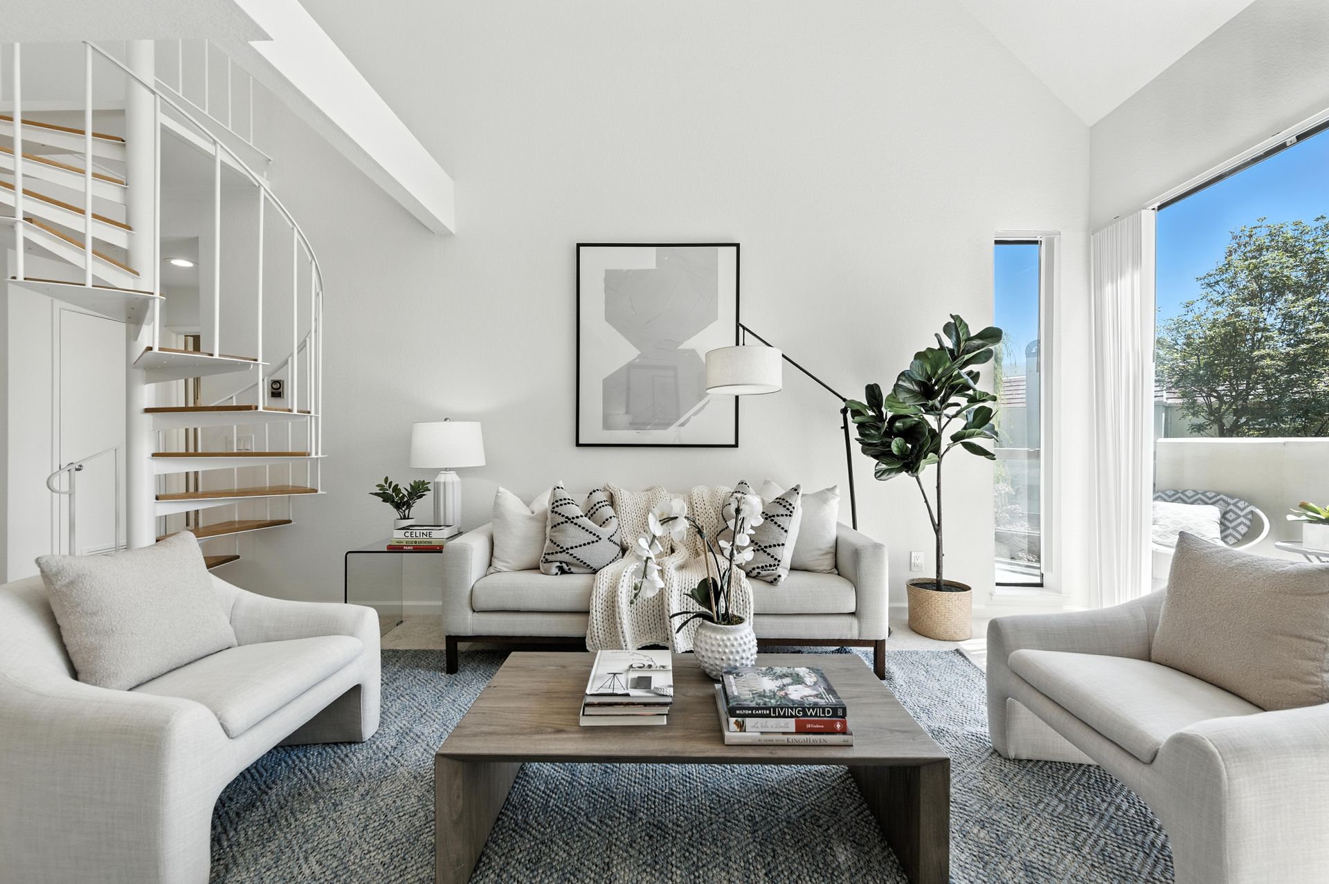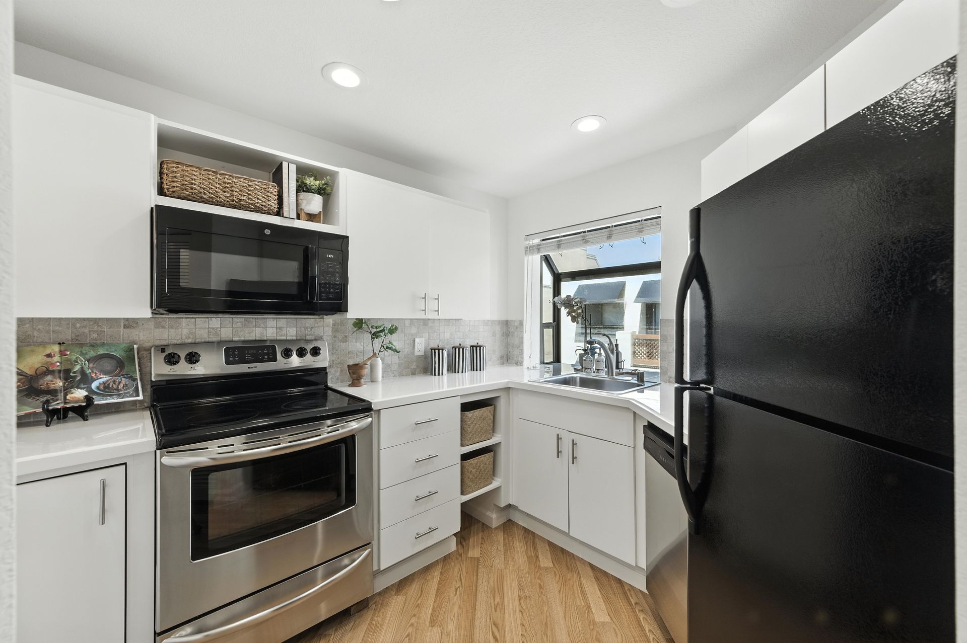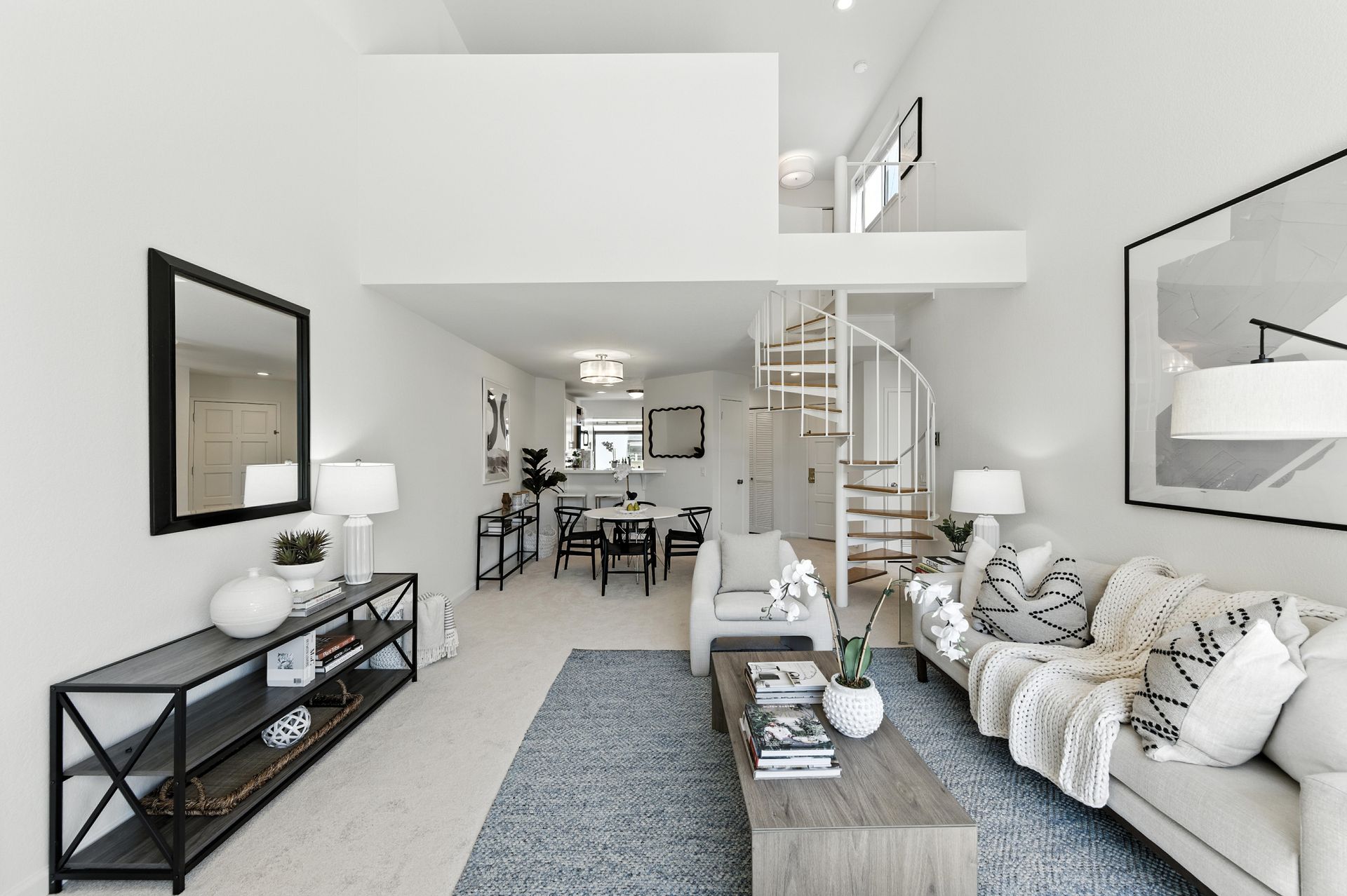 Wing it to 221 Shorebird Circle for a bird’s eye view of a willow-lined lagoon. This picturesque landscape nourishes both eye and soul and is a welcome sight from the Great Room and both bedrooms of this two-story, upper floor corner two-bedroom, two bathroom condo. Replete with lush greenery and water features, the setting creates for the occupants a sanctuary of tranquility far removed from the freeway, close to the greater Bay Area hustle and bustle.