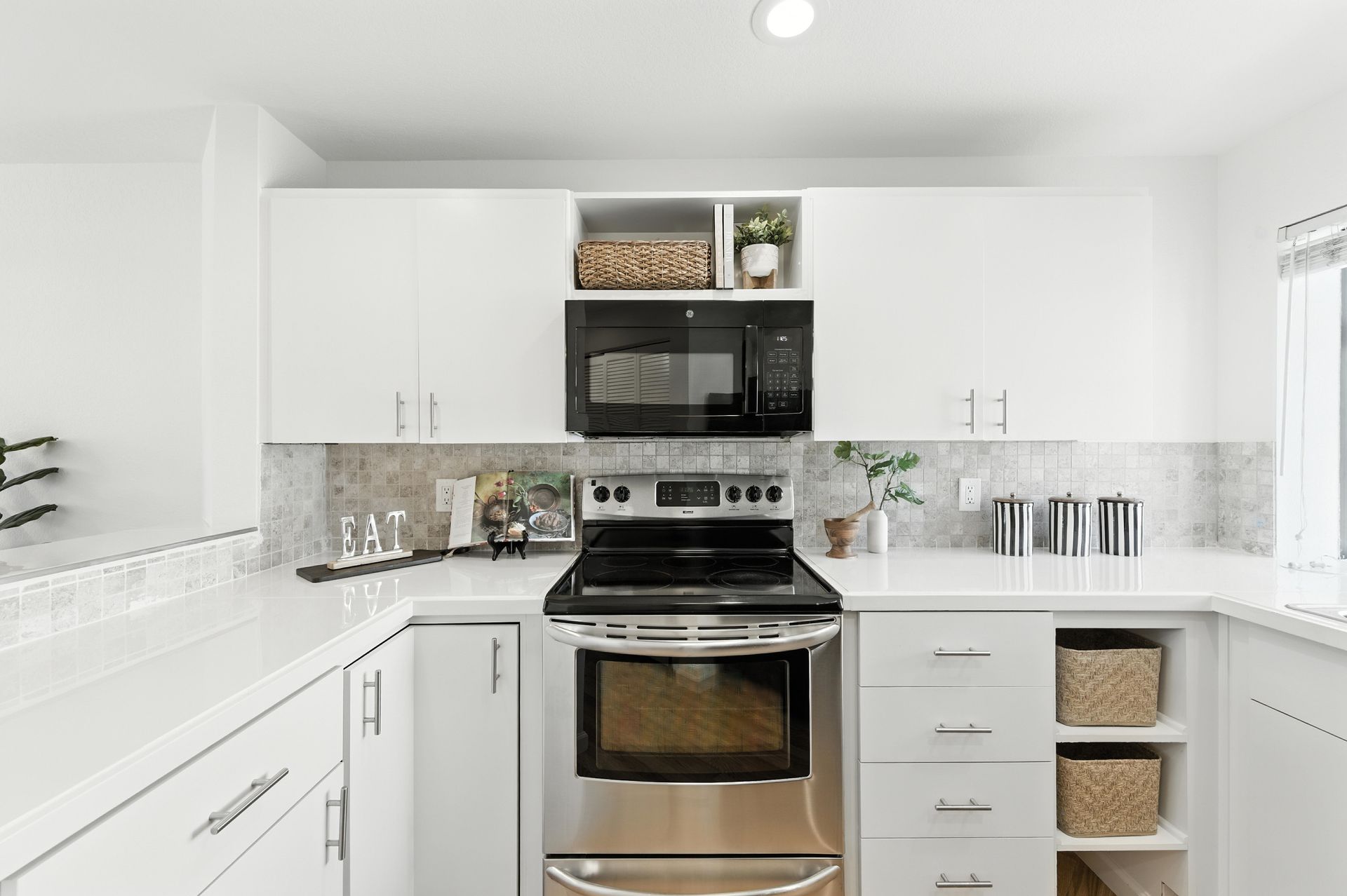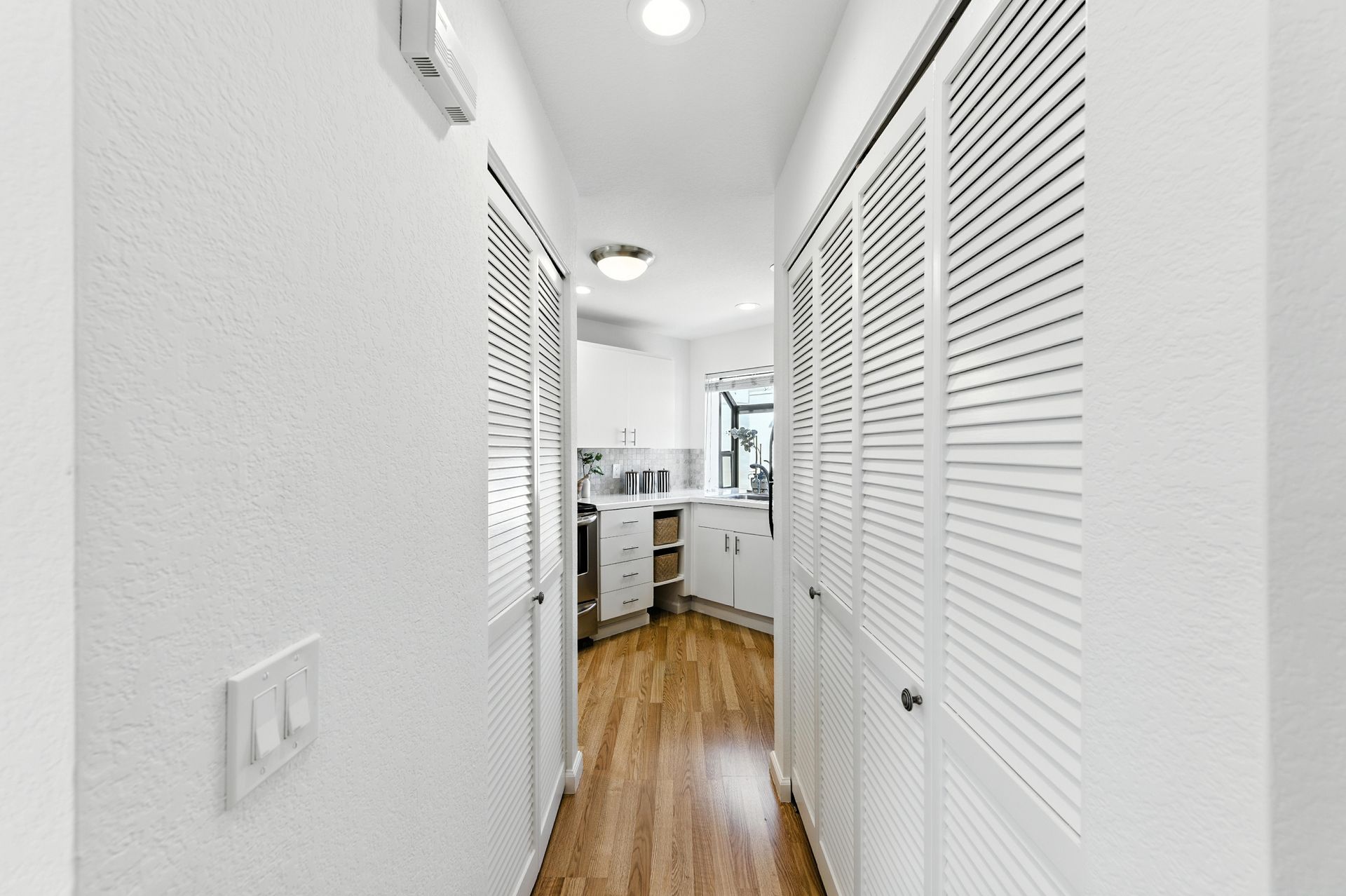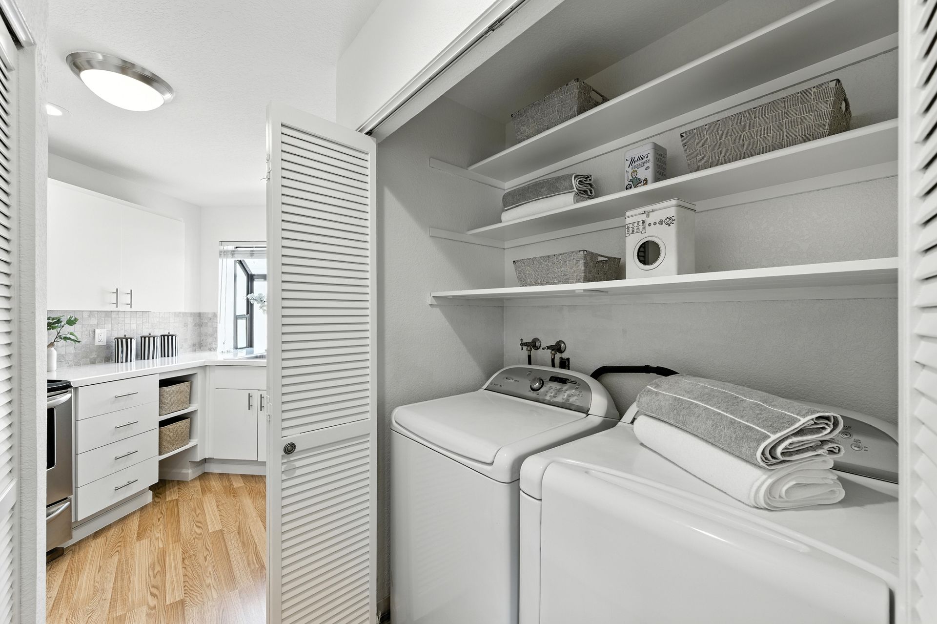 The kitchen features a front-facing over-the-sink garden window at one end and a pass-through breakfast bar at the other. Let the sunshine in. Entertaining is a breeze with the extended balcony and multiple dining spaces, In-N-Out. Leading to the kitchen is a corridor from the front entry with a spacious pantry opposite an in-unit laundry.