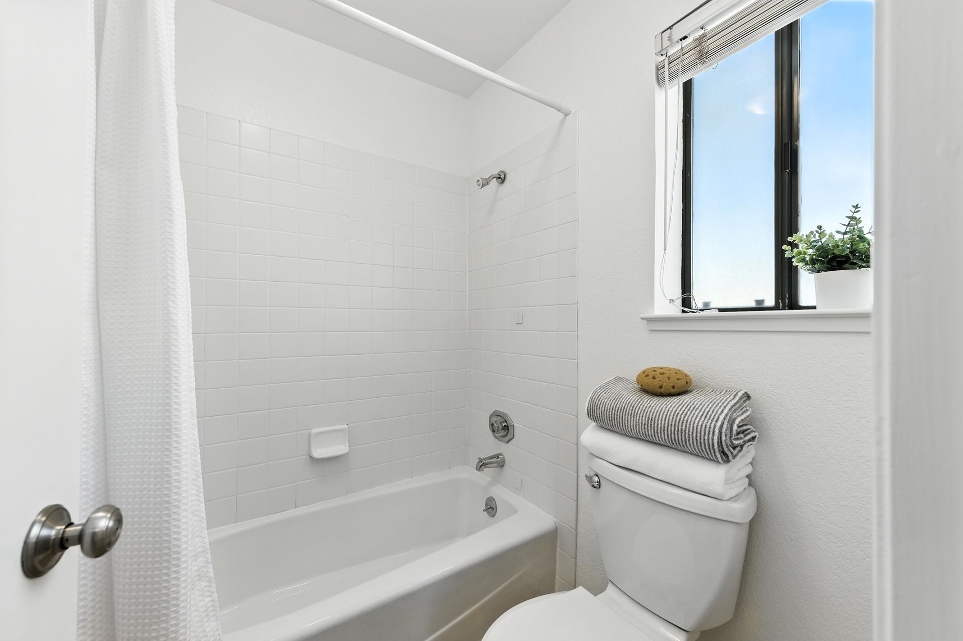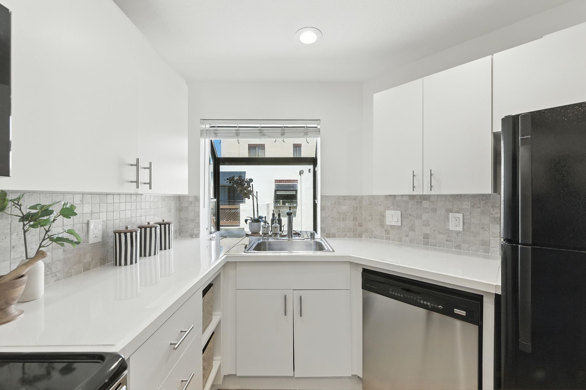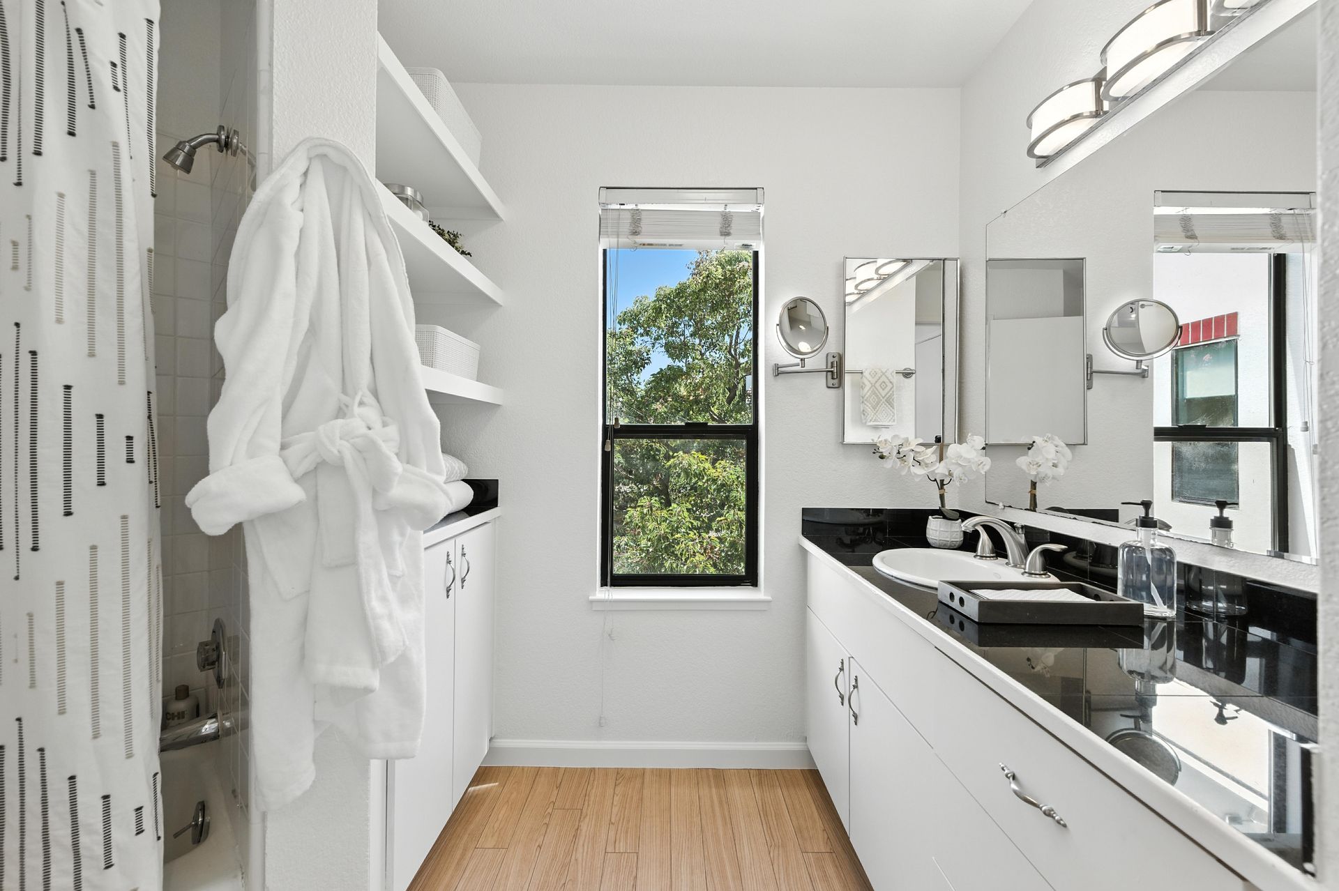 Sunlight streams in from all angles and heights taking full advantage of the unit’s corner placement, open floor plan and soaring ceilings. Both bathrooms boast windows as well.