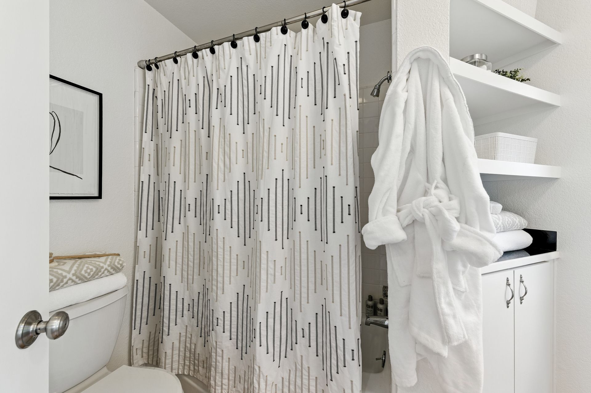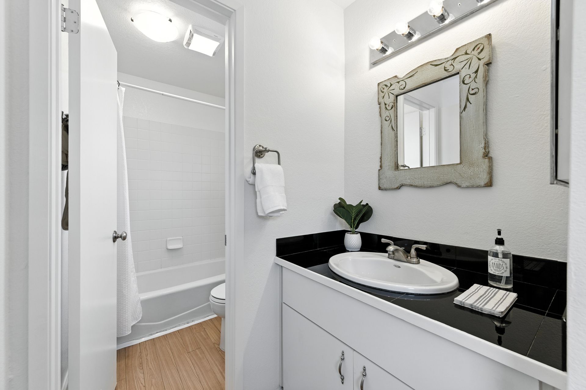 Both bathrooms have over the tub showers. Upstairs, the vanity is positioned between the bathroom and the double door closet.