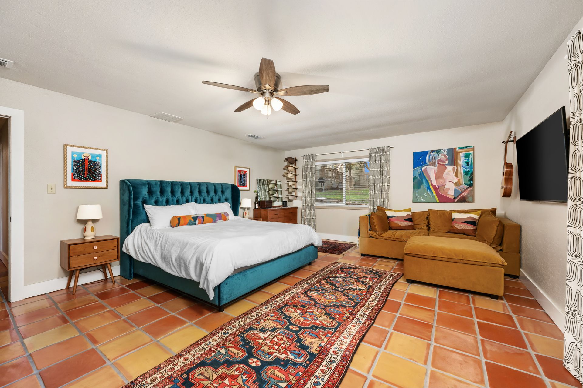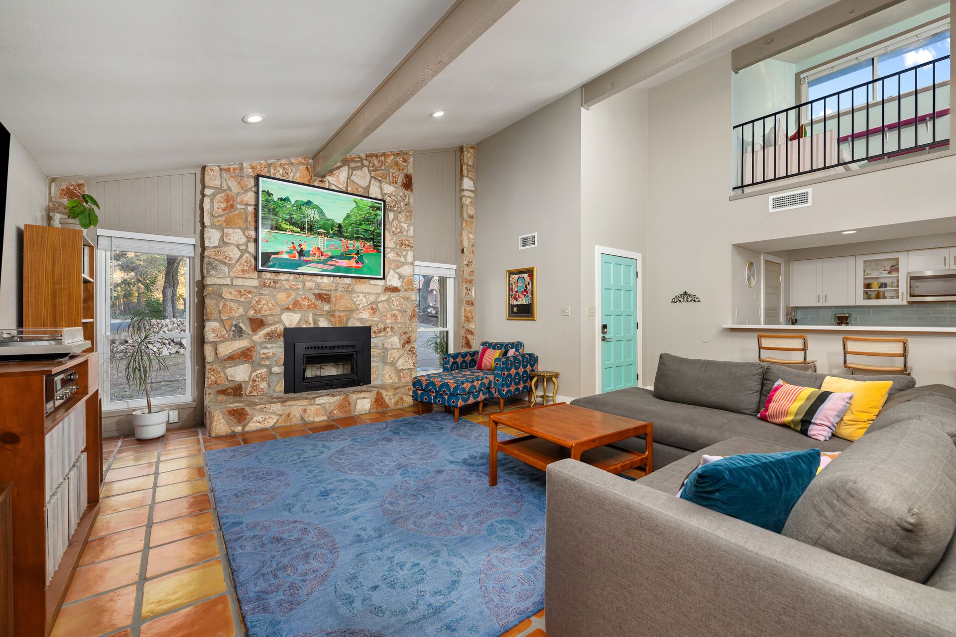 Saltillo tile floors and a vaulted living room ceiling create a welcoming atmosphere centered around a floor-to-ceiling stone, wood-burning fireplace. Large windows and sliding doors fill the home with natural light and frame views of the private backyard.